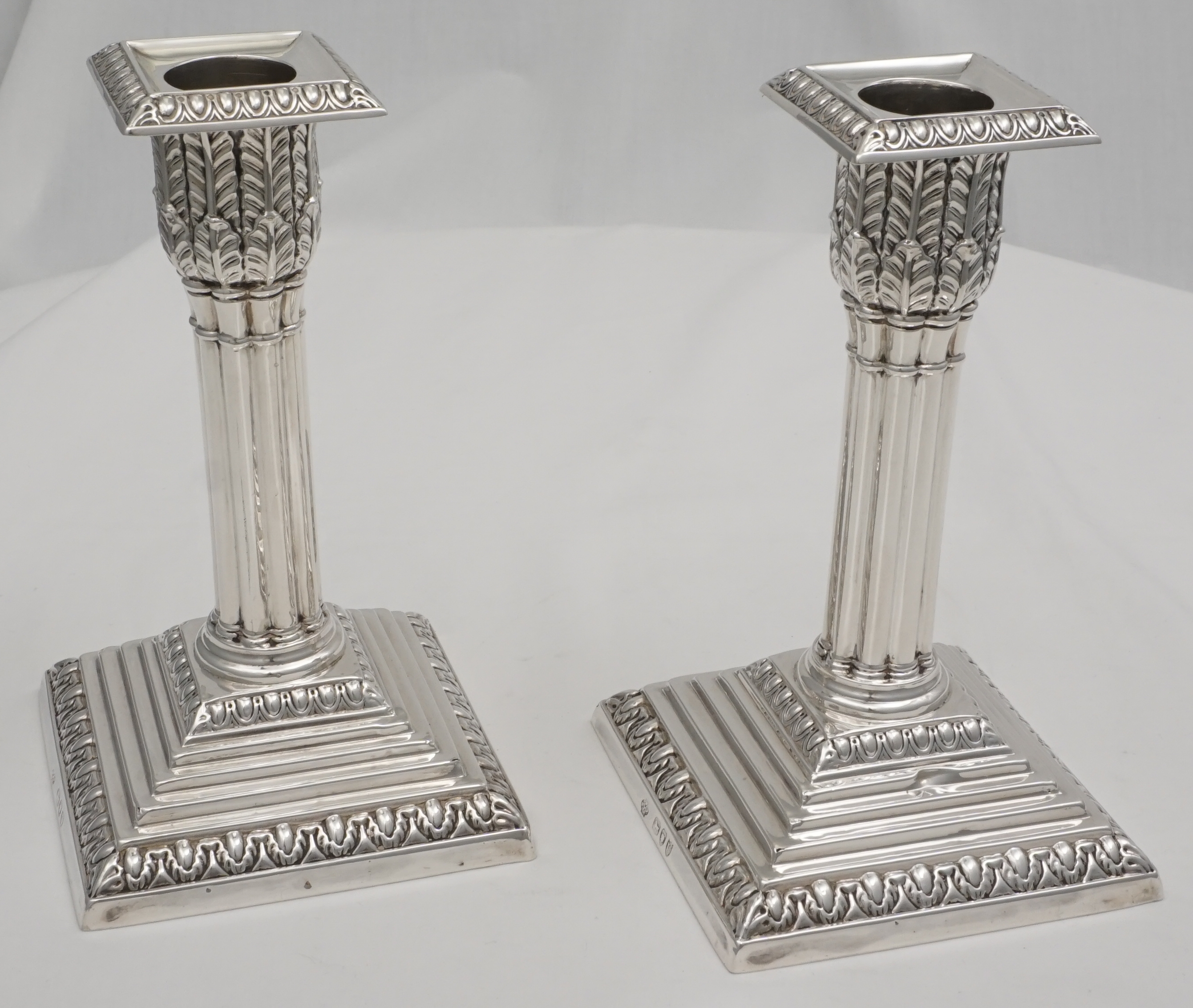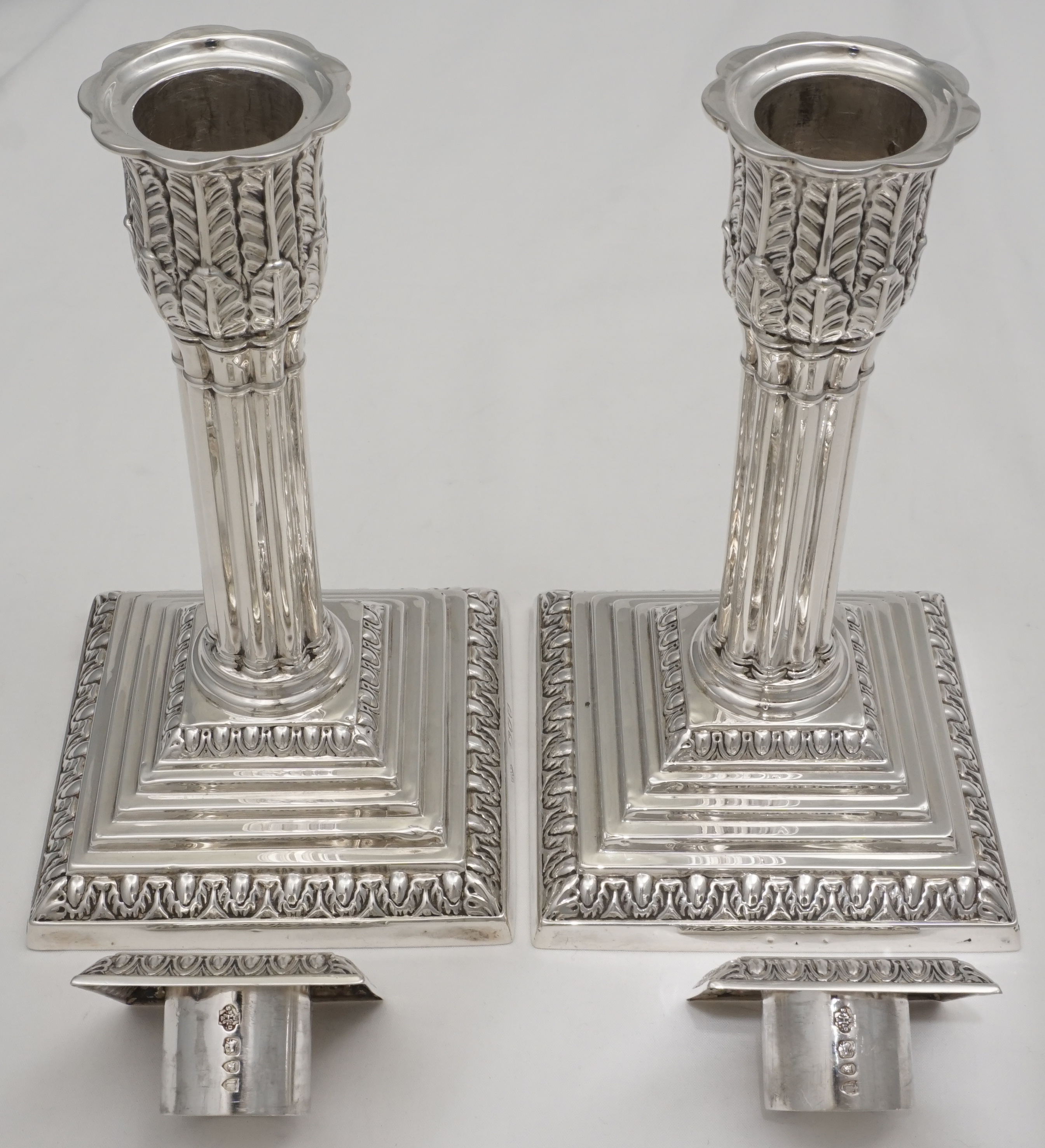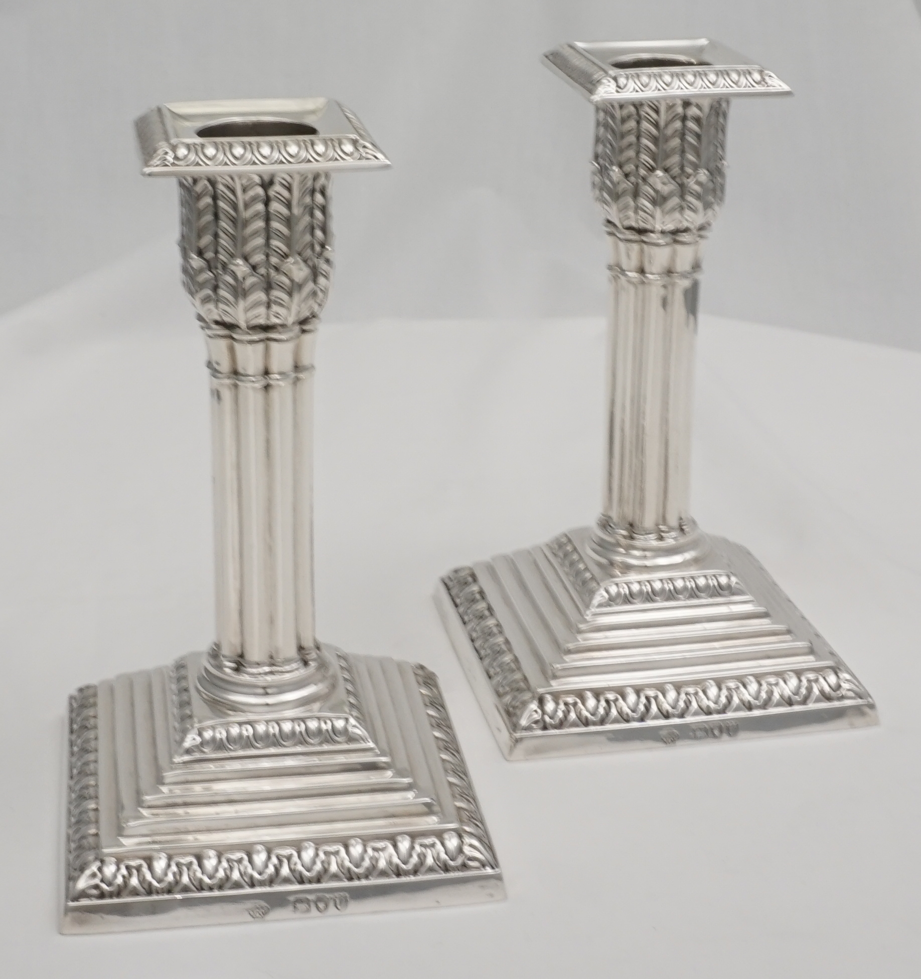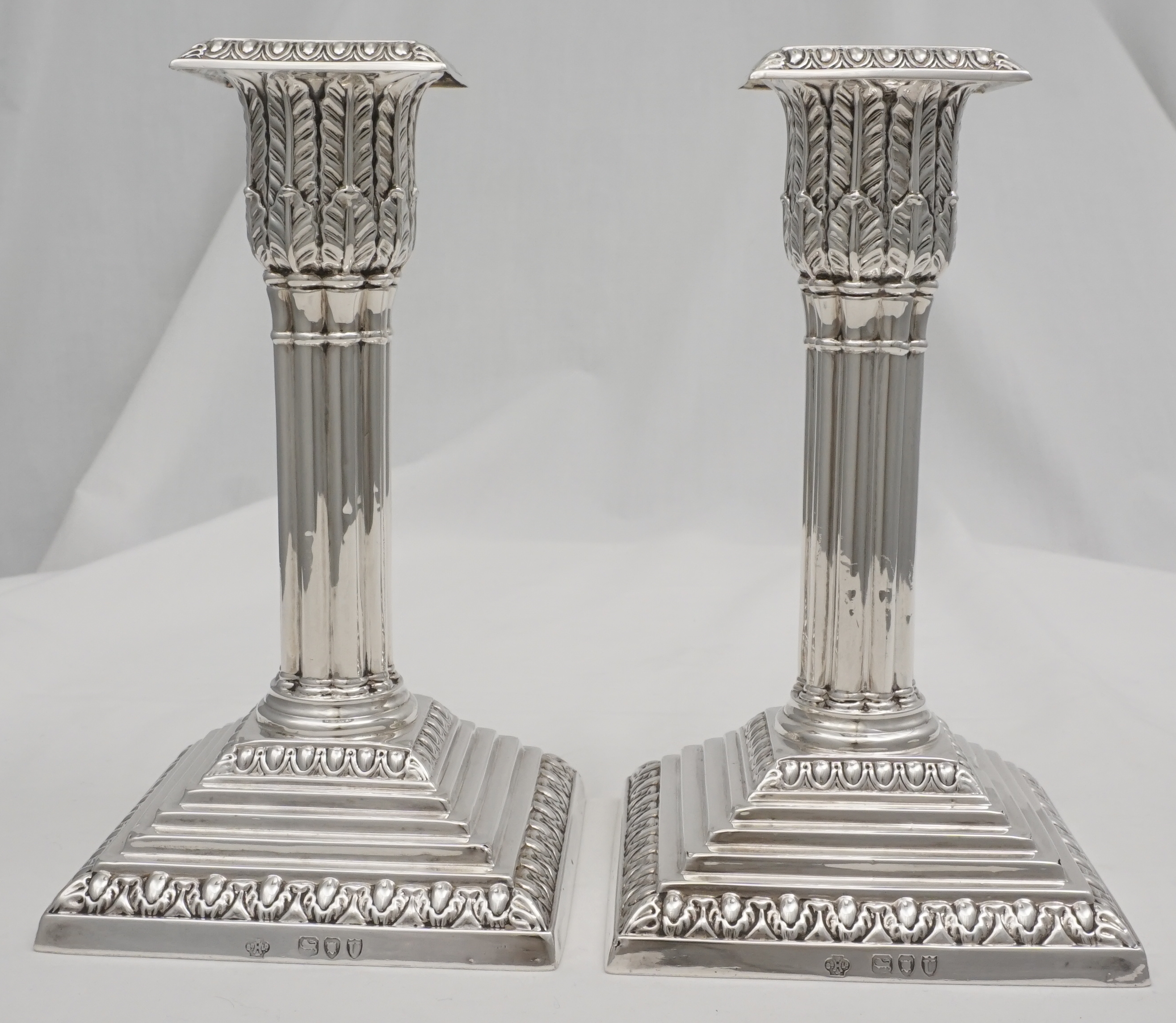 DESCRIPTION | Useful pair of good quality antique English Victorian loaded solid sterling silver acanthus column candlesticks on stepped bases and with removable sconces. All pieces correctly and clearly hallmarked throughout. I have left the bases uncovered so that you can see the markings and quality of construction but free felt bottoms are an option. |