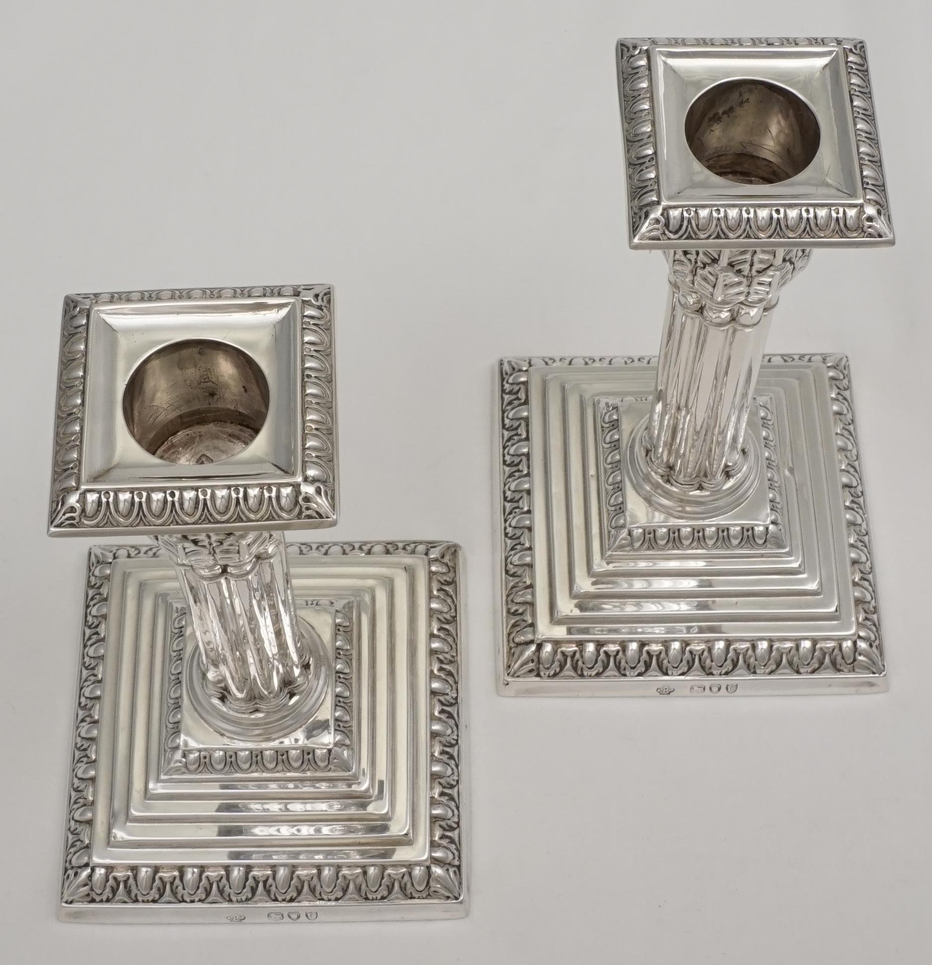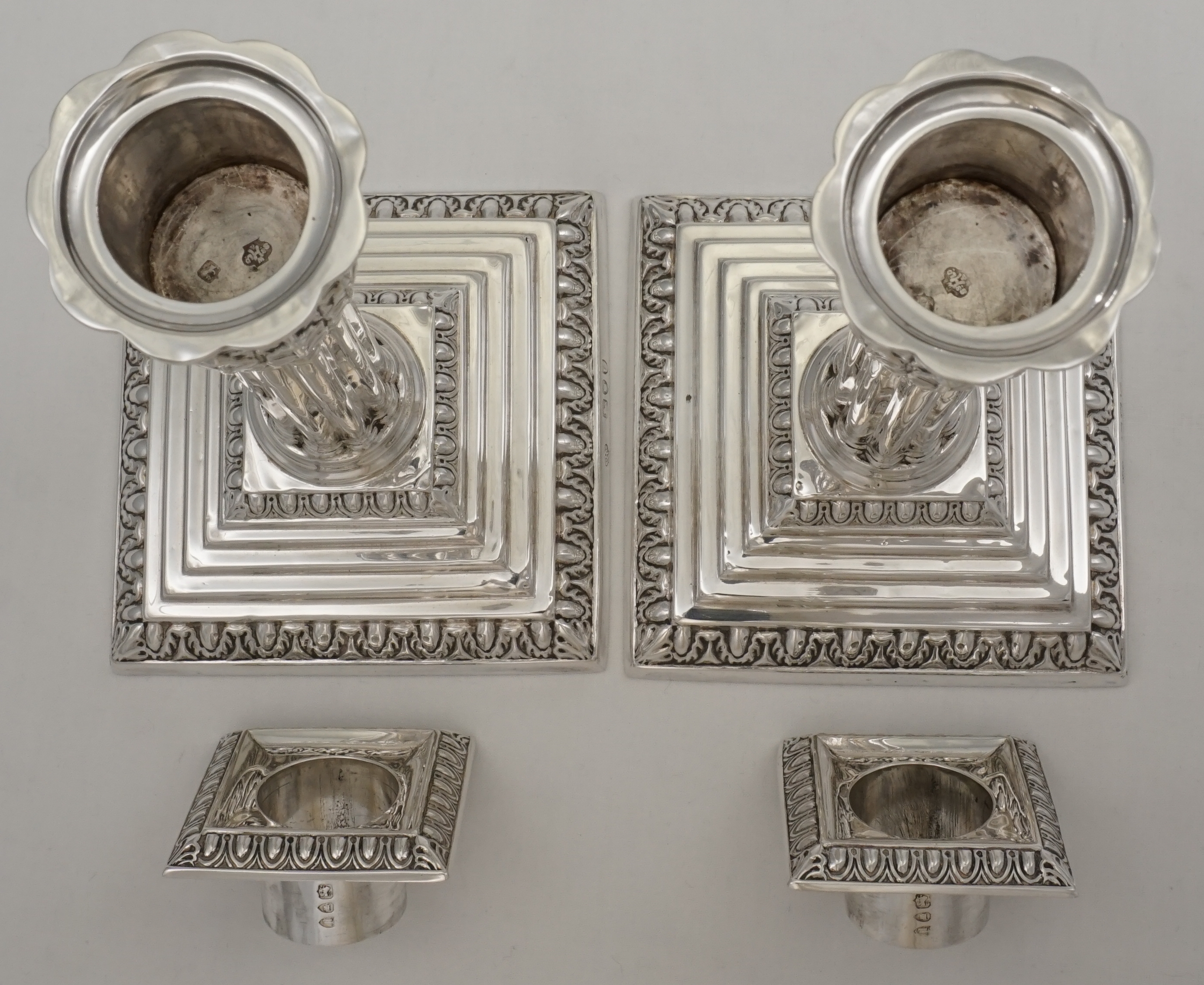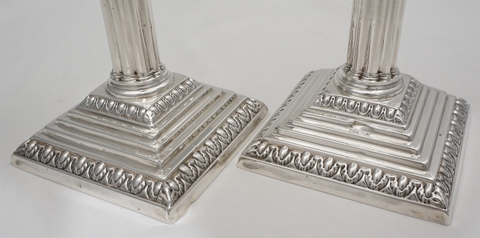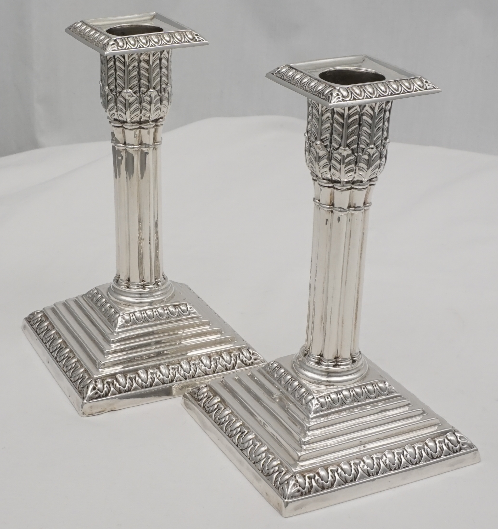 DESCRIPTION | Useful pair of good quality antique English Victorian loaded solid sterling silver acanthus column candlesticks on stepped bases and with removable sconces. All pieces correctly and clearly hallmarked throughout. I have left the bases uncovered so that you can see the markings and quality of construction but free felt bottoms are an option. |