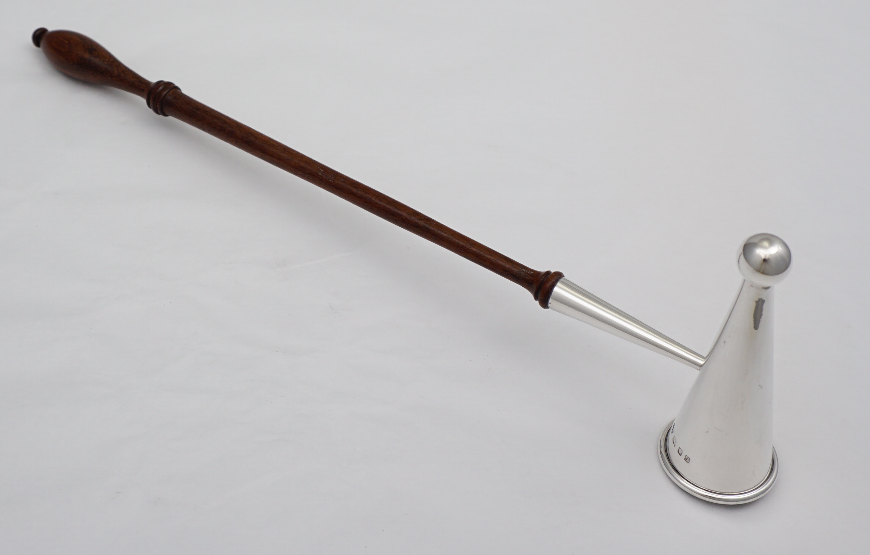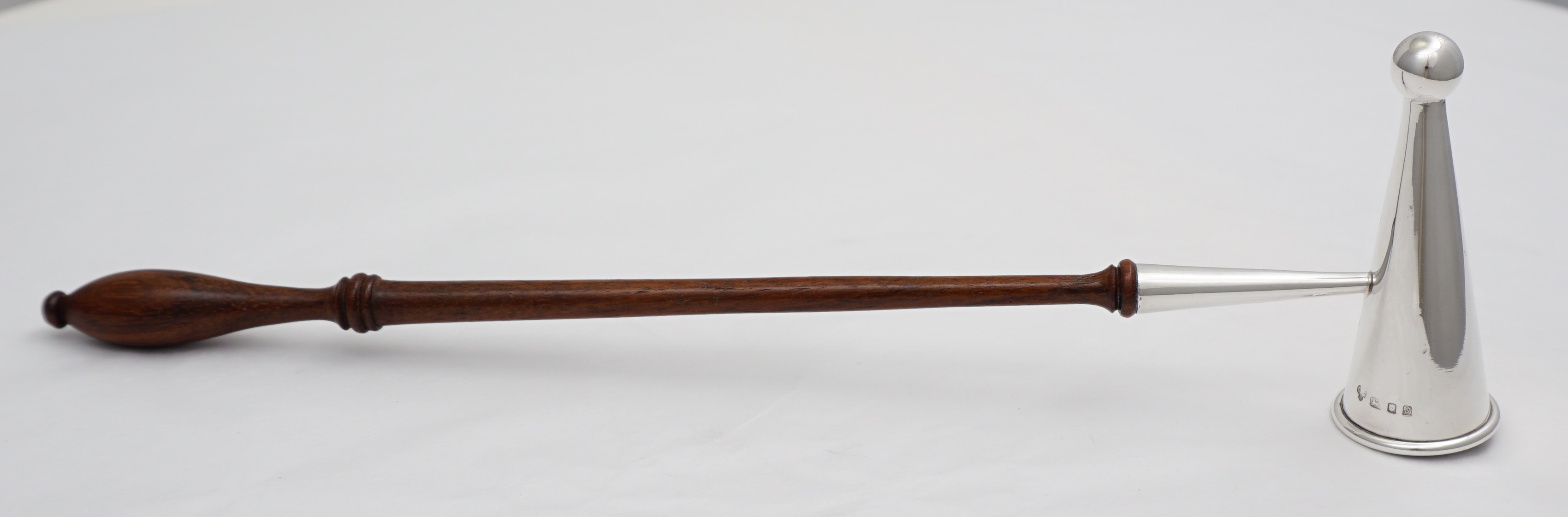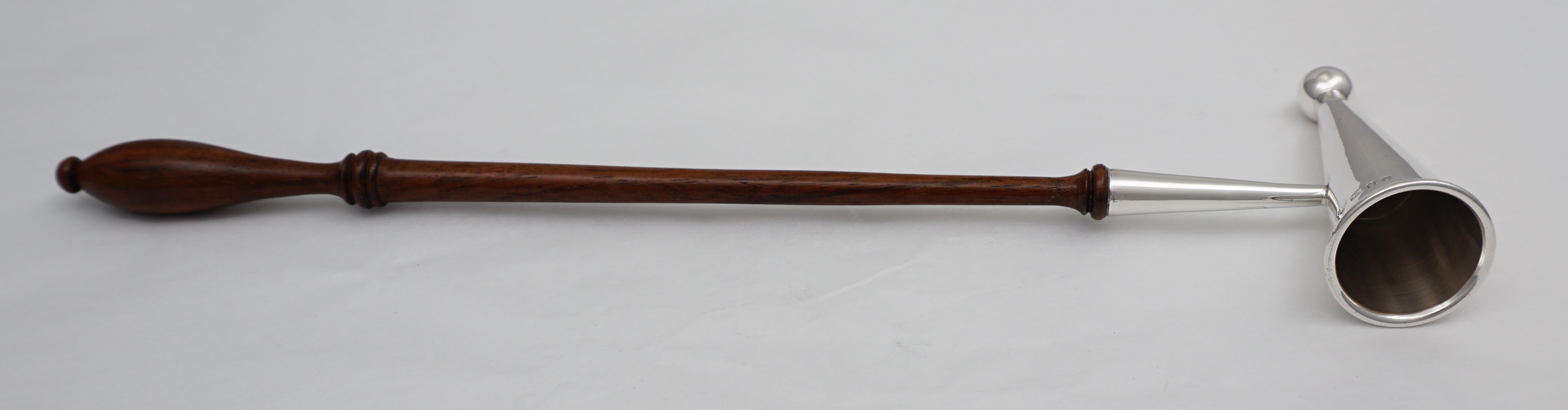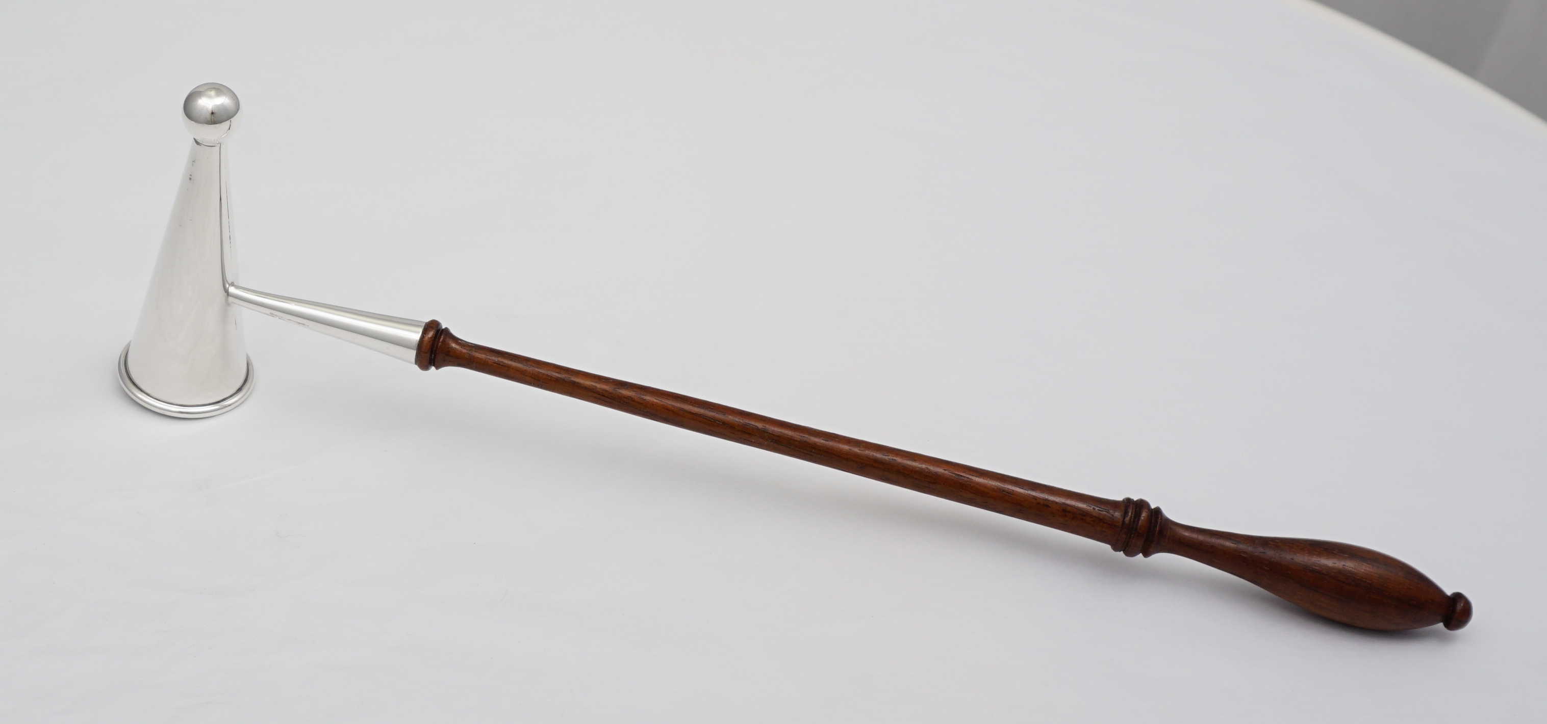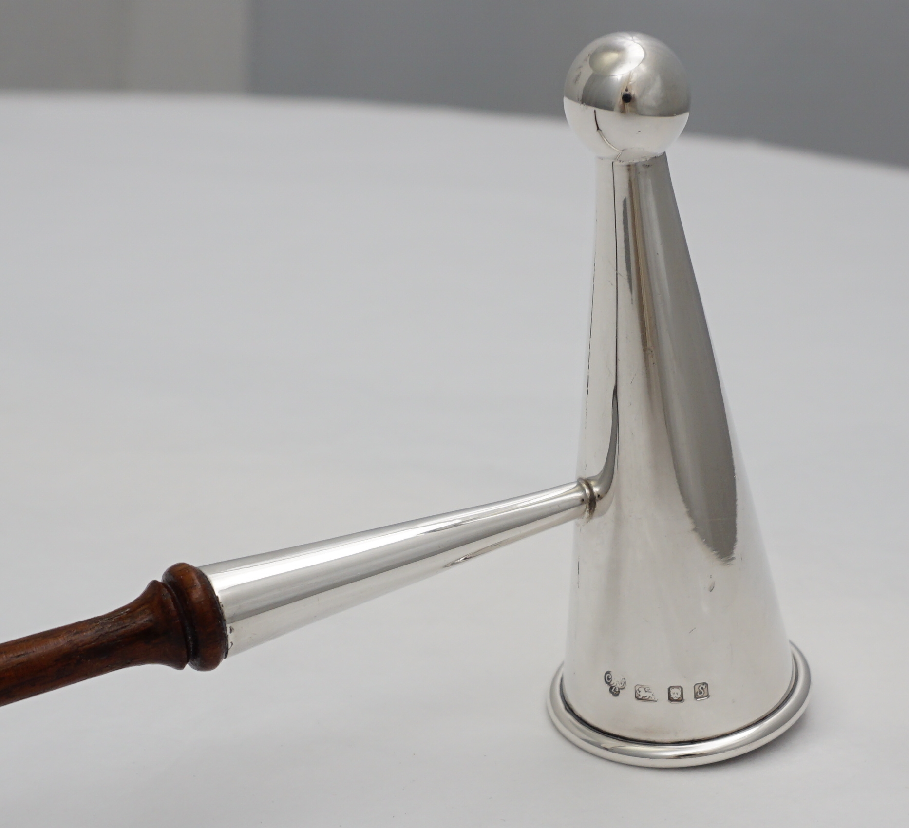 DESCRIPTION | Useful vintage solid sterling silver candle douter or snuffer with a turned wood handle. Nicely made, thick silver. |