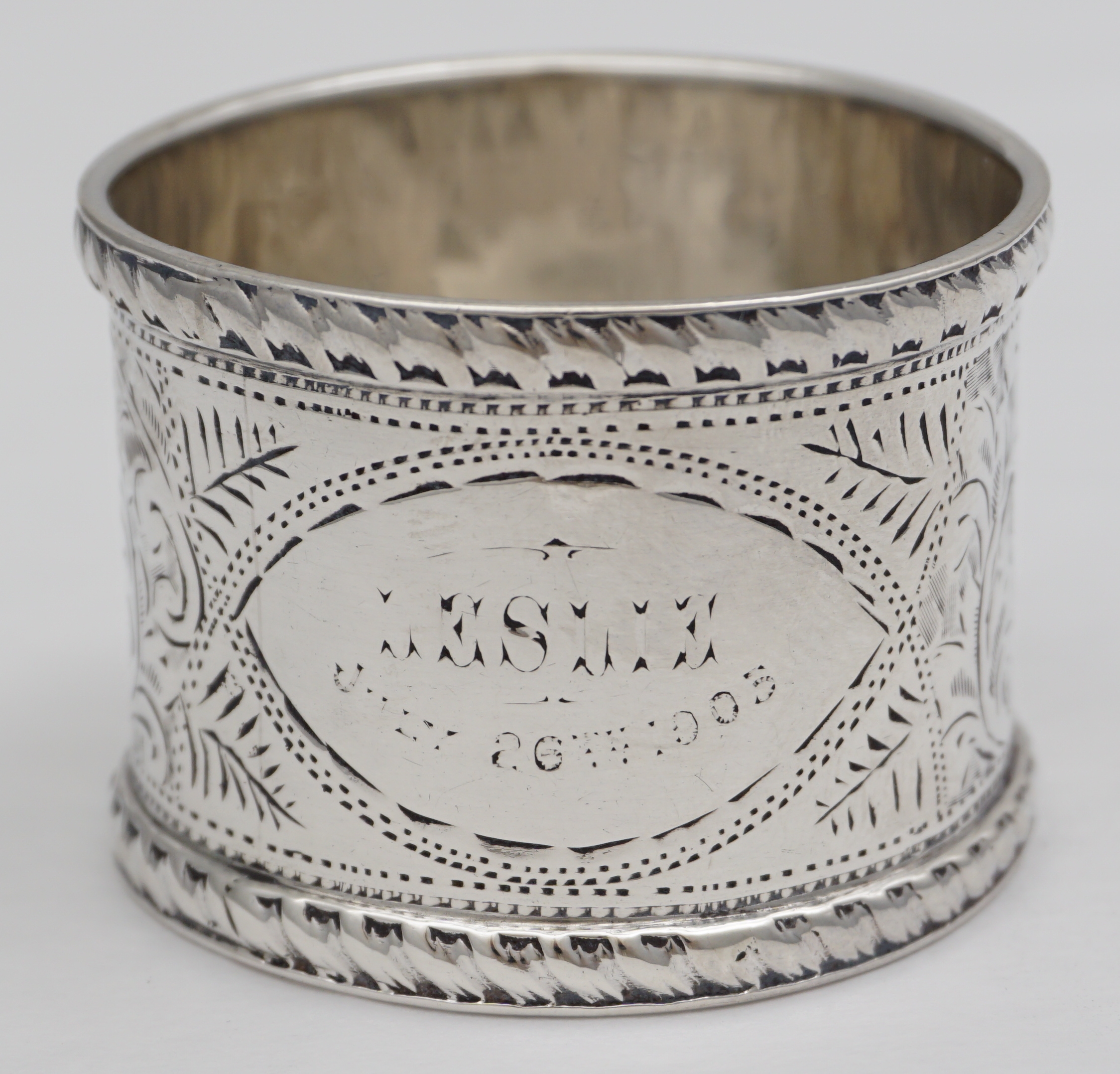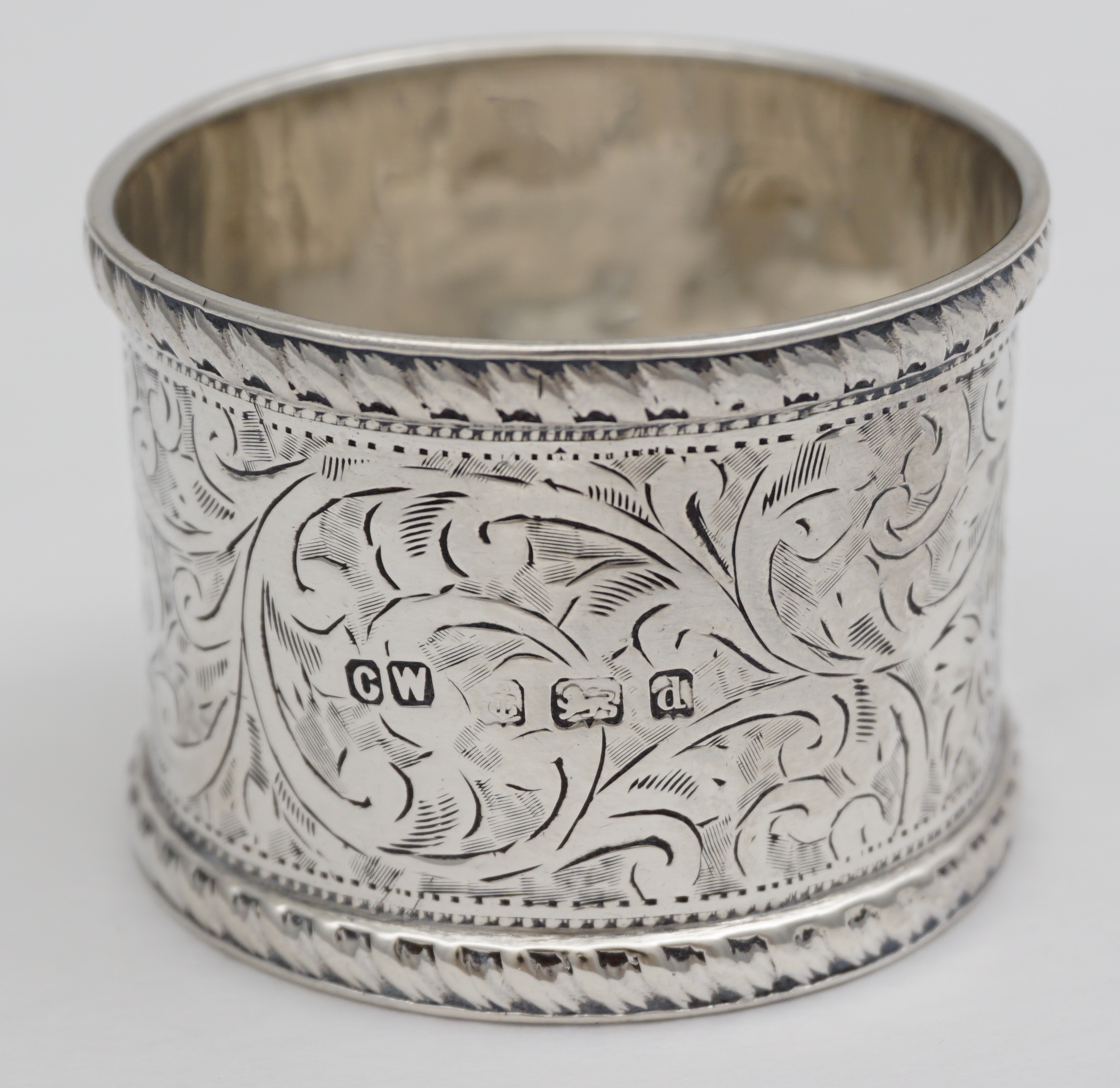 DESCRIPTION | Antique English Edwardian solid sterling silver napkin ring with foliate engraved decoration and inscribed cartouche. |