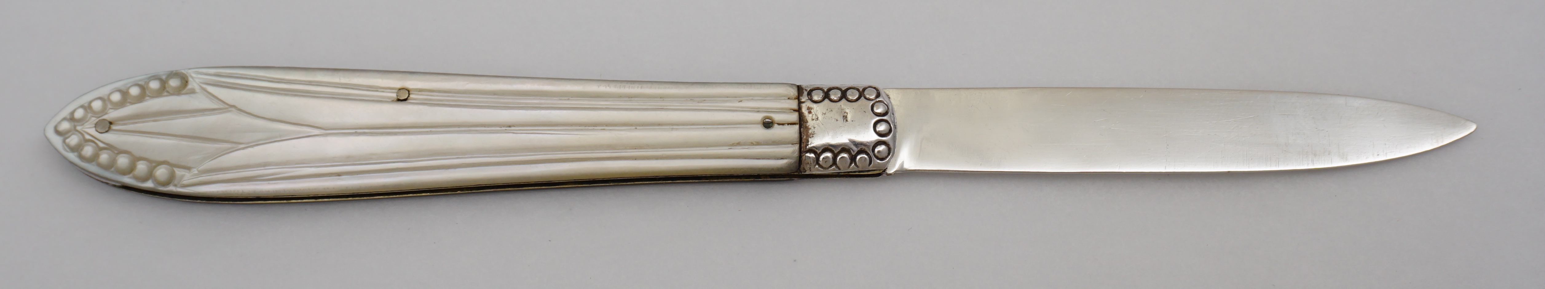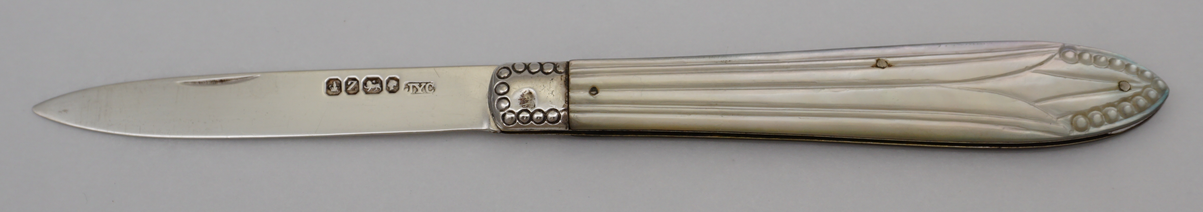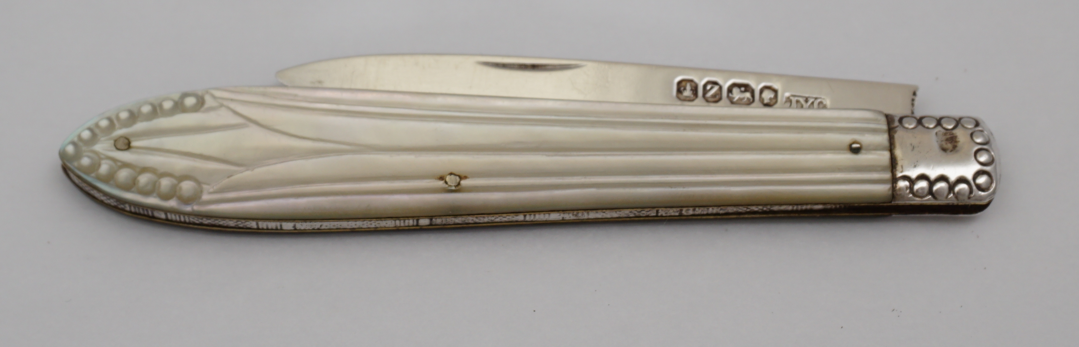 | DESCRIPTION | Very good antique English Victorian solid sterling silver bladed folding fruit knife with mother of pearl flanks. |