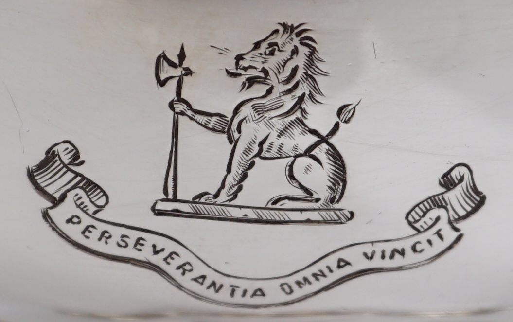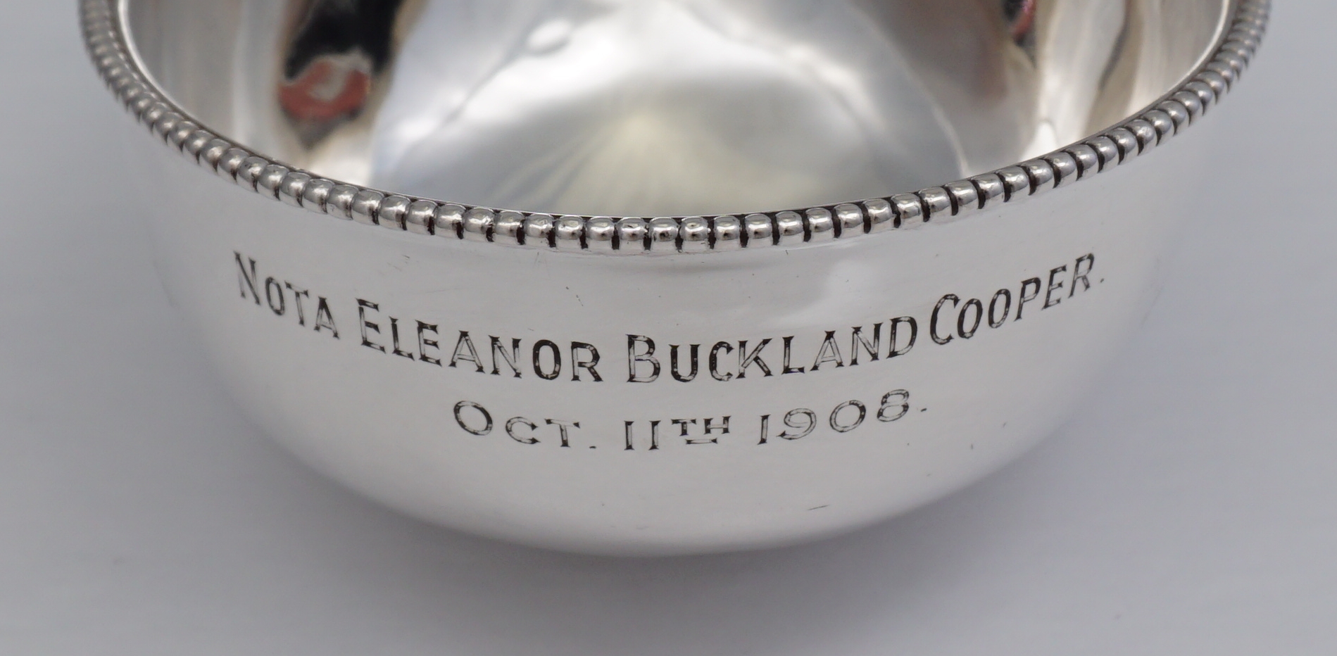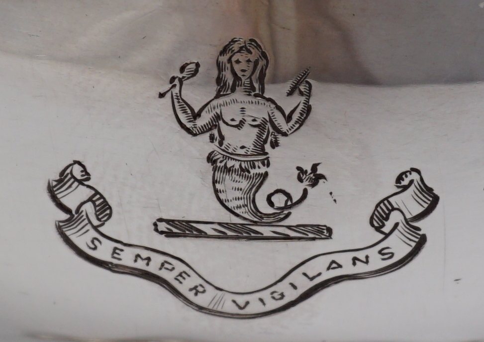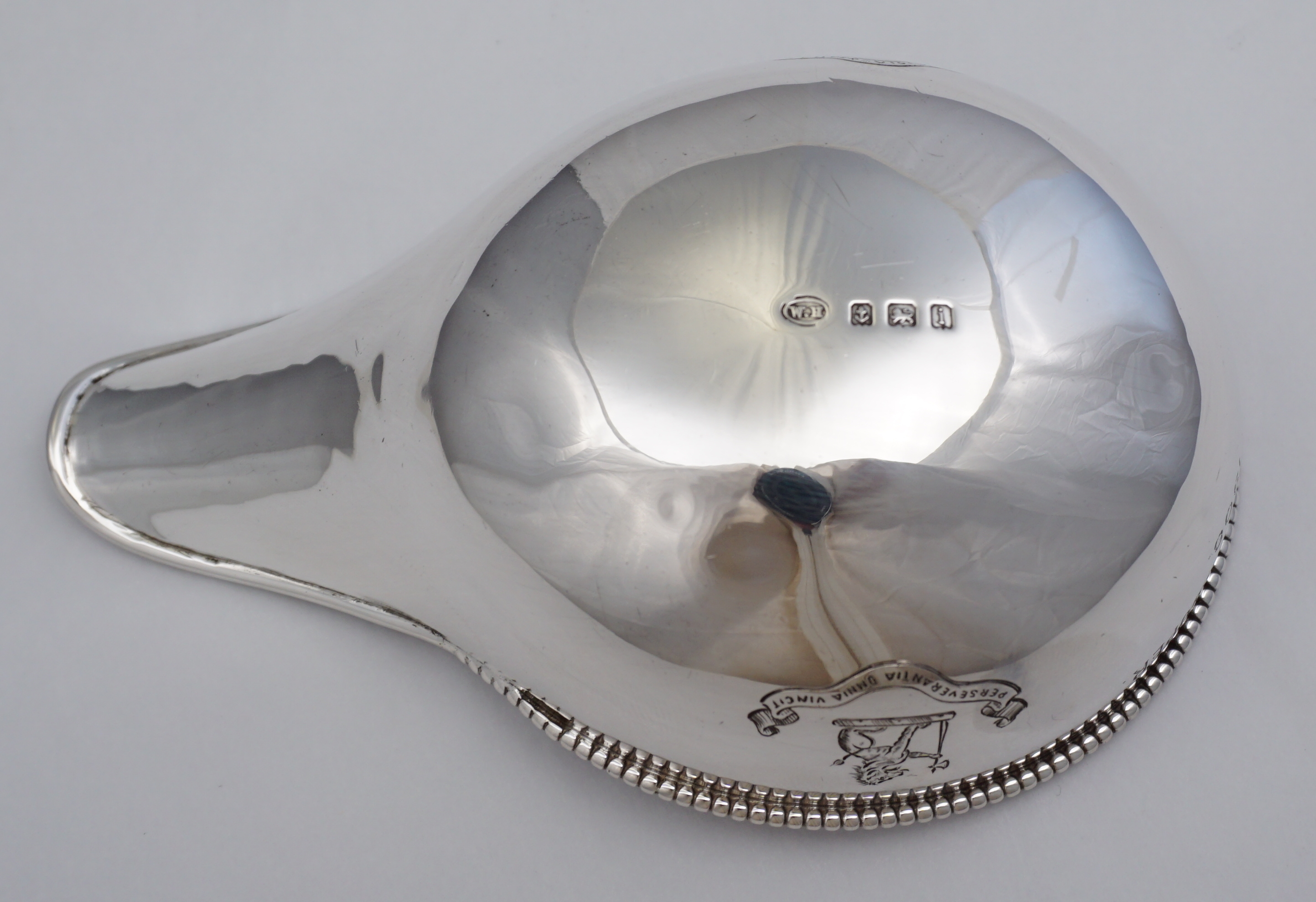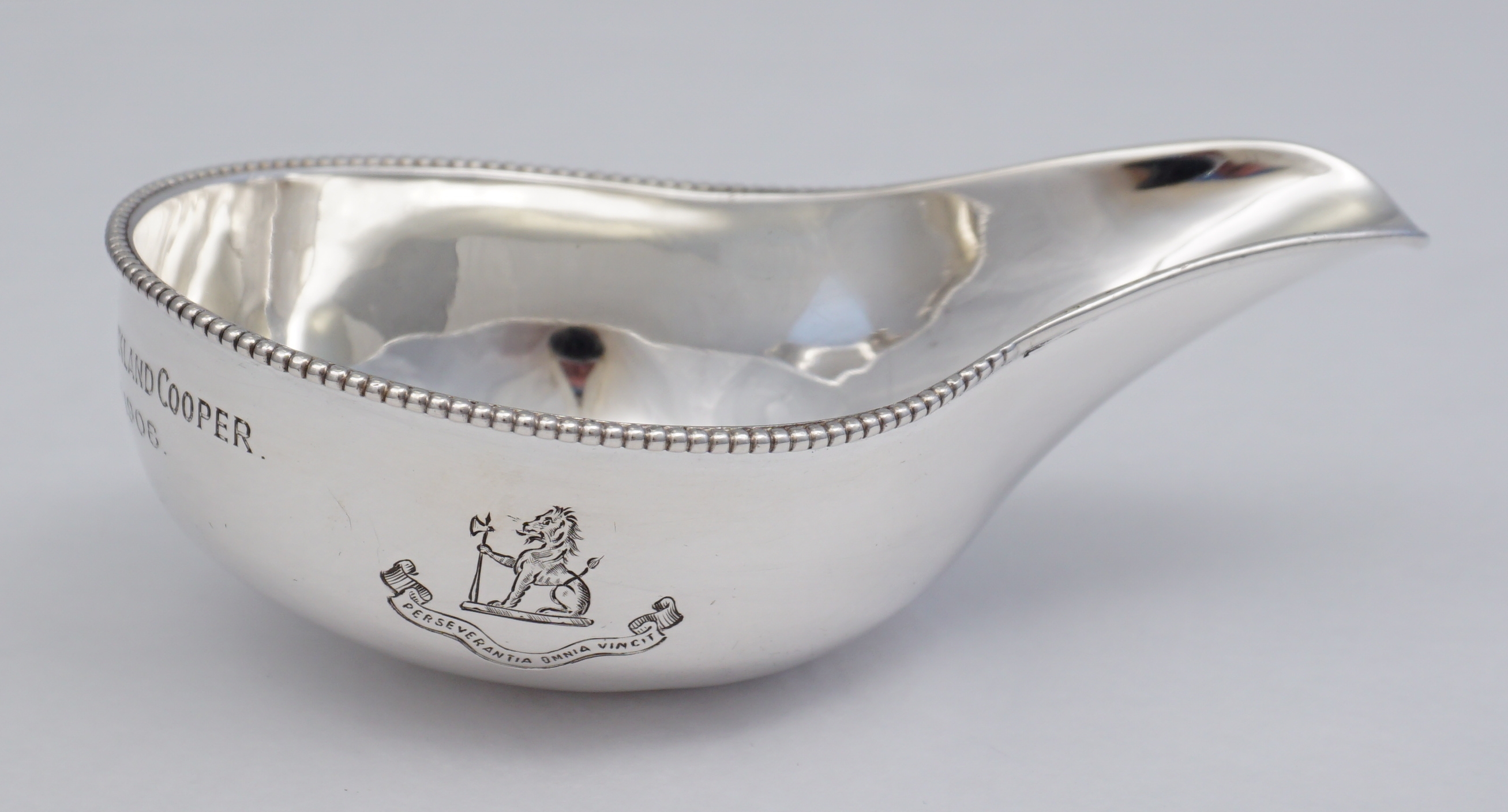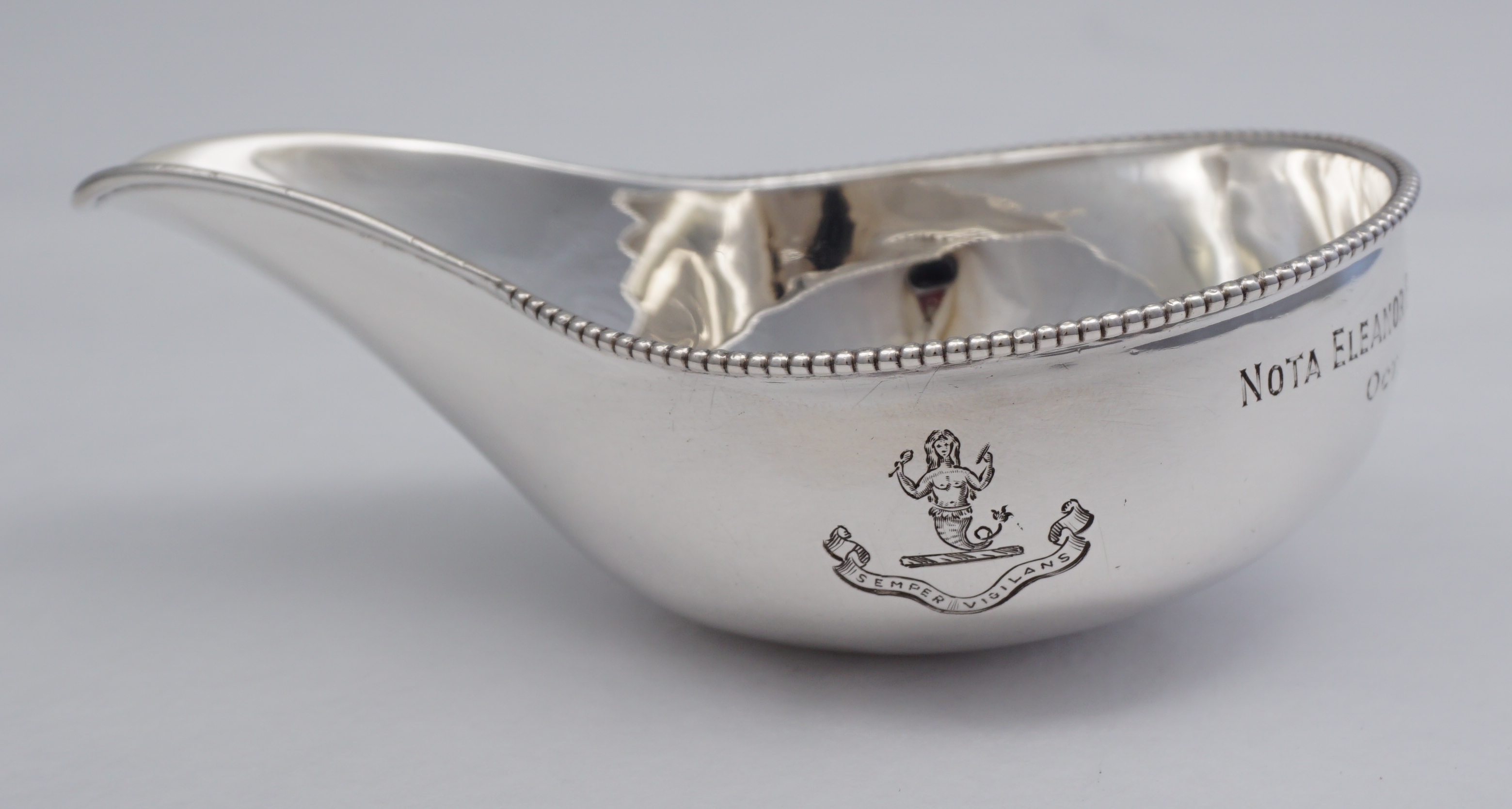 DESCRIPTION | Antique solid sterling silver pap boat (invalid/child feeder) with bead decorated top rim and interesting crest with motto engravings and presentation inscription. Unusual to find a pap boat of this late date and with so much information engraved. It may well be possible to find out the people and story behind this piece. |