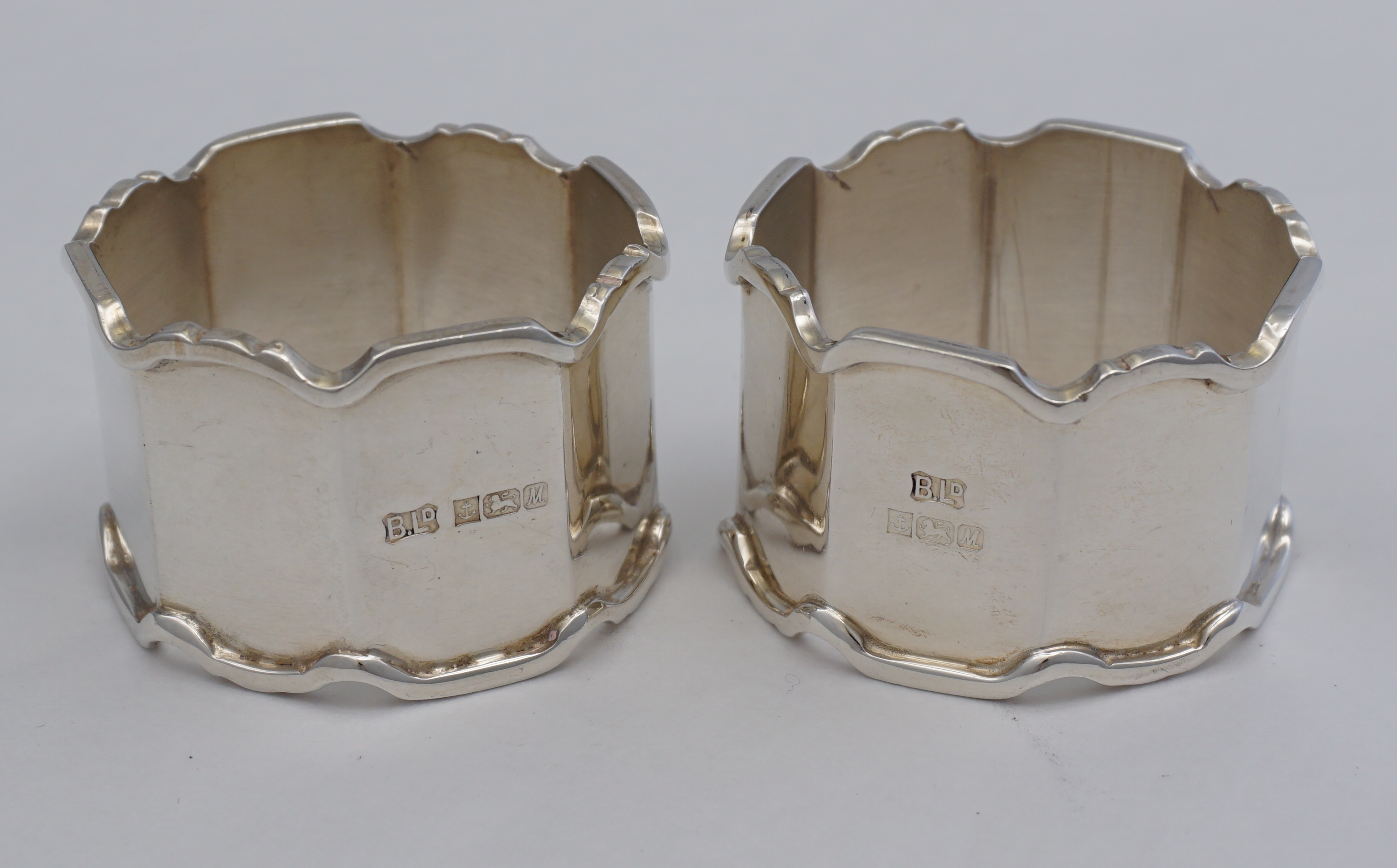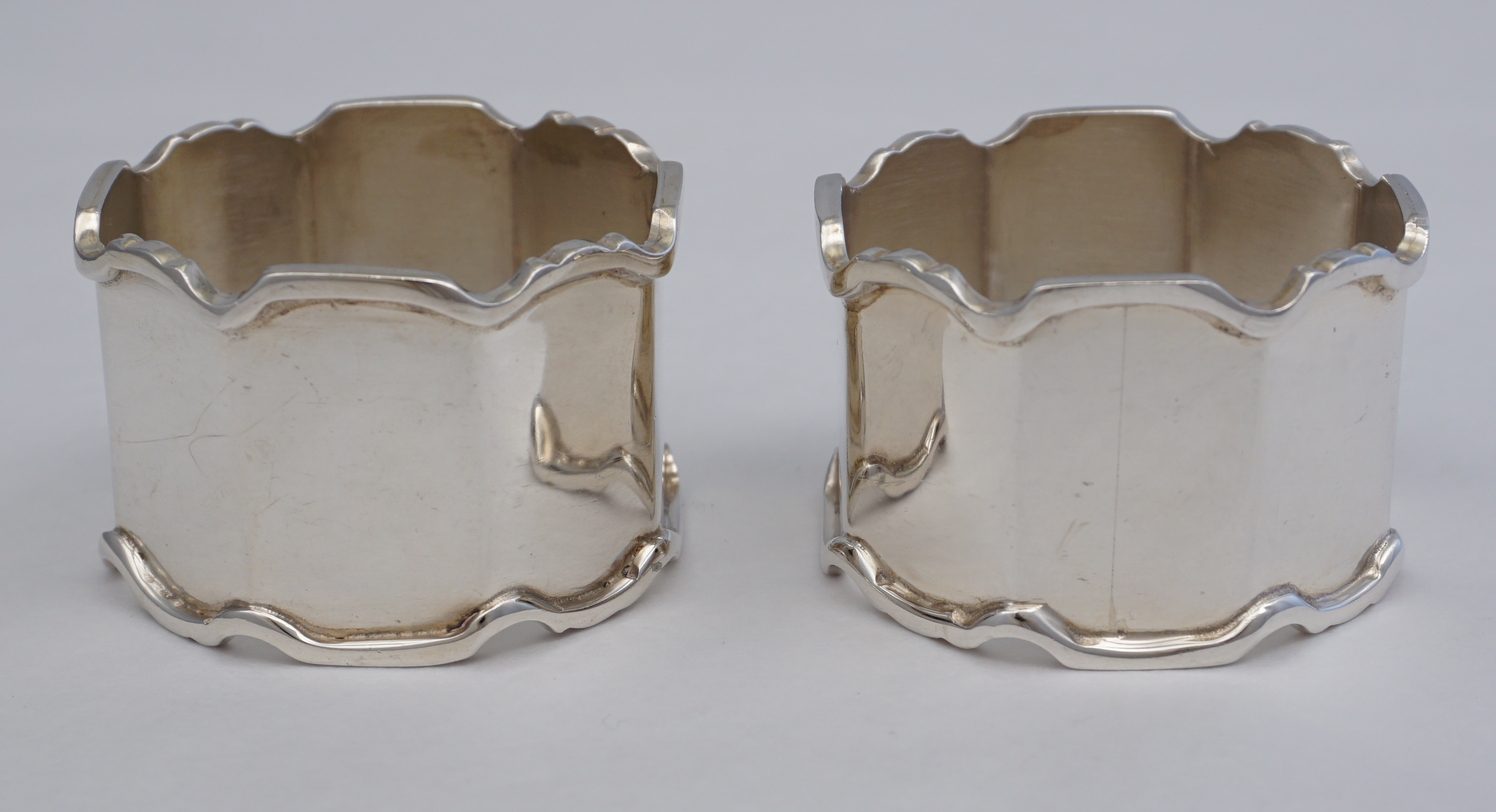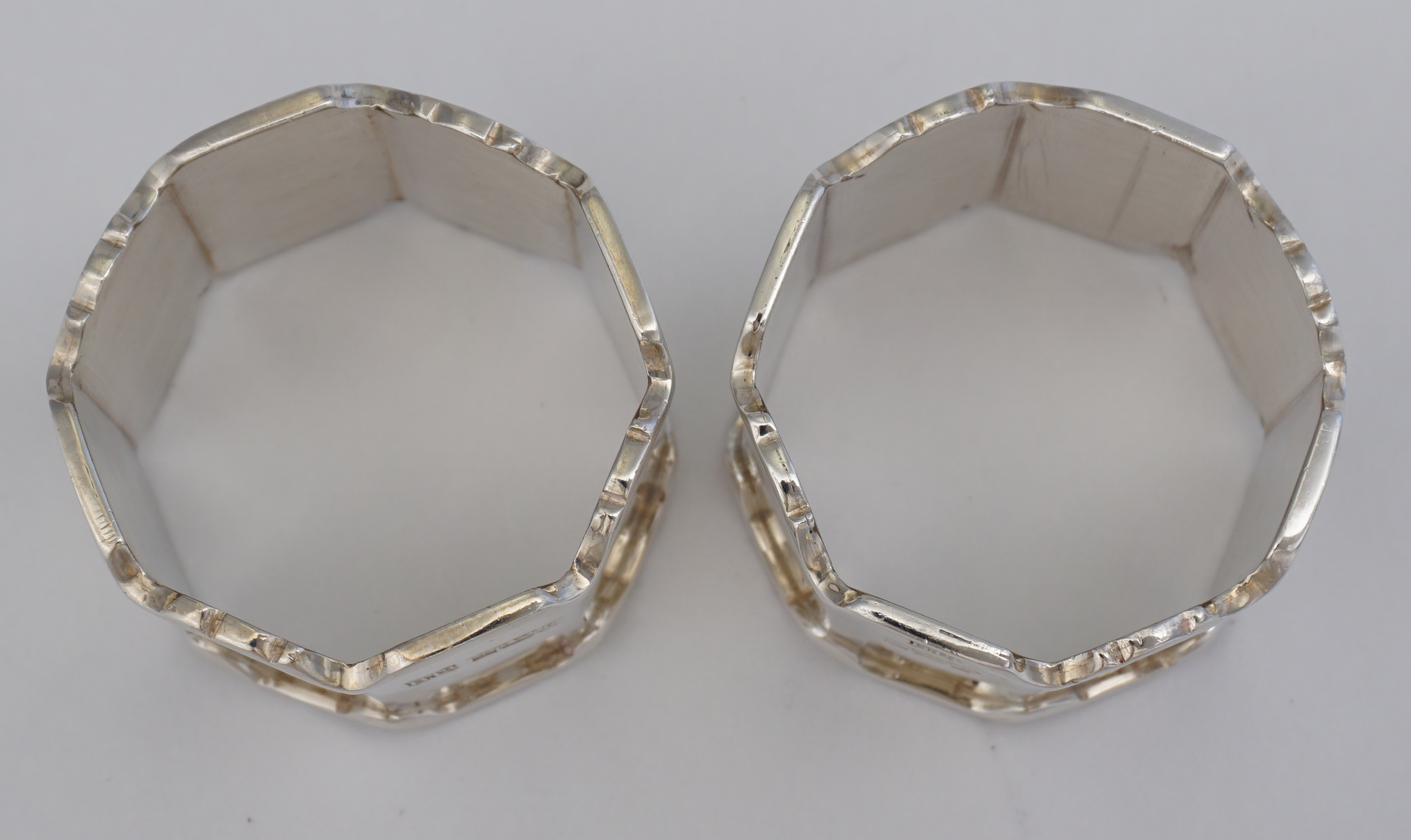 DESCRIPTION | Good and heavy pair of octaform vintage English solid sterling silver napkin or serviette rings. Good gauge metal, nice weight, no engraving or erasure. |