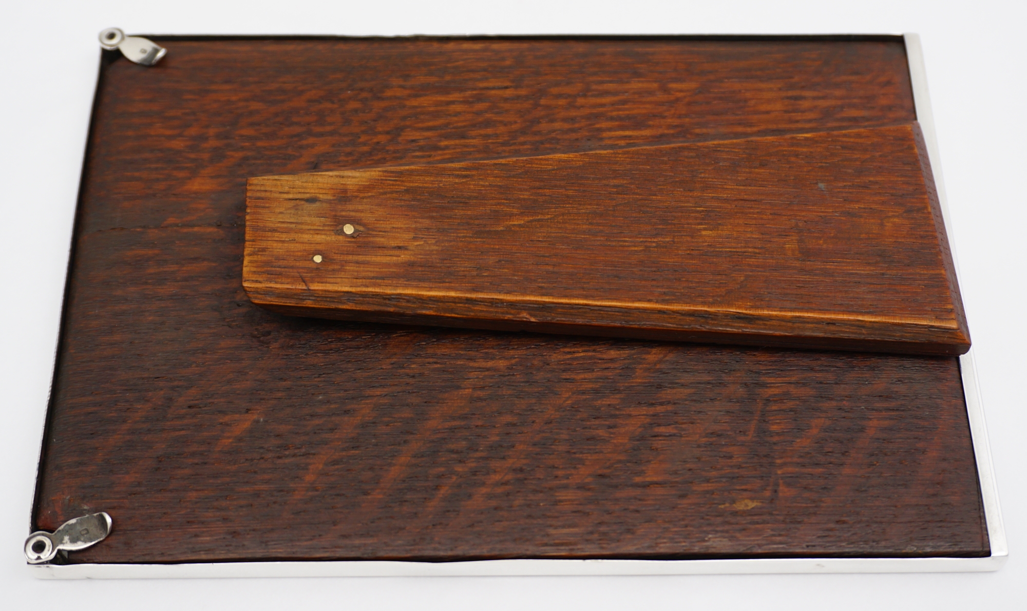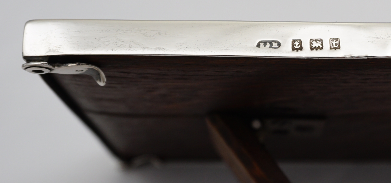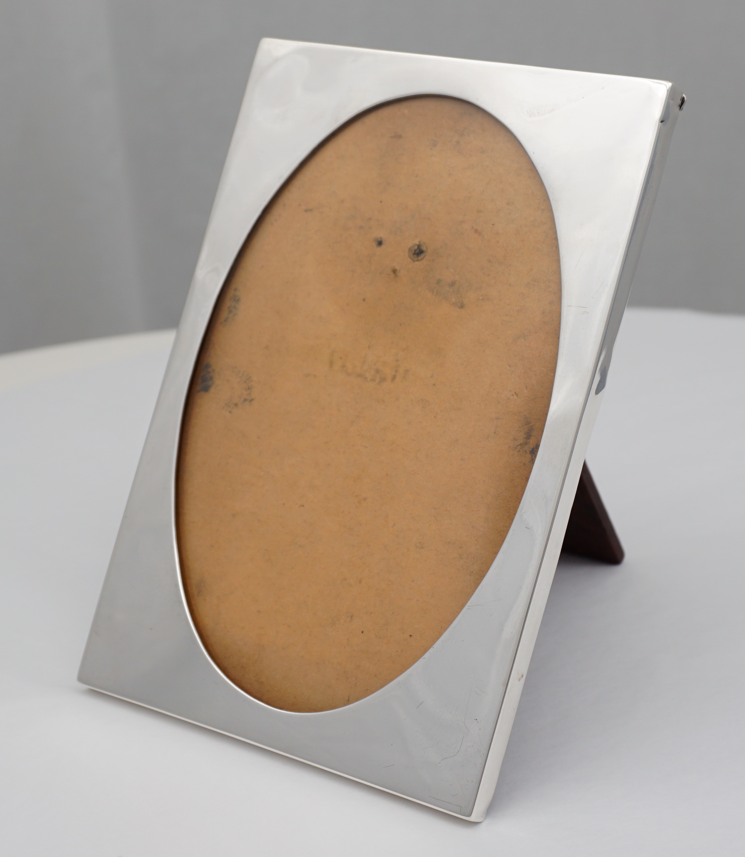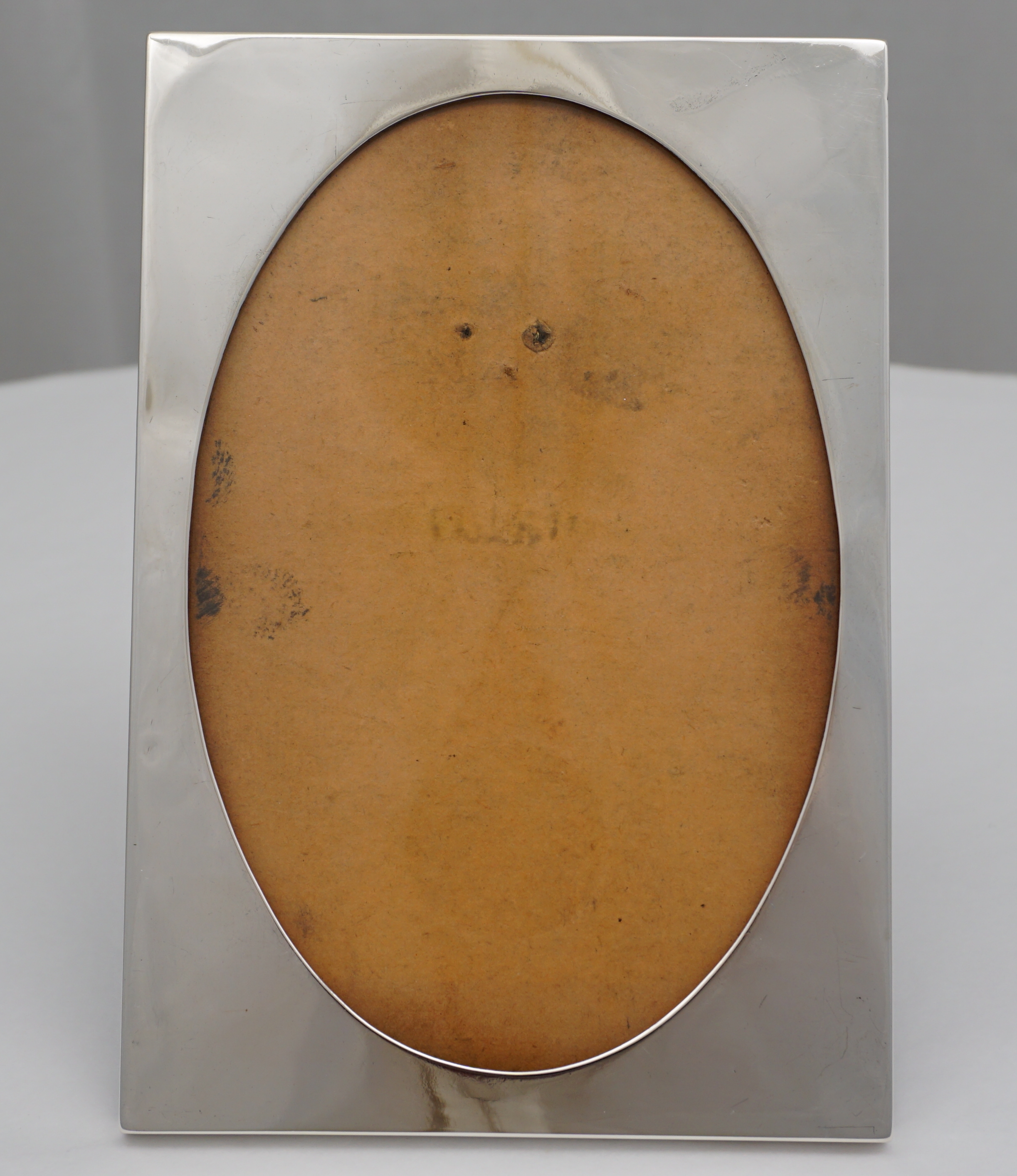 DESCRIPTION | Very good antique English solid sterling silver mounted photograph frame with an oval aperture and oak strut back. Although intended for portrait display it does actually function well in landscape too. Additional sign of quality is the marking as sterling silver with the lion passant of the two retaining lugs. |