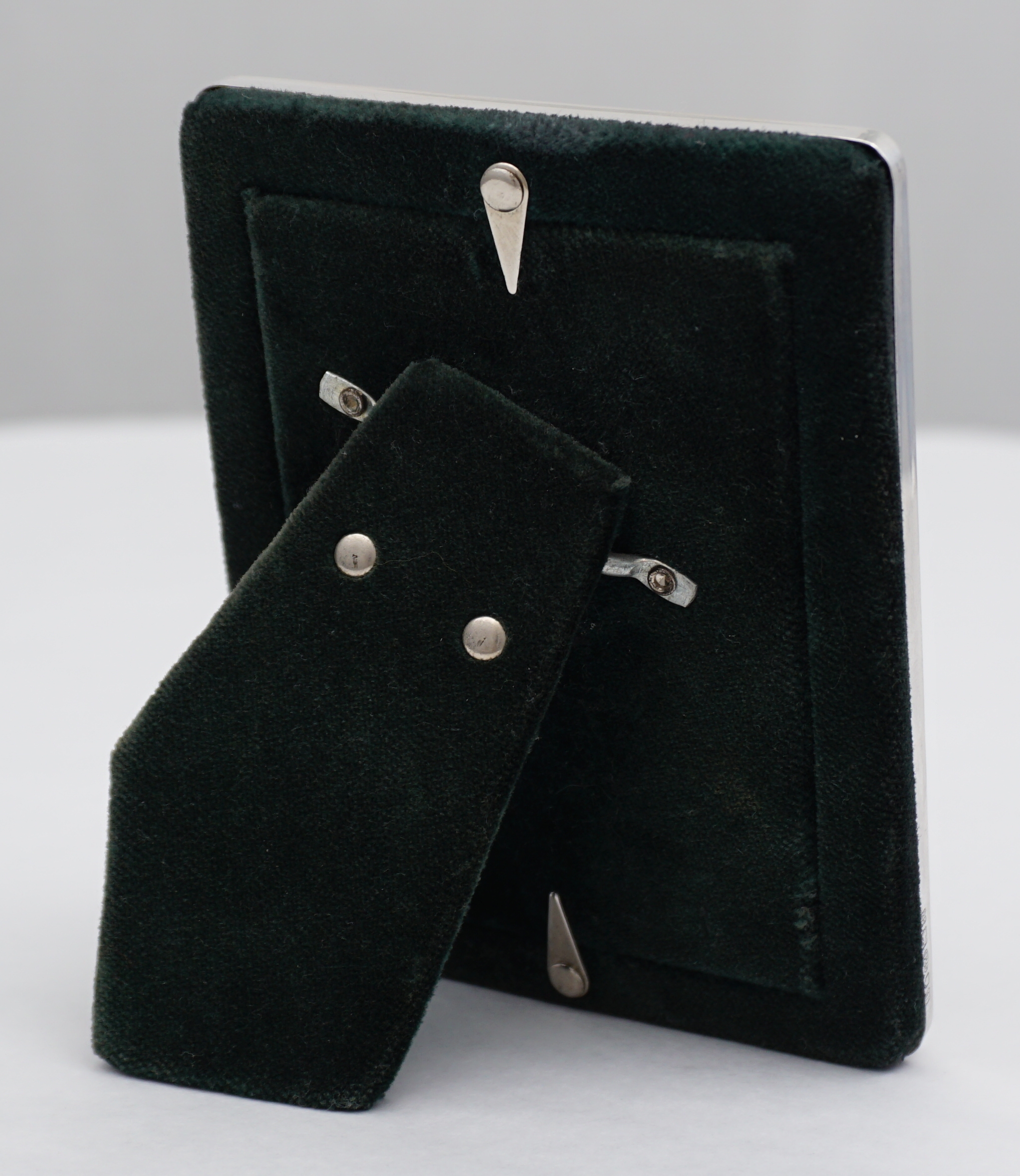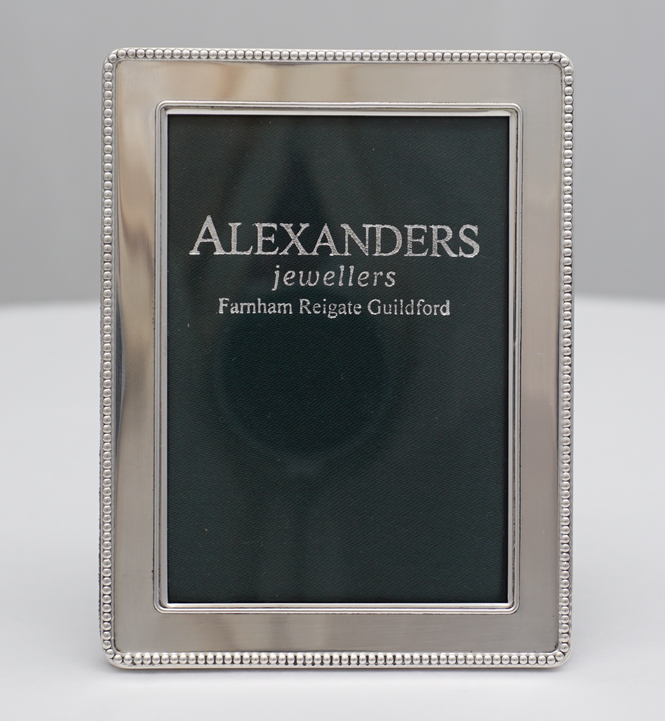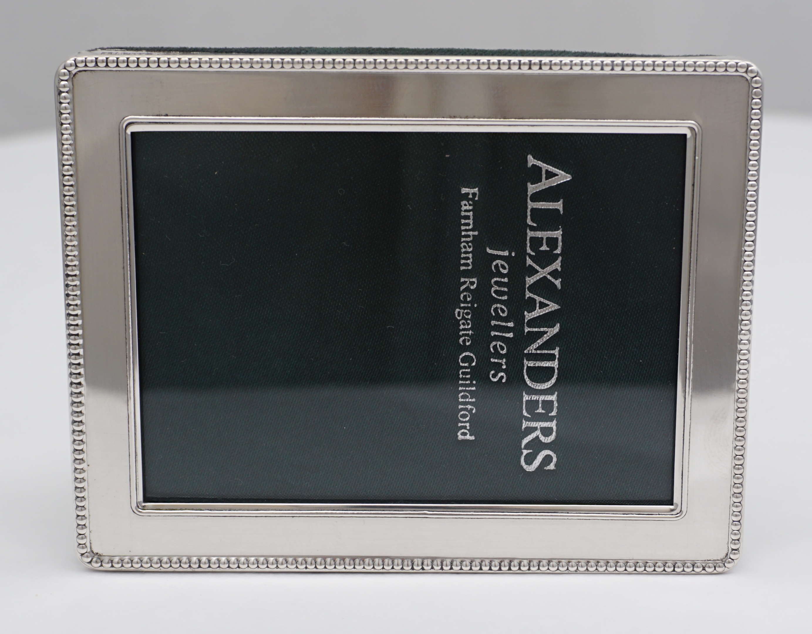 DESCRIPTION | Perfect little solid sterling silver mounted bead edge decorated photograph frame with a felt strut back that works landscape and portrait. |