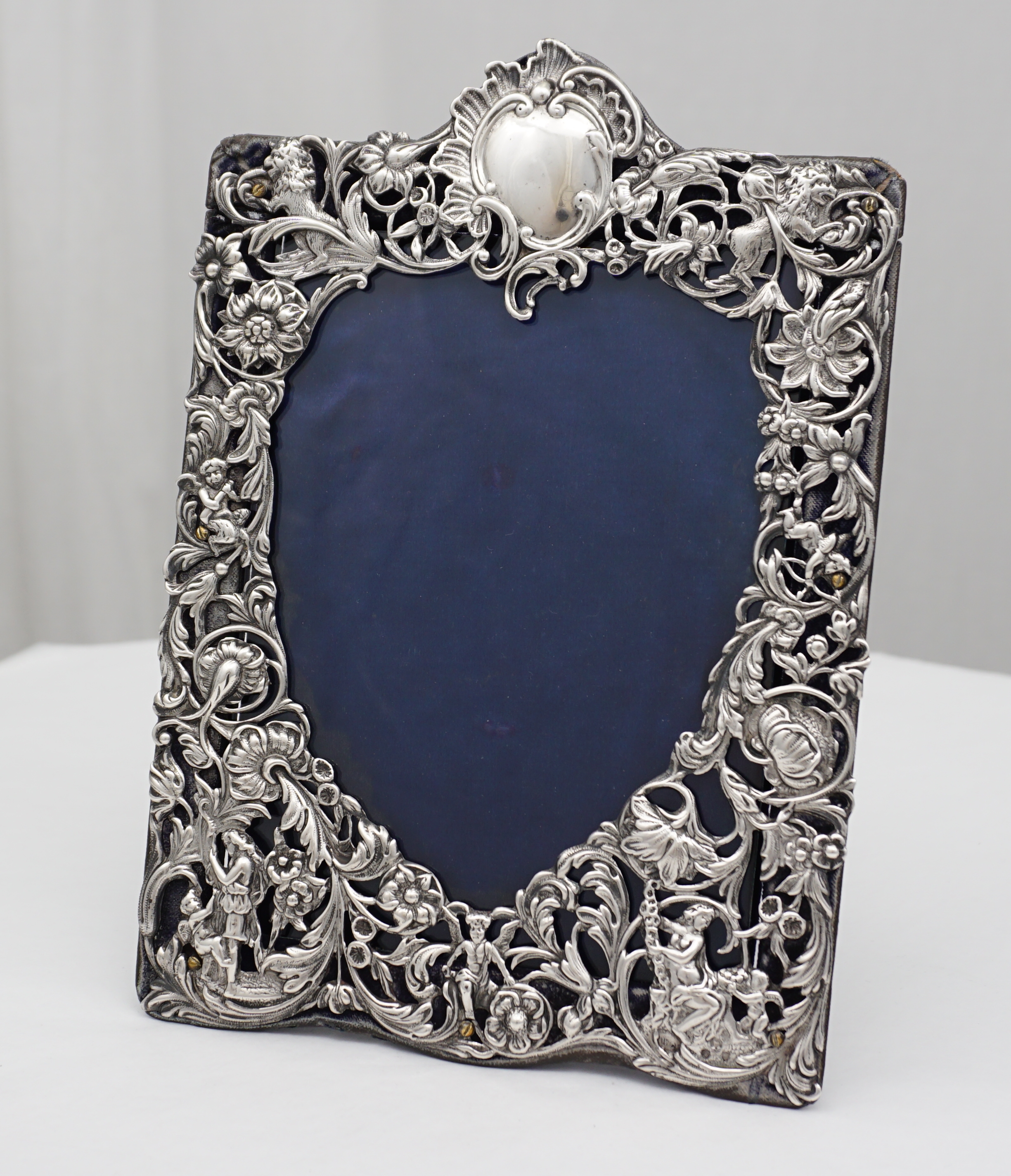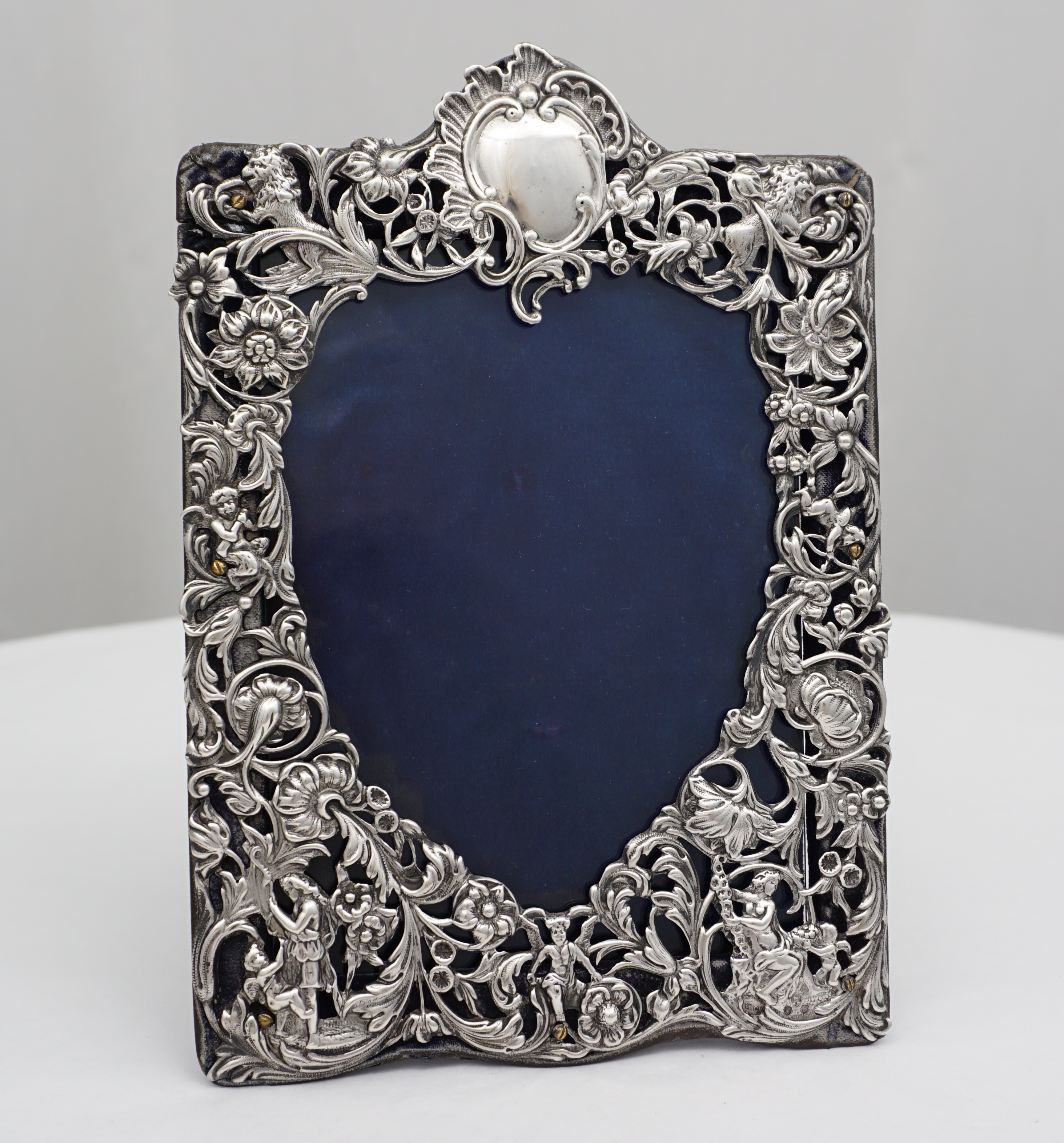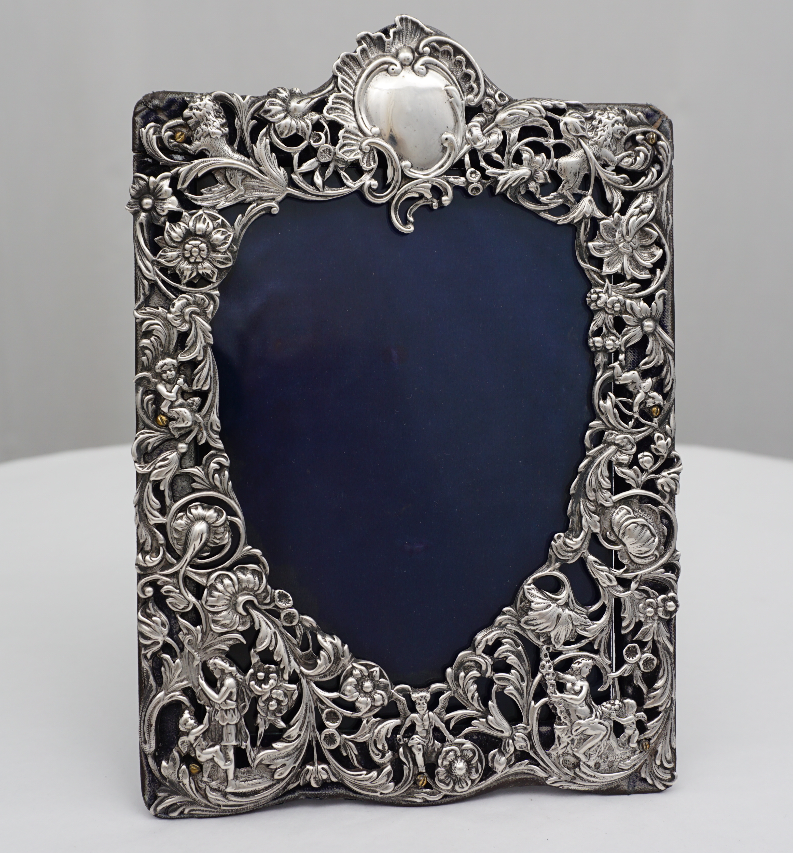 DESCRIPTION | Scarce antique English Victorian pierced solid sterling silver mounted portrait photograph frame with a heart shaped aperture and felt strut back. A blank rococo cartouche surmounts bounteous trailing and entwined floral and foliate decoration that embraces lions, maidens and cherubs. |