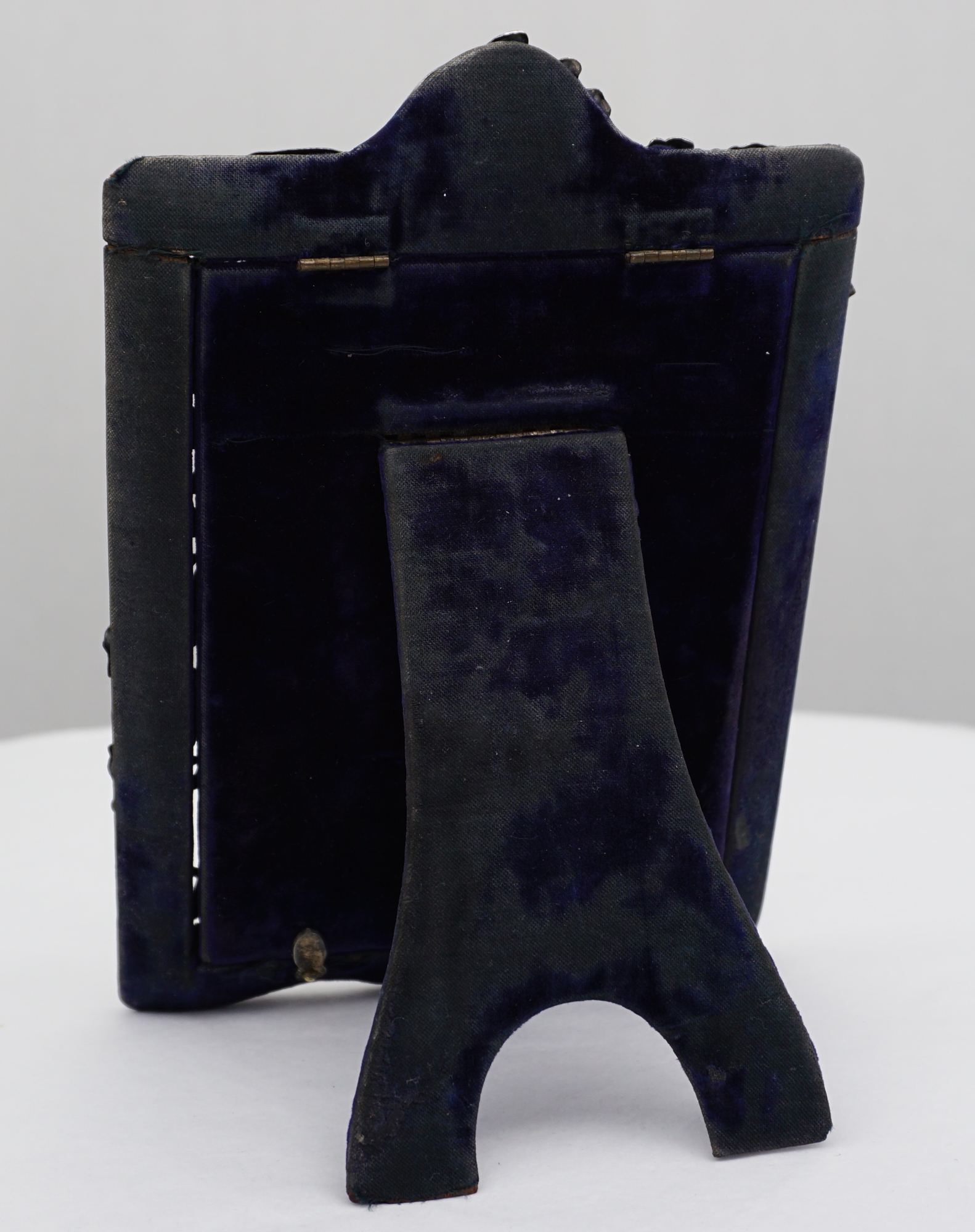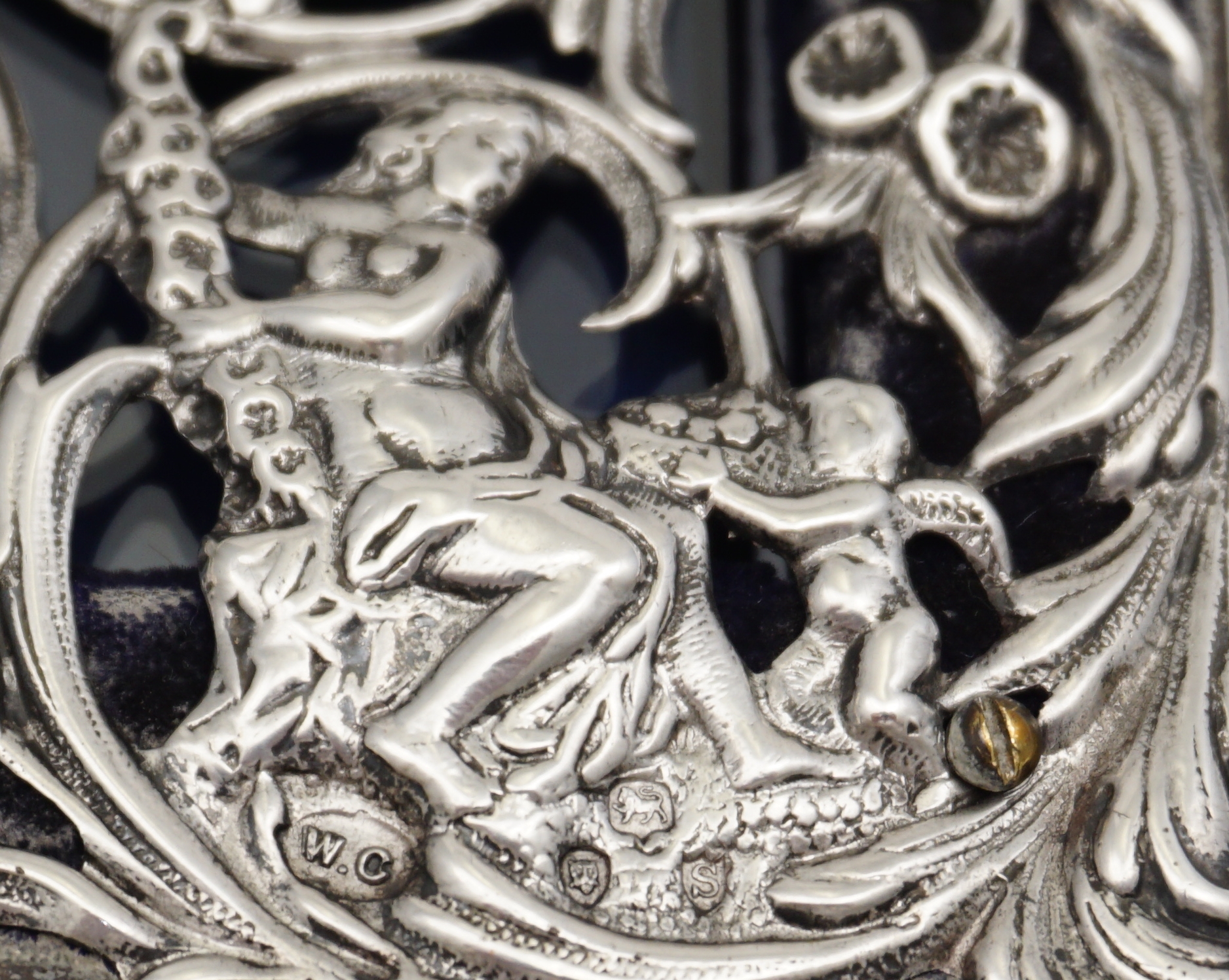 CONDITION | excellent for such and old and relatively delicate item, rubbing to felt backing, small silver loss to one, possibly both, top corners, micro bump to cartouche, pinhole to two highpoints of C scrolls surrounding cartouche, new glass fitted |