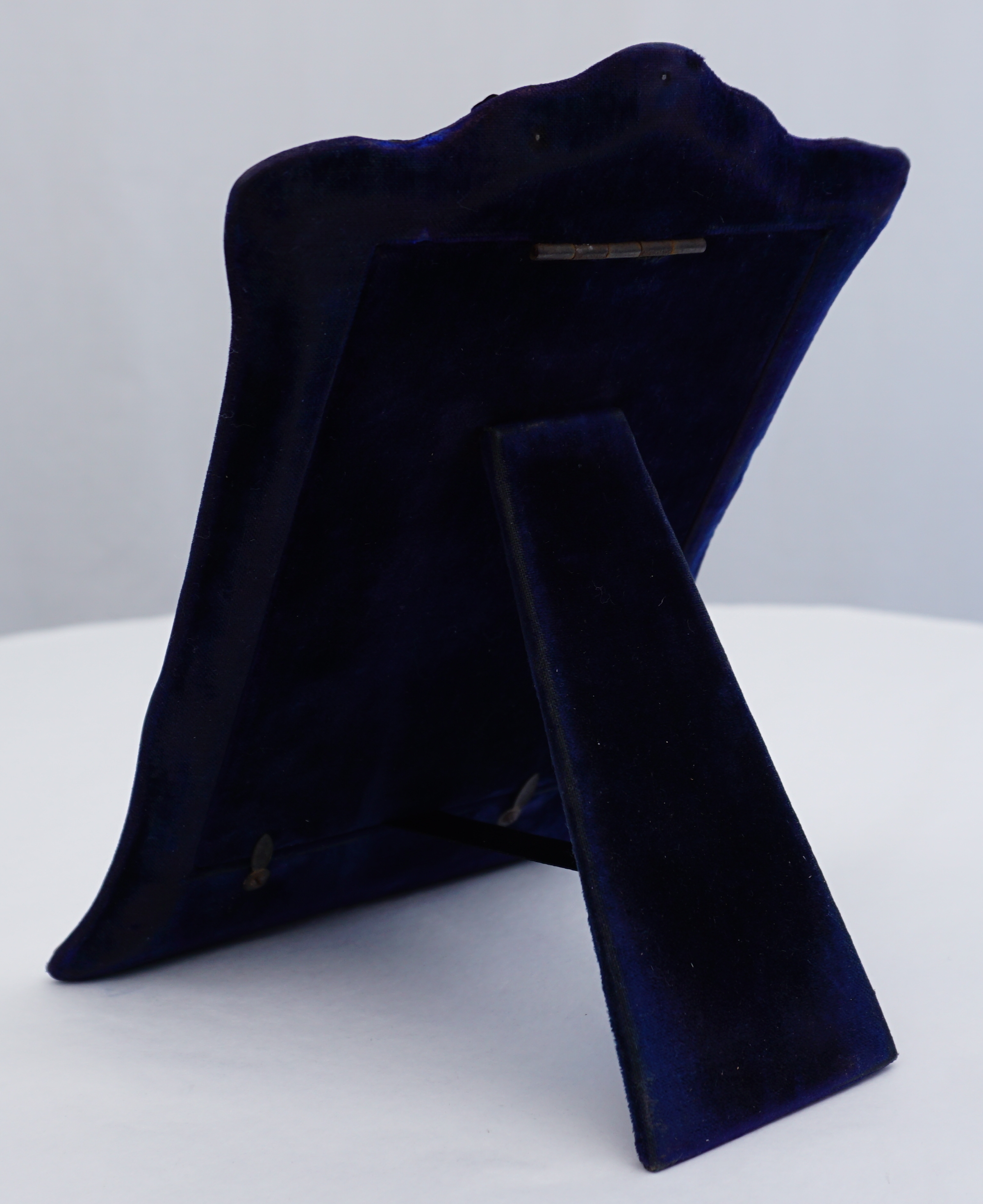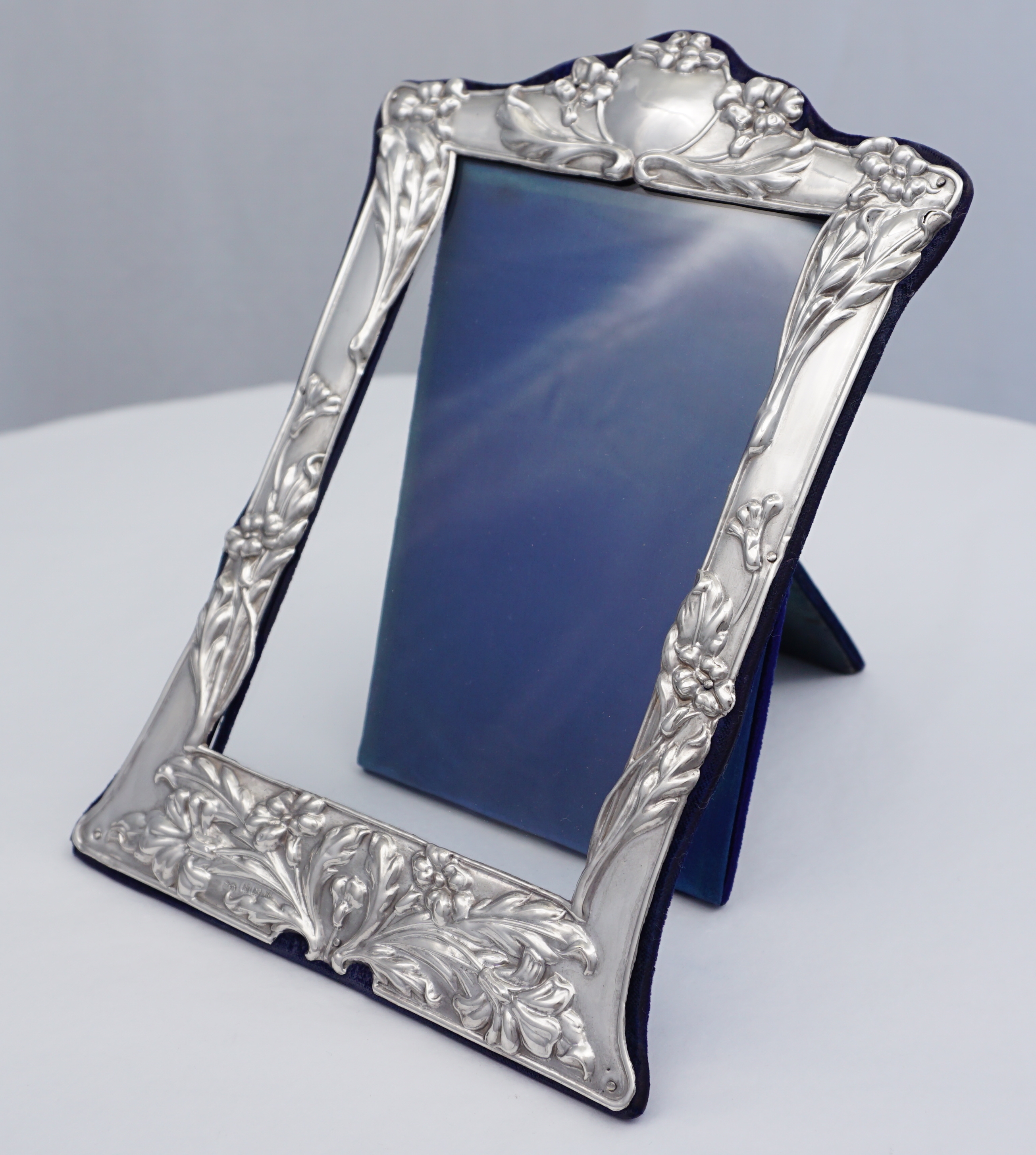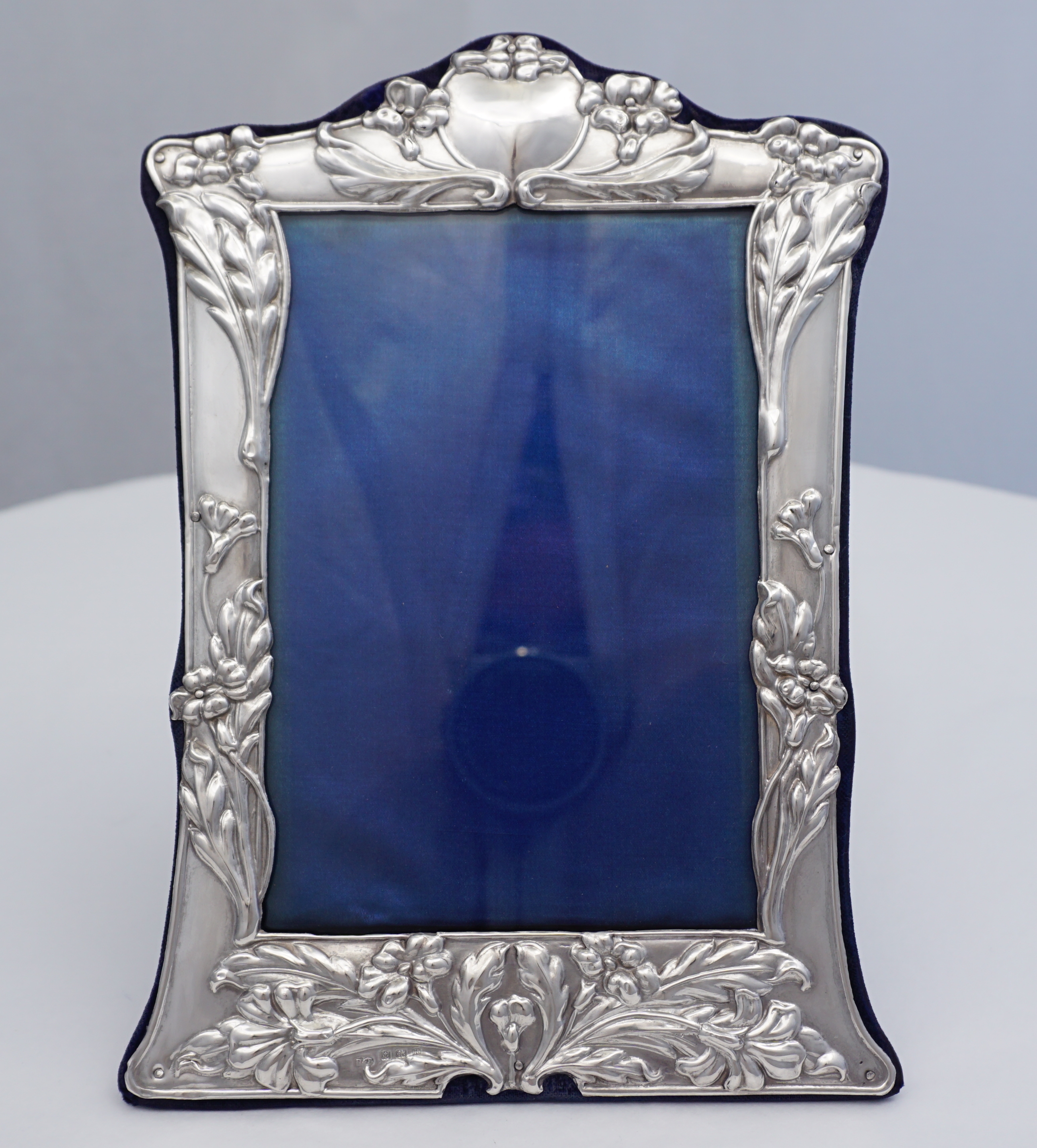 DESCRIPTION | Very good antique Edwardian solid sterling silver mounted Art Nouveau portrait photograph frame with a blank cartouche, floral and foliate decoration and a blue felt strut back. |