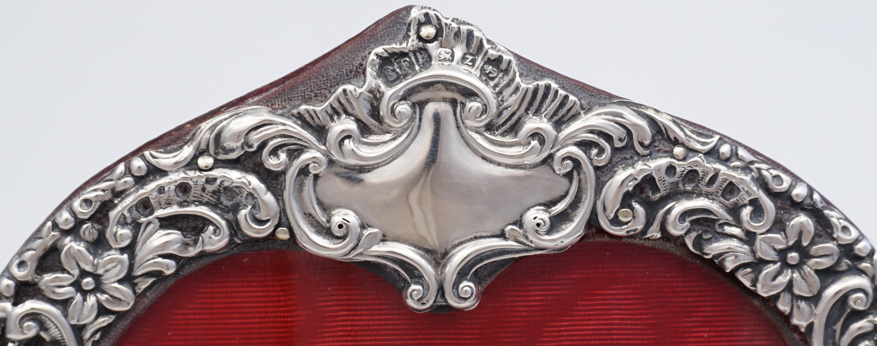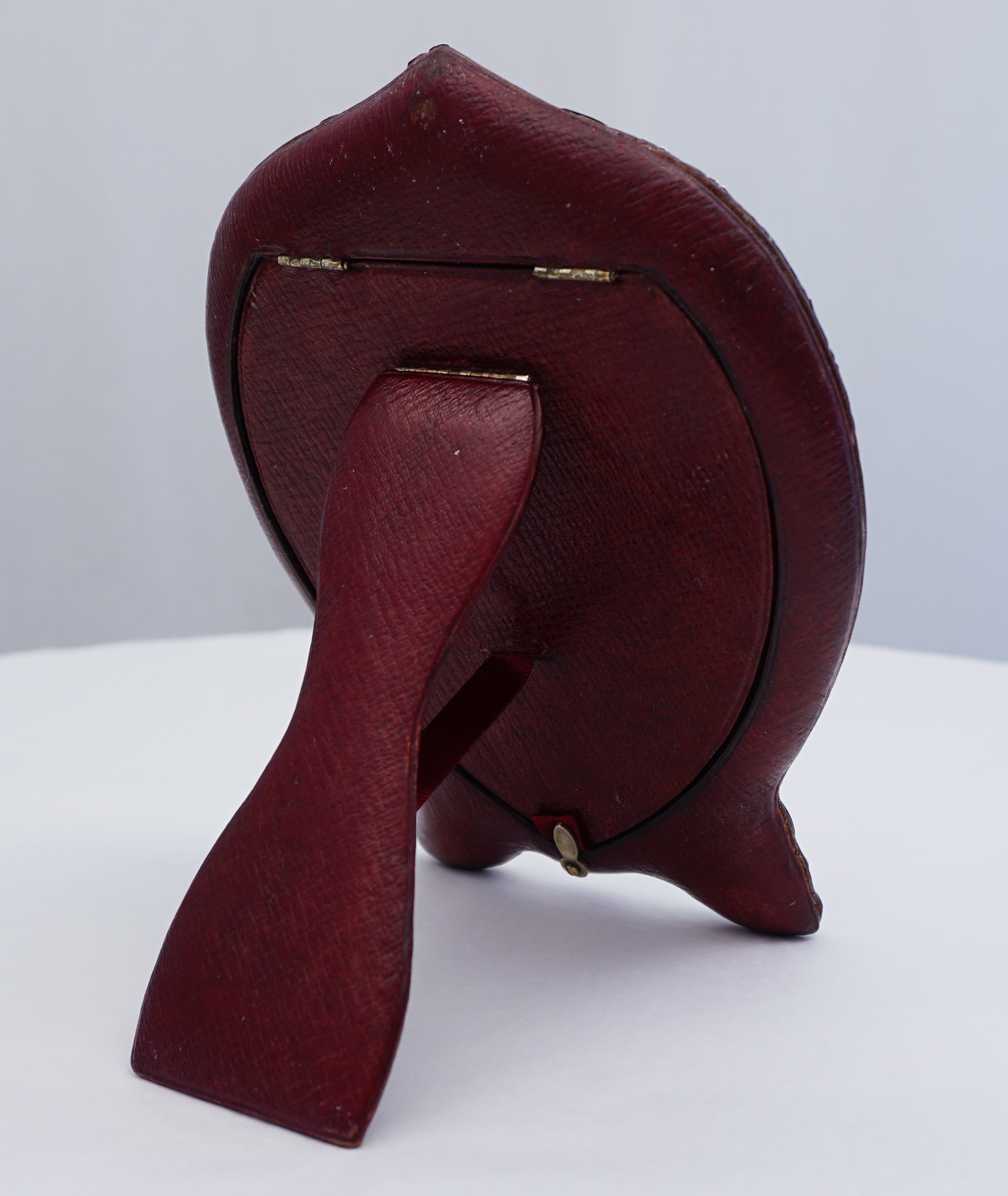 DESCRIPTION | Very good and rare antique English Victorian solid sterling silver mounted portrait photograph frame with a heart shaped aperture, blank cartouche and wine colour leather strut back. |