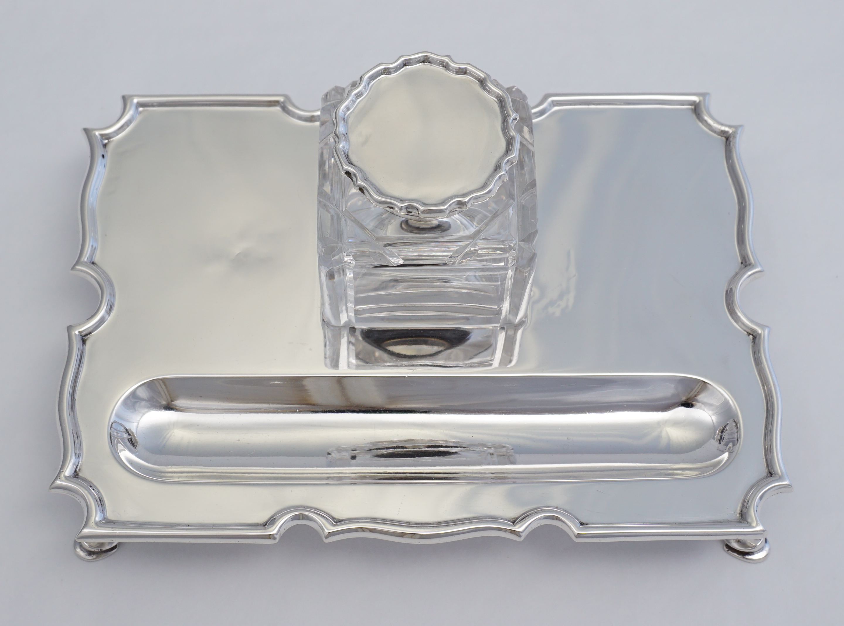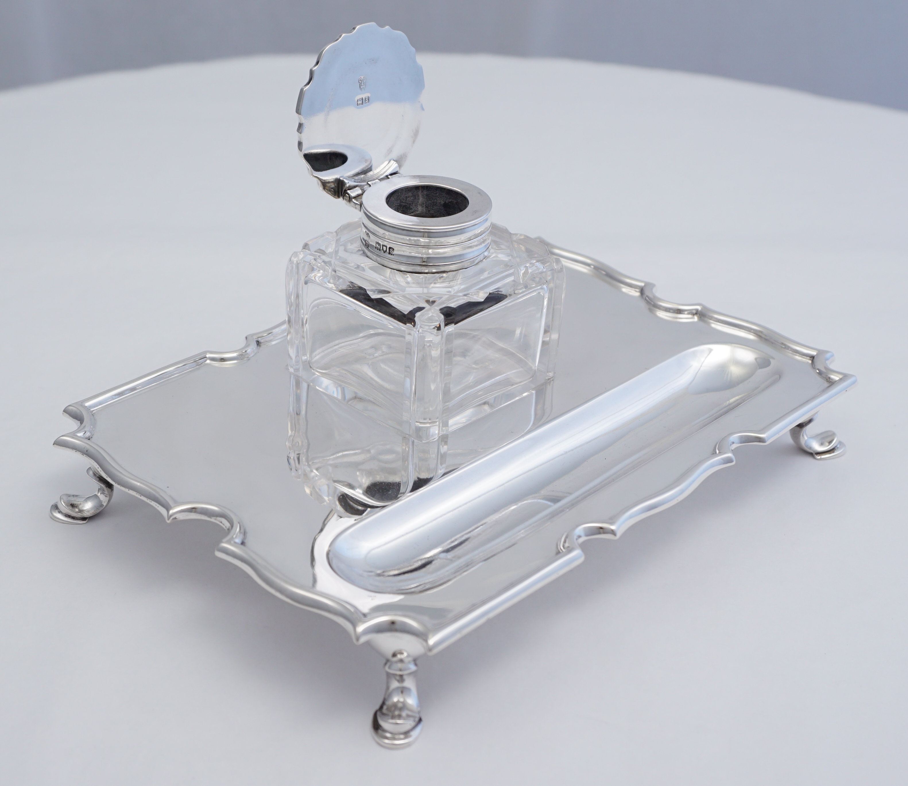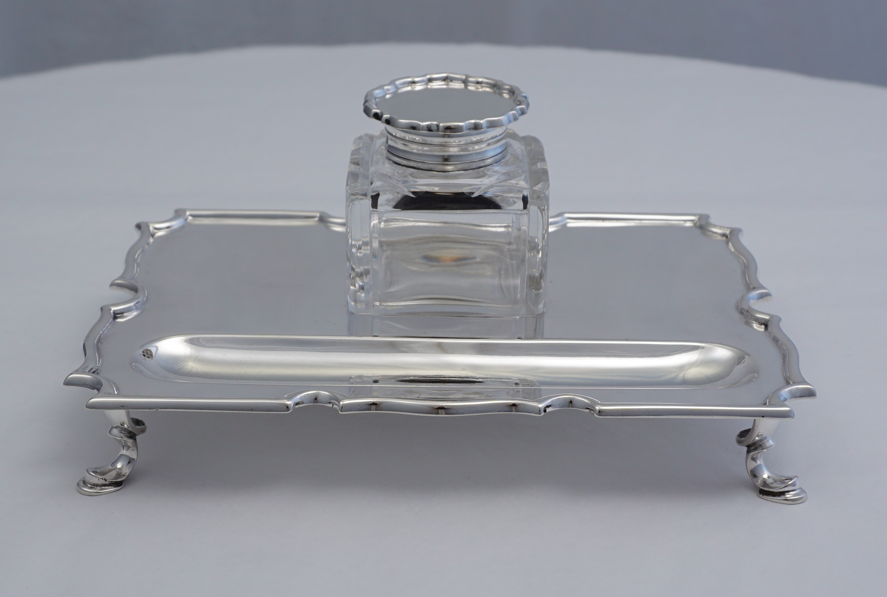 DESCRIPTION | Good antique English solid sterling silver inkstand on four hoof feet and with pen receiver and silver lidded cut glass bottle. If you lift out the bottle it becomes a most impressive mobile phone rest. |