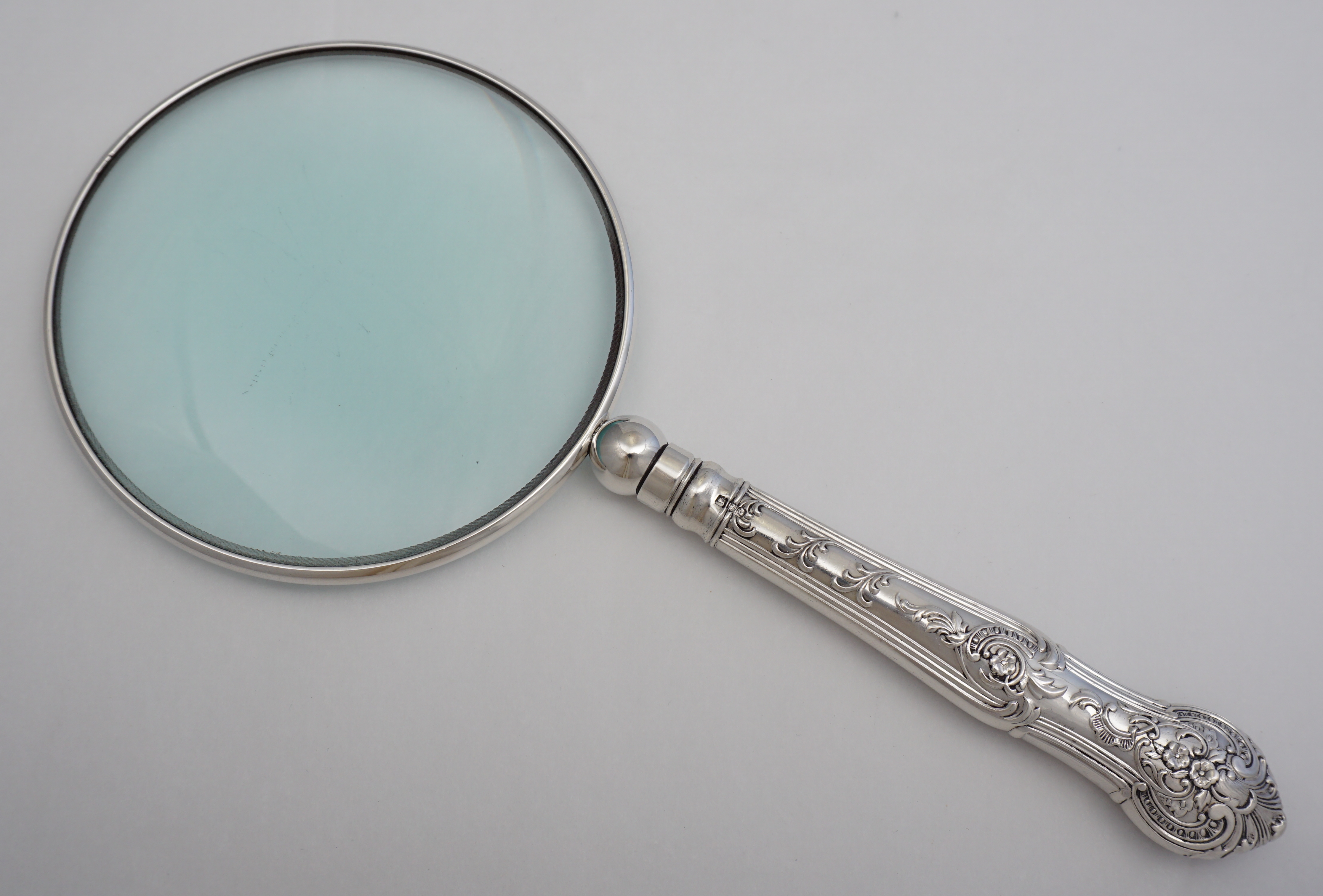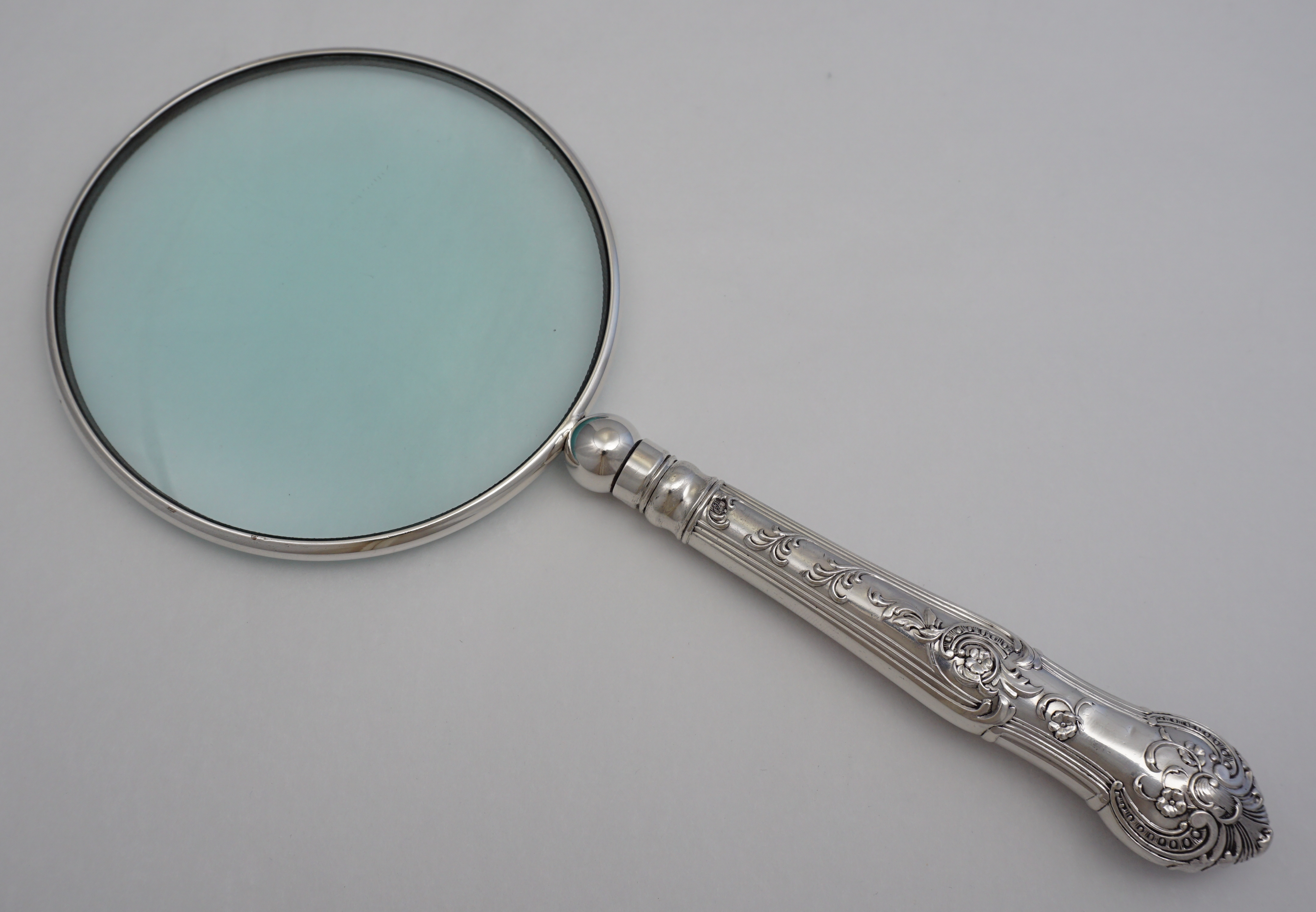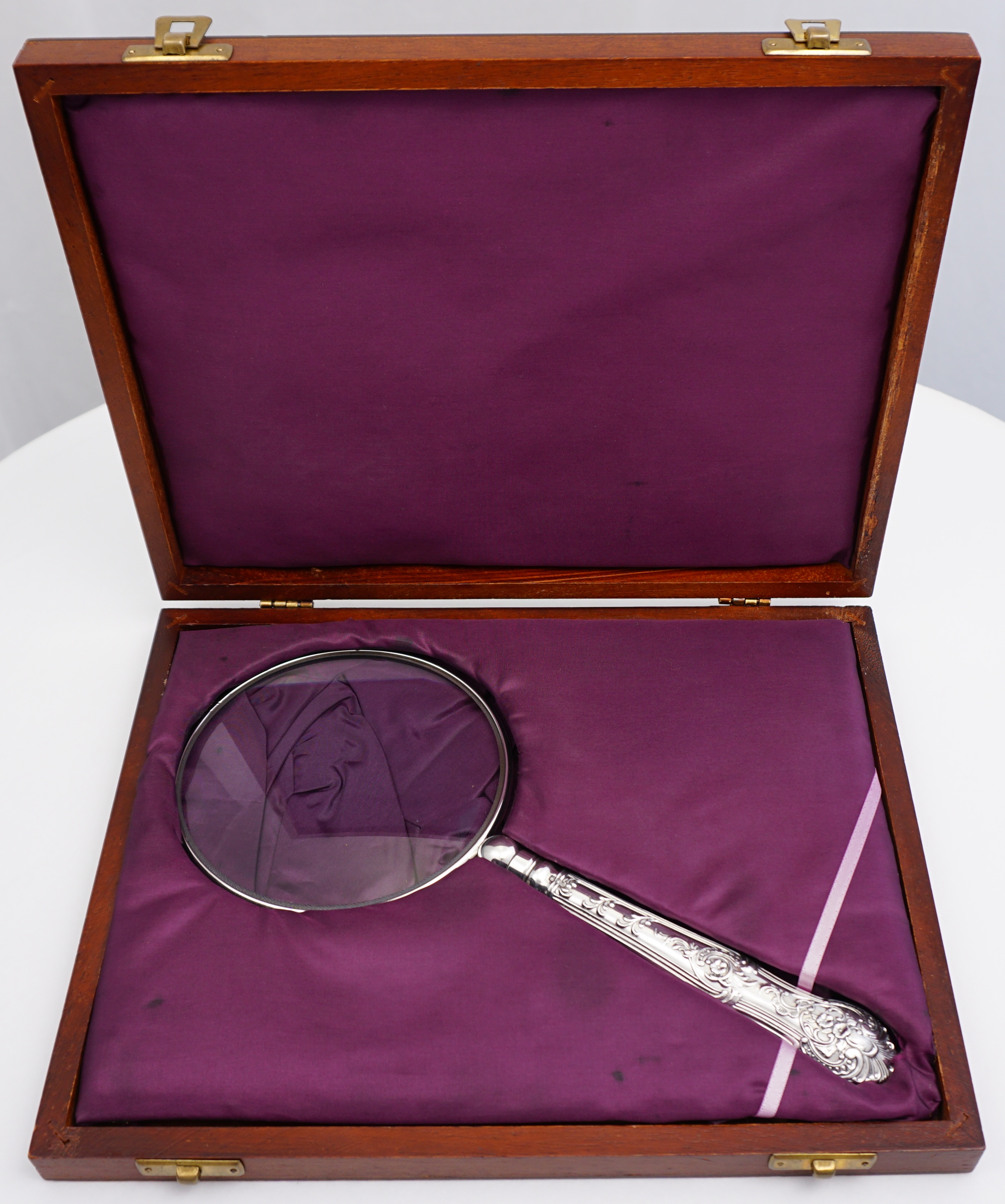 DESCRIPTION | Good and large English Edwardian loaded sterling silver handled magnifying glass within a fitted case. Perhaps a bit heavy for book reading but would be ideal for inspecting paintings and prints. I have also found it efficacious for inspecting the general condition of silverware. The case lining has a somewhat homemade feel and is probably later. |