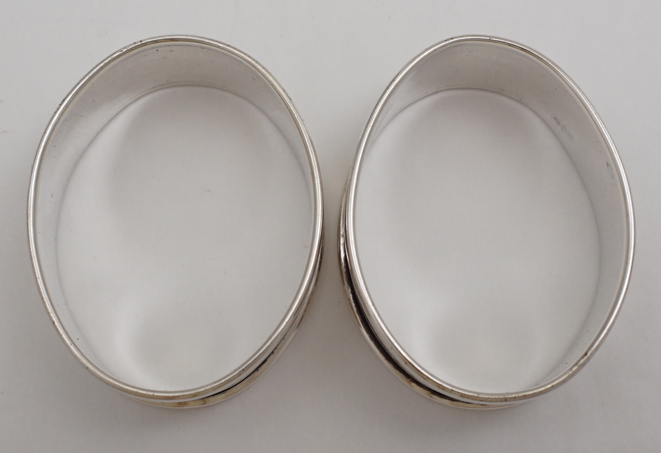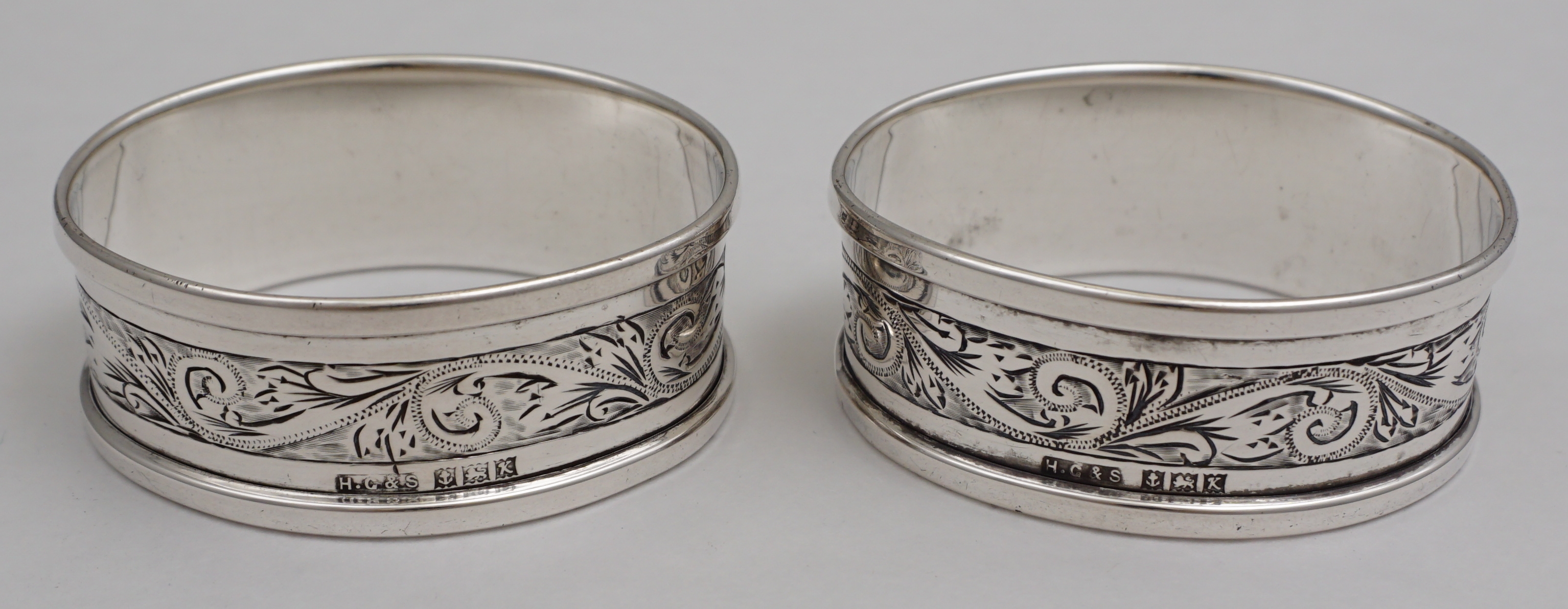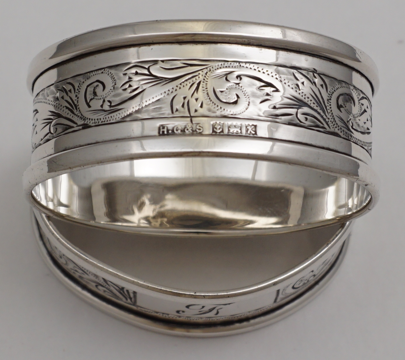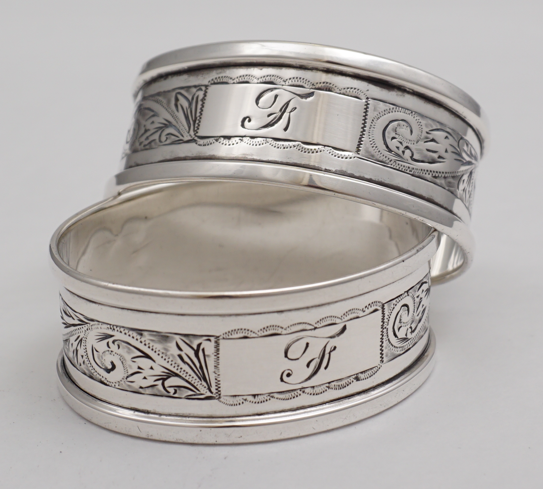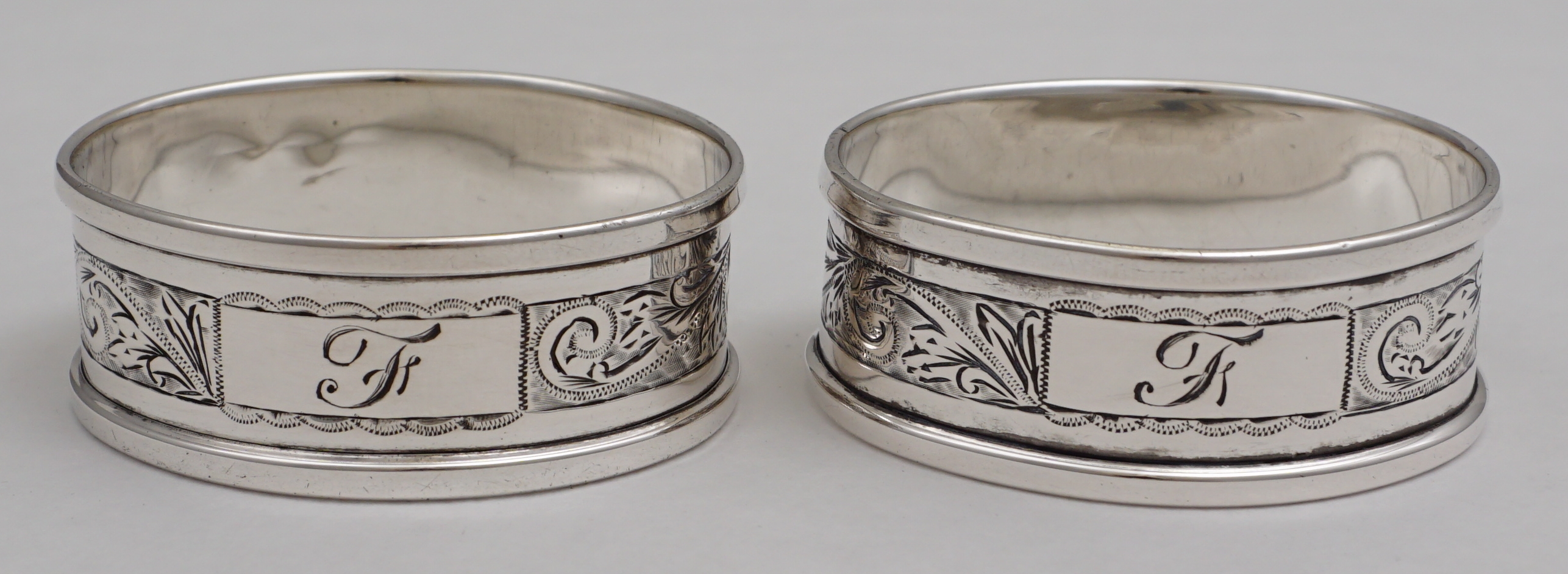 DESCRIPTION | Pair of oval vintage solid sterling silver napkin or serviette rings with a band of engraved foliate decoration and cartouche engraved 'F'. |