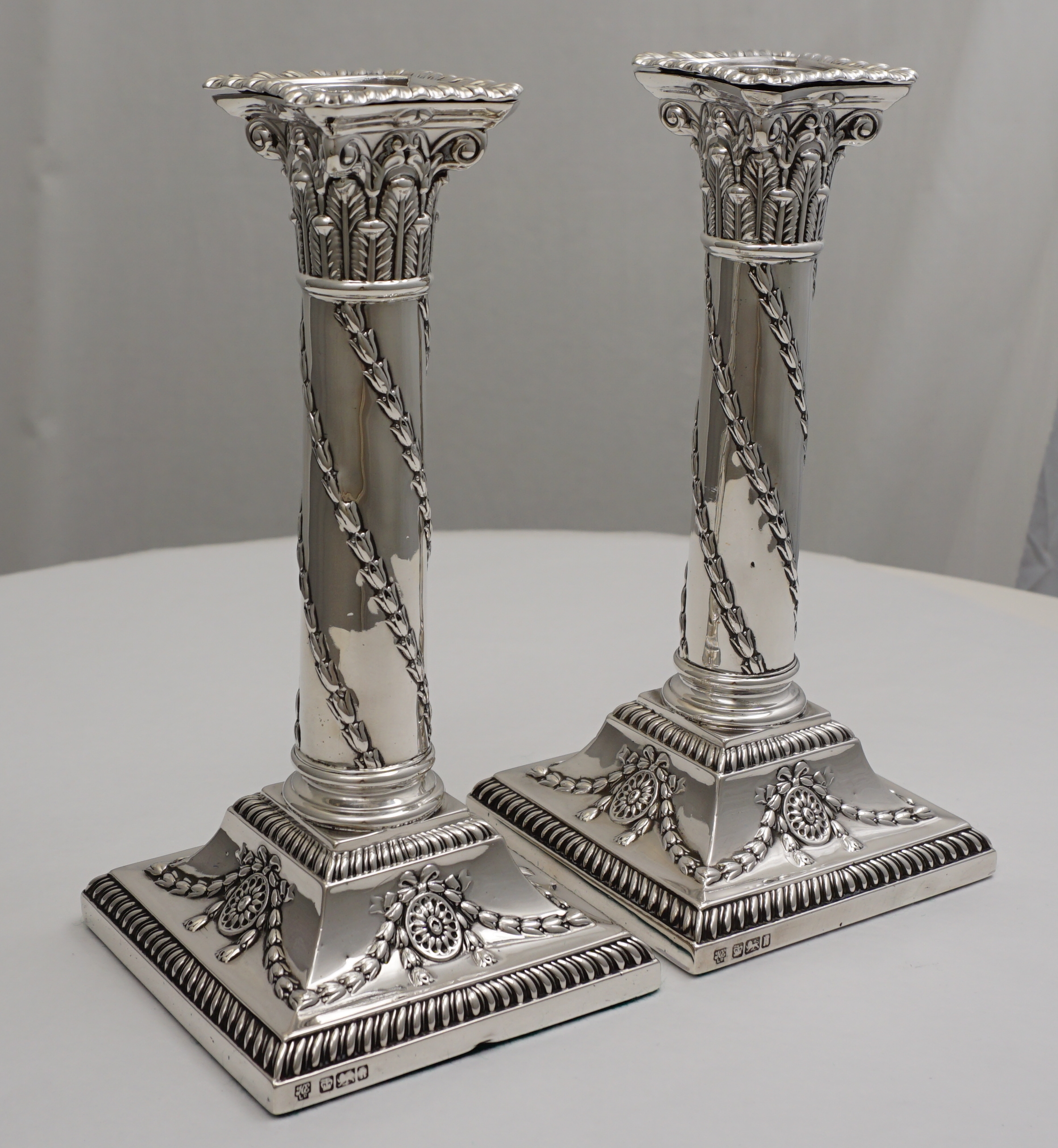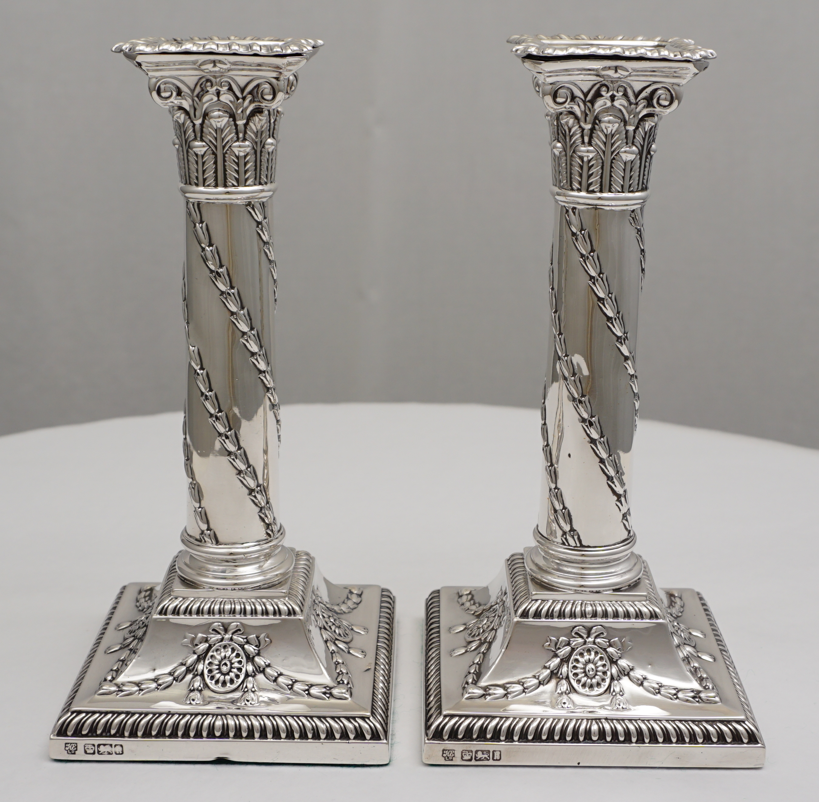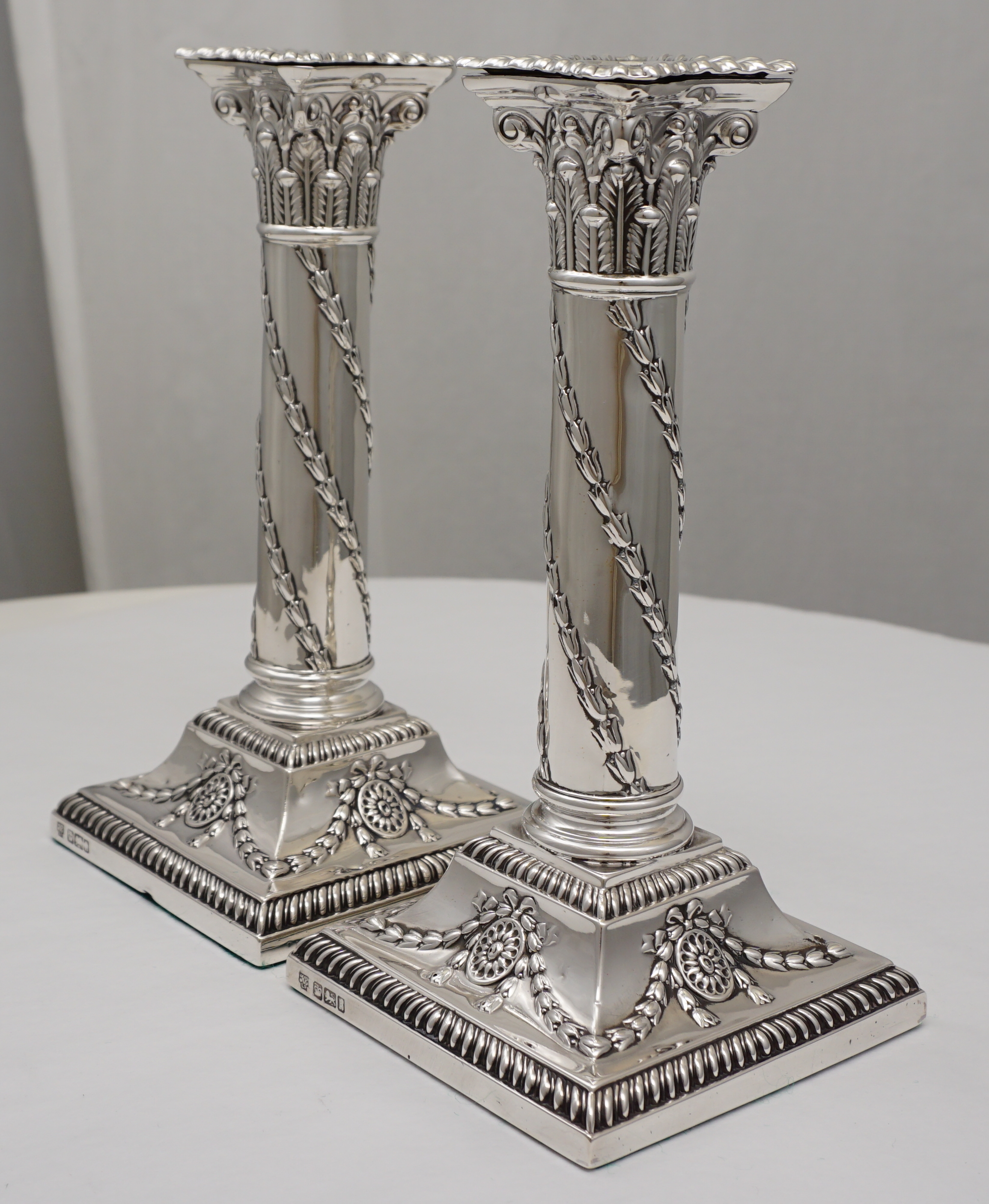 DESCRIPTION | Very good pair of antique English Edwardian loaded and base weighted sterling silver Corinthian column candlesticks with gadroon and swag decoration and felt lined bases. Correctly and clearly hallmarked to base rims and removable sconces |