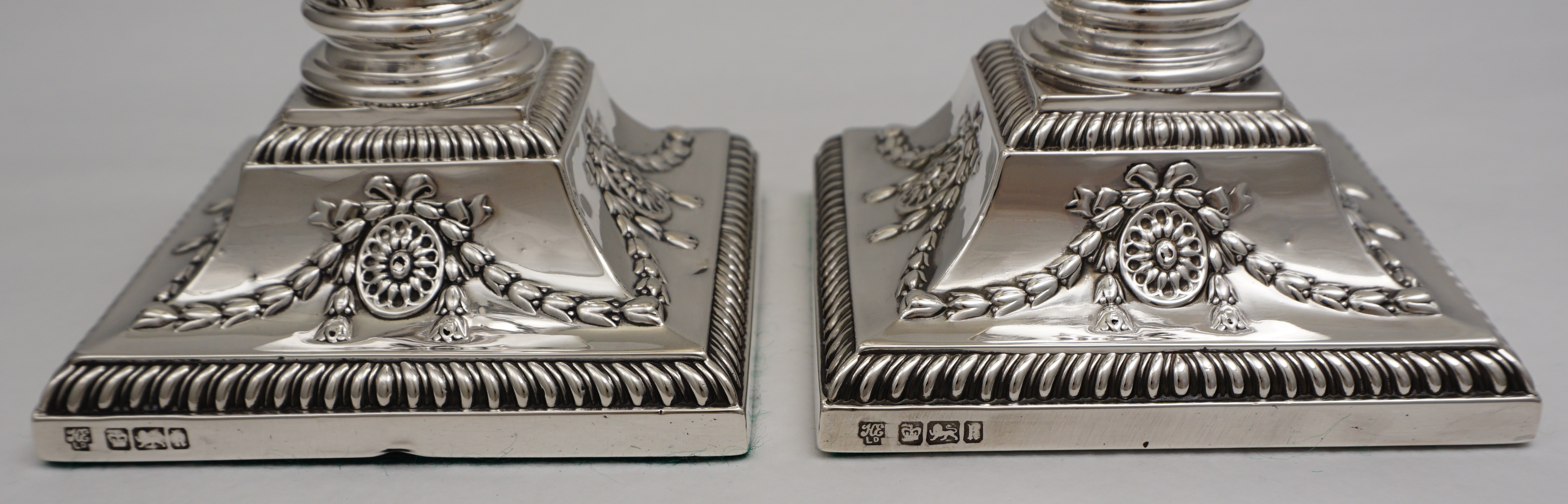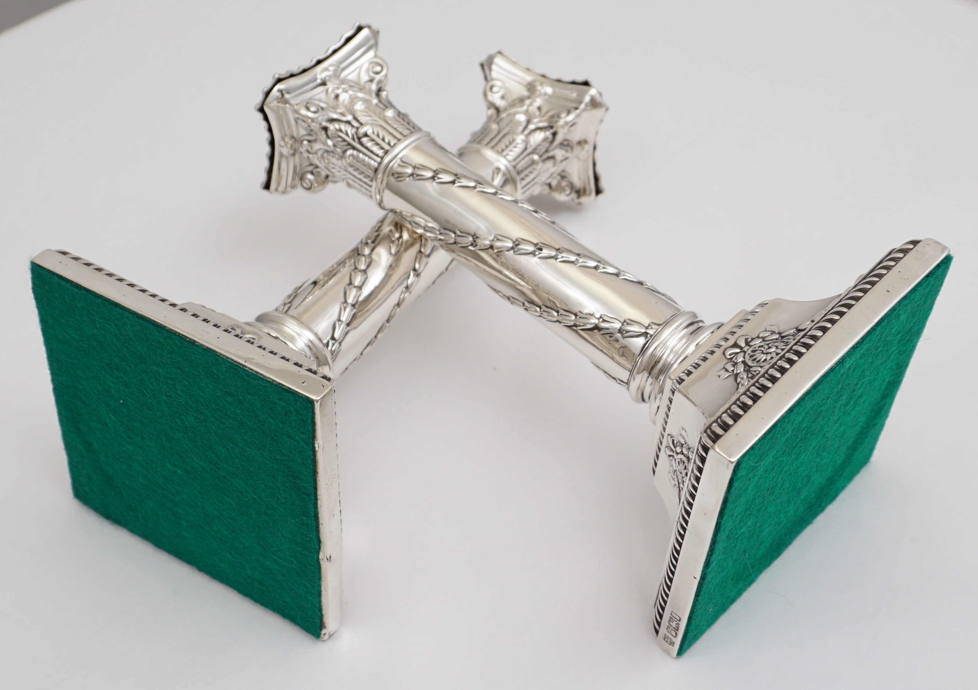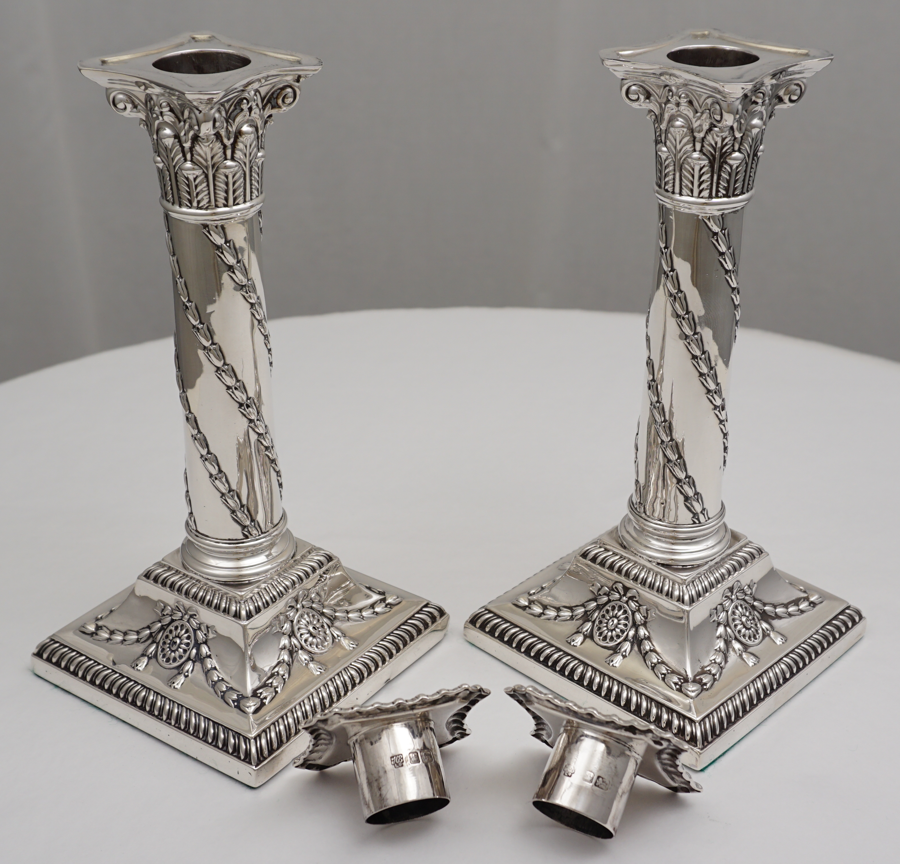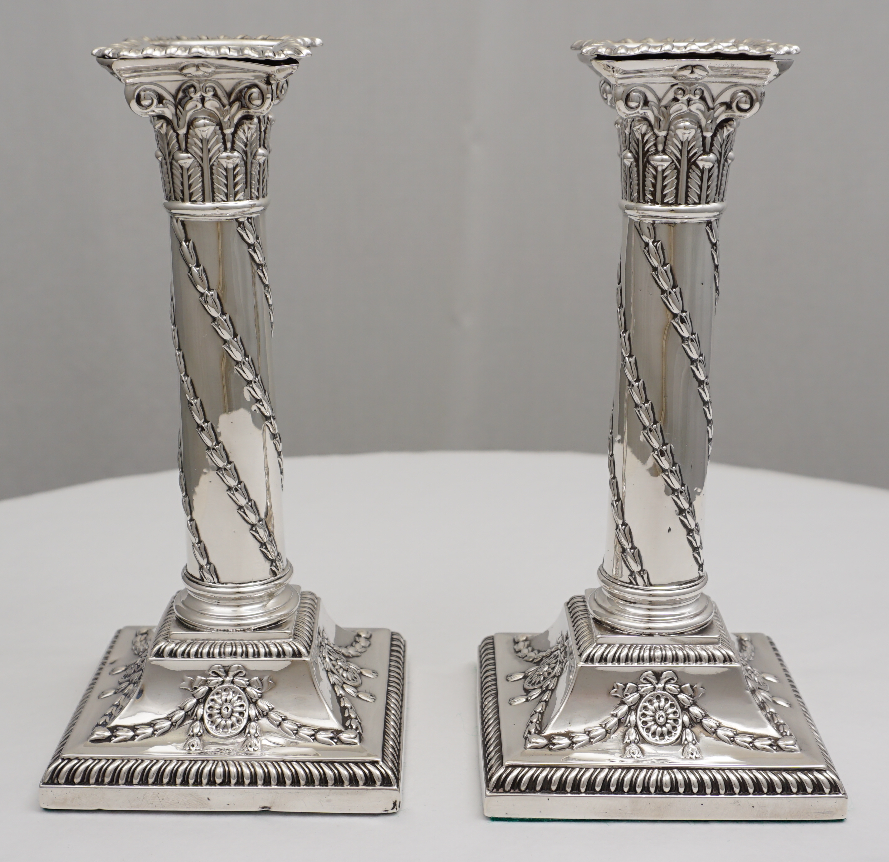 DESCRIPTION | Very good pair of antique English Edwardian loaded and base weighted sterling silver Corinthian column candlesticks with gadroon and swag decoration and felt lined bases. Correctly and clearly hallmarked to base rims and removable sconces |