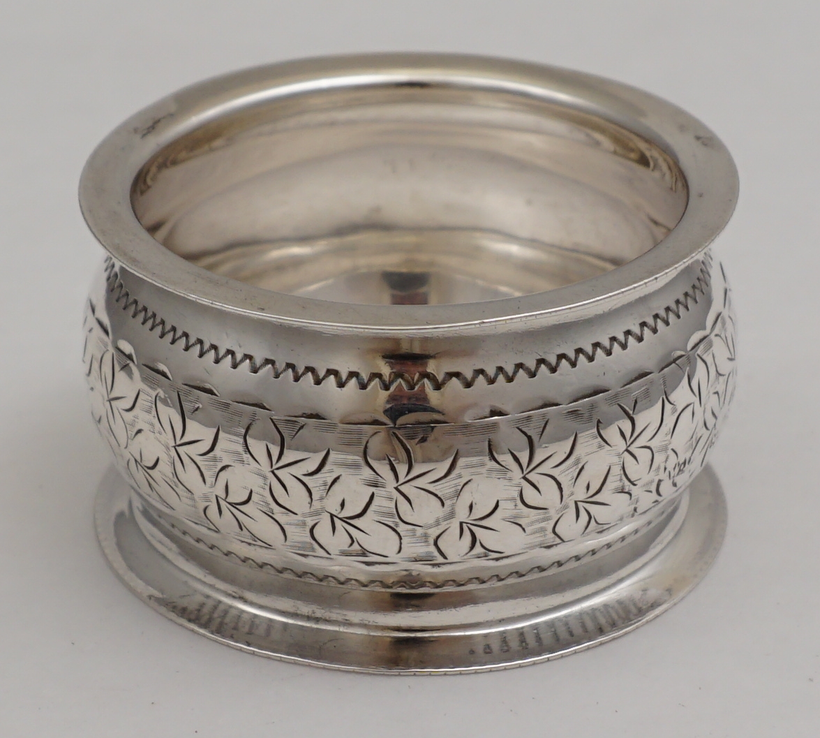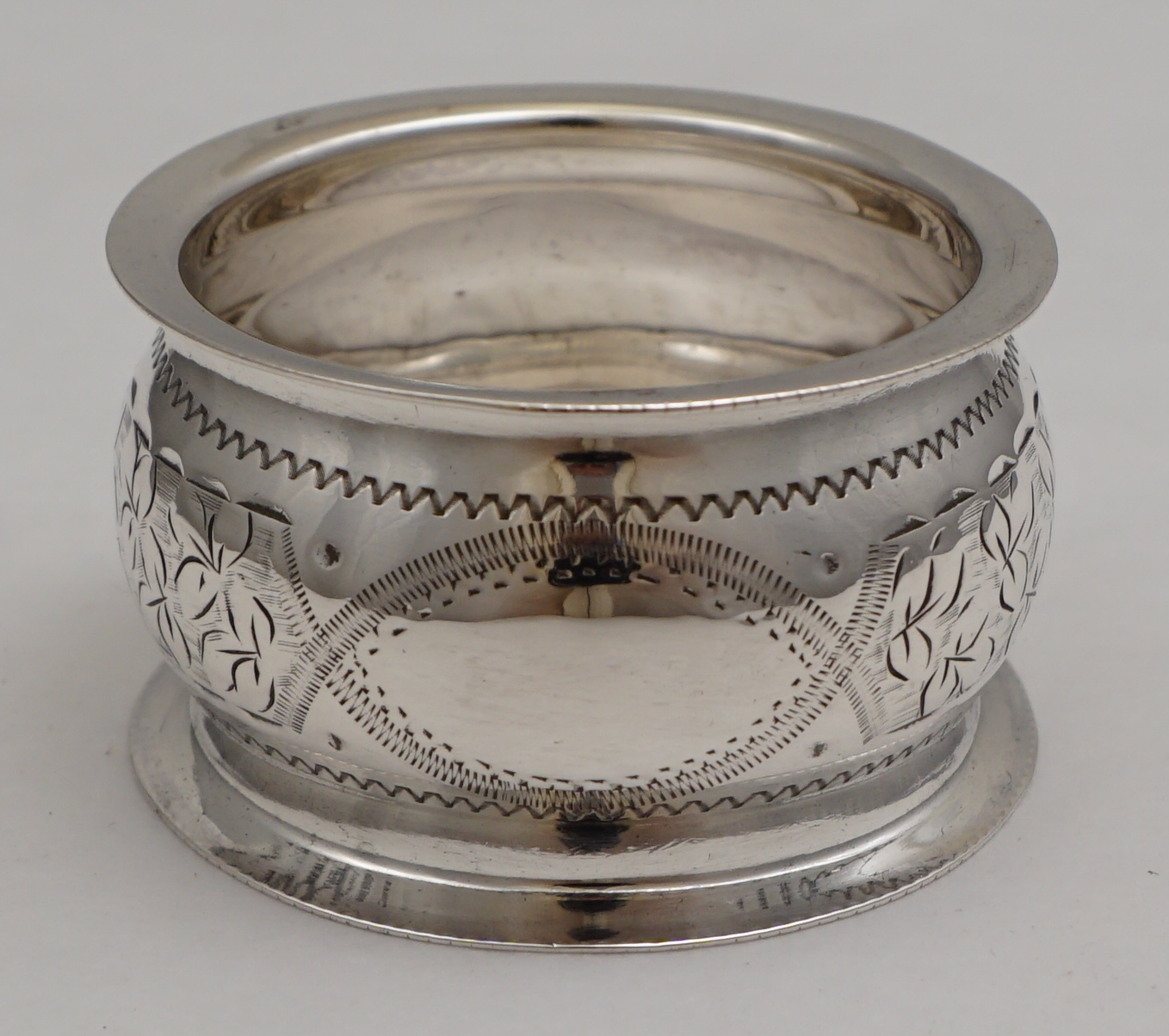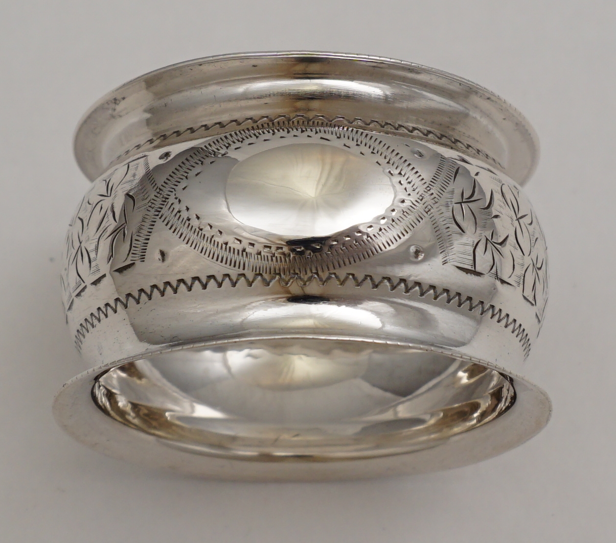 DESCRIPTION | Very good English Victorian solid sterling silver napkin ring with engraved decoration and a blank cartouche. |