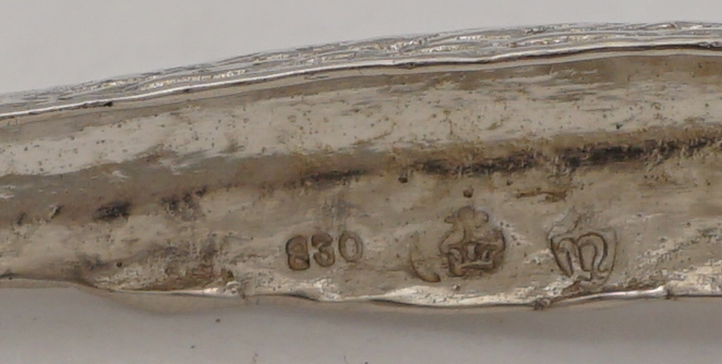 ASSAY OFFICE | Hanau, also marked with Halbmond und Krone (moon & crown) for German silver post 1886 and standard mark ·830 |