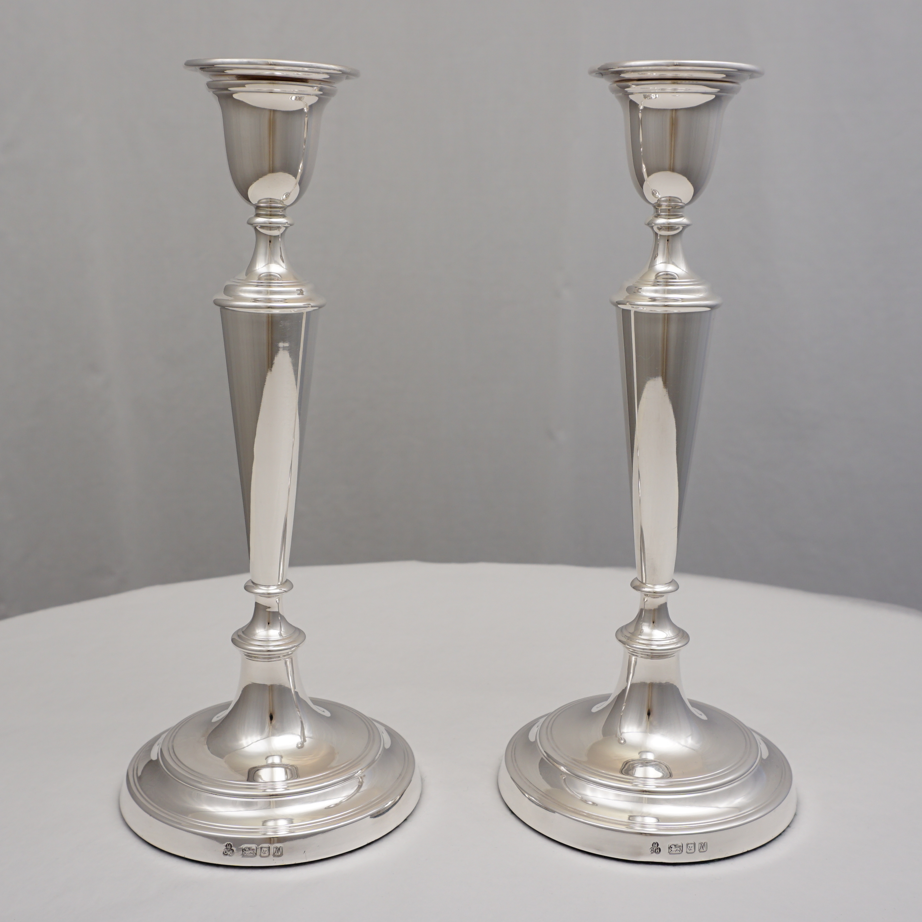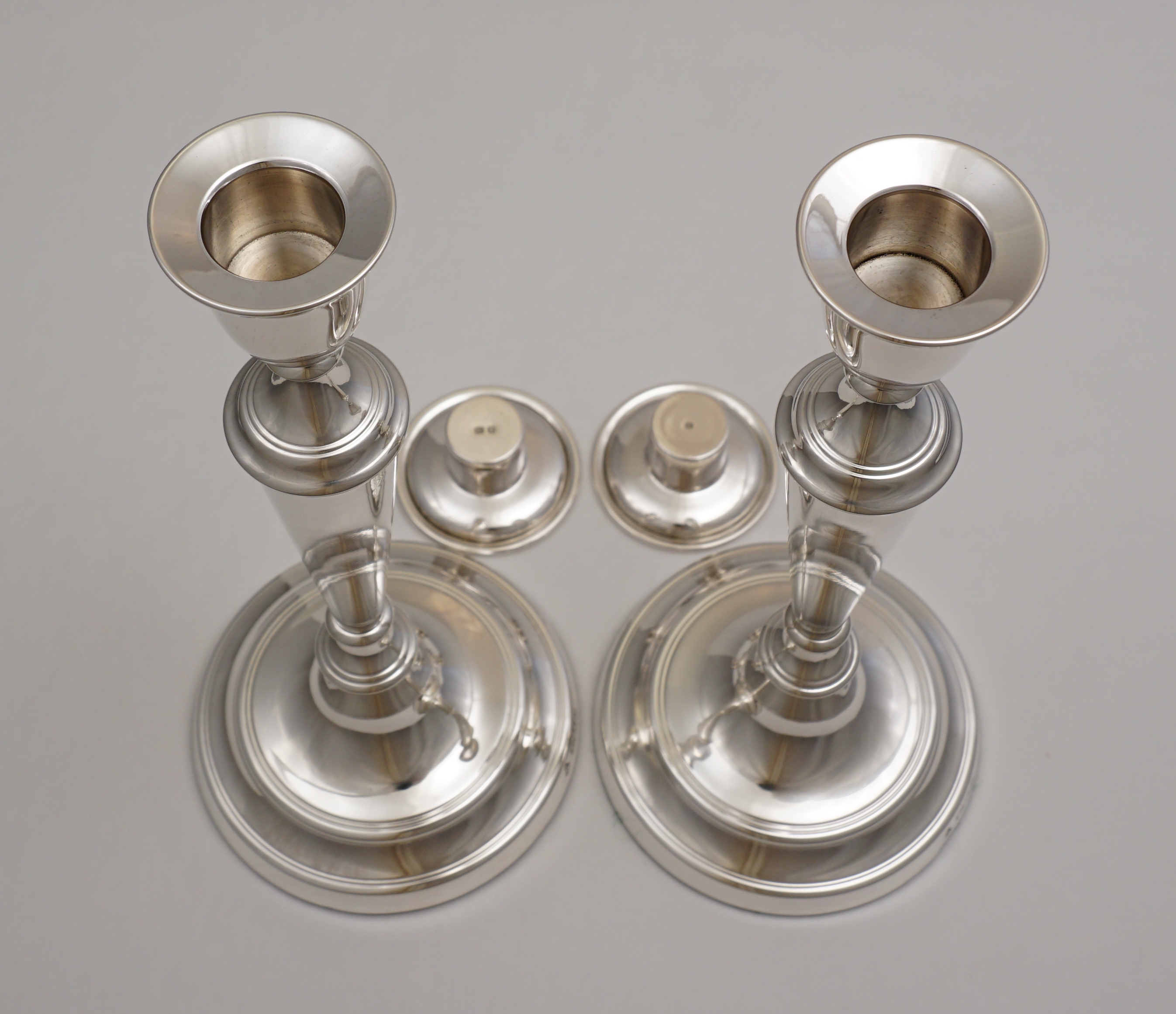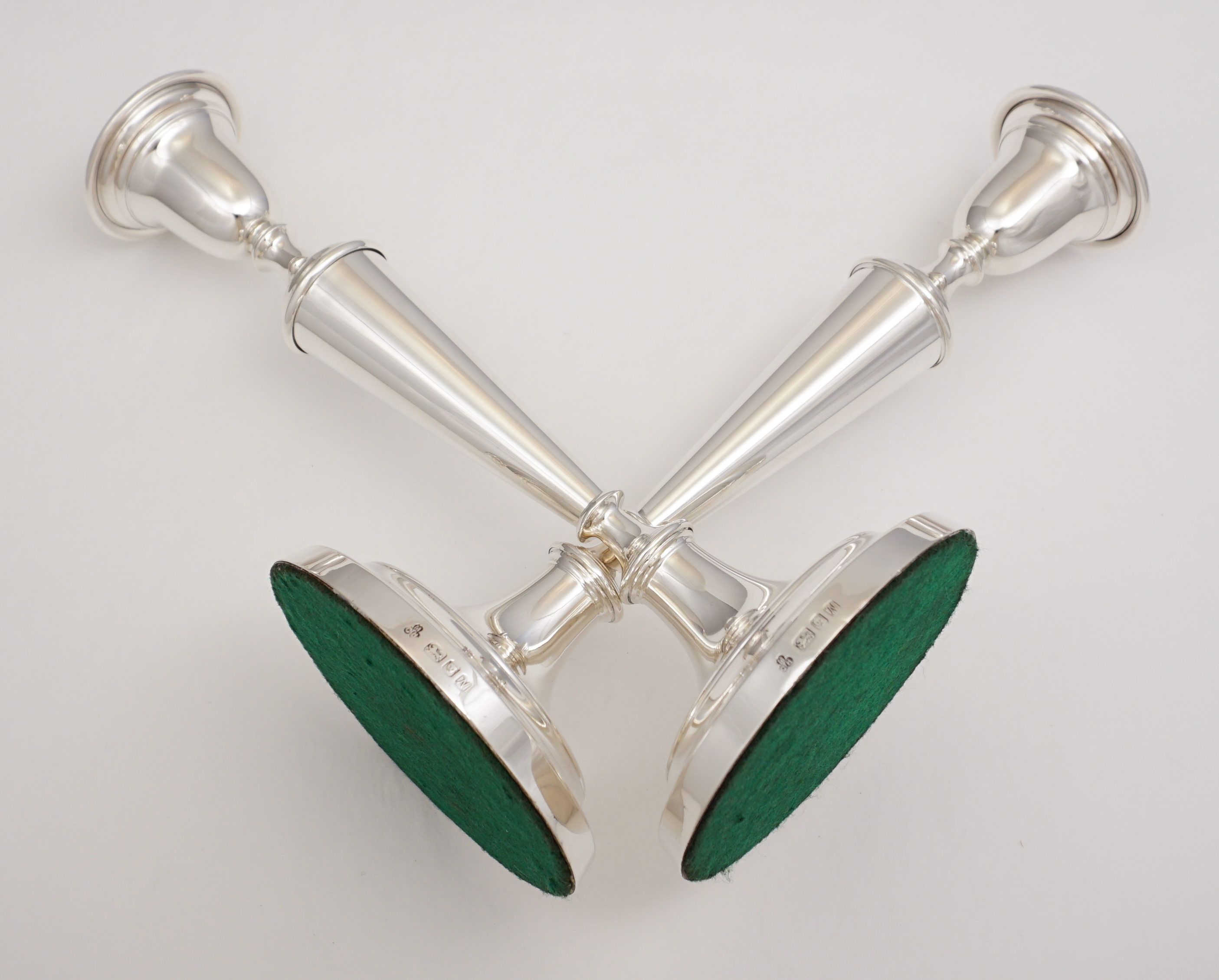 DESCRIPTION | Good pair of vintage loaded sterling silver candlesticks with removable sconces and green felt bases. Deal with recalcitrant candle stubs by simply lifting out the sconce and gently warming. The stub will slide out. Also works for sliding in a fresh candle. Hersey still sell this size and model of candlestick for £700/pair inc. tax today (1st May 2022). |