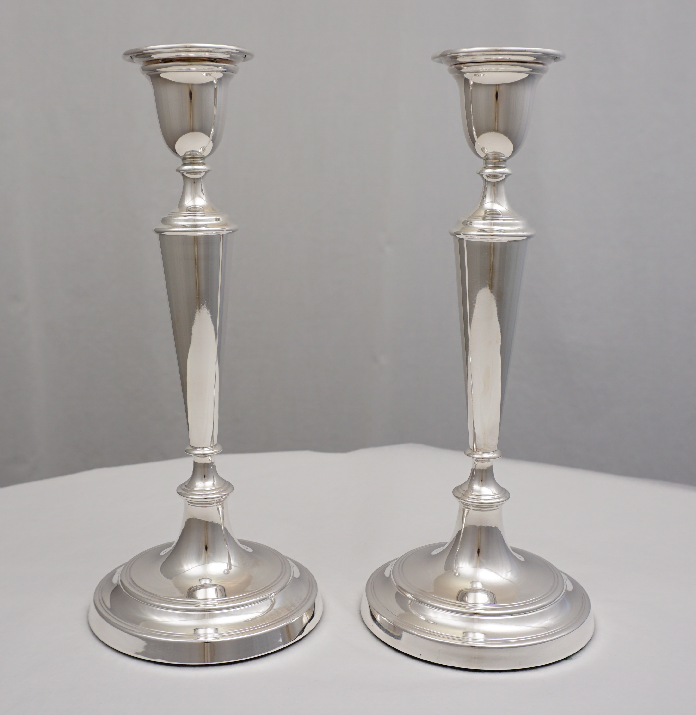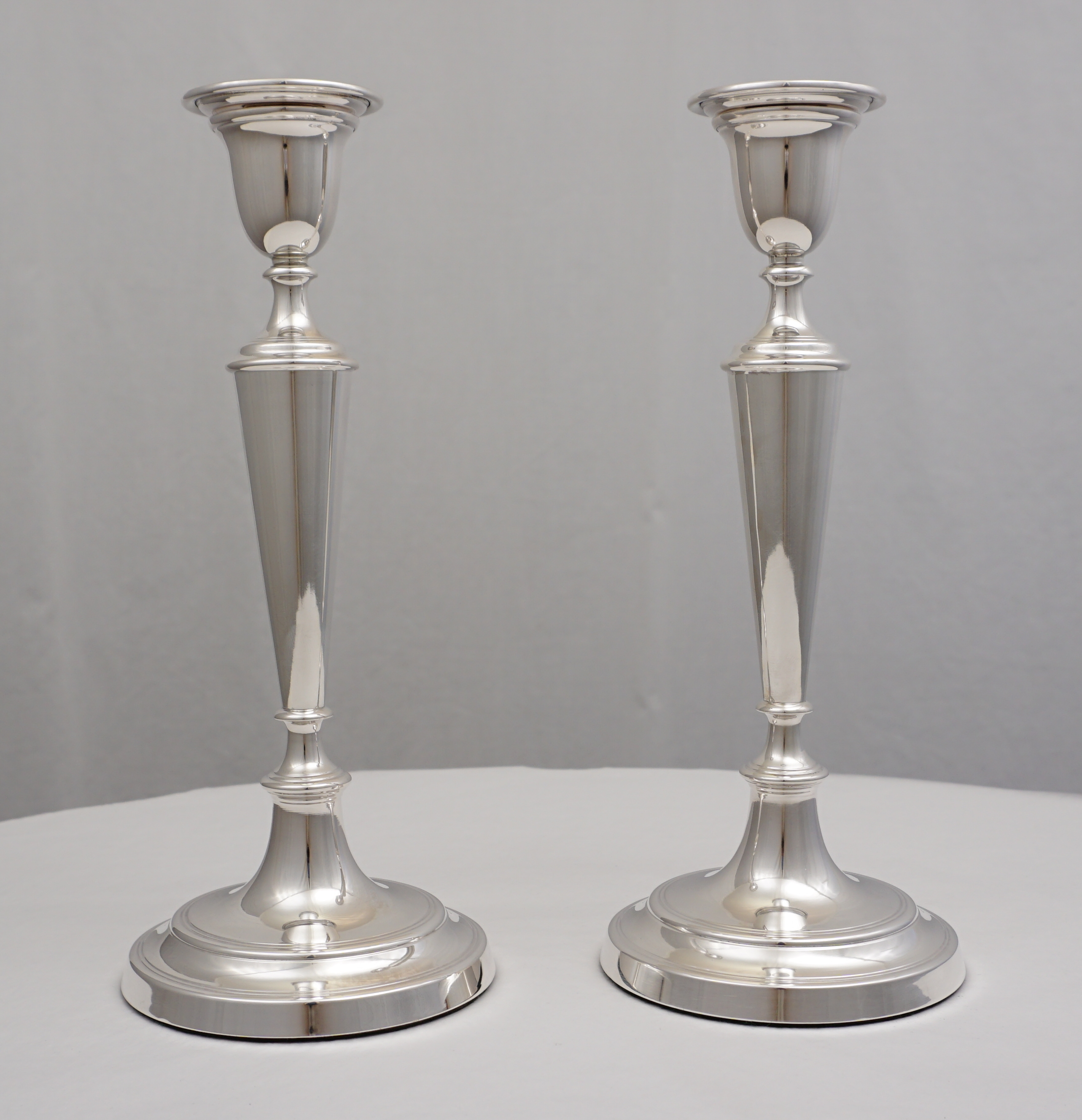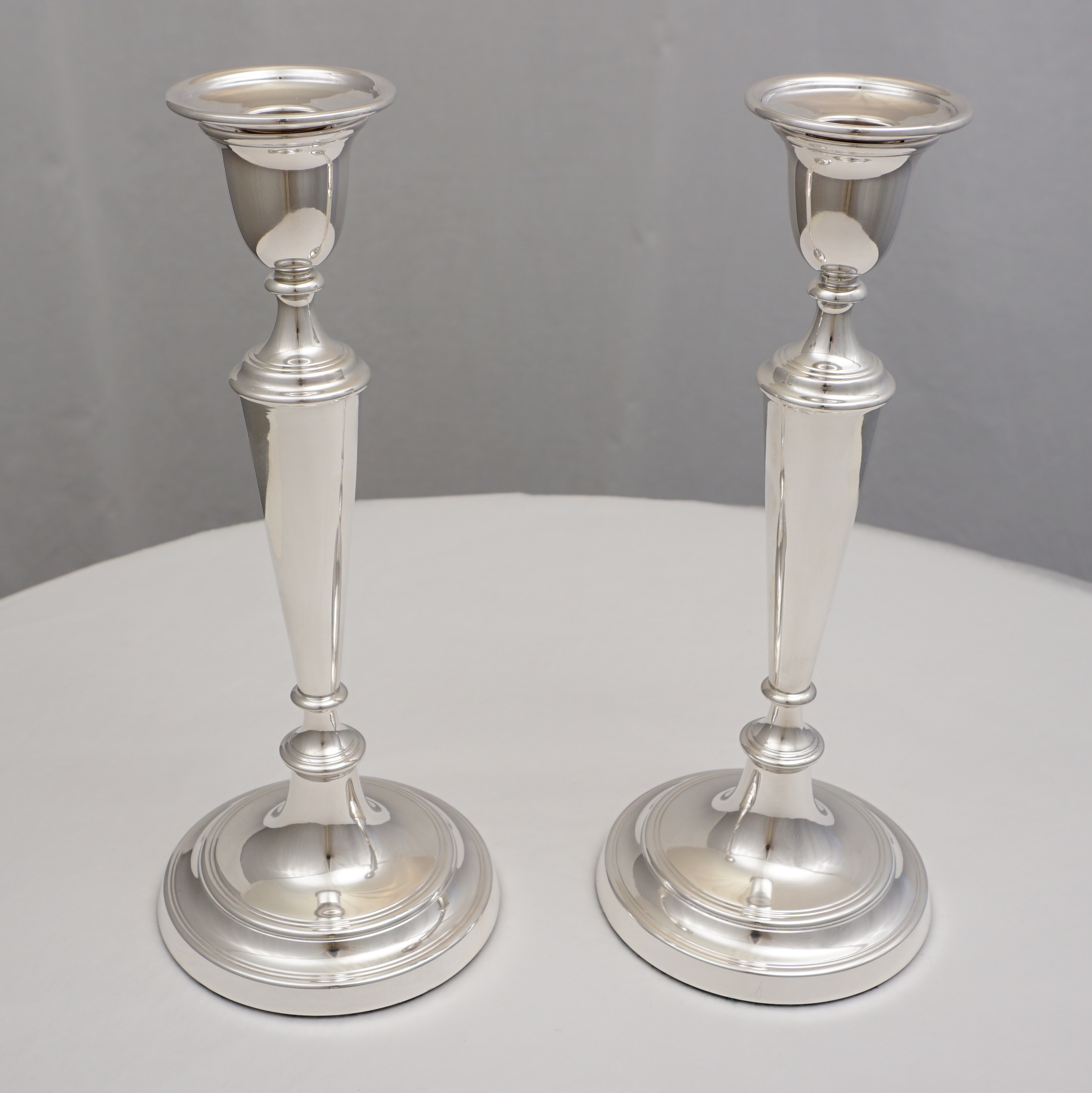 DESCRIPTION | Good pair of vintage loaded sterling silver candlesticks with removable sconces and green felt bases. Deal with recalcitrant candle stubs by simply lifting out the sconce and gently warming. The stub will slide out. Also works for sliding in a fresh candle. Hersey still sell this size and model of candlestick for £700/pair inc. tax today (1st May 2022). |