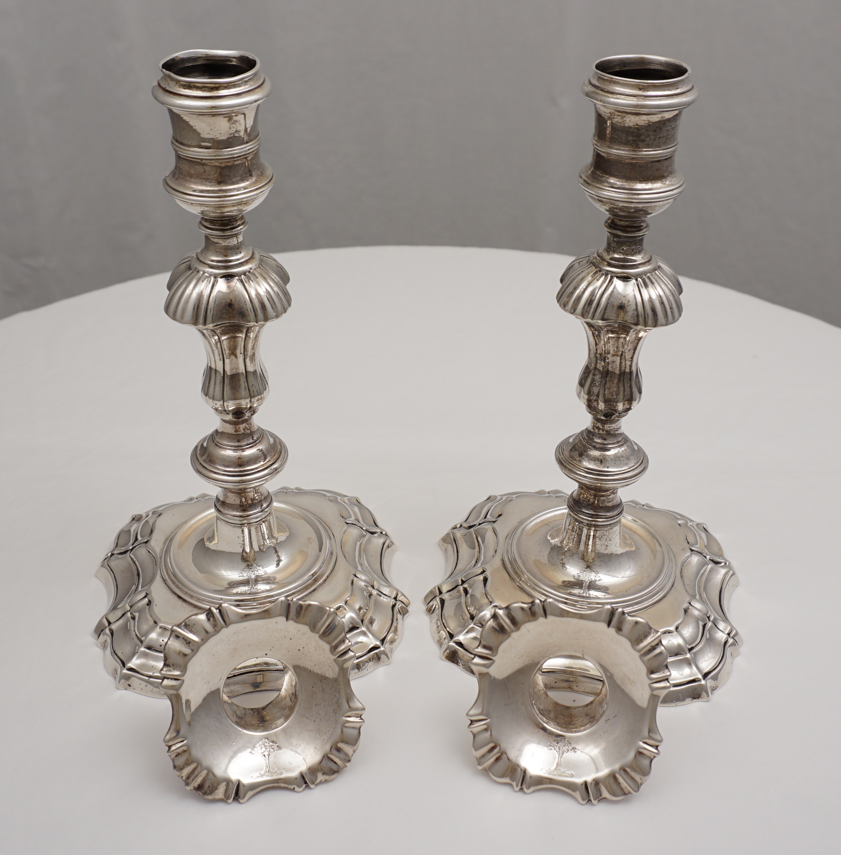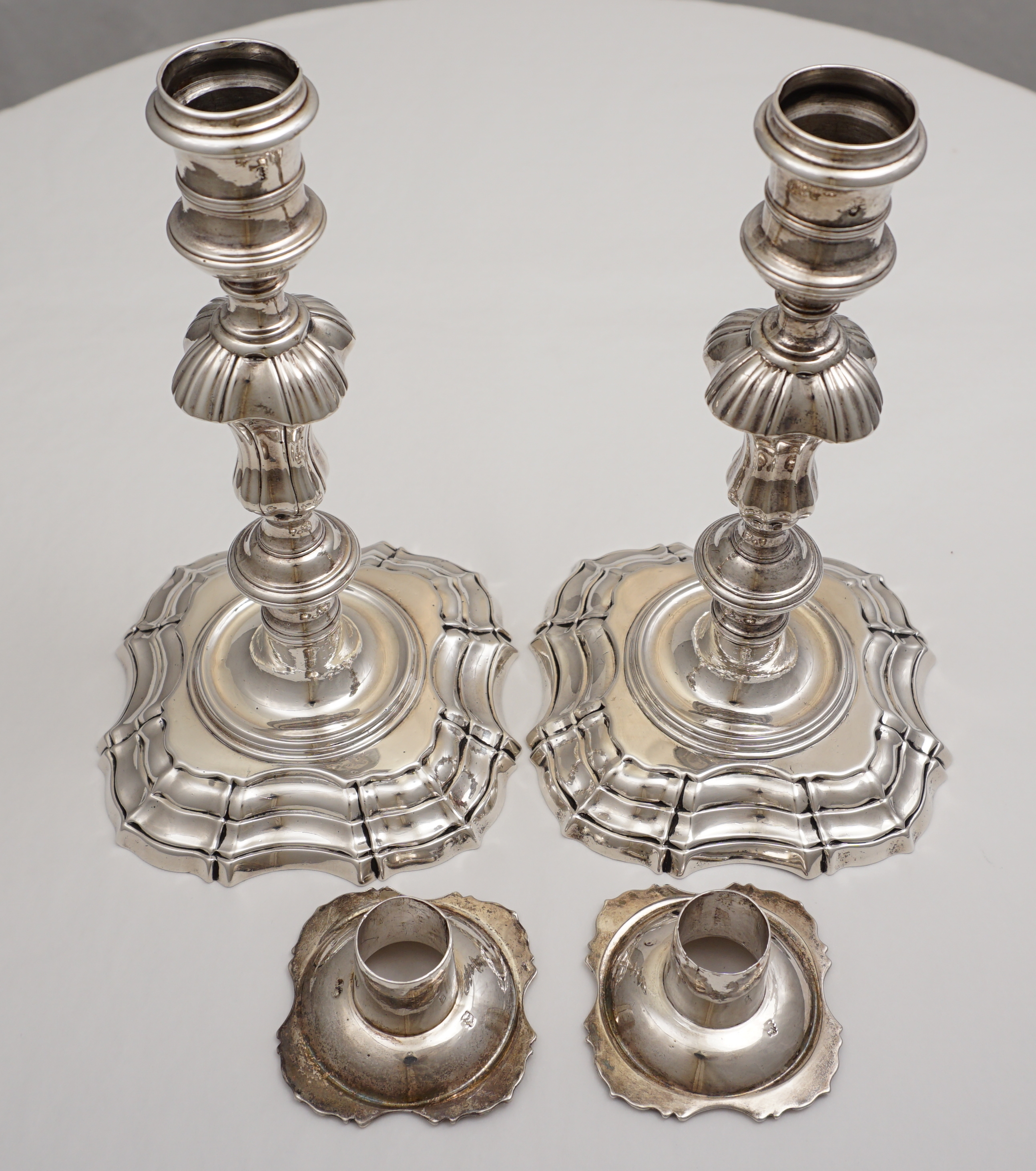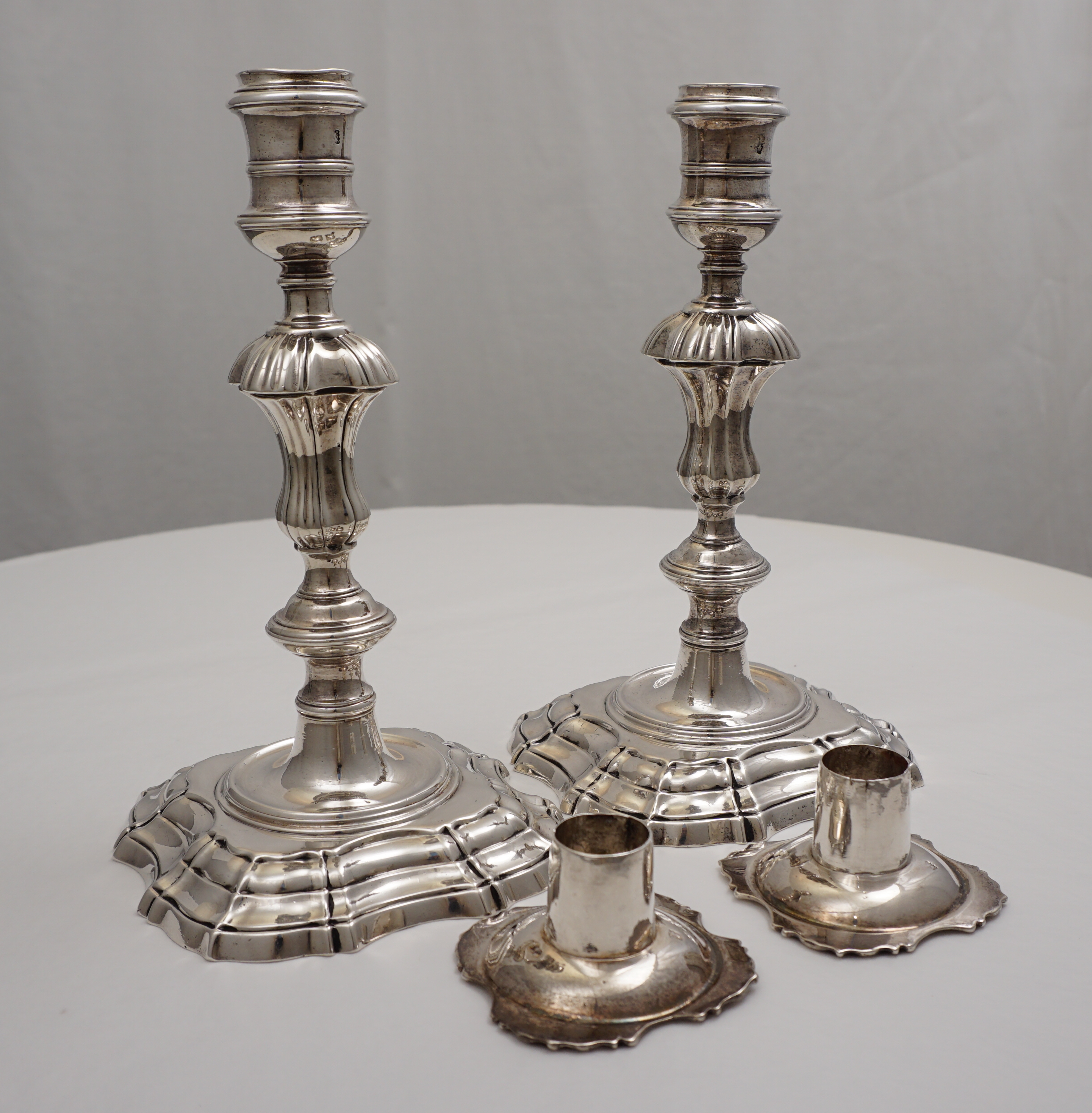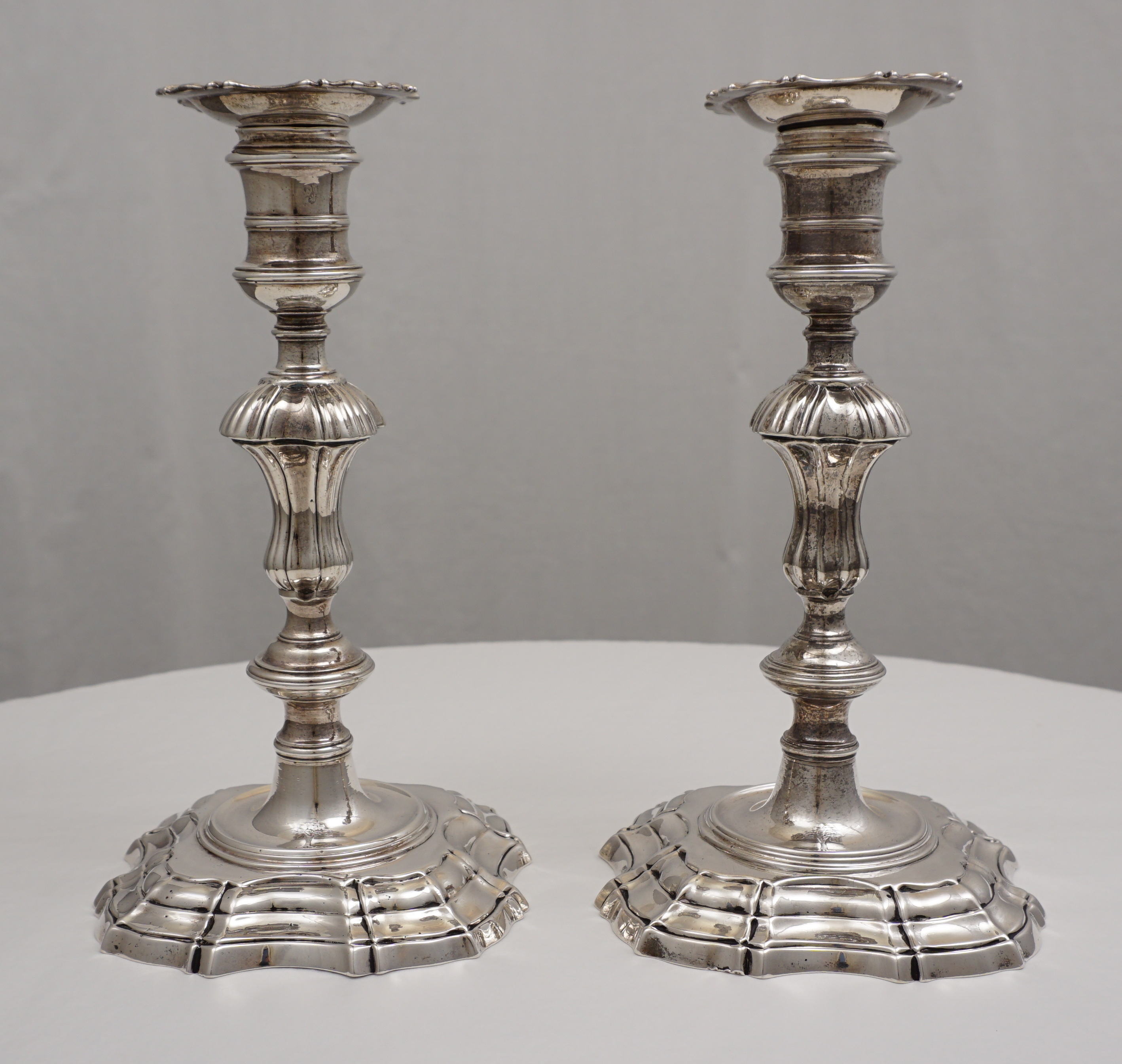 DESCRIPTION | Superb pair of antique English George II cast solid sterling silver candlesticks by one of the most important specialist candlestick makers of the period. Each is correctly hallmarked to the sconce, capital and below the base. The full set of marks within the base are particularly interesting as they have had no wear and are exactly as they were struck in 1742. Matching hallmarks and oak tree crests to base plinths and sconces show that these are the original sconces. So many examples of this period have now lost their sconces so it is pleasing to see the originals present. |