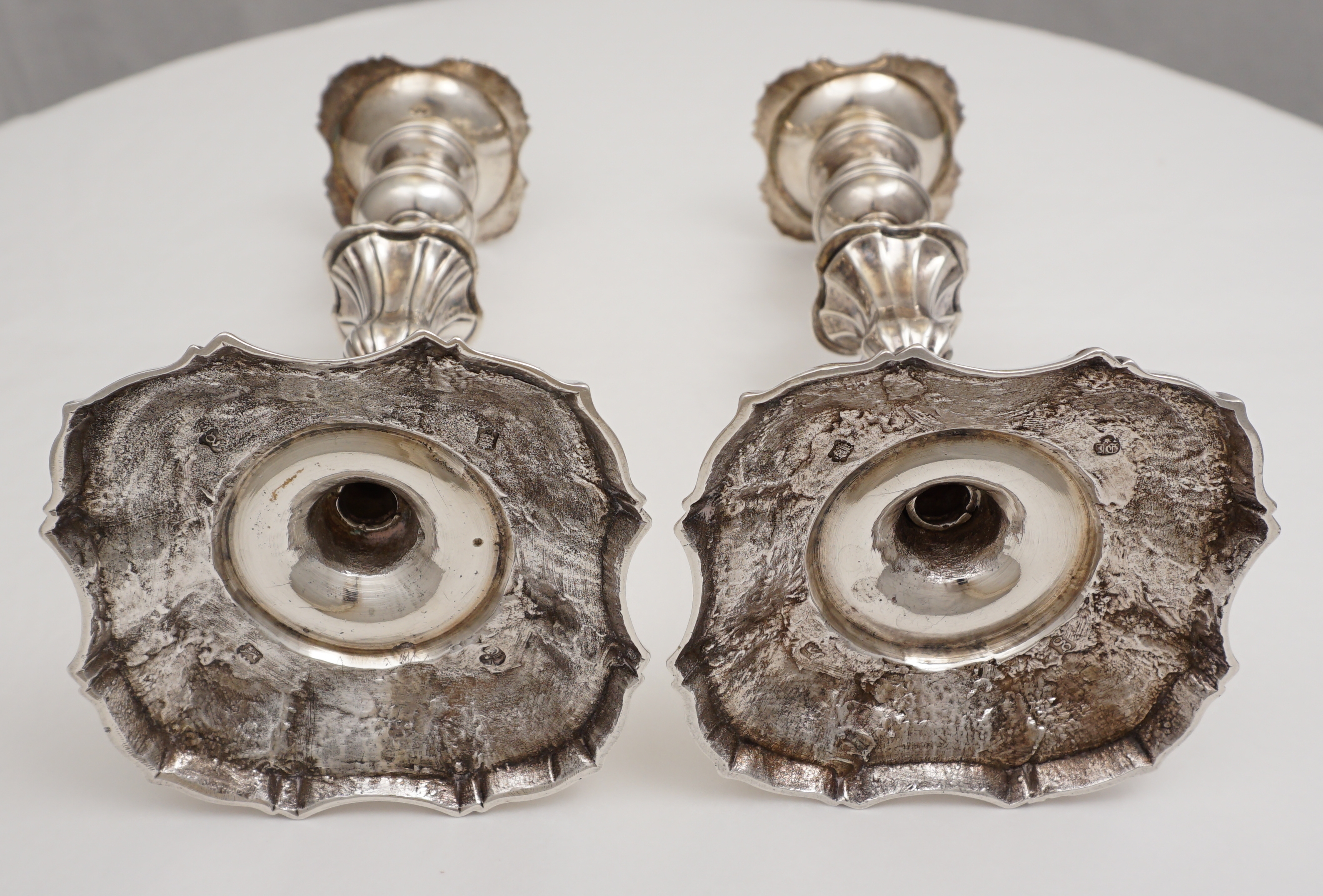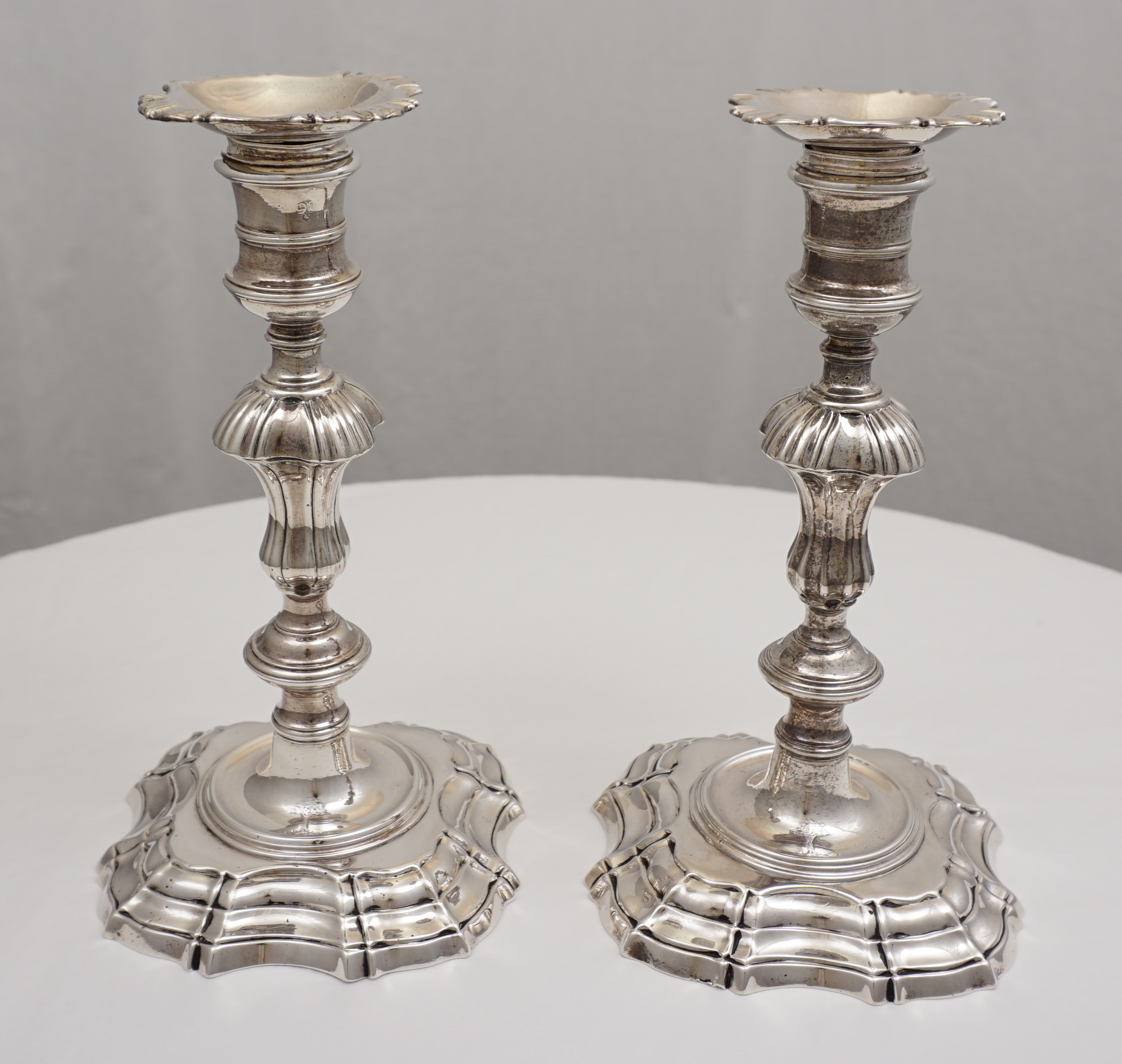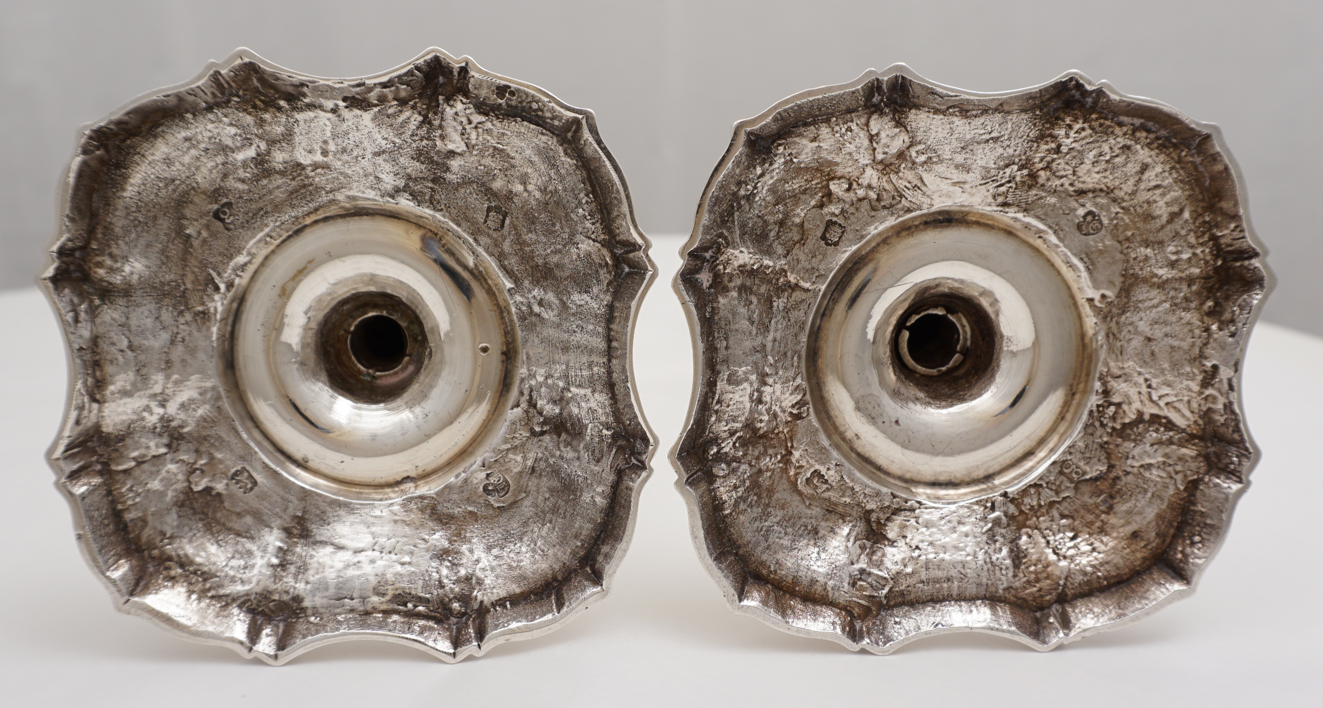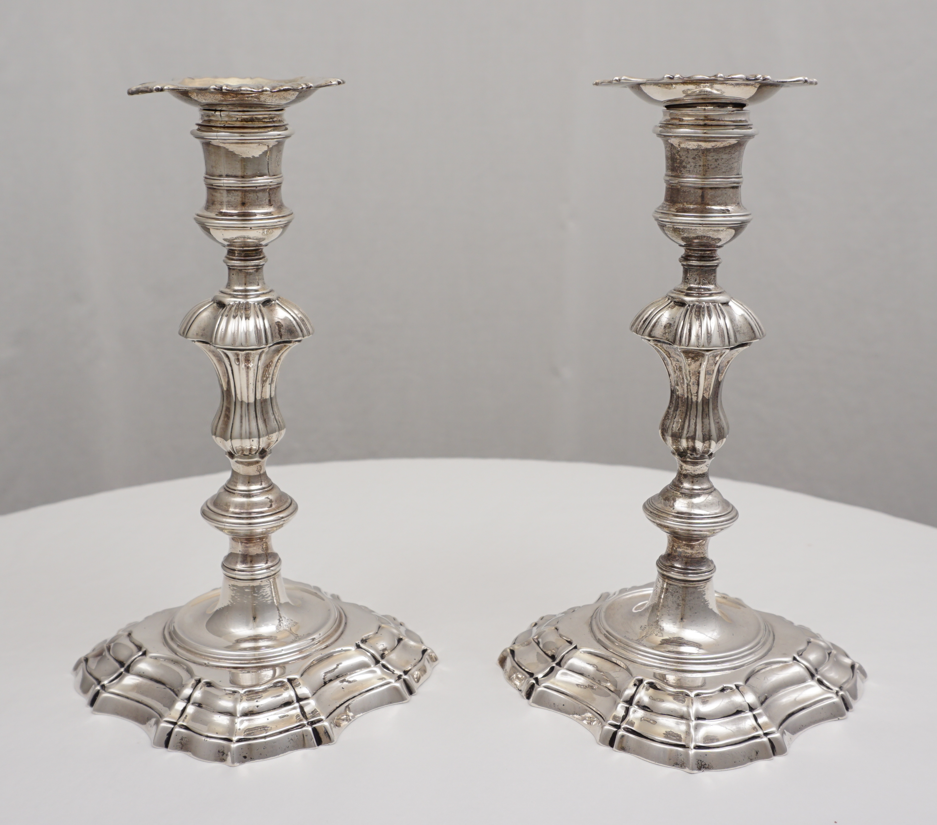 DESCRIPTION | Superb pair of antique English George II cast solid sterling silver candlesticks by one of the most important specialist candlestick makers of the period. Each is correctly hallmarked to the sconce, capital and below the base. The full set of marks within the base are particularly interesting as they have had no wear and are exactly as they were struck in 1742. Matching hallmarks and oak tree crests to base plinths and sconces show that these are the original sconces. So many examples of this period have now lost their sconces so it is pleasing to see the originals present. |