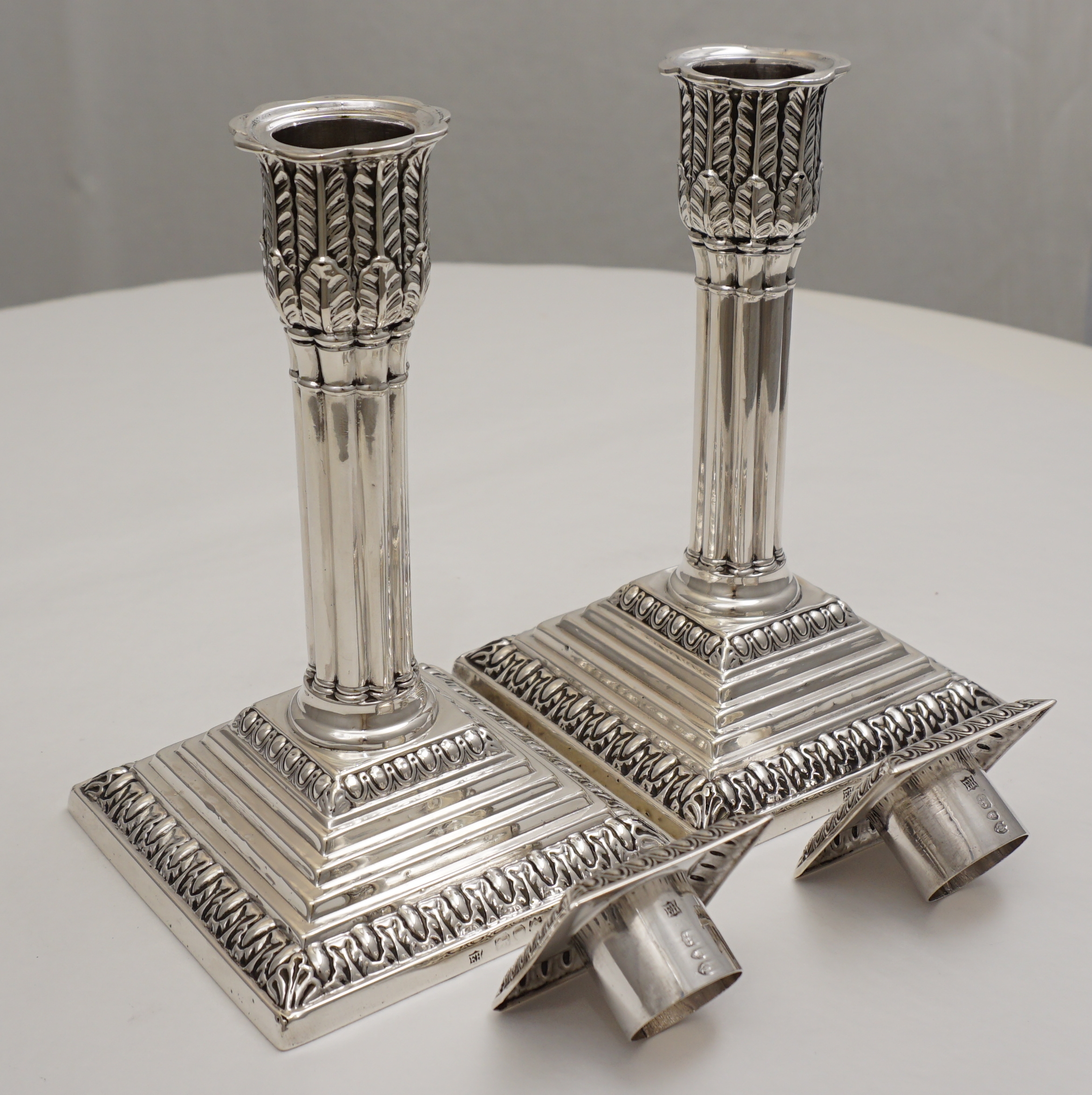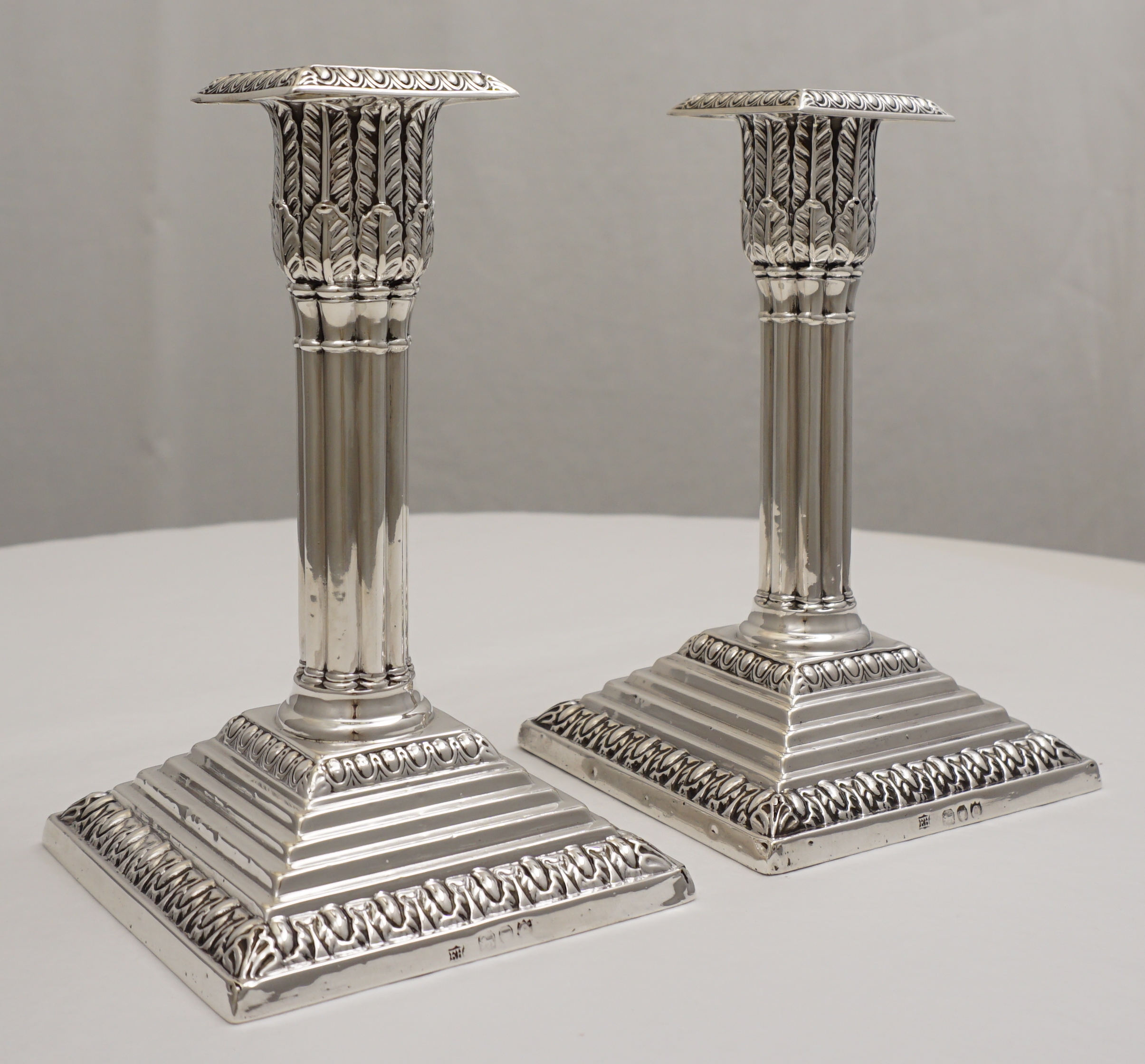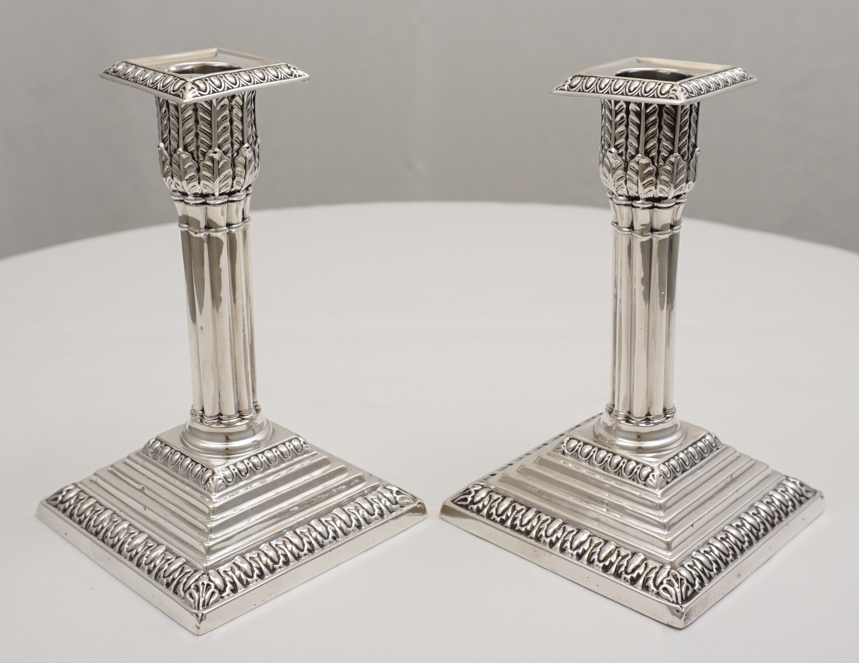 DESCRIPTION | Useful pair of good quality antique English Victorian loaded solid sterling silver acanthus column candlesticks on stepped bases and with removable sconces. All pieces correctly and clearly hallmarked throughout. I have left the bases uncovered so that you can see the markings and quality of construction but free felt bottoms are an option. |