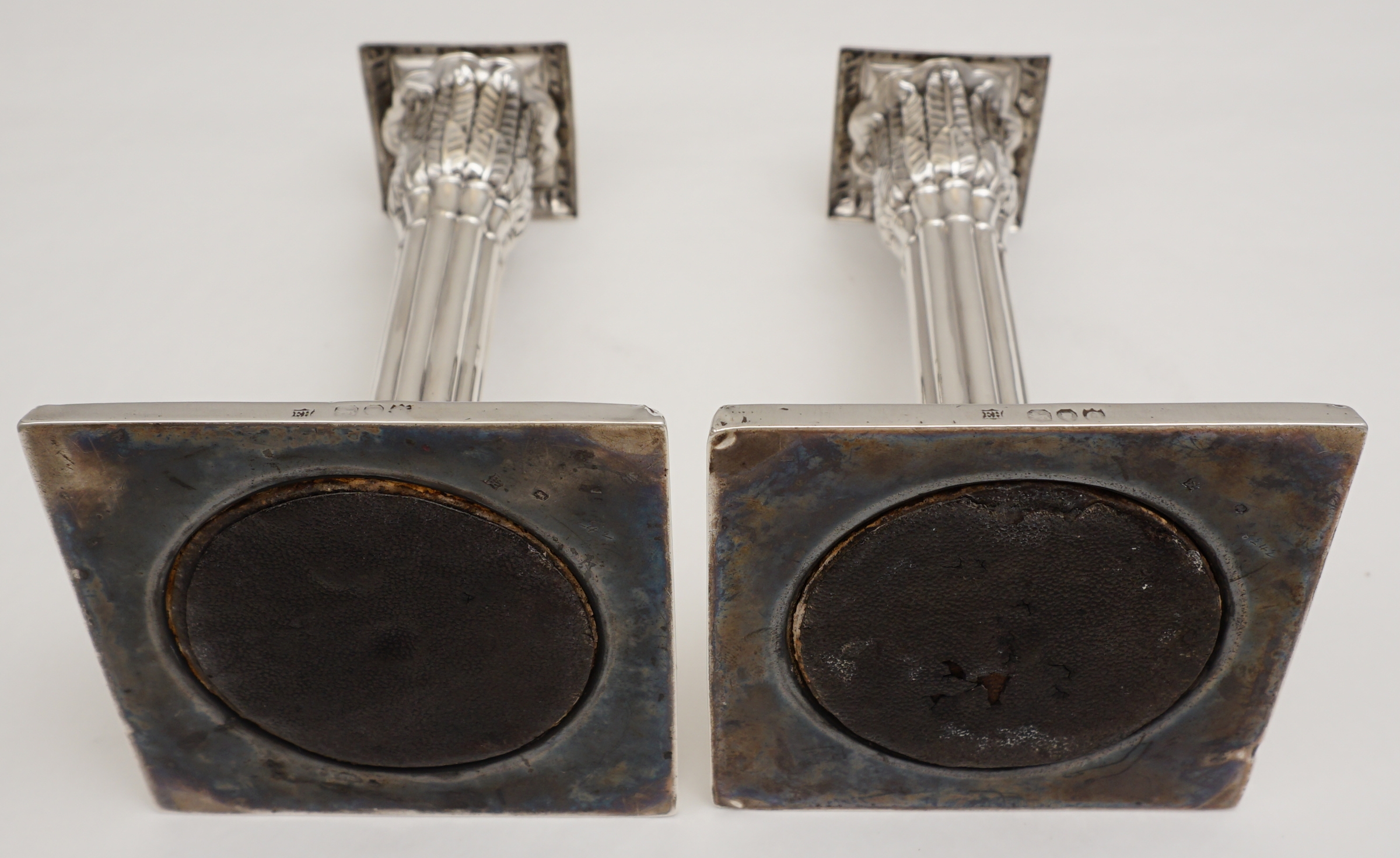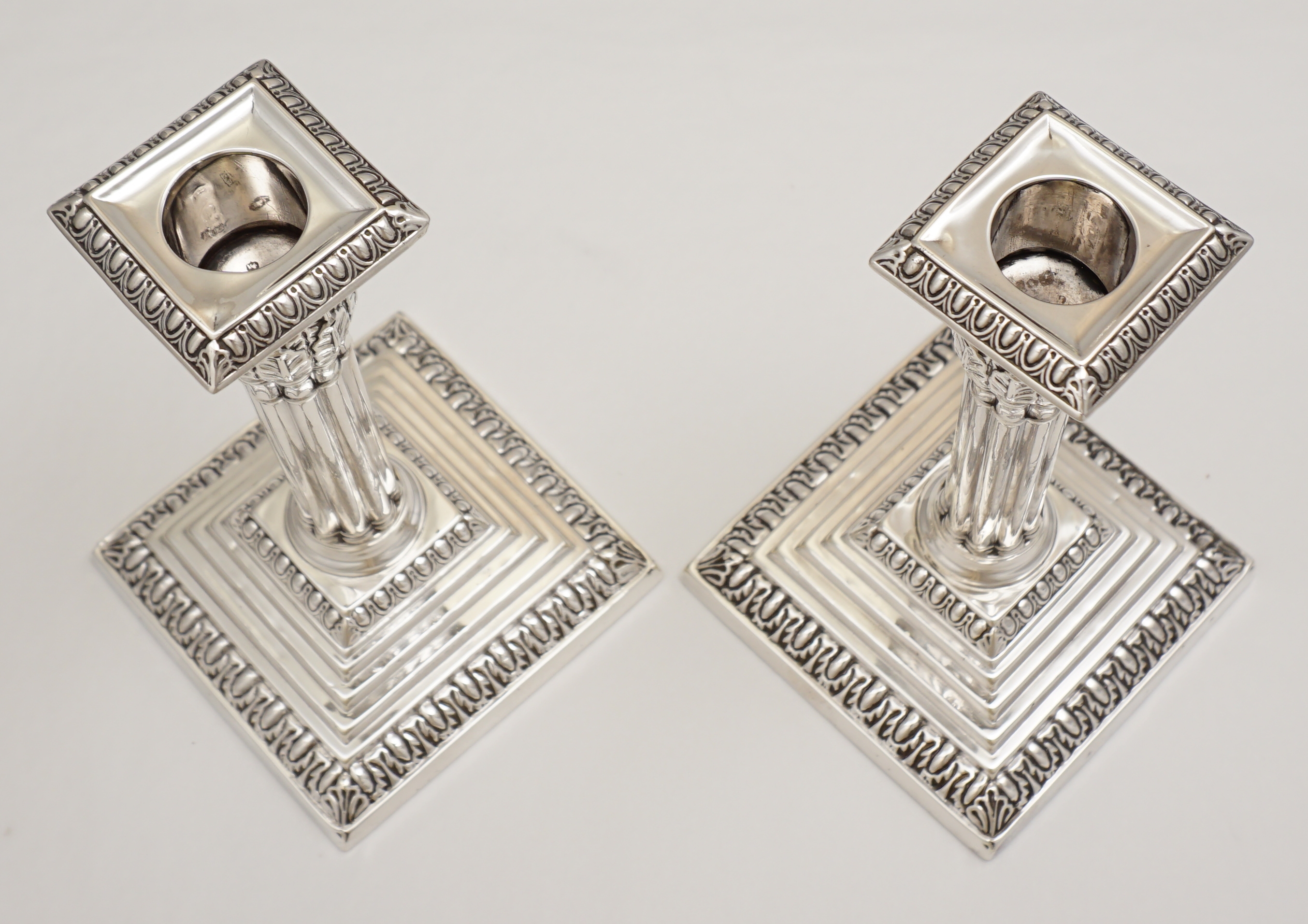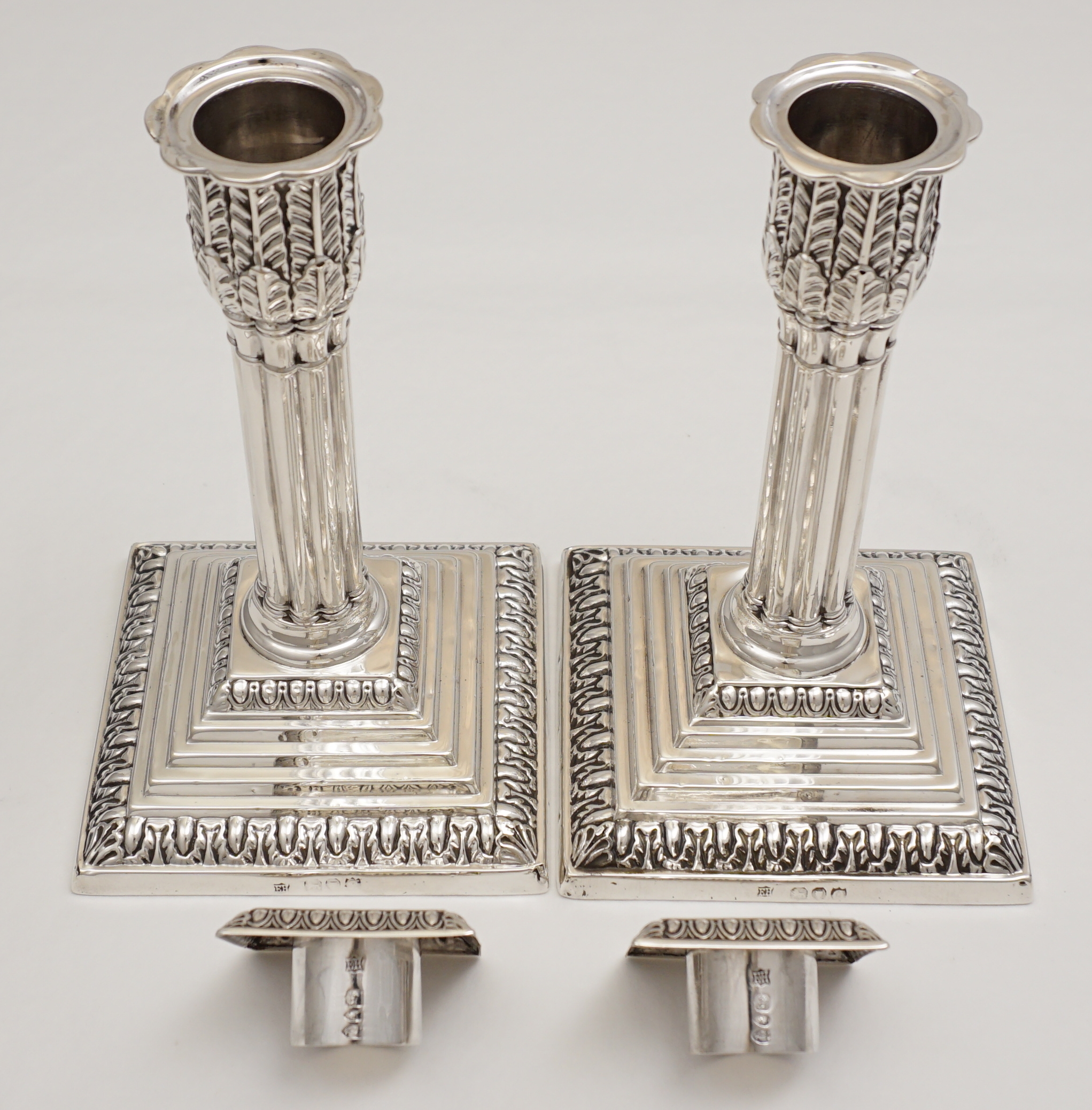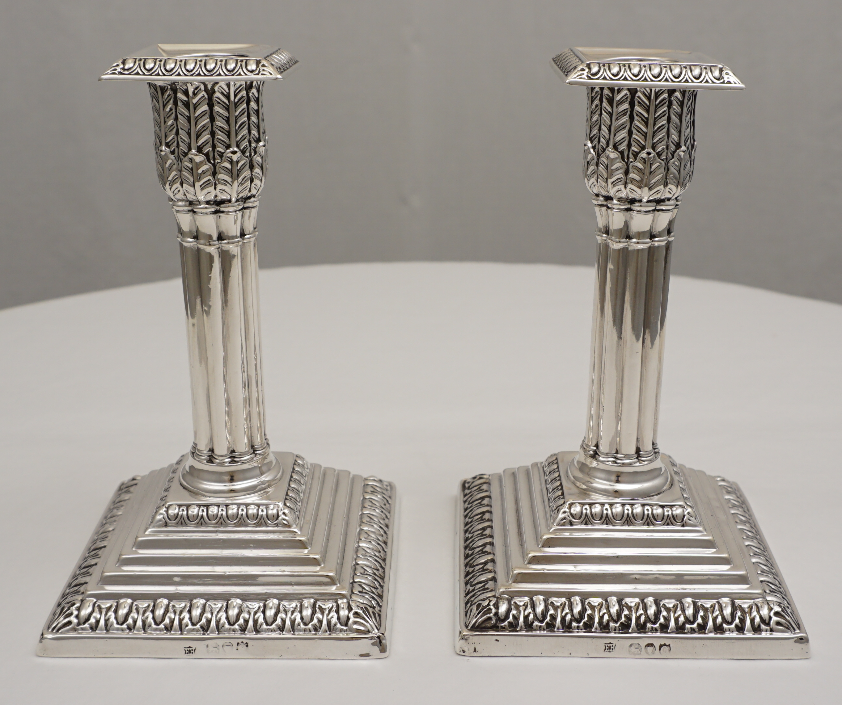 DESCRIPTION | Useful pair of good quality antique English Victorian loaded solid sterling silver acanthus column candlesticks on stepped bases and with removable sconces. All pieces correctly and clearly hallmarked throughout. I have left the bases uncovered so that you can see the markings and quality of construction but free felt bottoms are an option. |