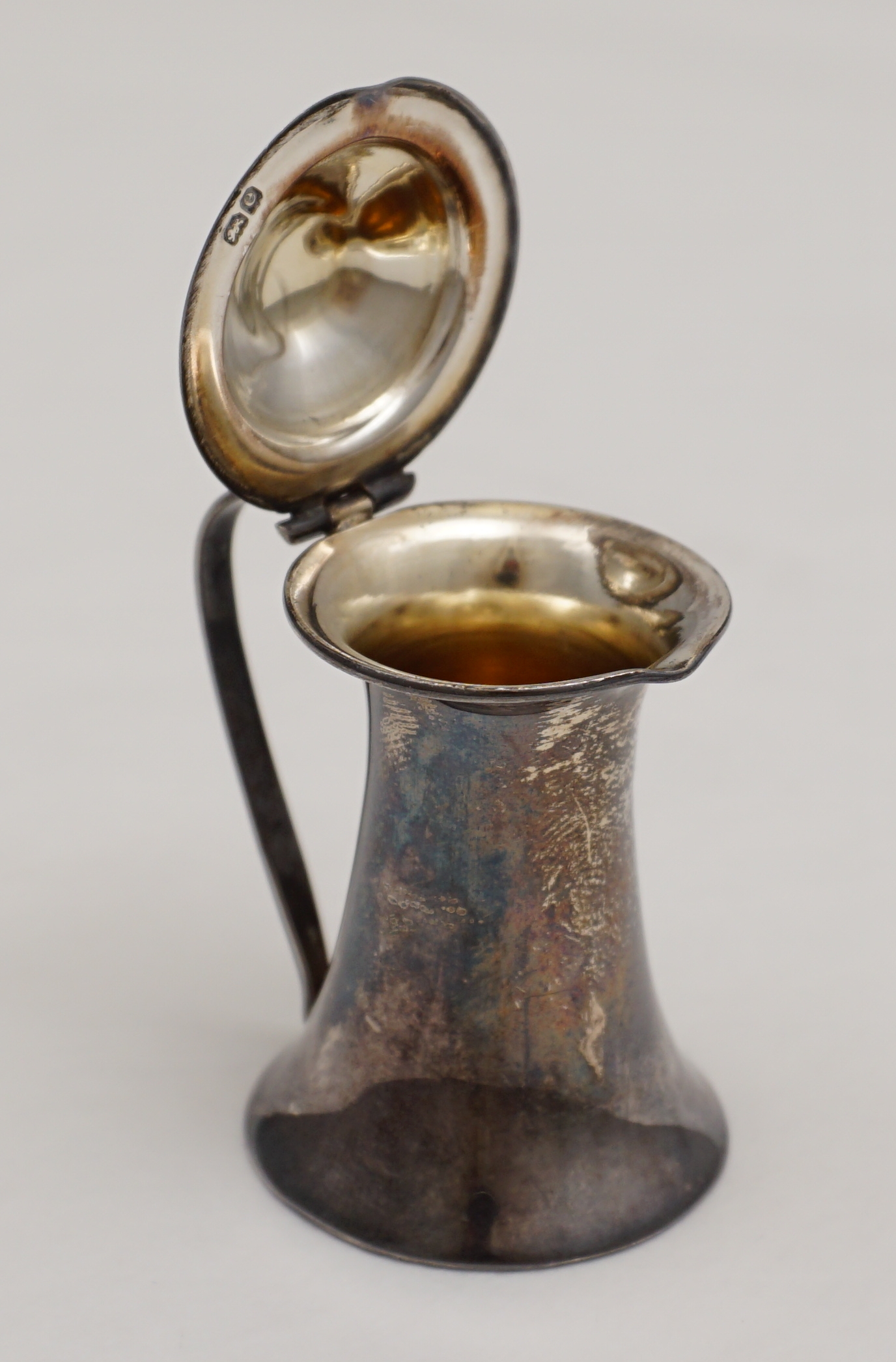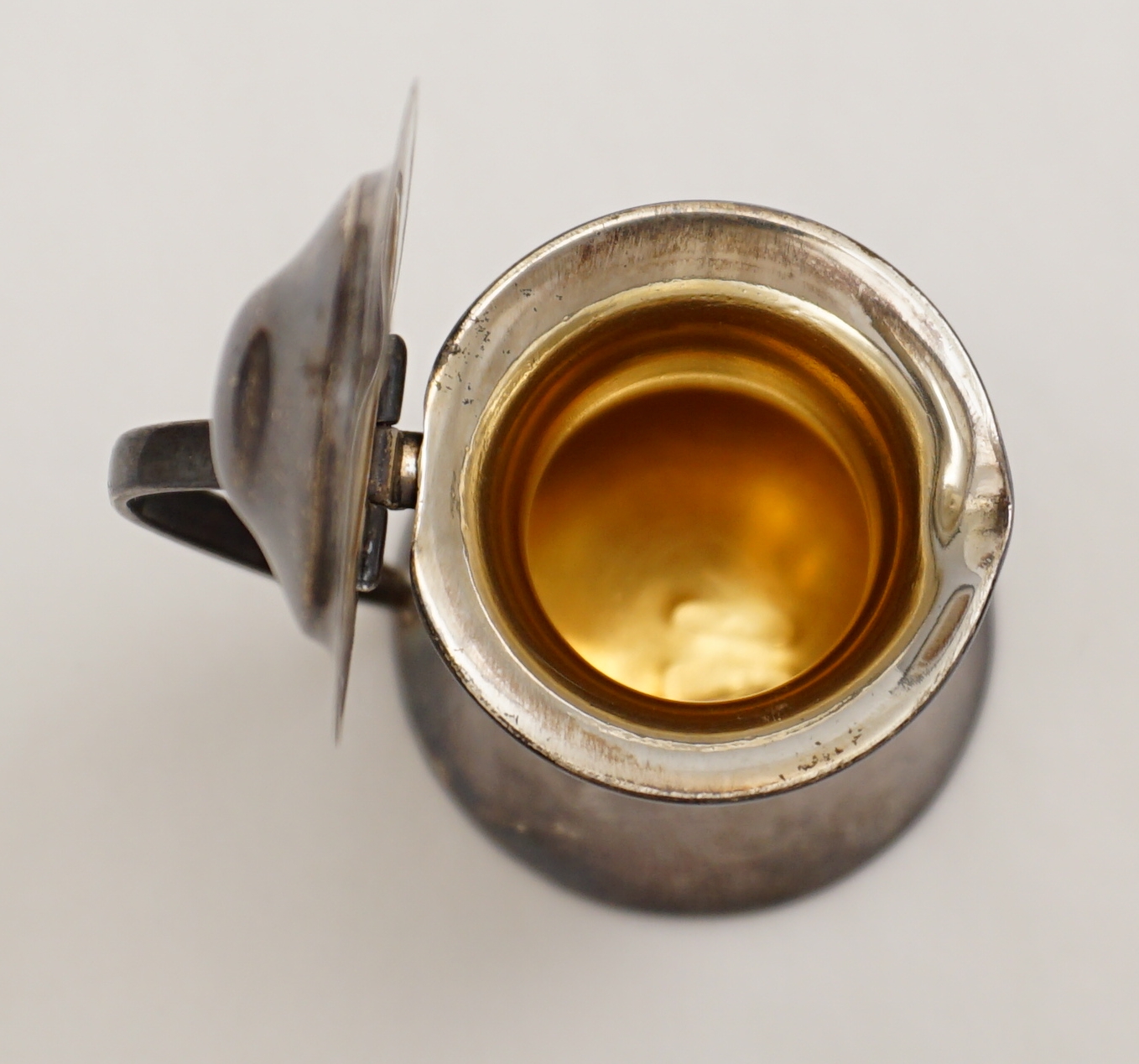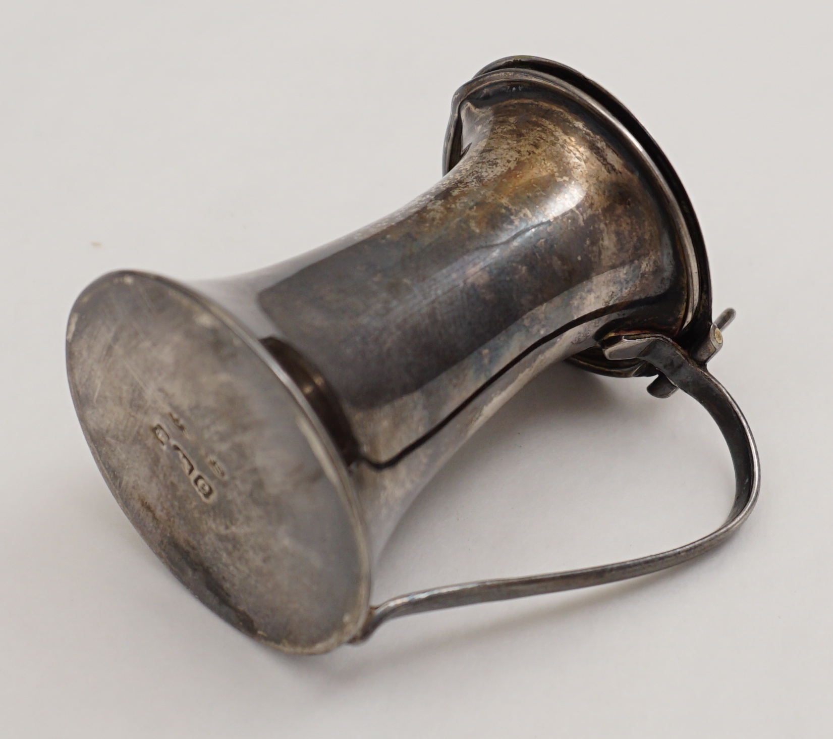 DESCRIPTION | Very good English Edwardian solid sterling silver miniature Art Nouveau lidded flagon with a gilded interior. Correctly hallmarked to the base and the hinged lid. |