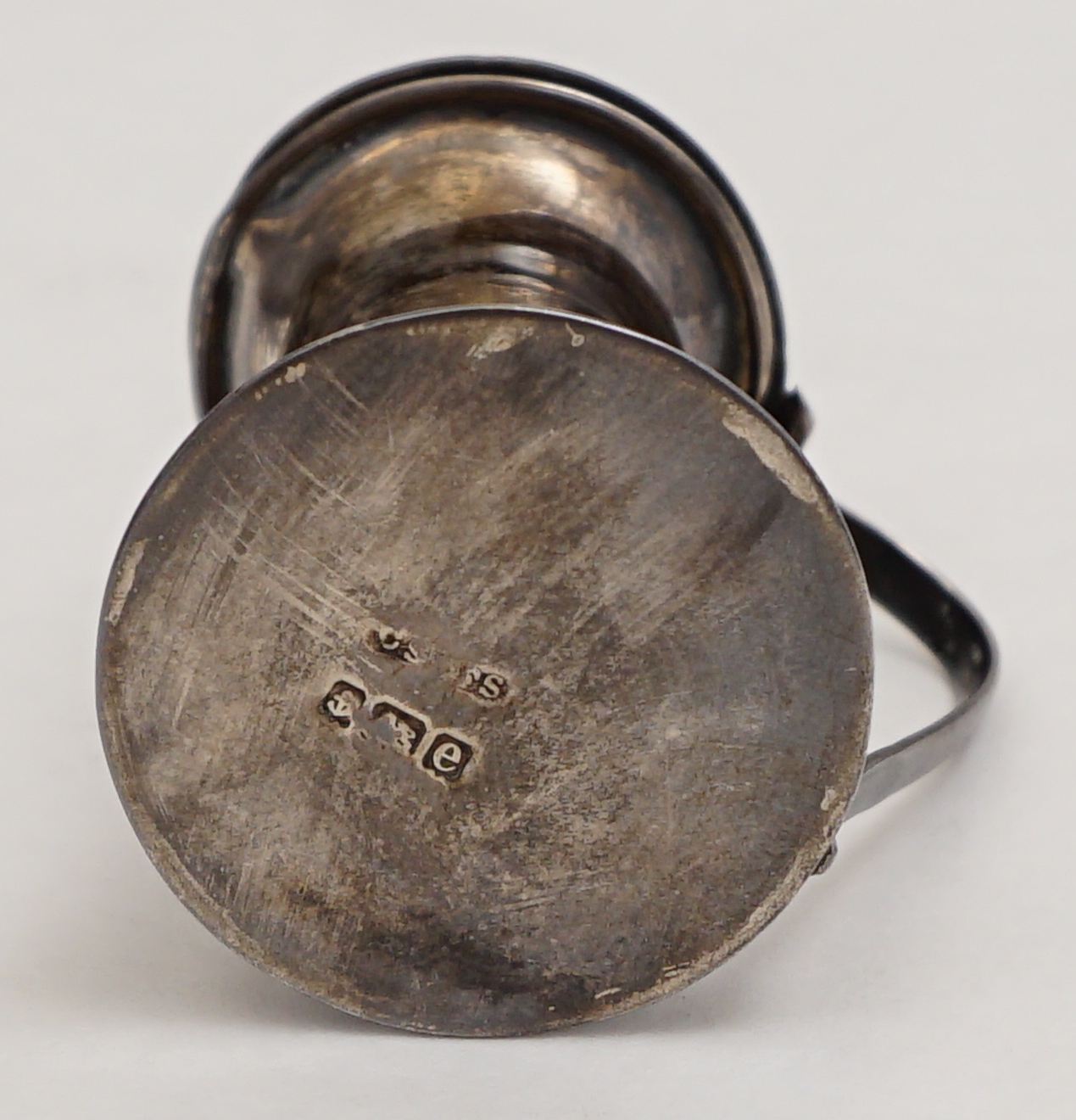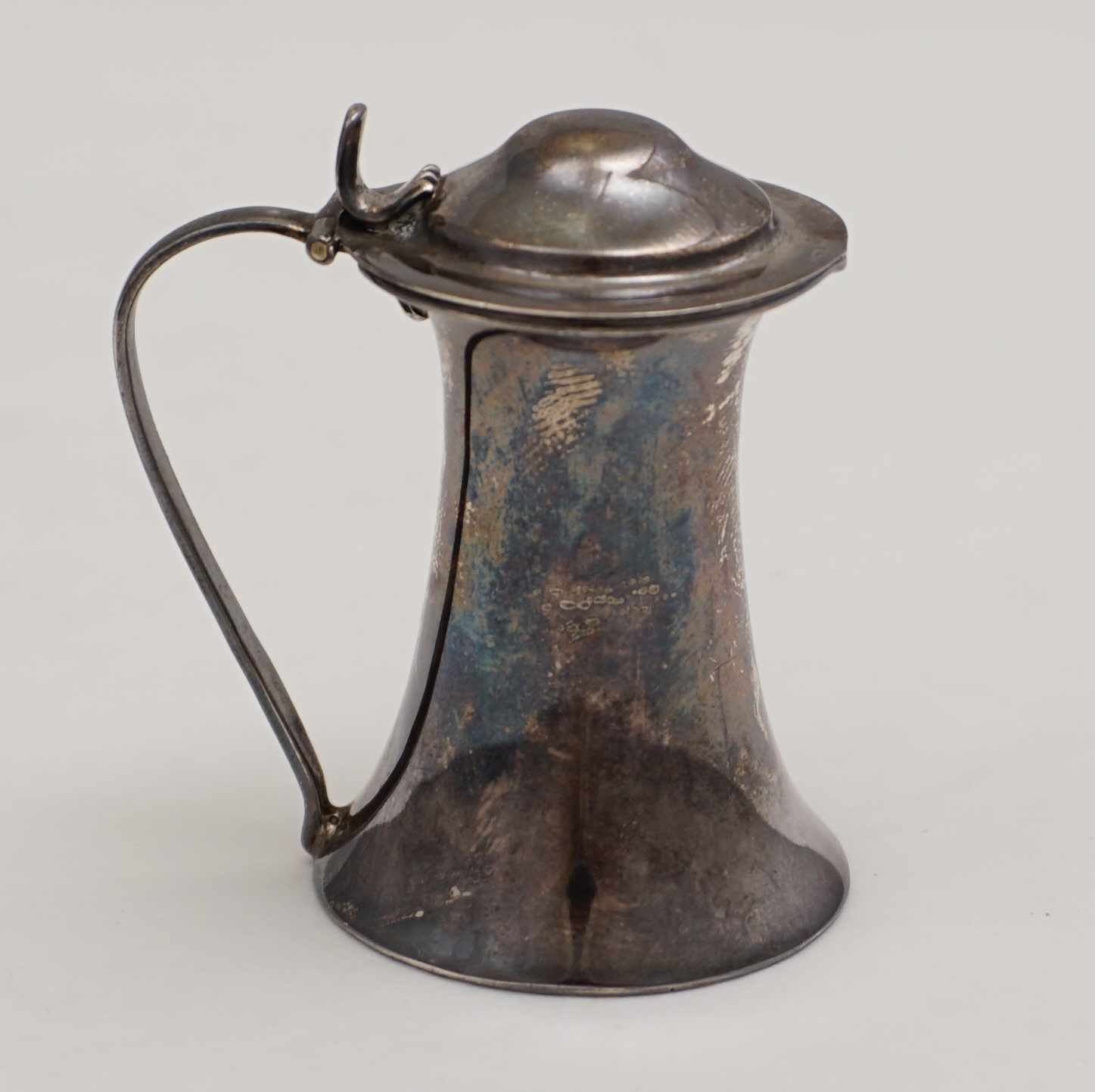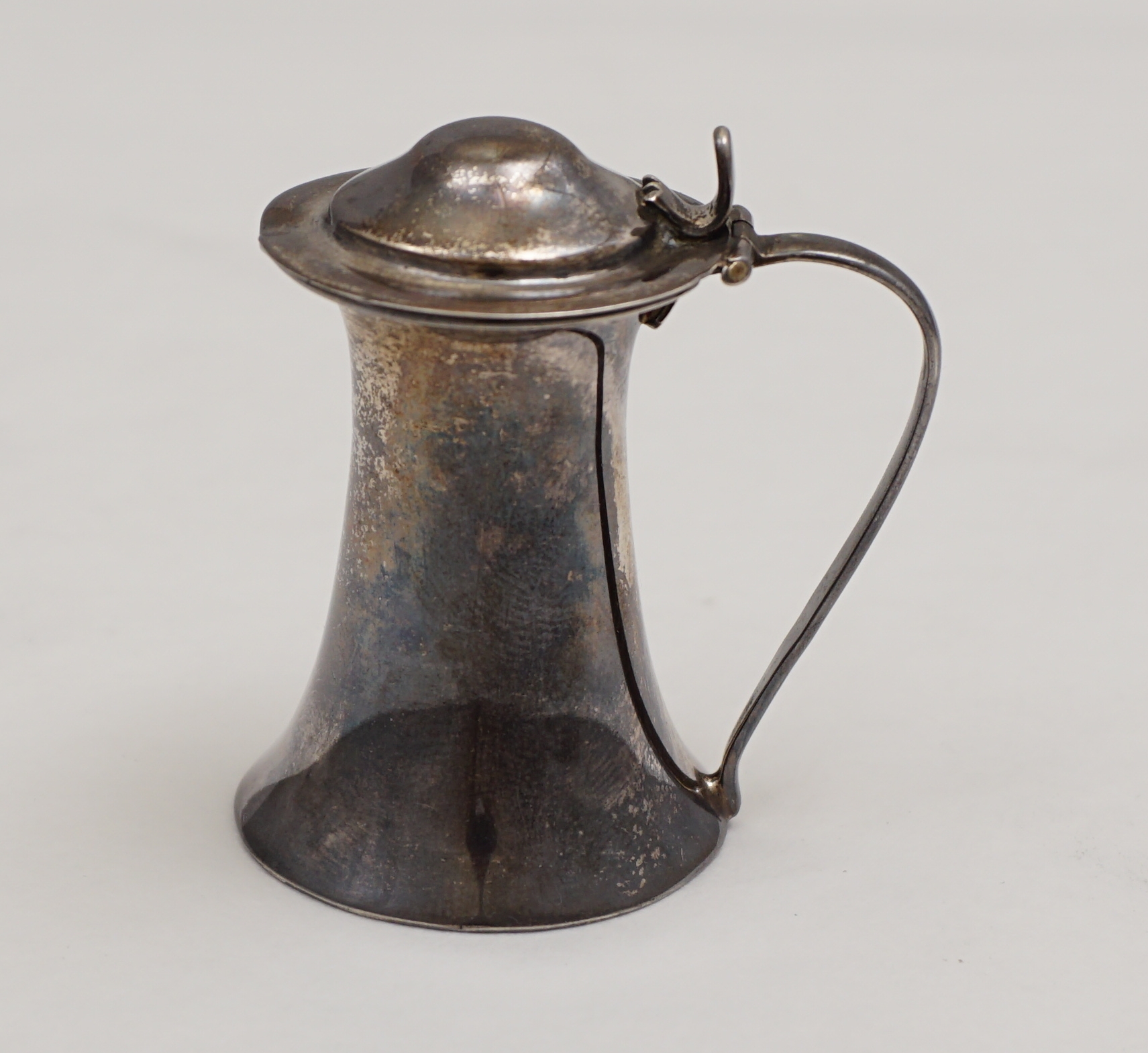 DESCRIPTION | Very good English Edwardian solid sterling silver miniature Art Nouveau lidded flagon with a gilded interior. Correctly hallmarked to the base and the hinged lid. |