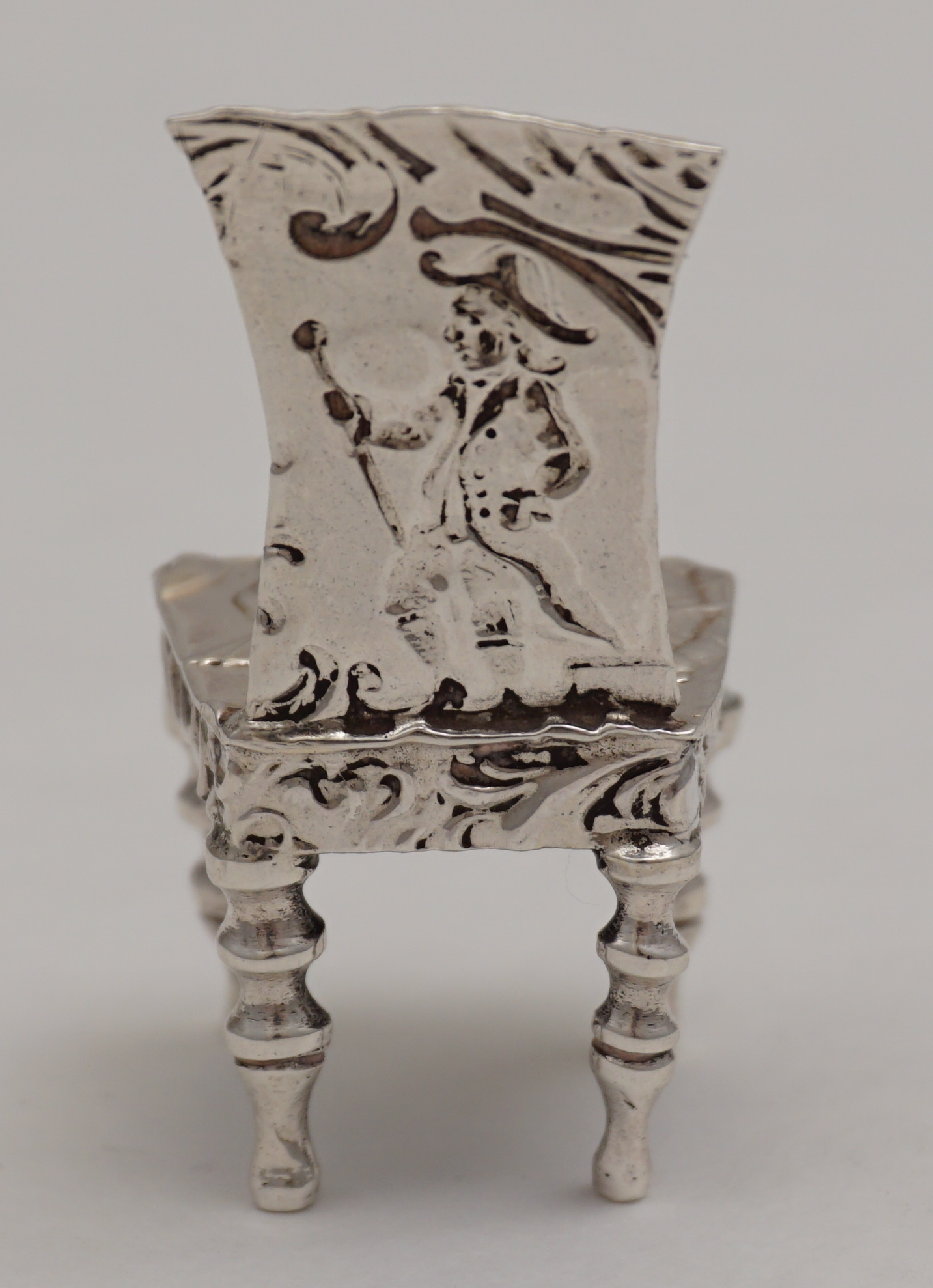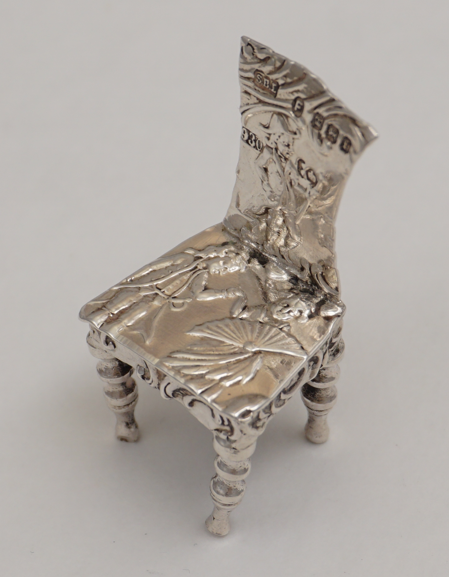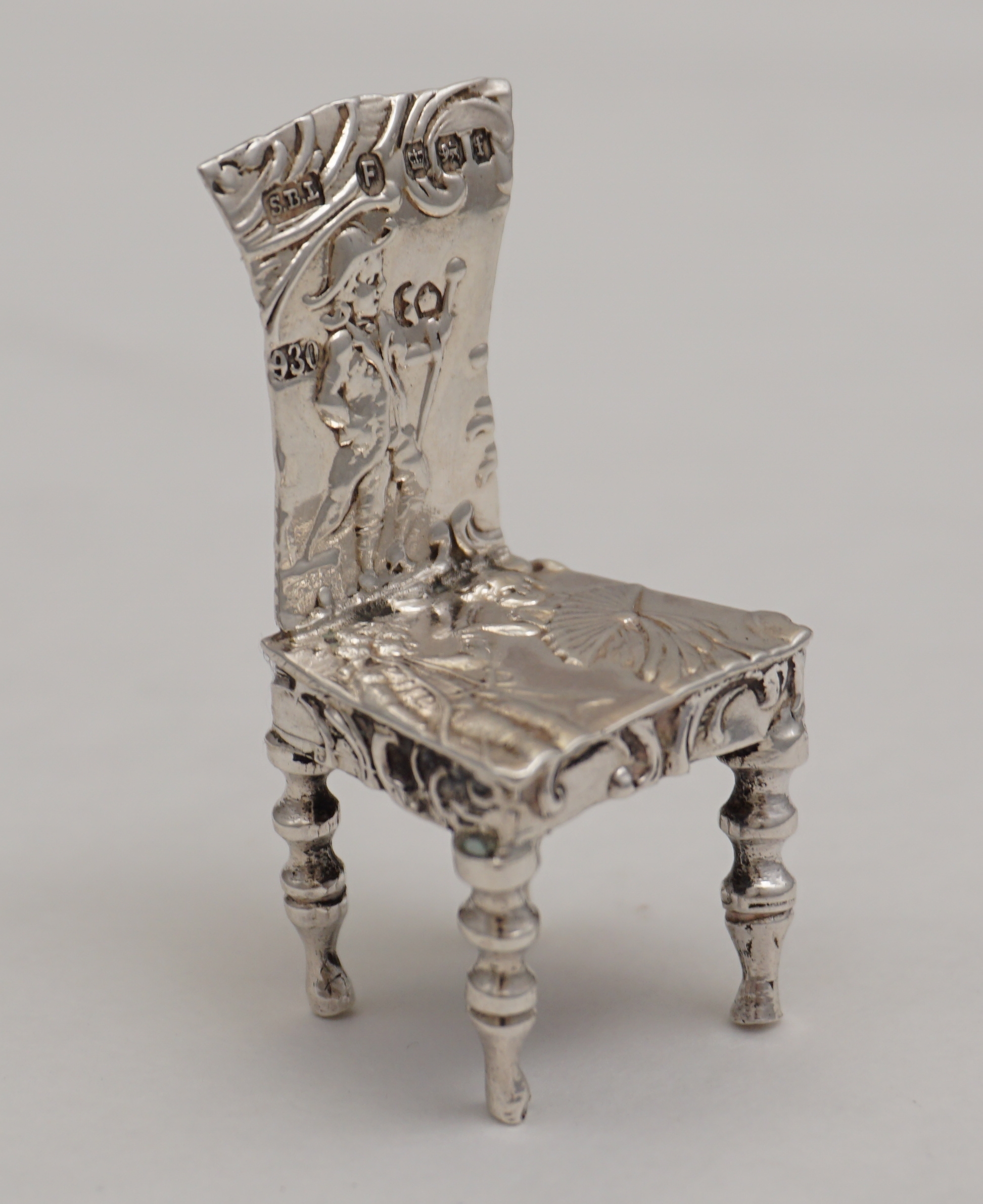 DESCRIPTION | High quality miniature Victorian cast sterling silver salon chair with good detailing. The back panel features a Georgian young man walking with his staff and the seat has him in military dress proposing to a blushing young woman in full Georgian attire and complete with fan. |