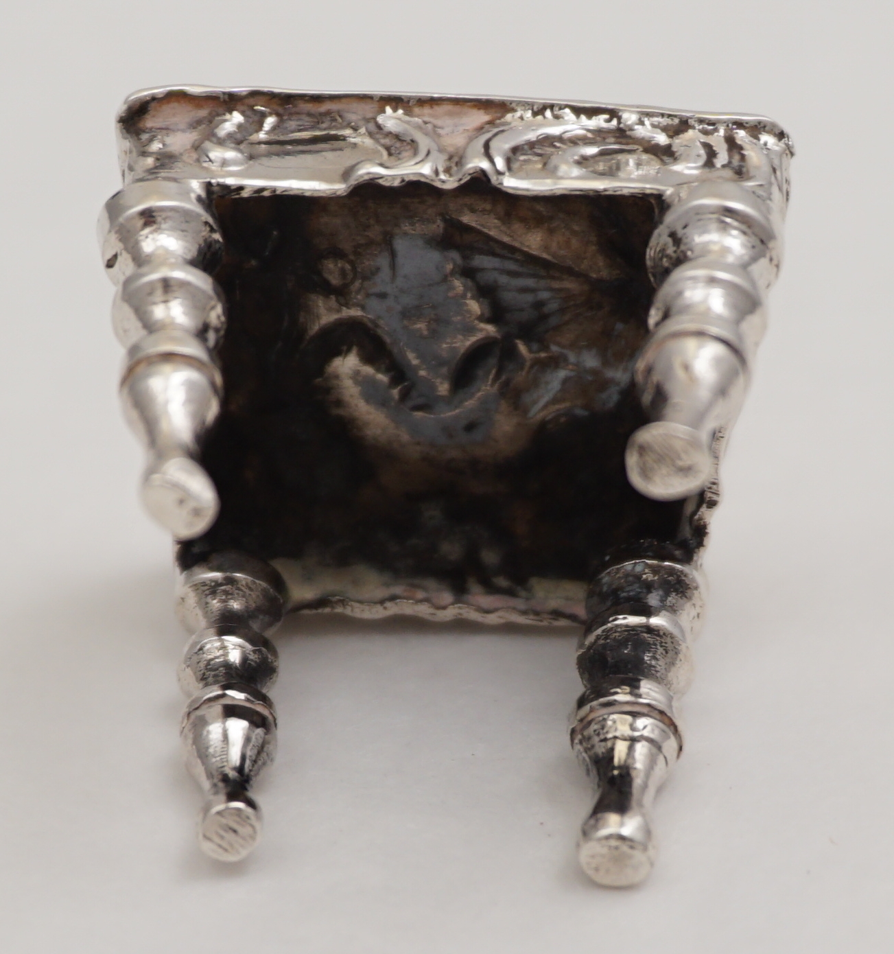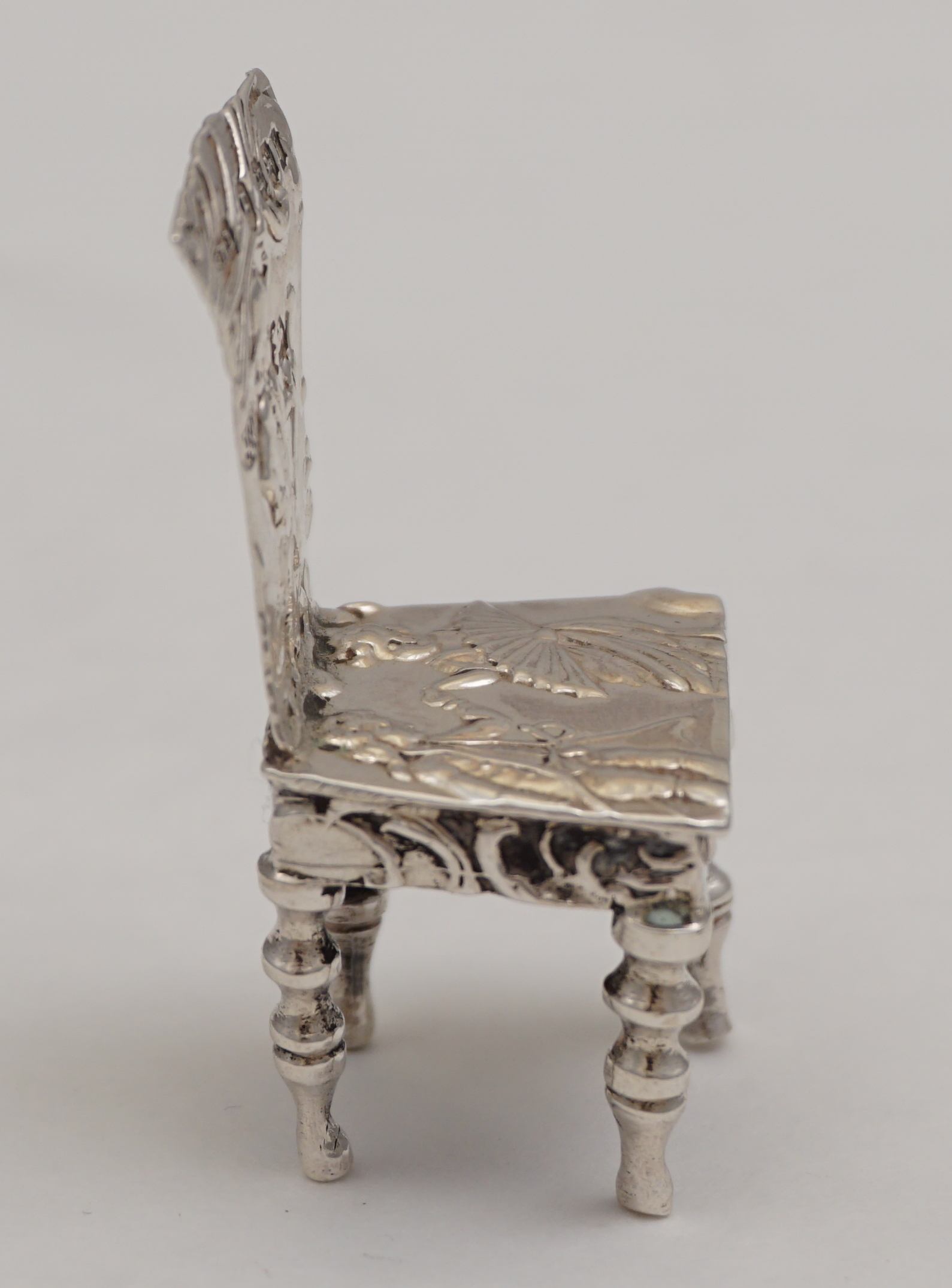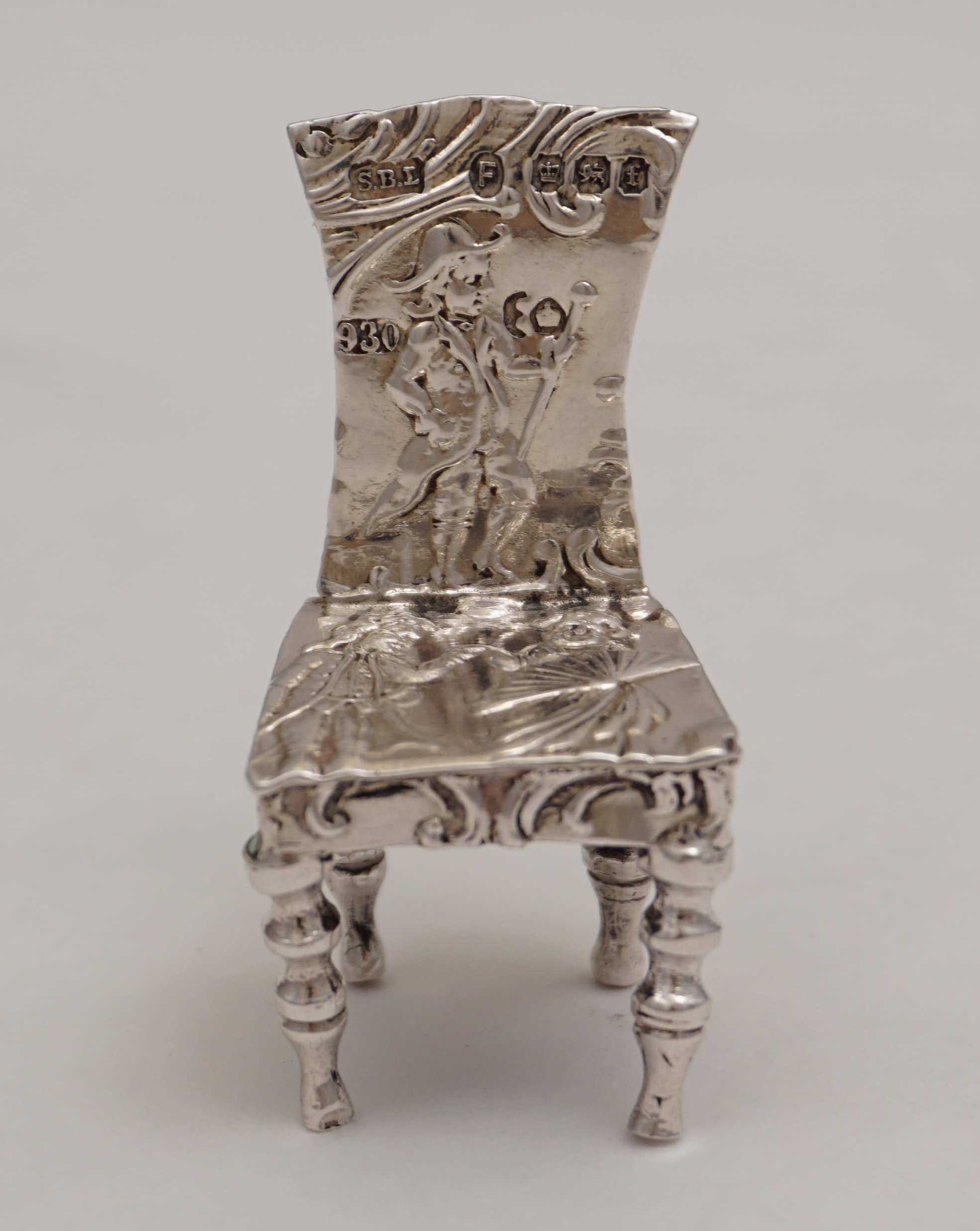 DESCRIPTION | High quality miniature Victorian cast sterling silver salon chair with good detailing. The back panel features a Georgian young man walking with his staff and the seat has him in military dress proposing to a blushing young woman in full Georgian attire and complete with fan. |