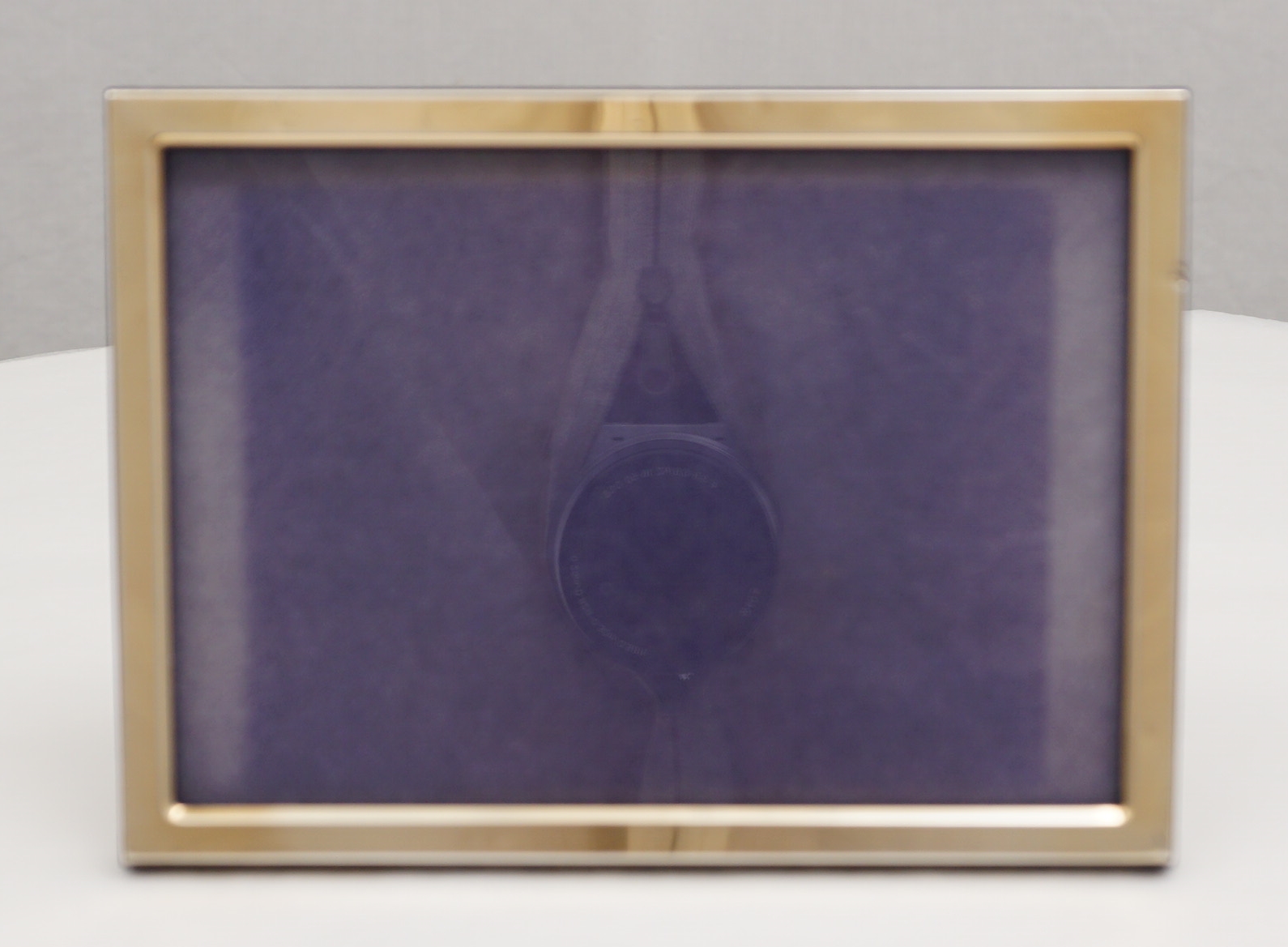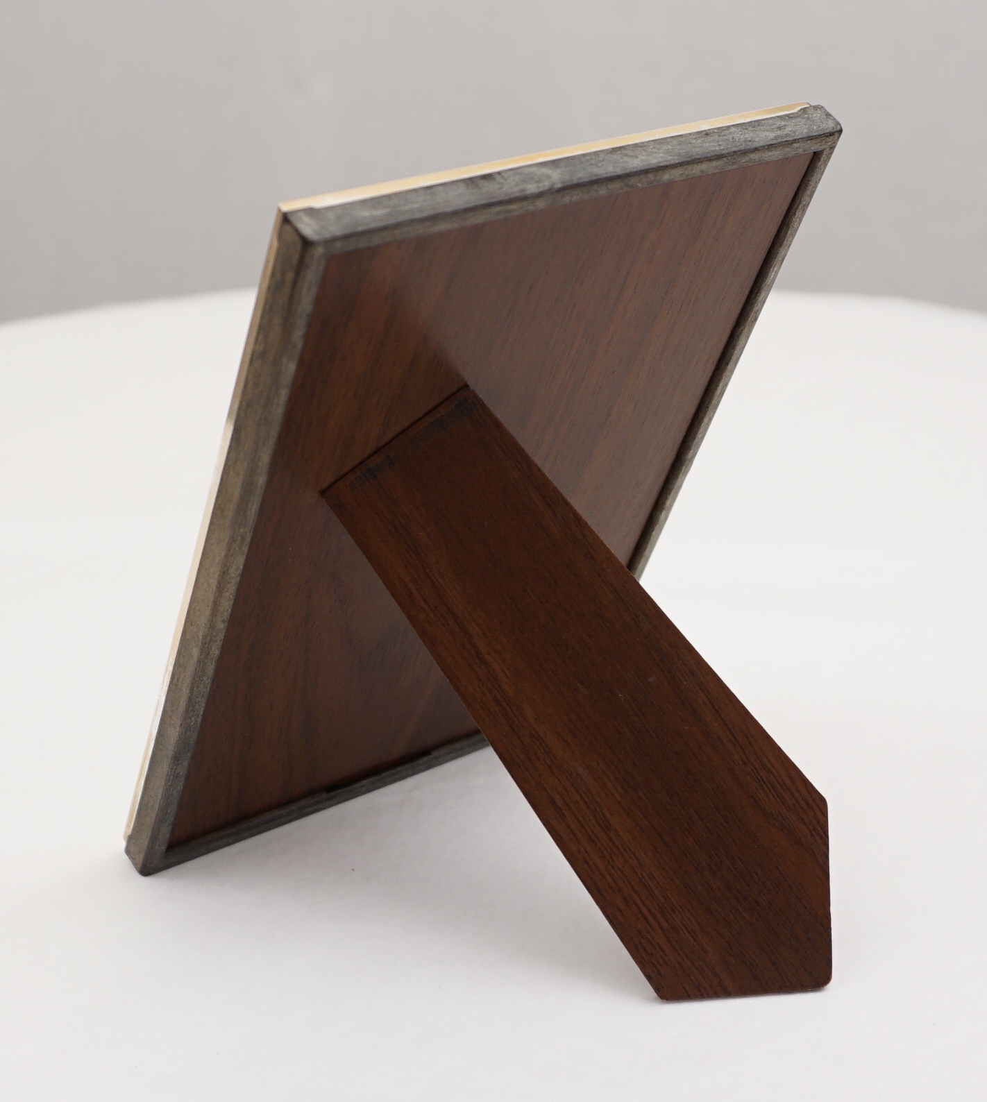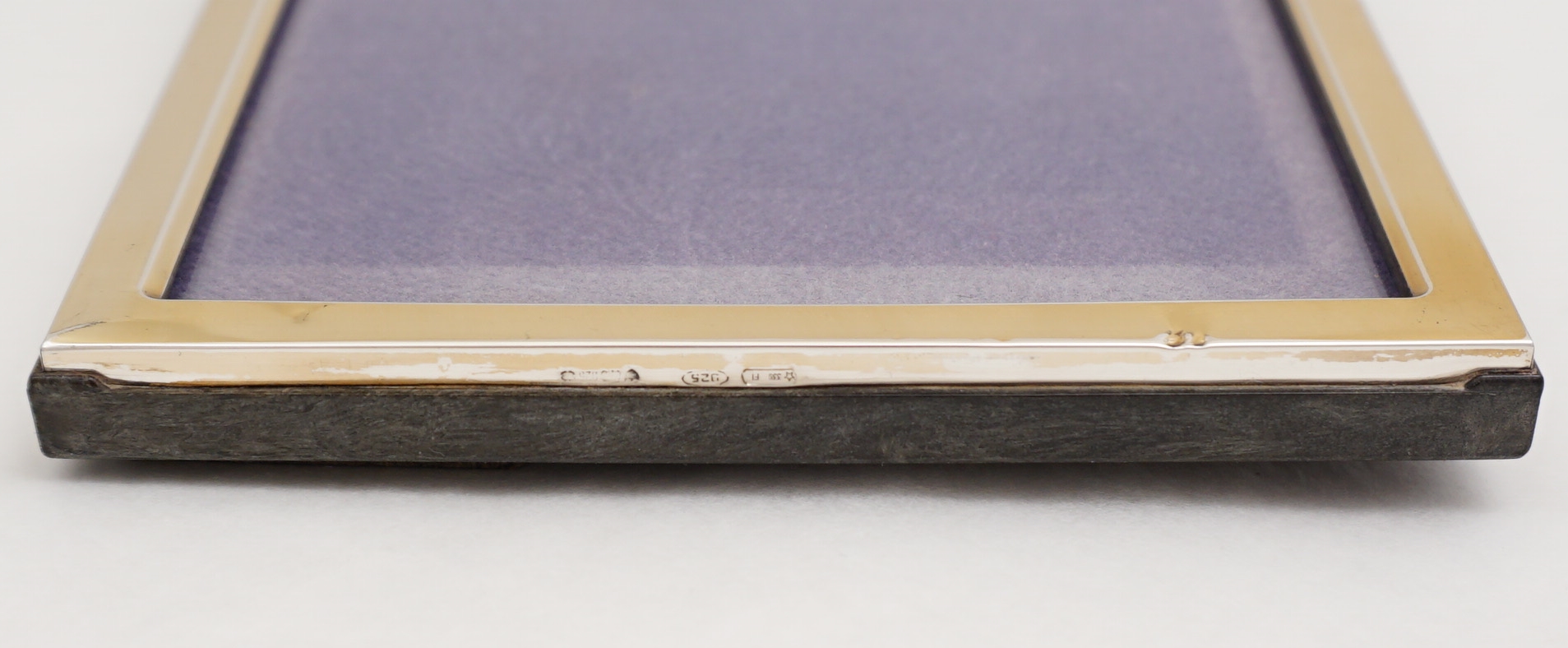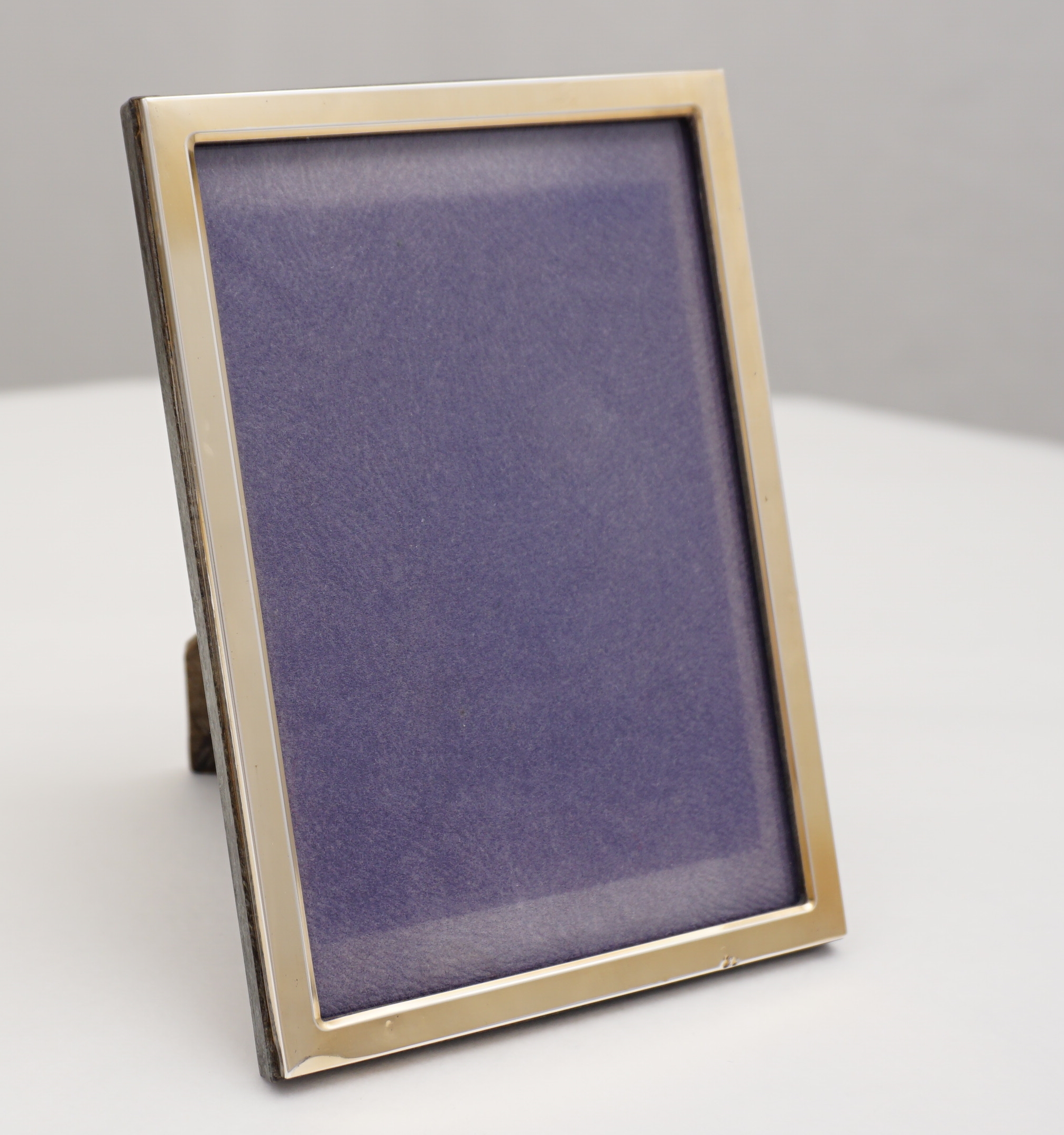 DESCRIPTION | Useful Italian solid sterling silver mounted photograph frame with a plastic simulating wood strut back that works landscape and portrait and a gilt wash varnish. |