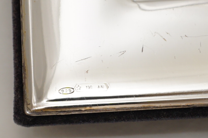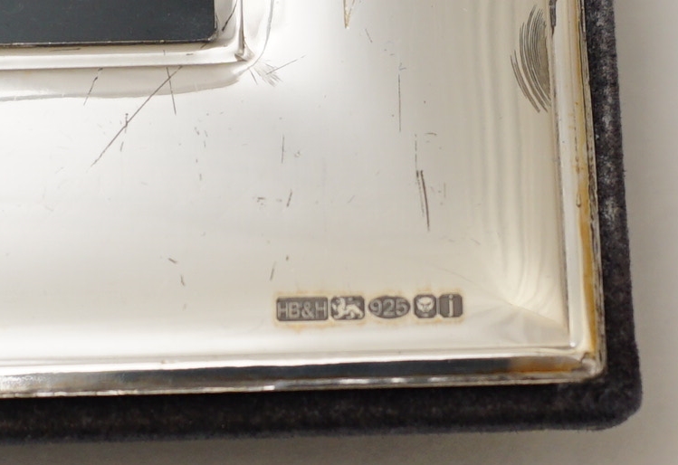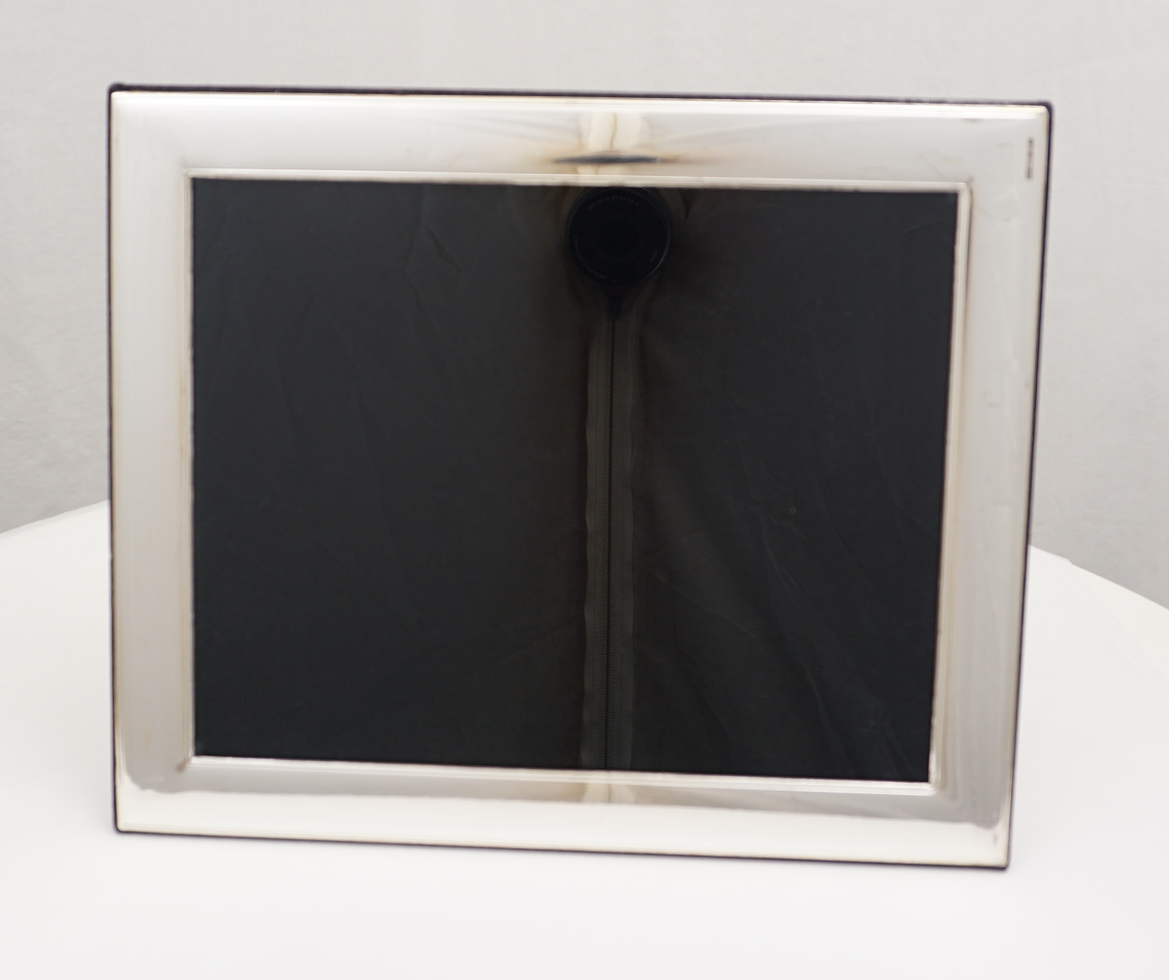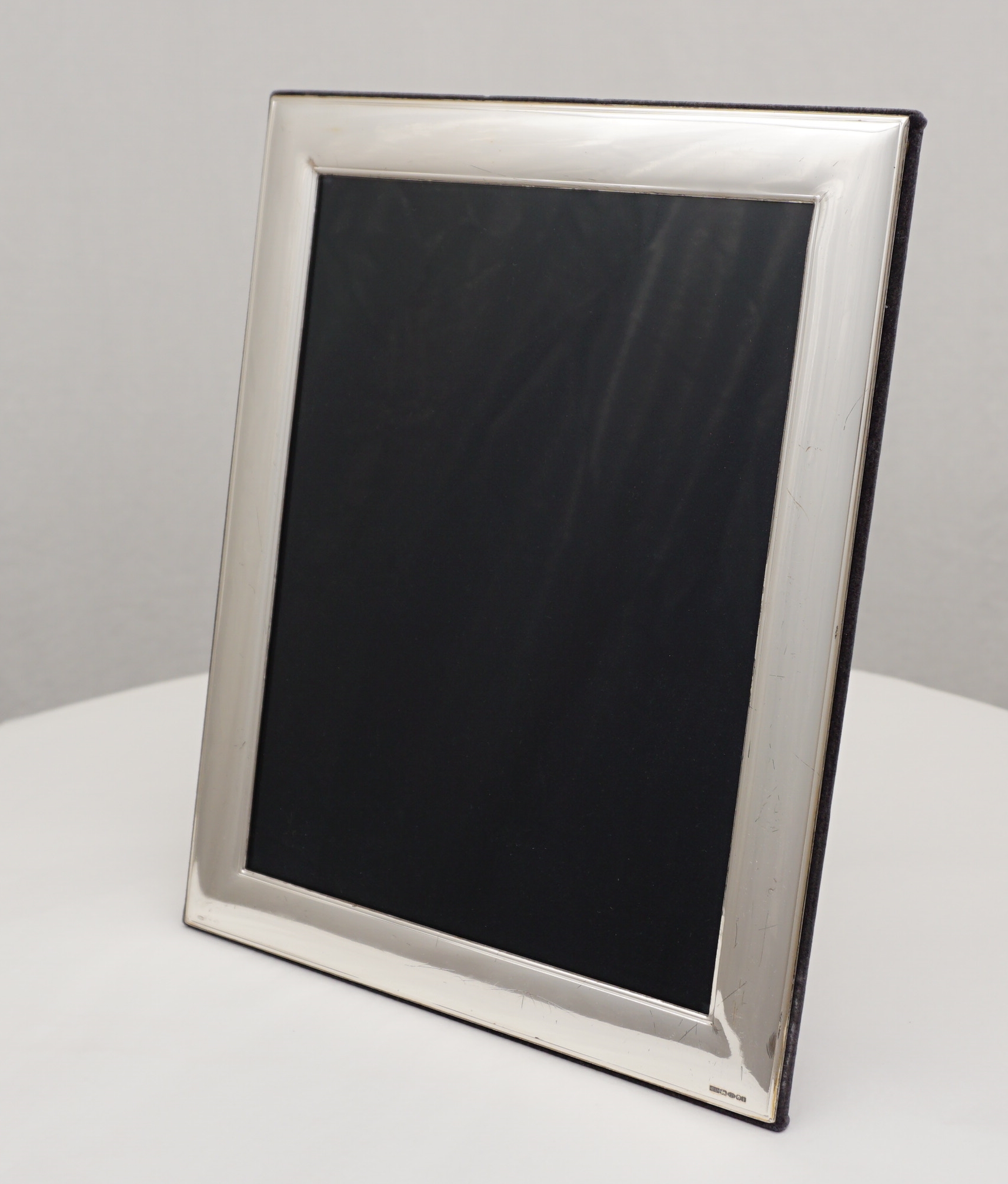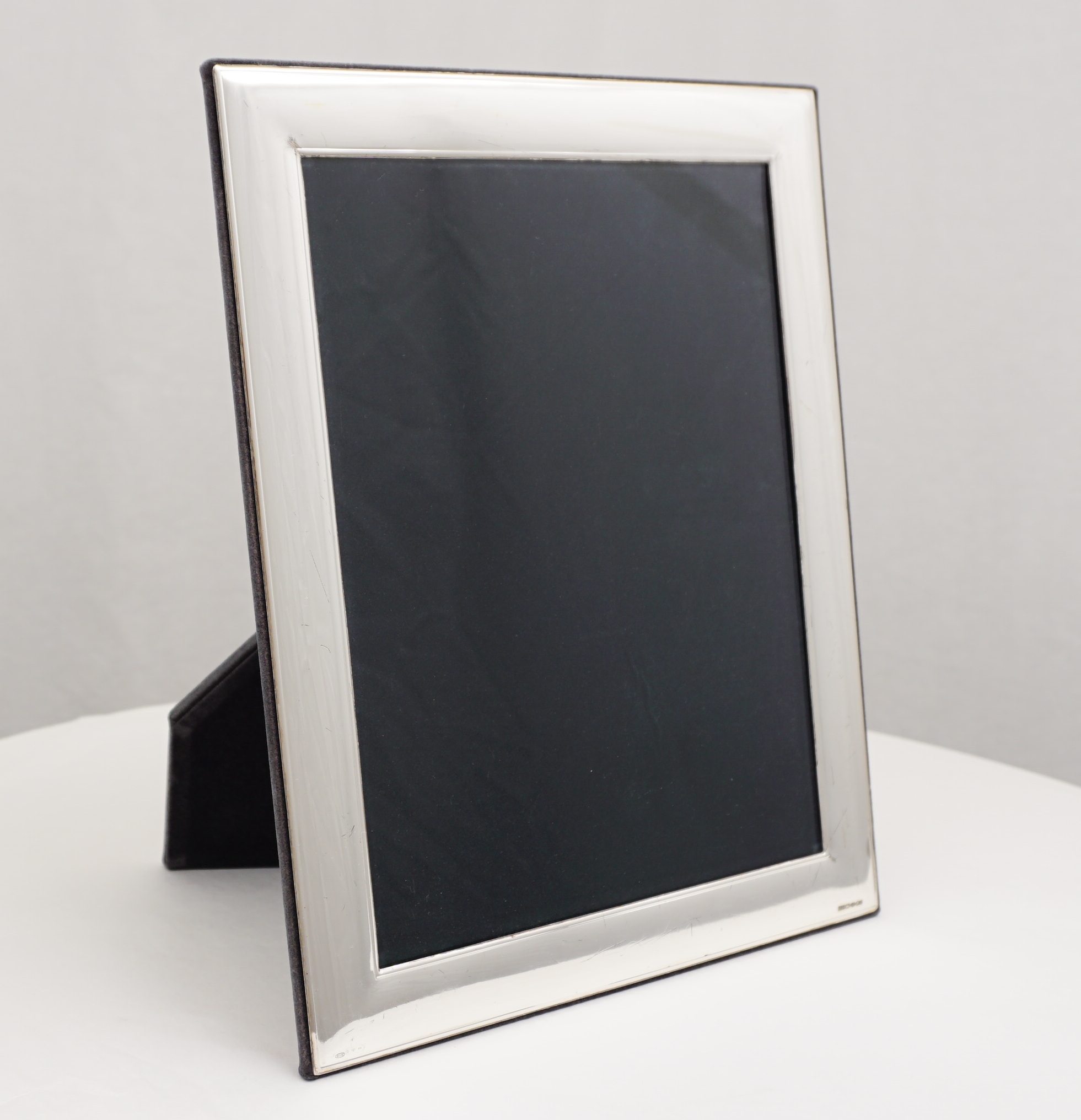 DESCRIPTION | Useful, large Italian solid sterling silver mounted photograph frame with a felt strut back that works landscape and portrait and a clear varnish. Made in Ancona, Italy and imported by Harrison Brothers & Howson. |