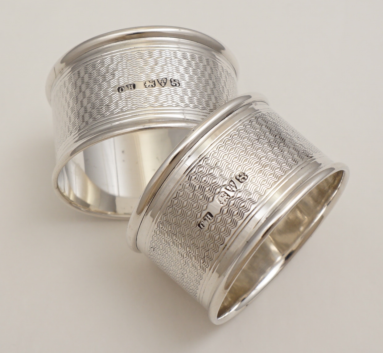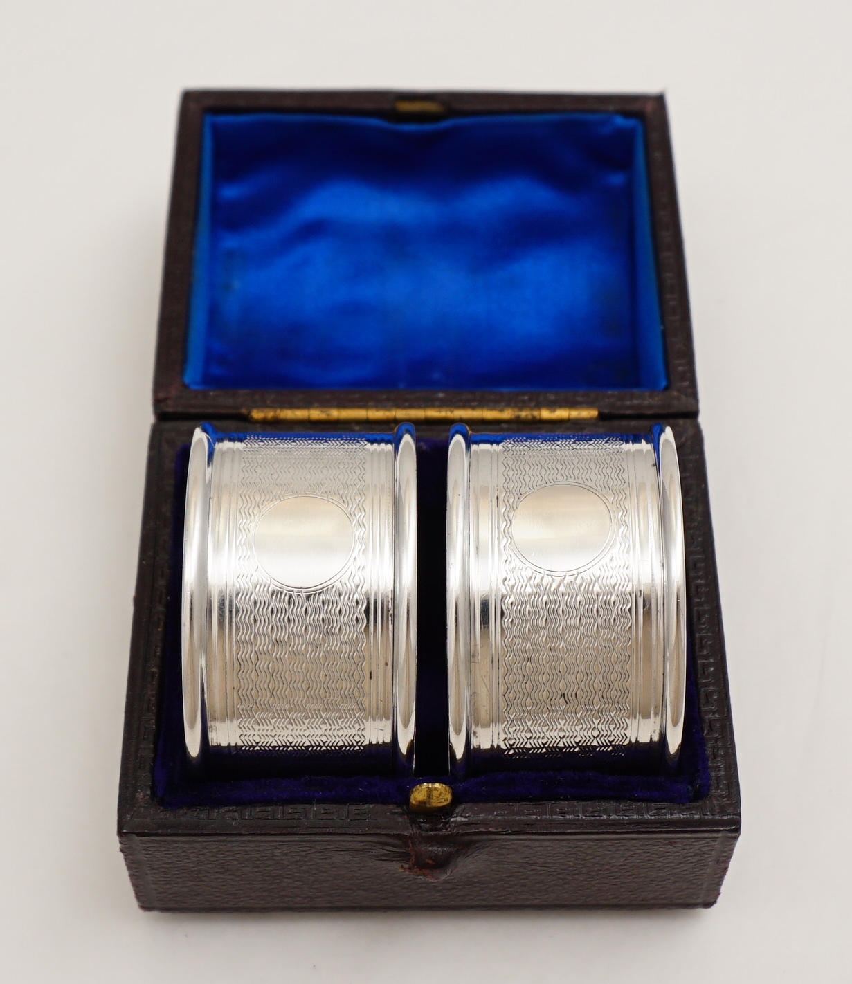 DESCRIPTION | Very good cased pair of vintage English solid sterling silver napkin rings with engine turned decoration and blank circular cartouches that have not been engraved or erased. |