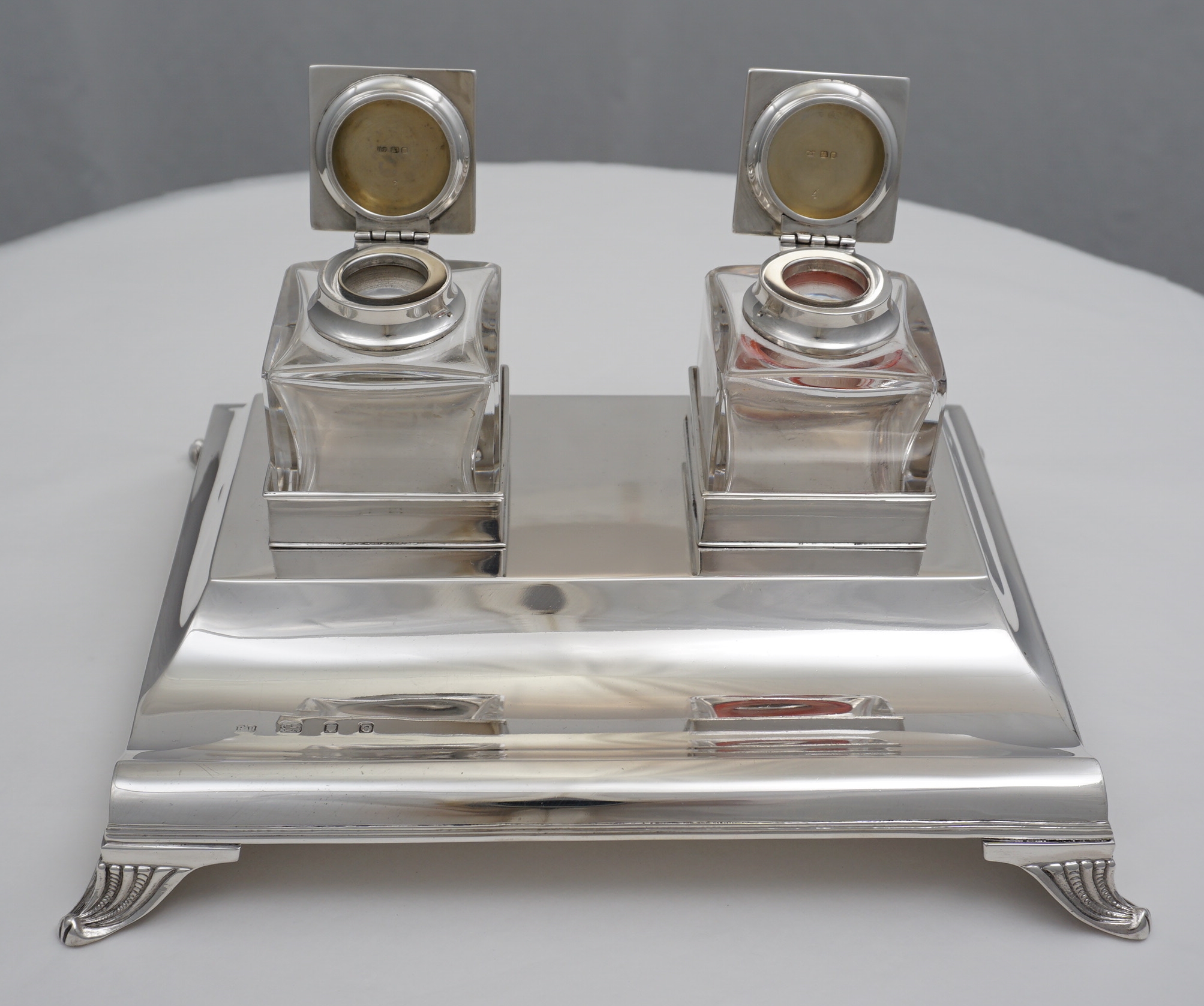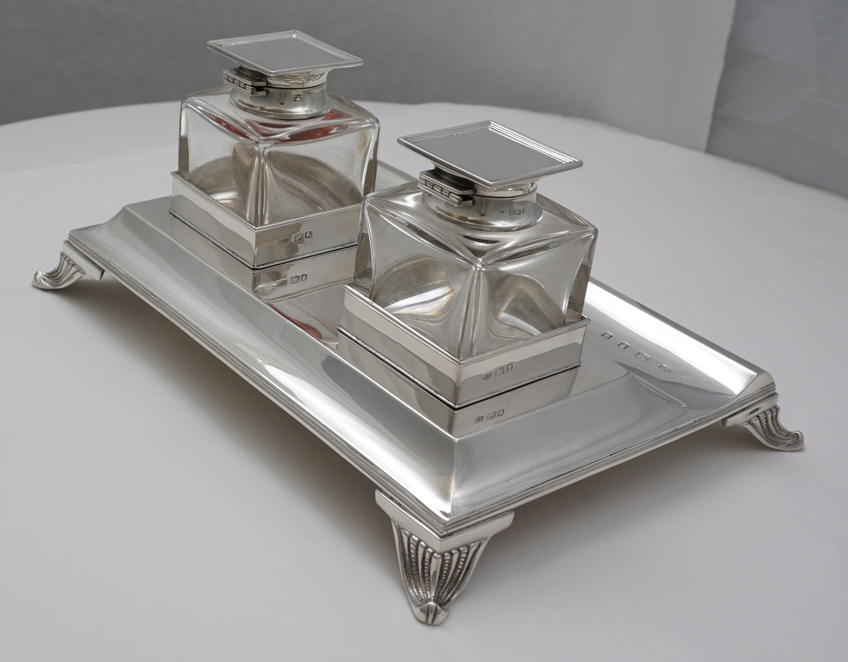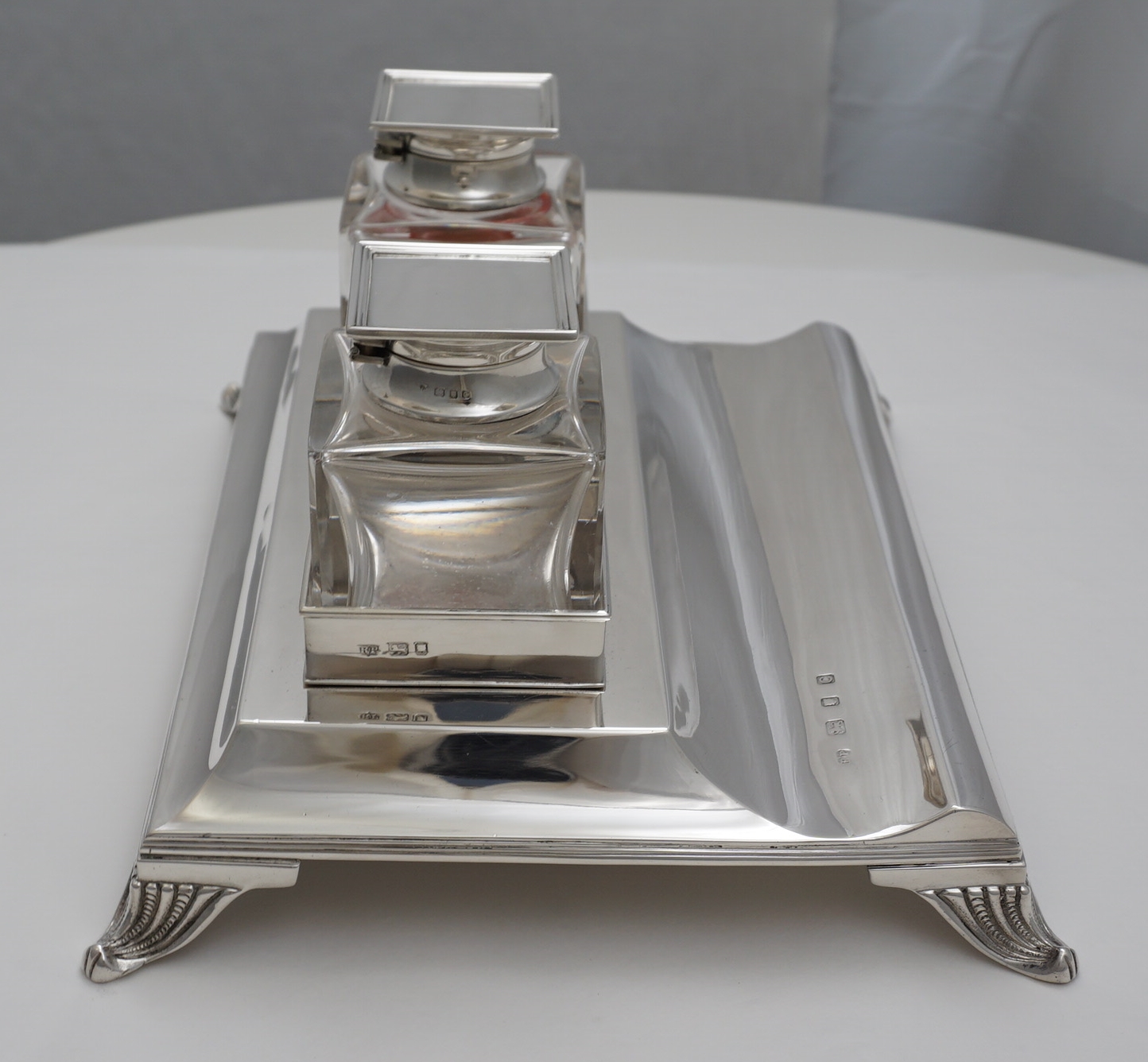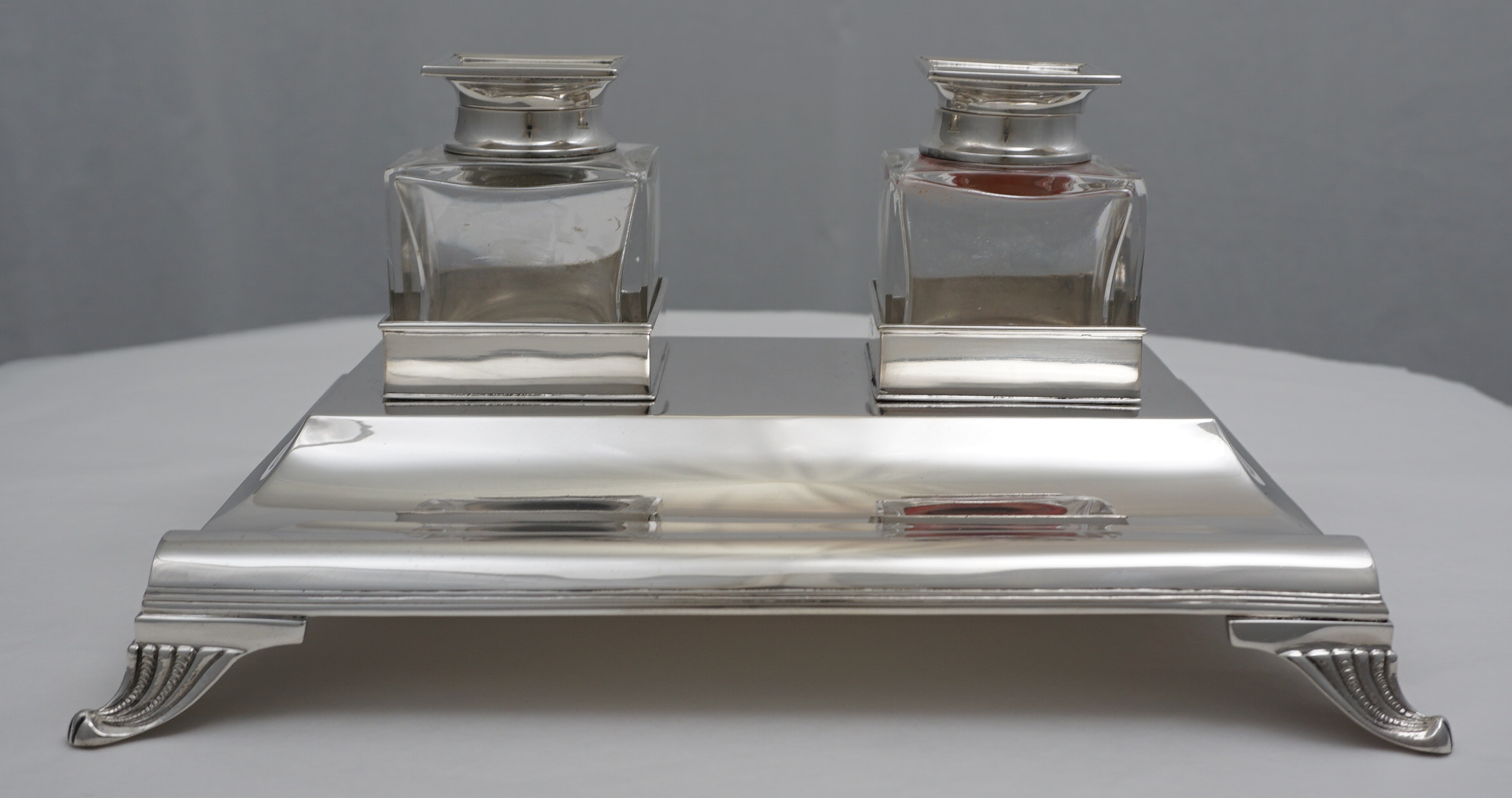 DESCRIPTION | Large and impressive English solid sterling silver two-bottle inkstand with generous frontal pen-tray and in a restrained Art Deco style. The hinged tops to the inkwells are gilded below, a pleasing sign of the highest quality. The fixing paste for the mounts has picked up just enough colour to see that one bottle was used for red ink and the other black. |
