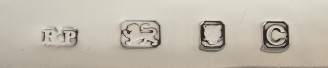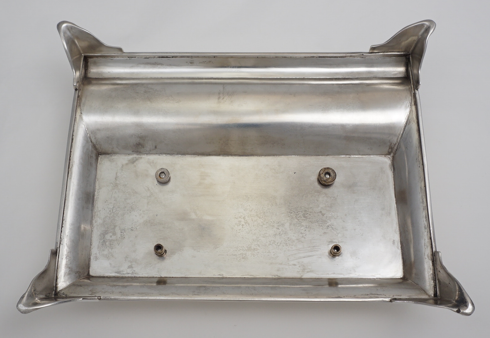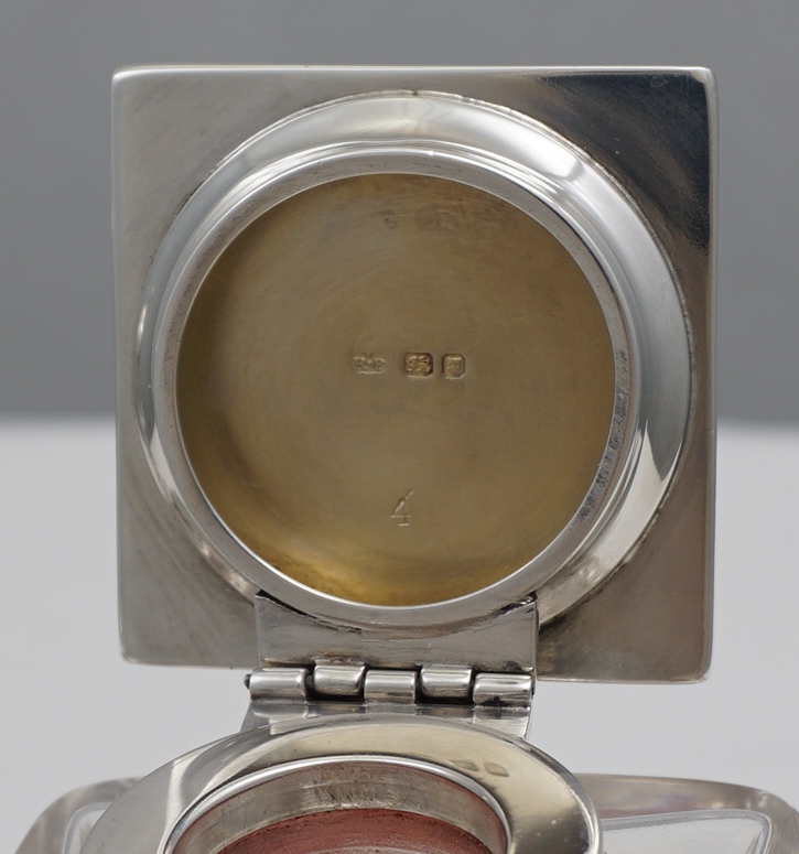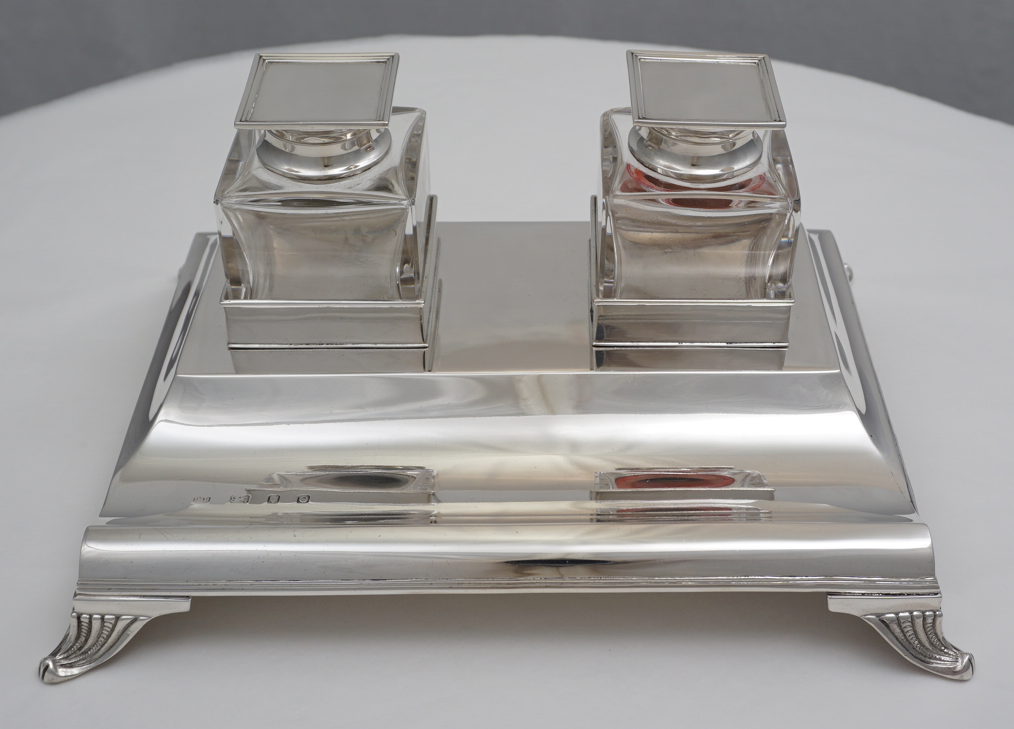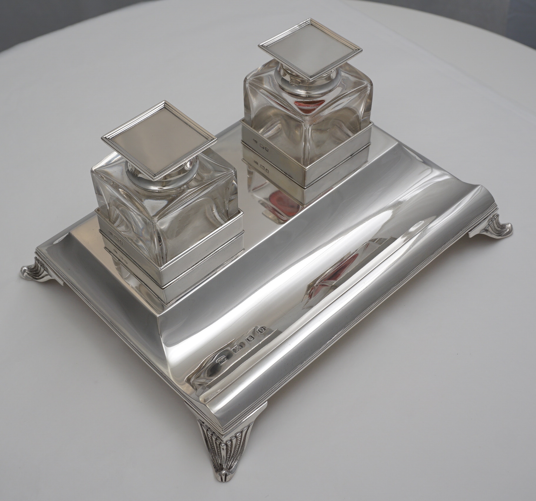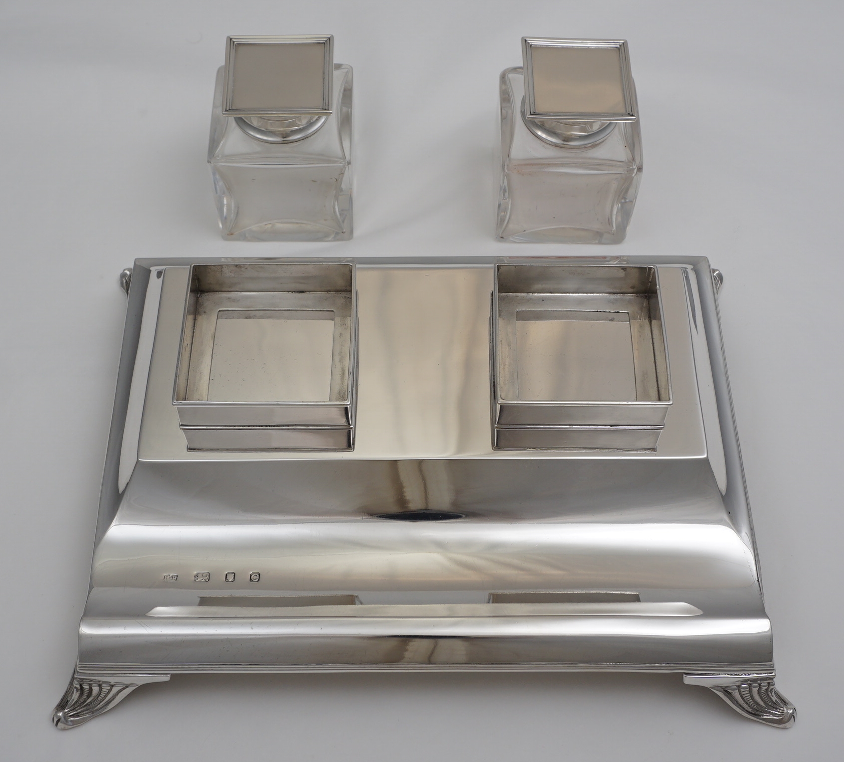 DESCRIPTION | Large and impressive English solid sterling silver two-bottle inkstand with generous frontal pen-tray and in a restrained Art Deco style. The hinged tops to the inkwells are gilded below, a pleasing sign of the highest quality. The fixing paste for the mounts has picked up just enough colour to see that one bottle was used for red ink and the other black. |