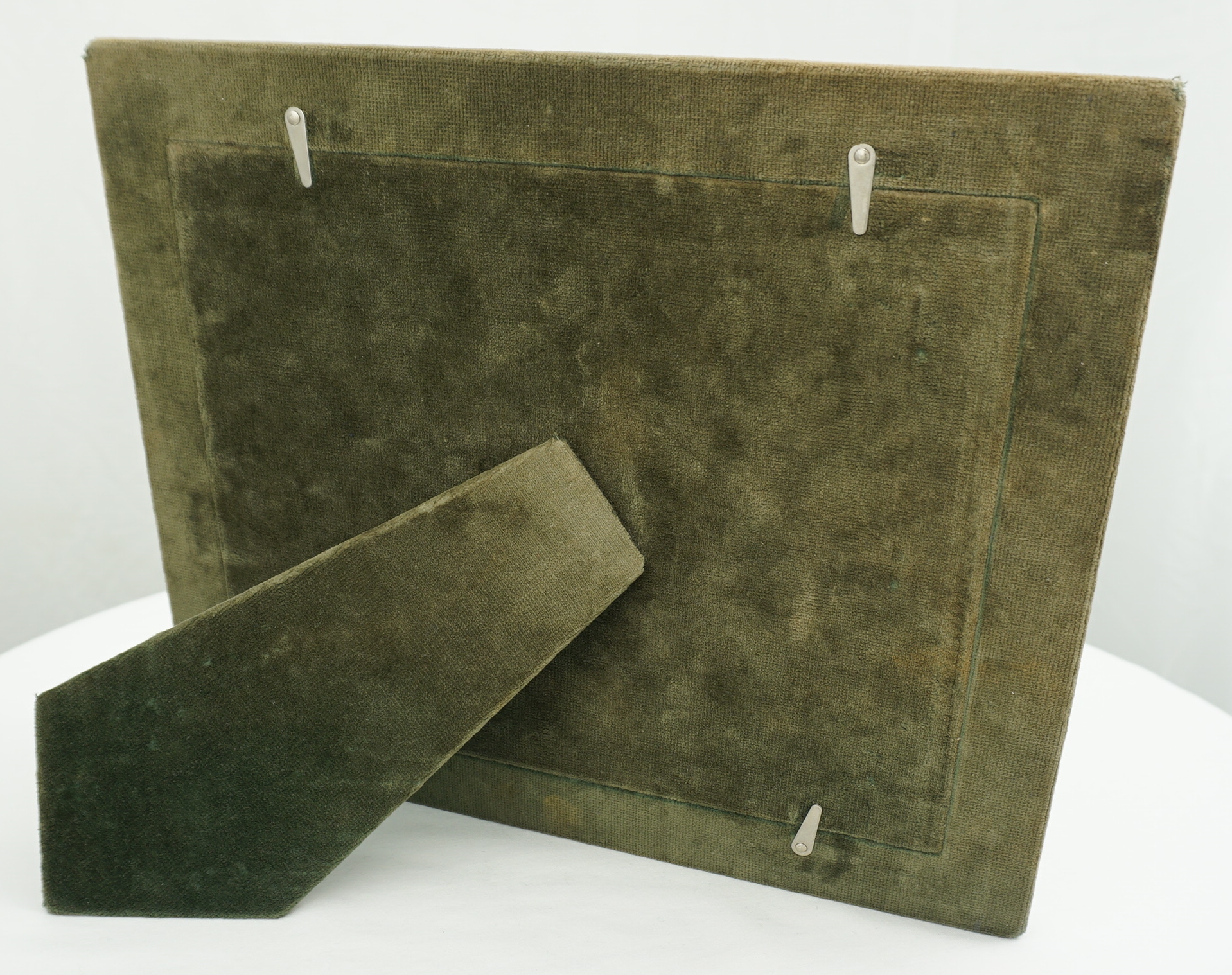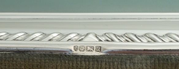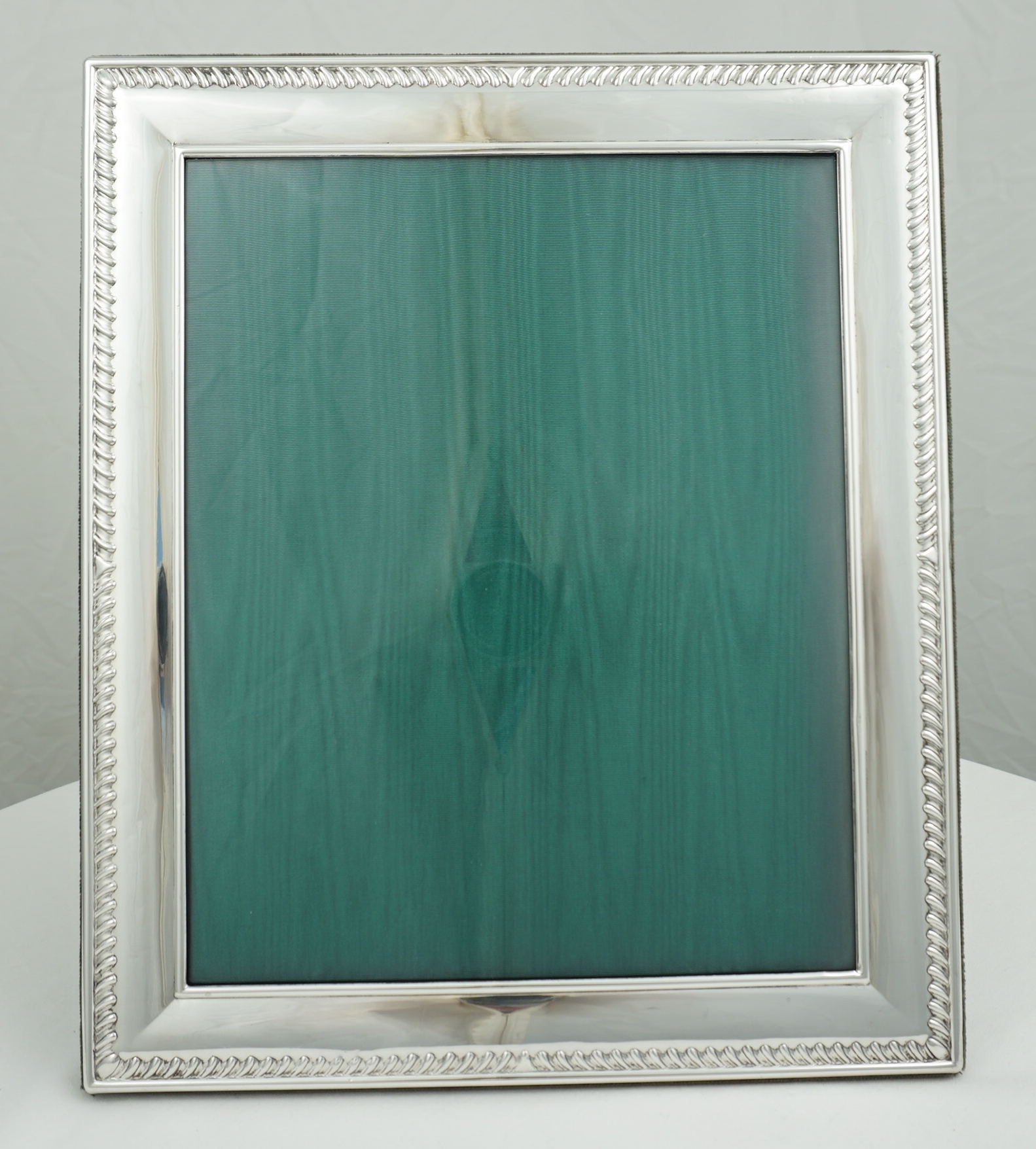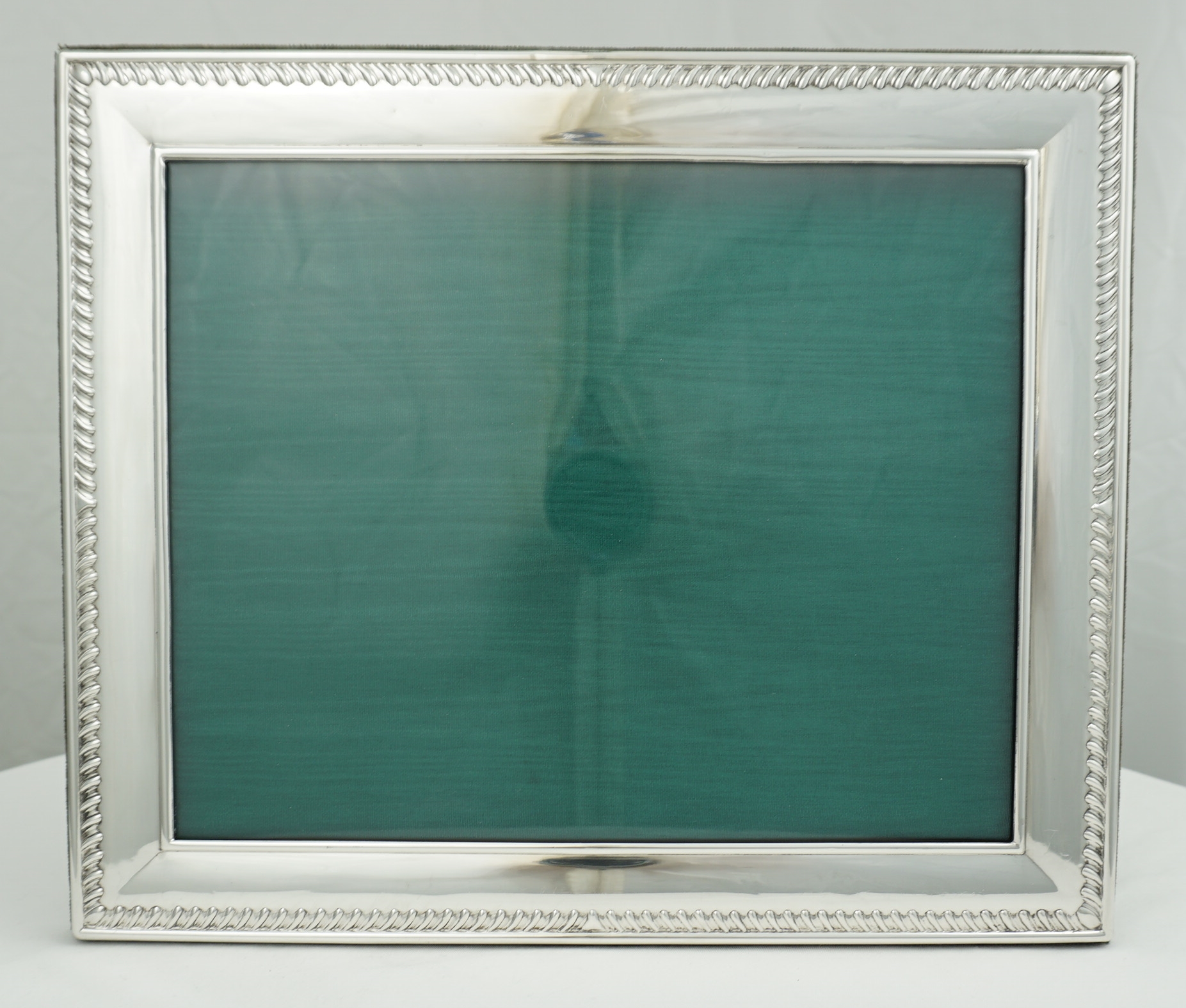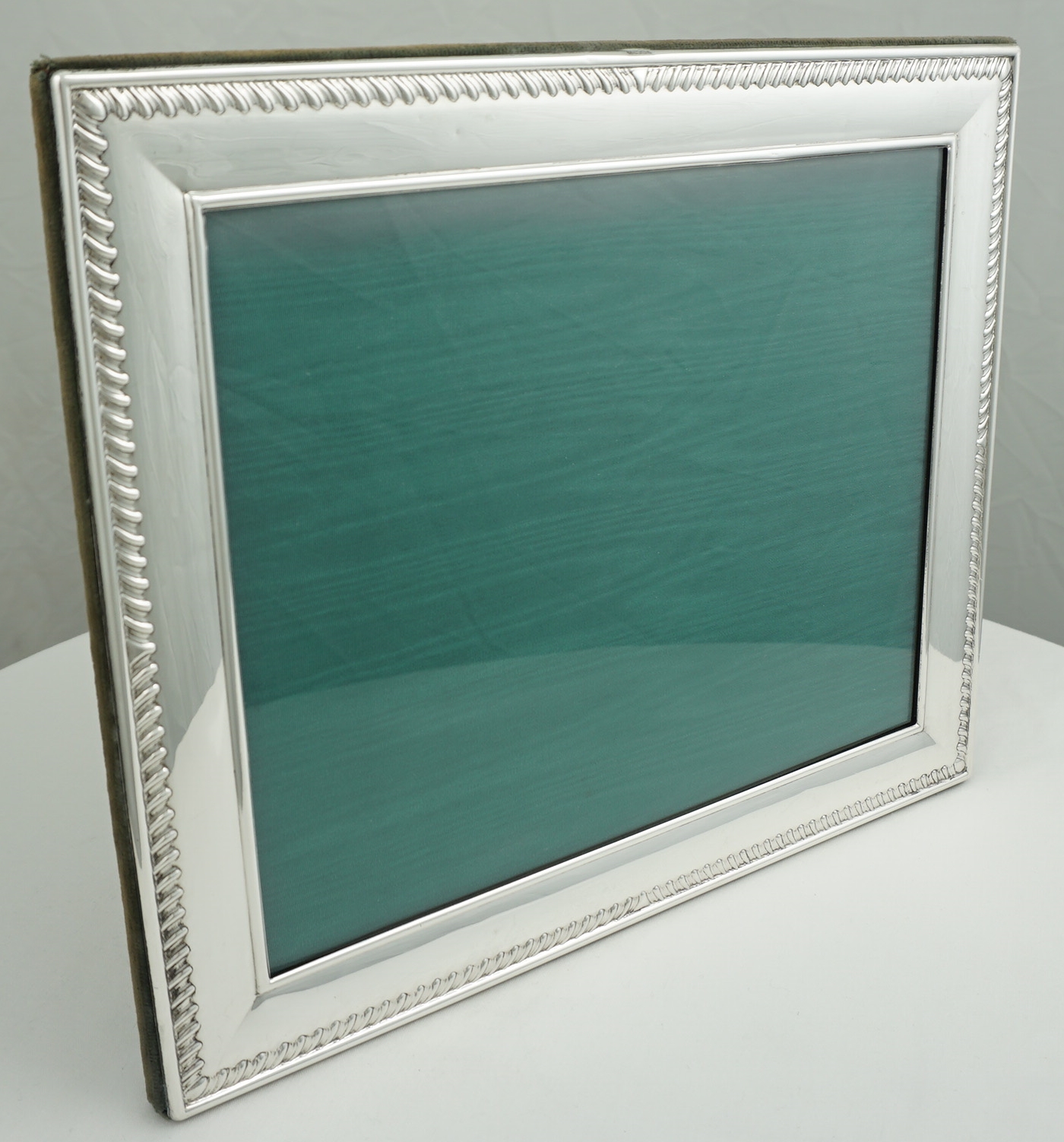 DESCRIPTION | Good quality and large solid sterling silver mounted photograph frame with an olive green felt strut back that works in both landscape and portrait and gadroon edge decoration. There is some camera lens reflection in the images. |