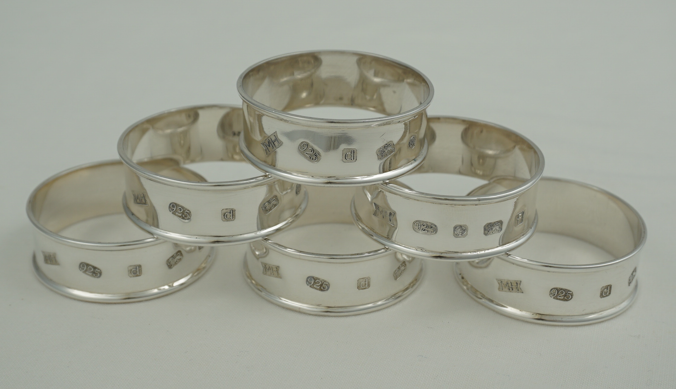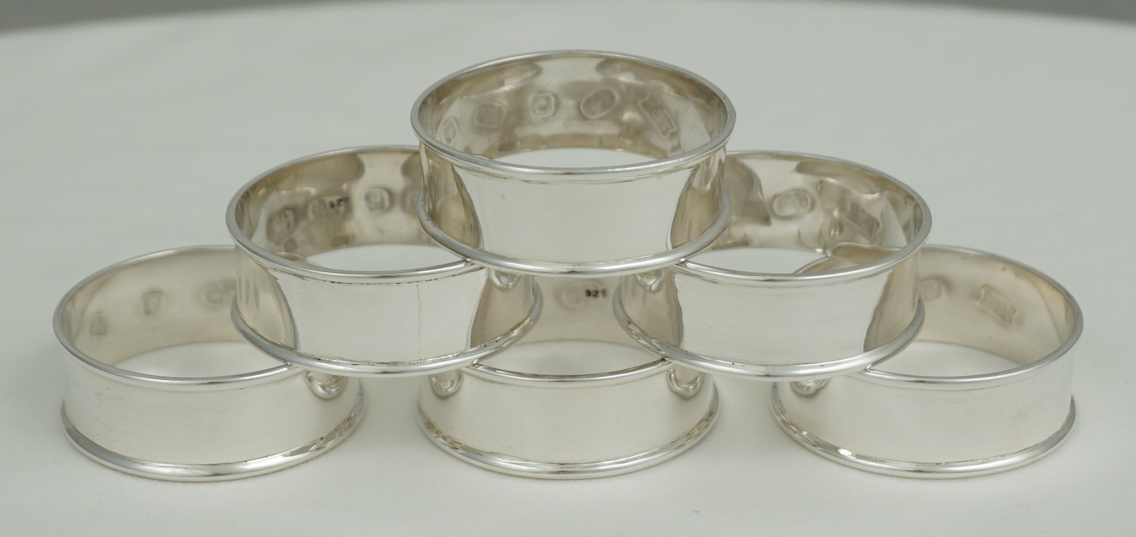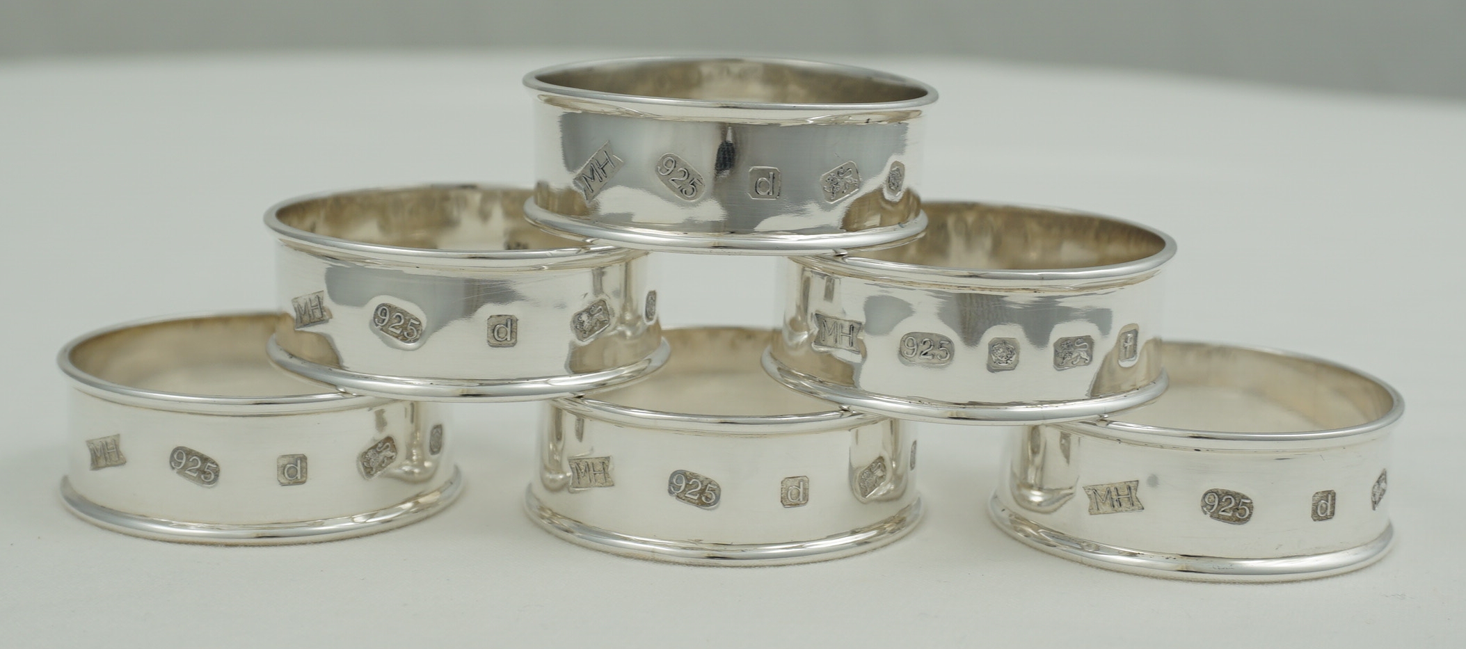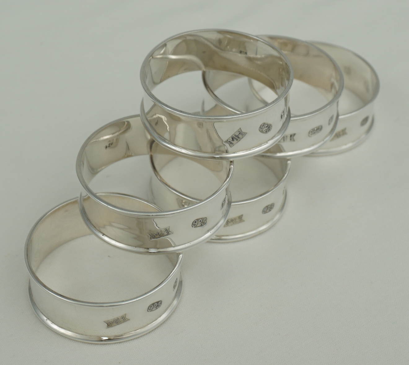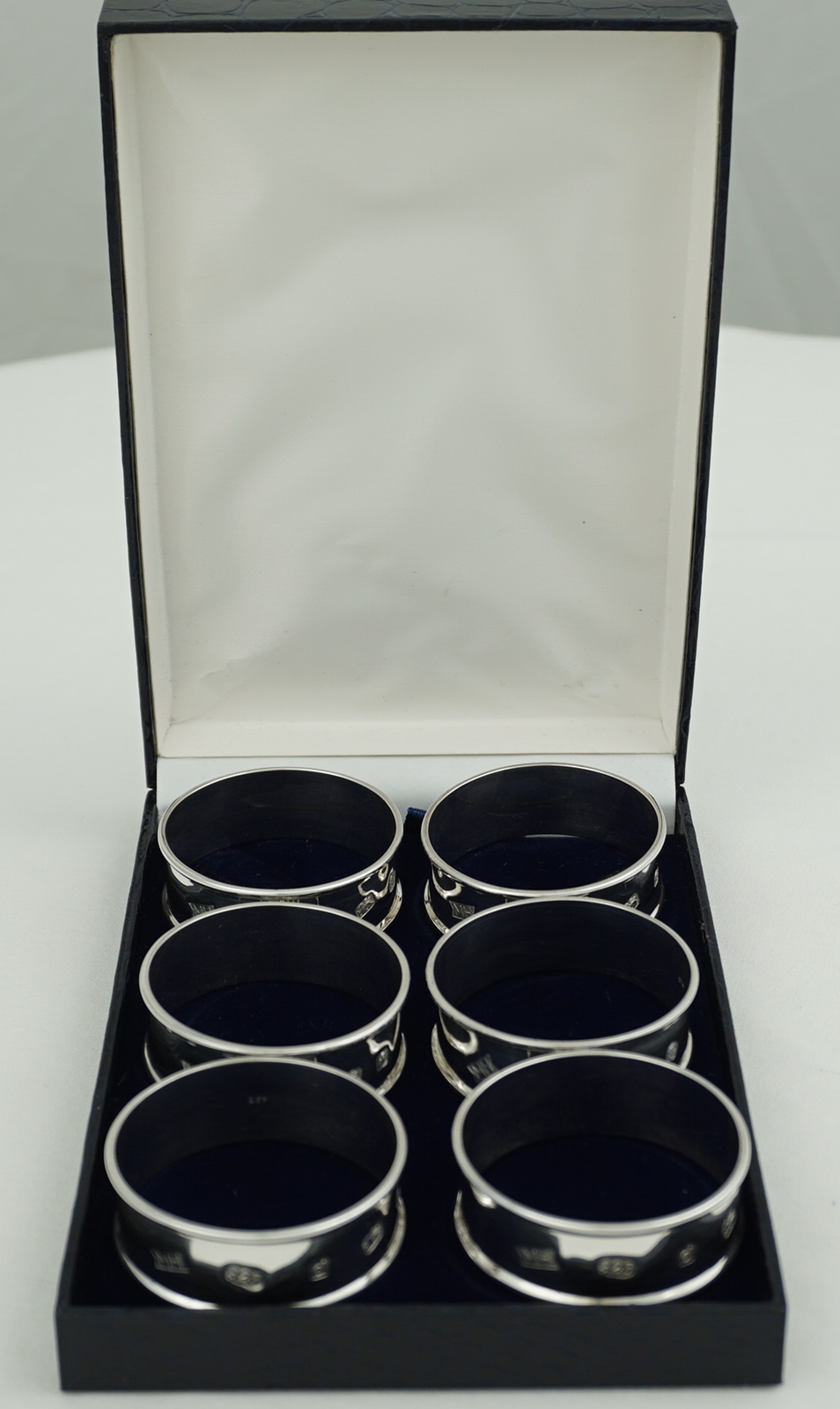DESCRIPTION | Set of six light but perfectly formed vintage English solid sterling silver napkin rings with no engraving or erasure. The box is associated but works quite well. |