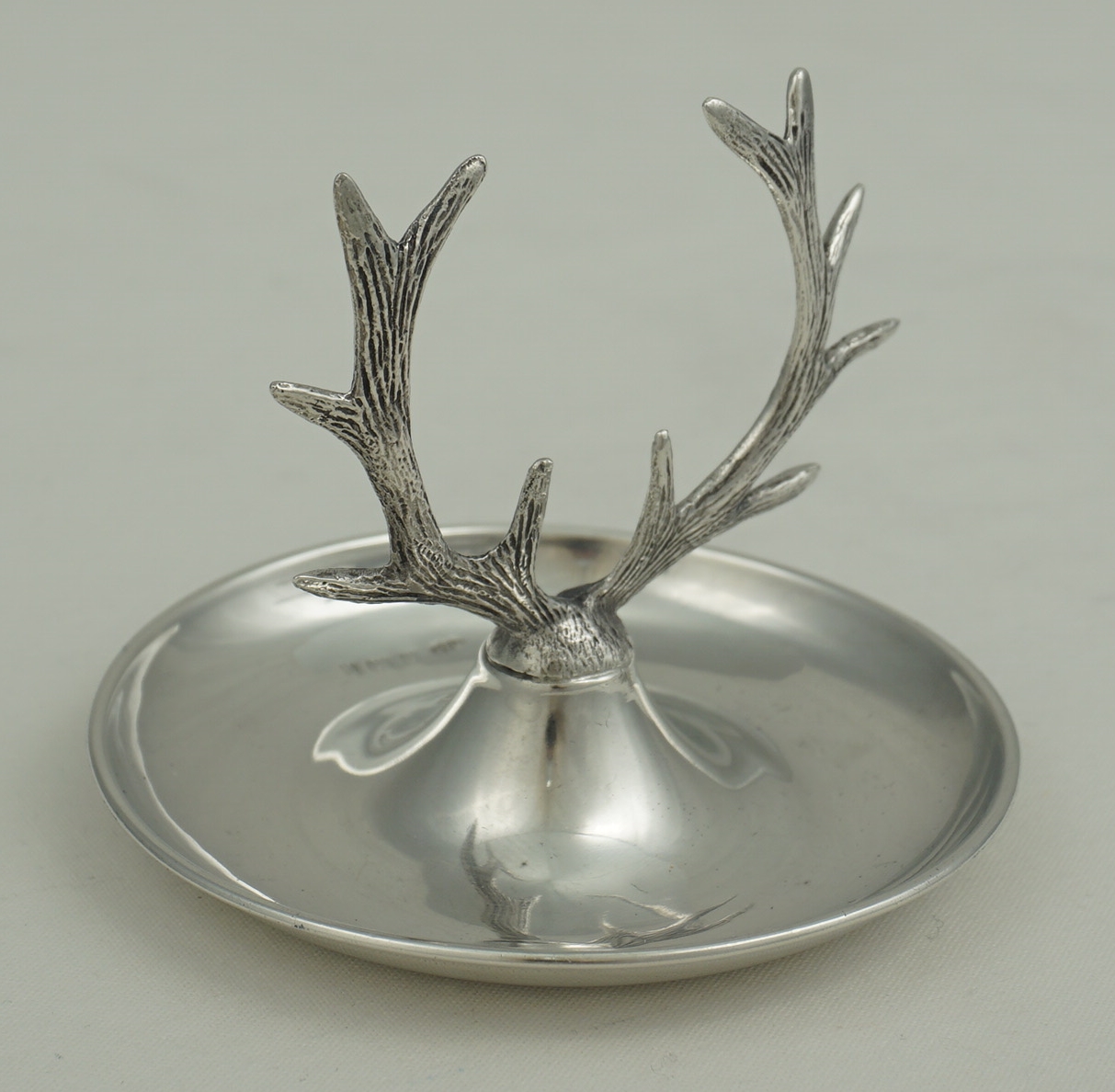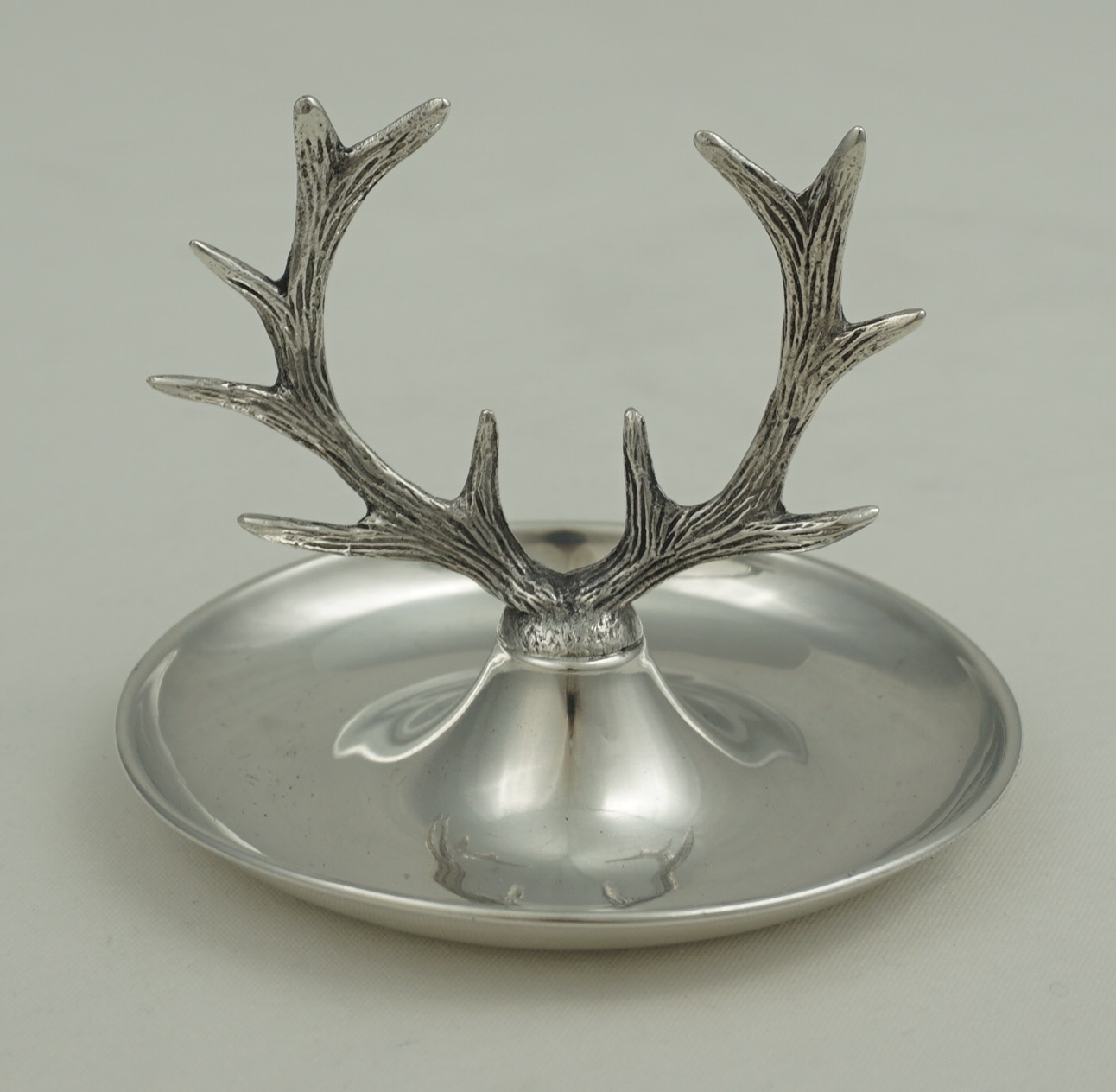 DESCRIPTION | Very good and unusual antique English solid sterling silver antler form ring tree with useful dish base. |