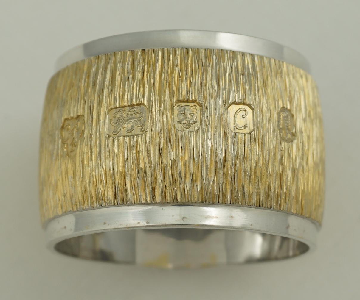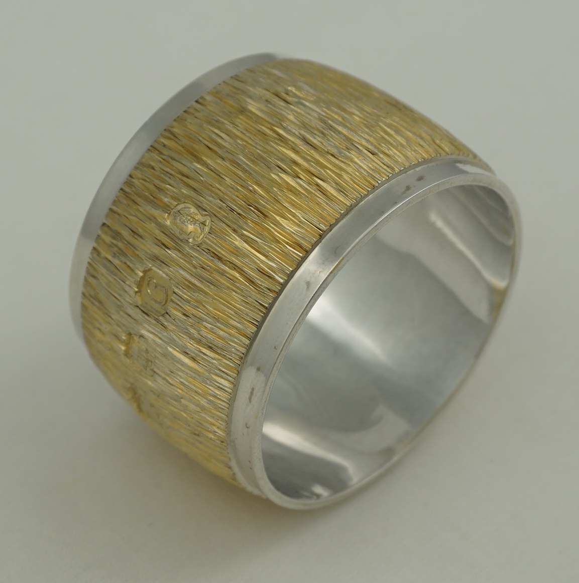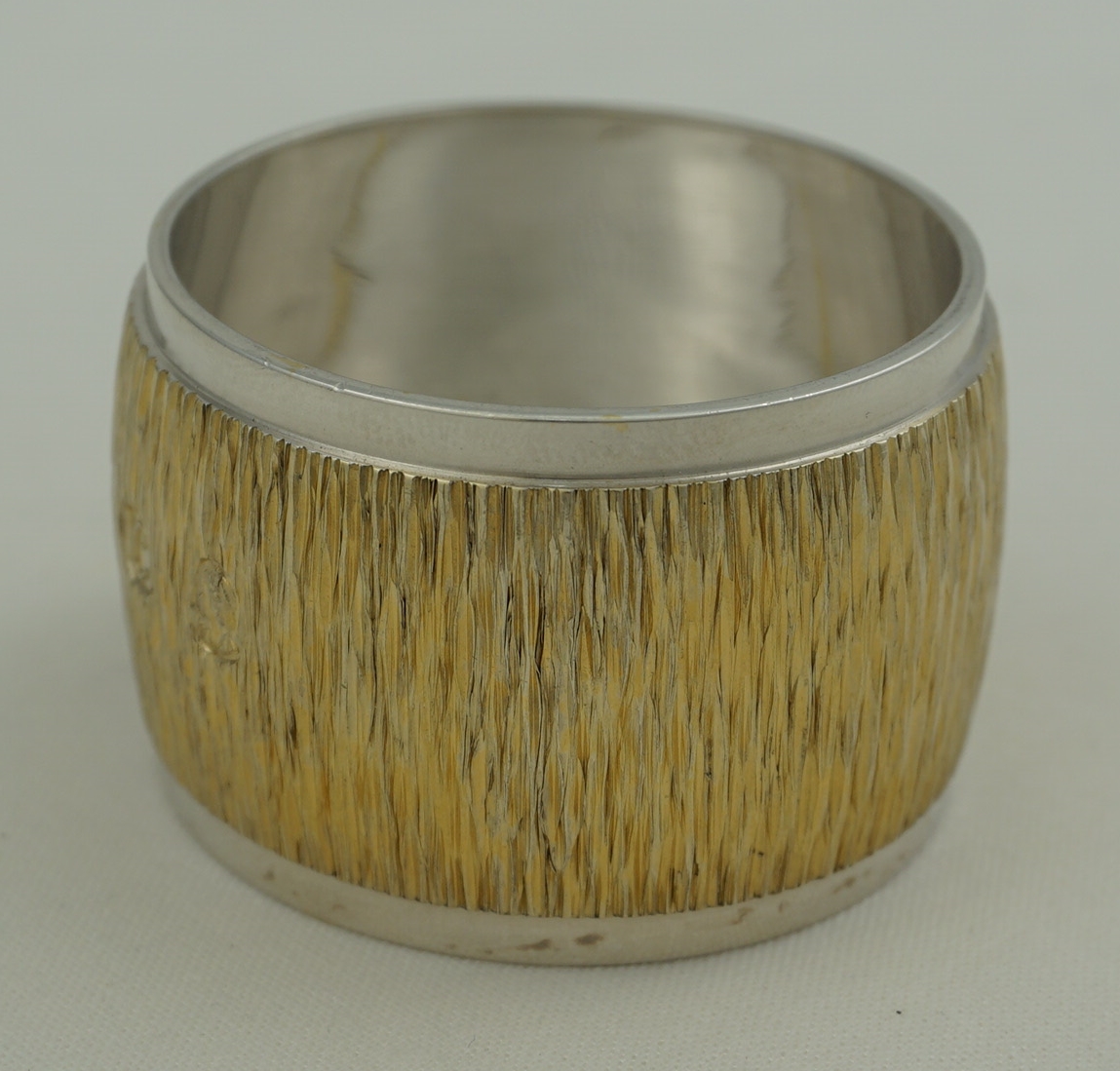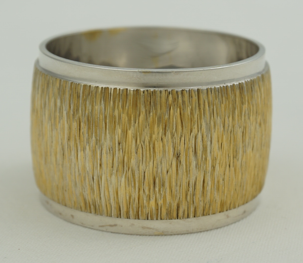 DESCRIPTION | Highest quality and heavy vintage English solid sterling silver gilt napkin (serviette) ring with naturalistic bark effect decoration. At the time of writing I have three identical examples available. |
