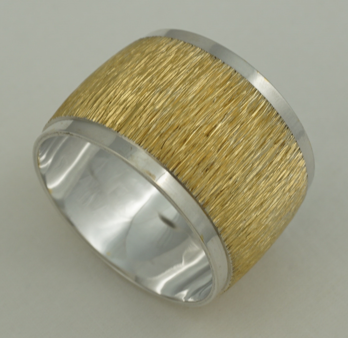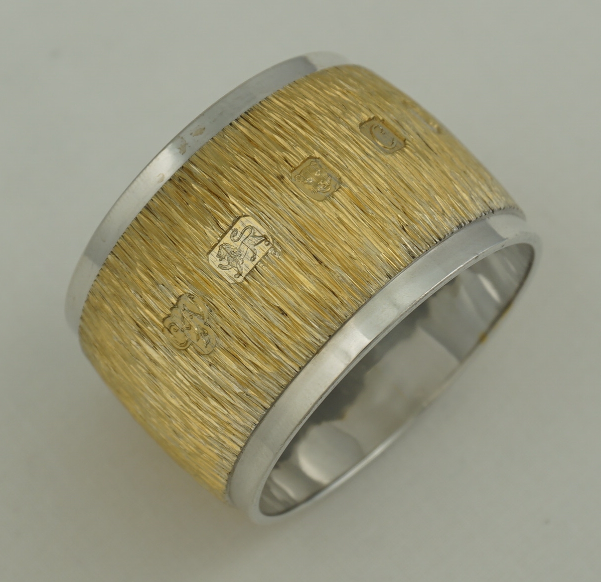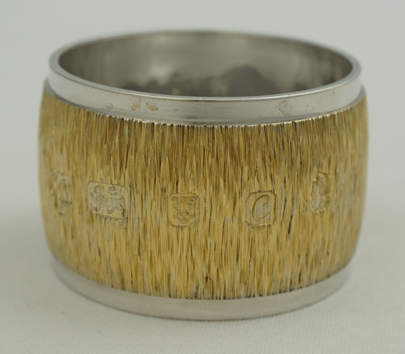 DESCRIPTION | Highest quality and heavy vintage English solid sterling silver gilt napkin (serviette) ring with naturalistic bark effect decoration. At the time of writing I have three identical examples available. |