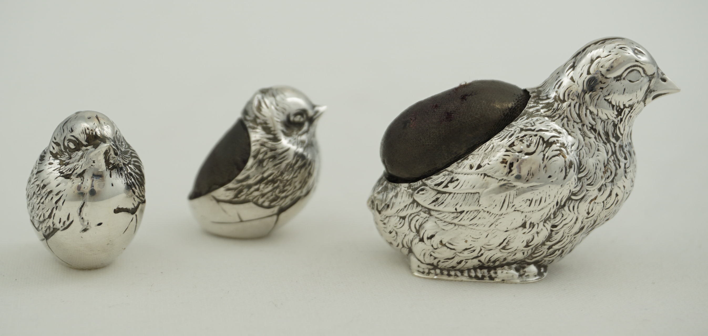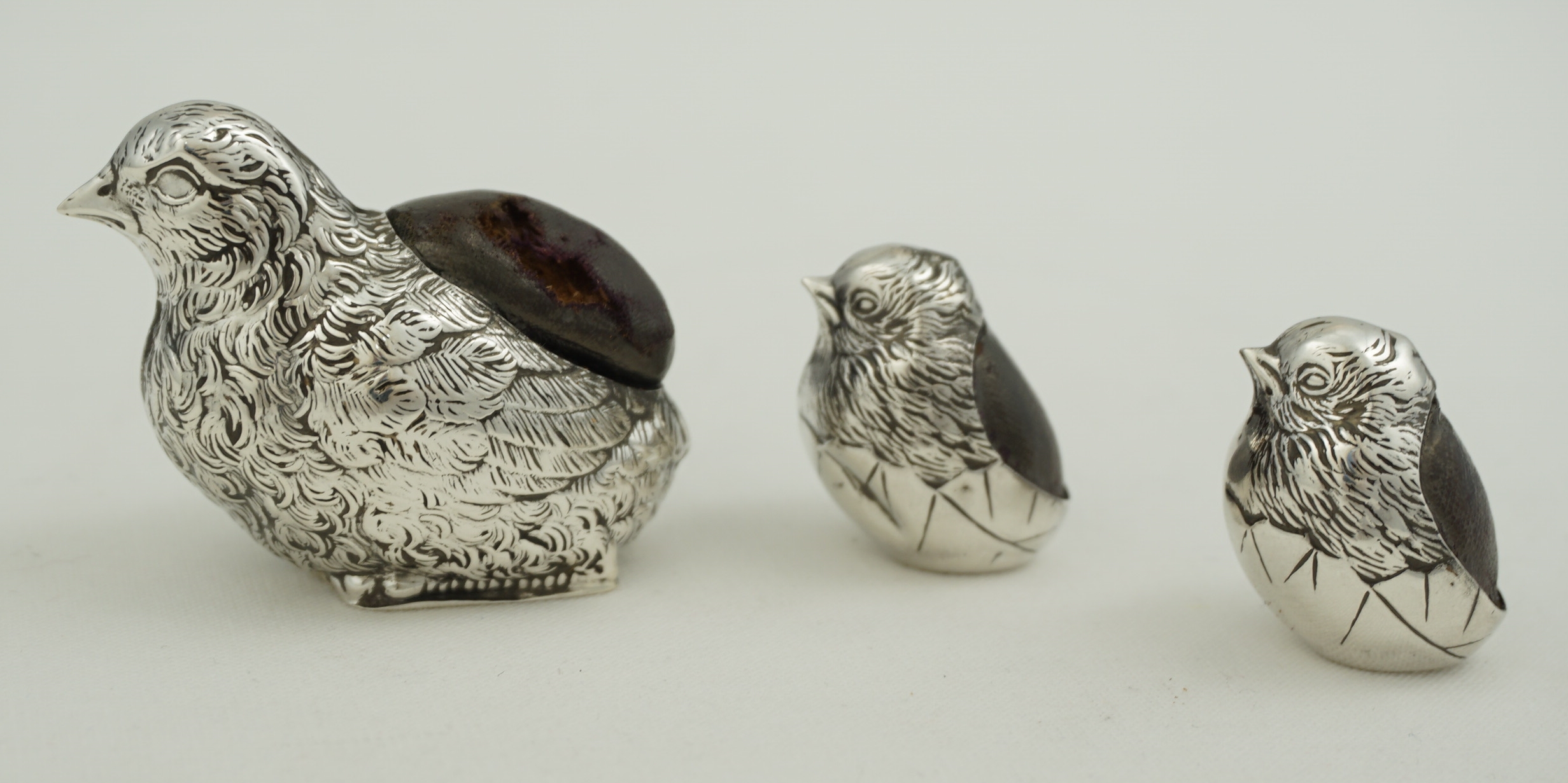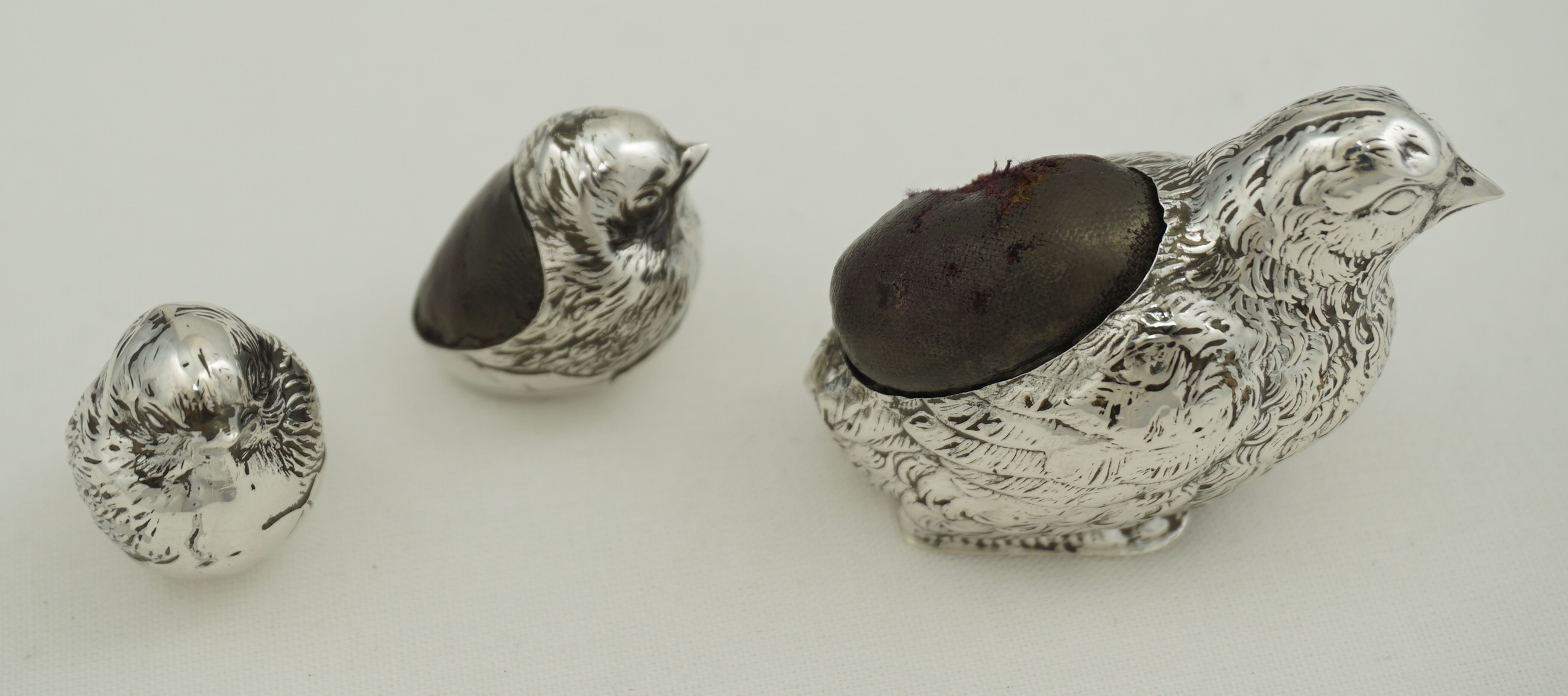 DESCRIPTION | Three antique English solid sterling silver pin cushions comprising of the mother hen and two chicks. |