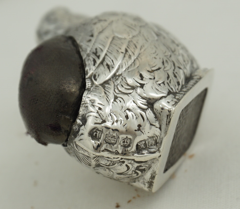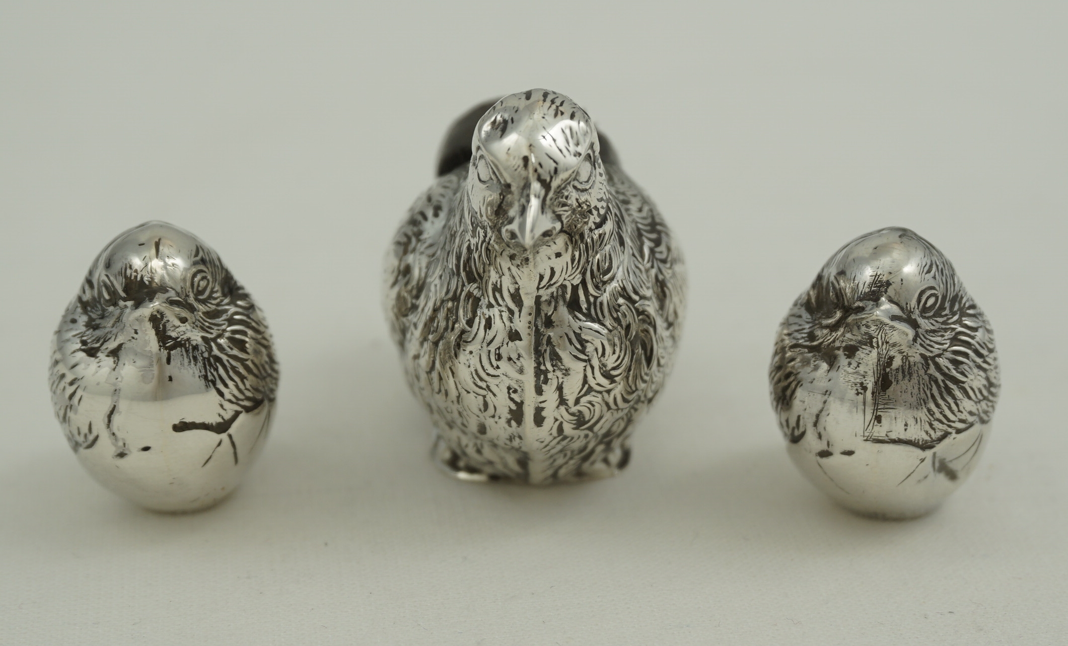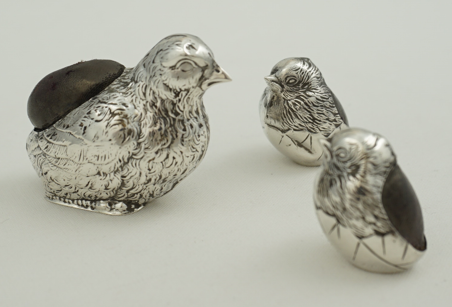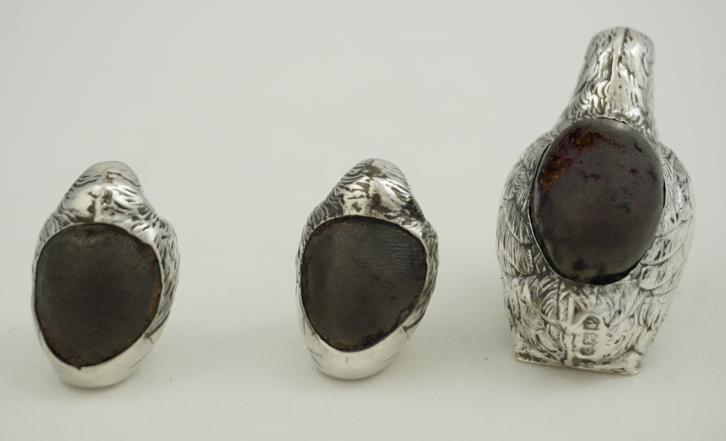DESCRIPTION | Three antique English solid sterling silver pin cushions comprising of the mother hen and two chicks. |