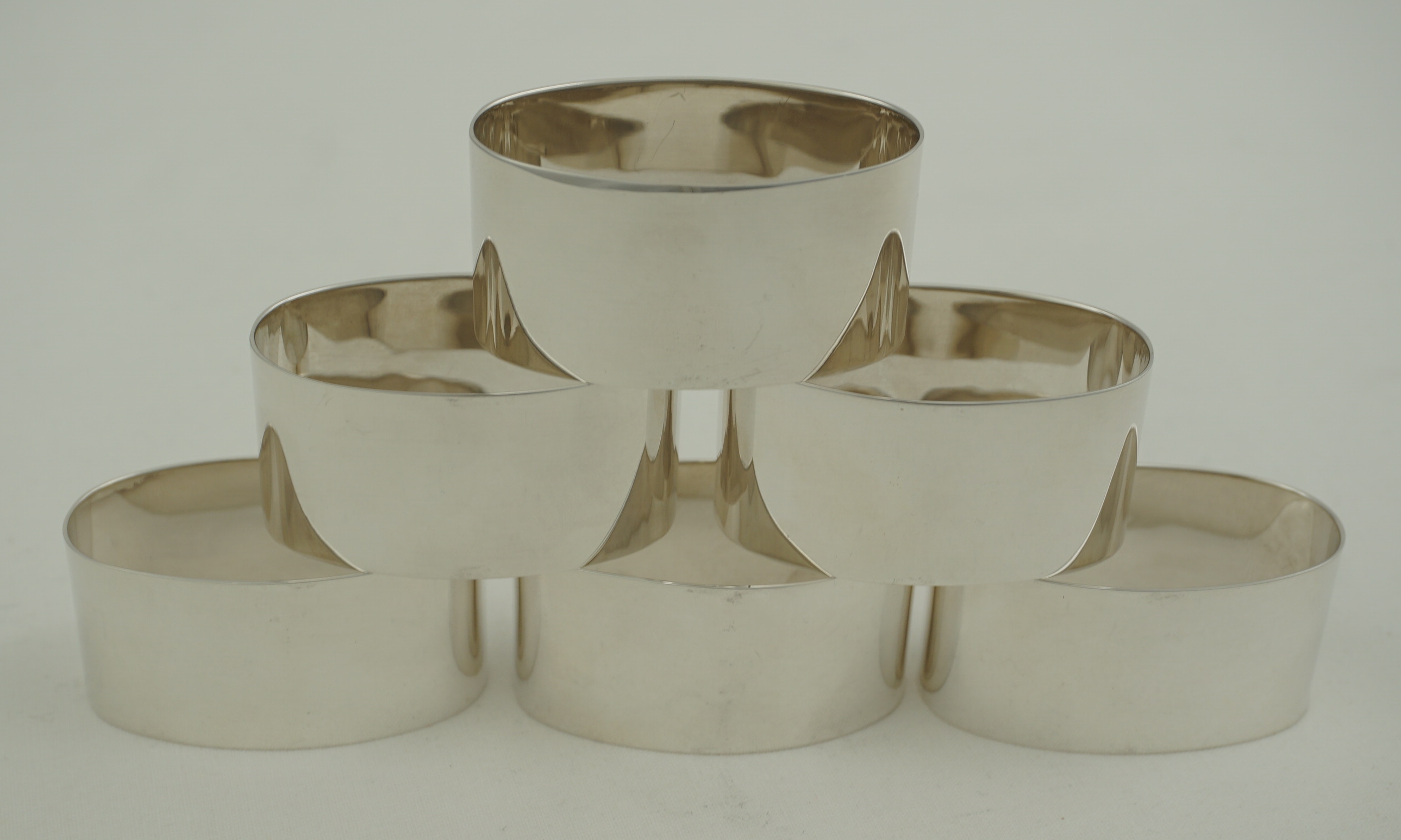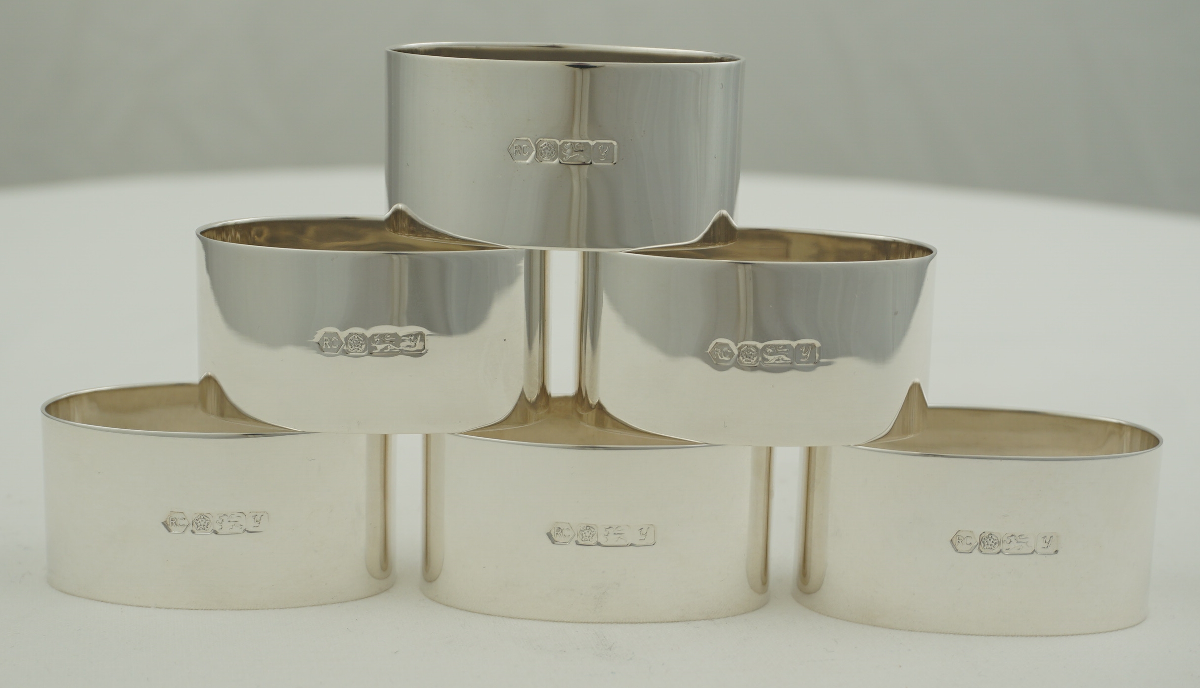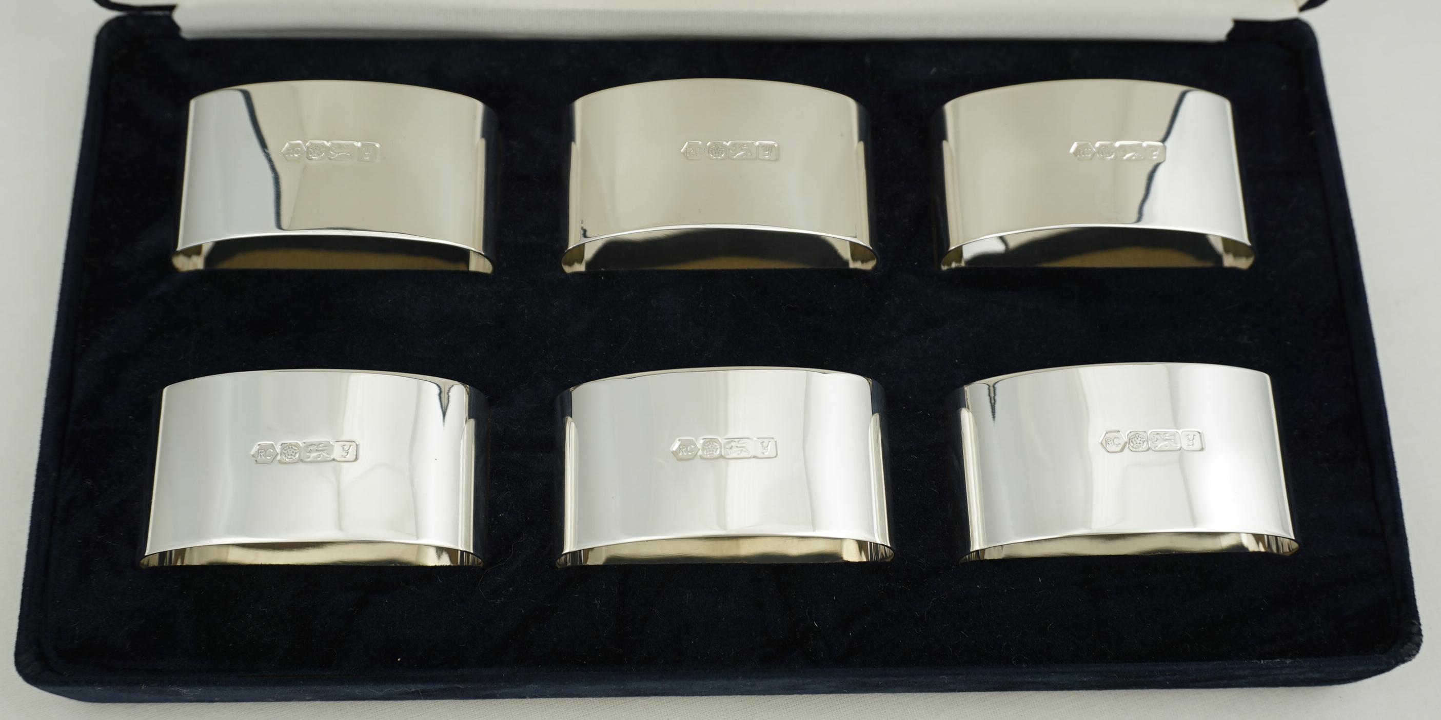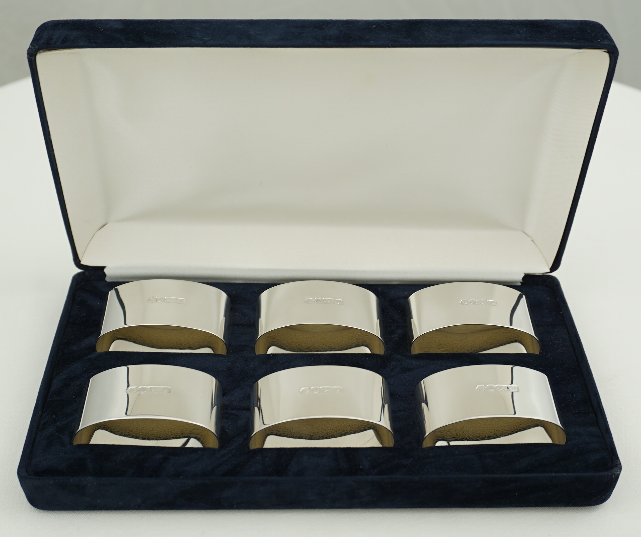 DESCRIPTION | Good and cased set of six solid sterling silver oval napkin (serviette) rings with no engraving or erasure. Carrs of Sheffield still sell a very similar napkin ring for £249 each. |