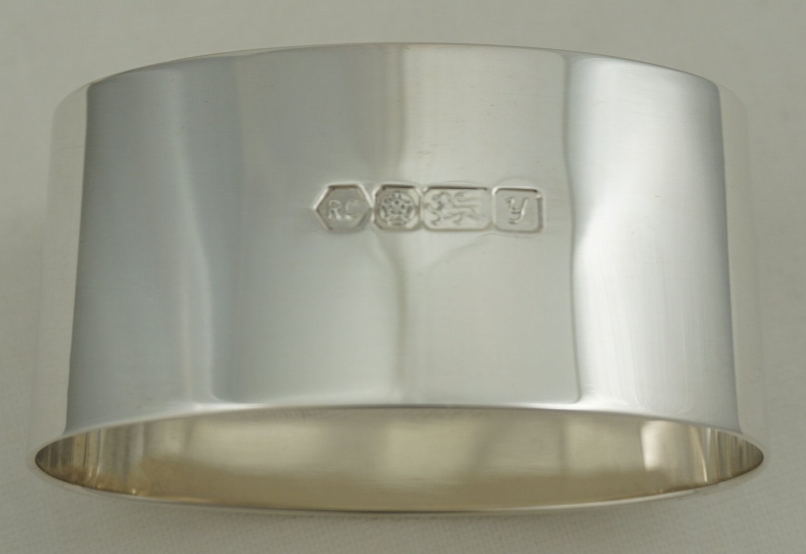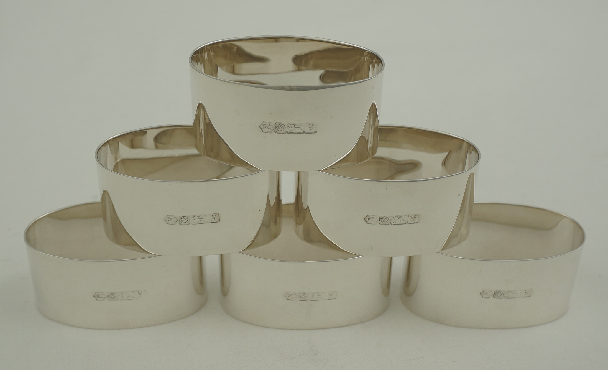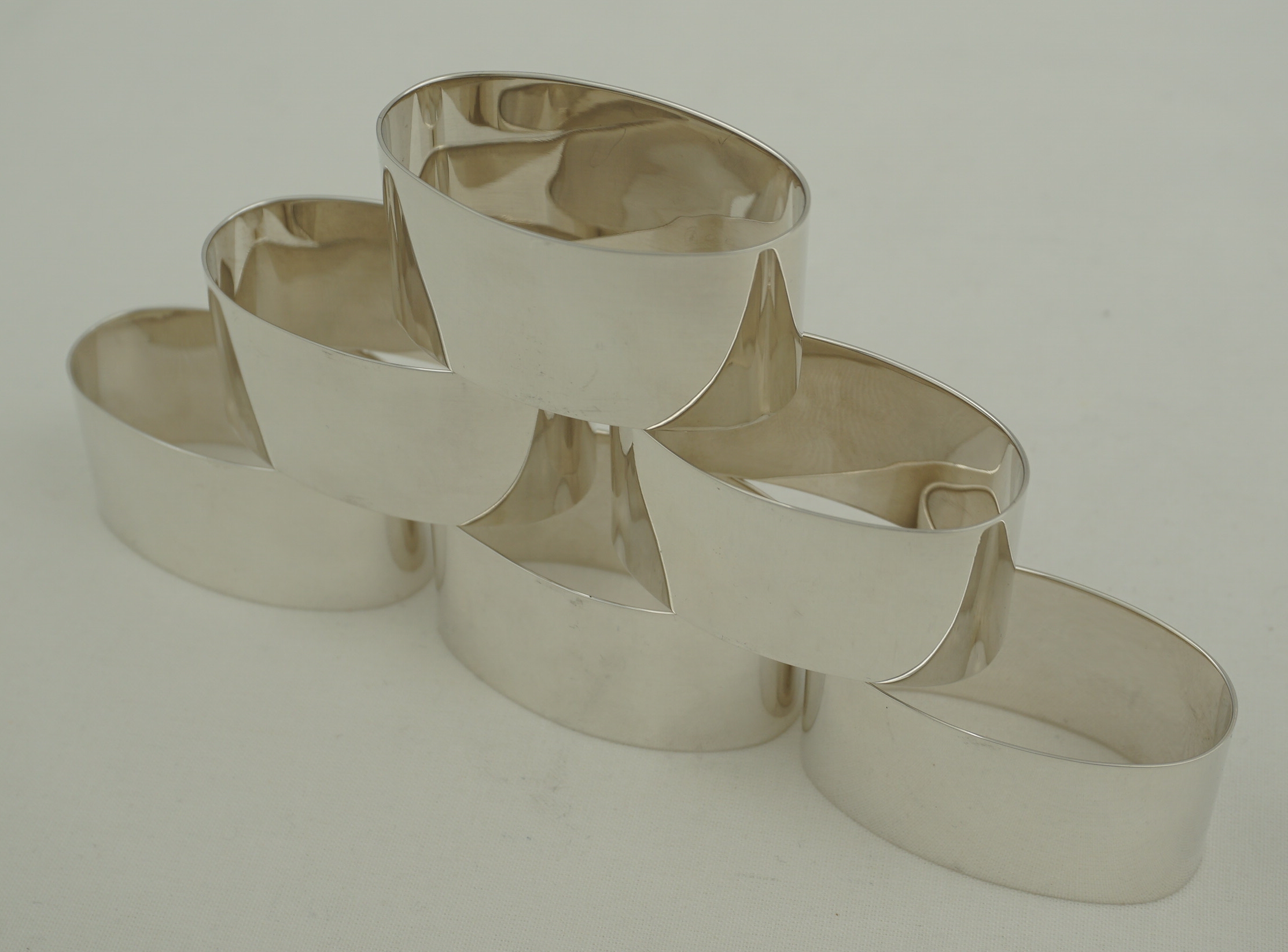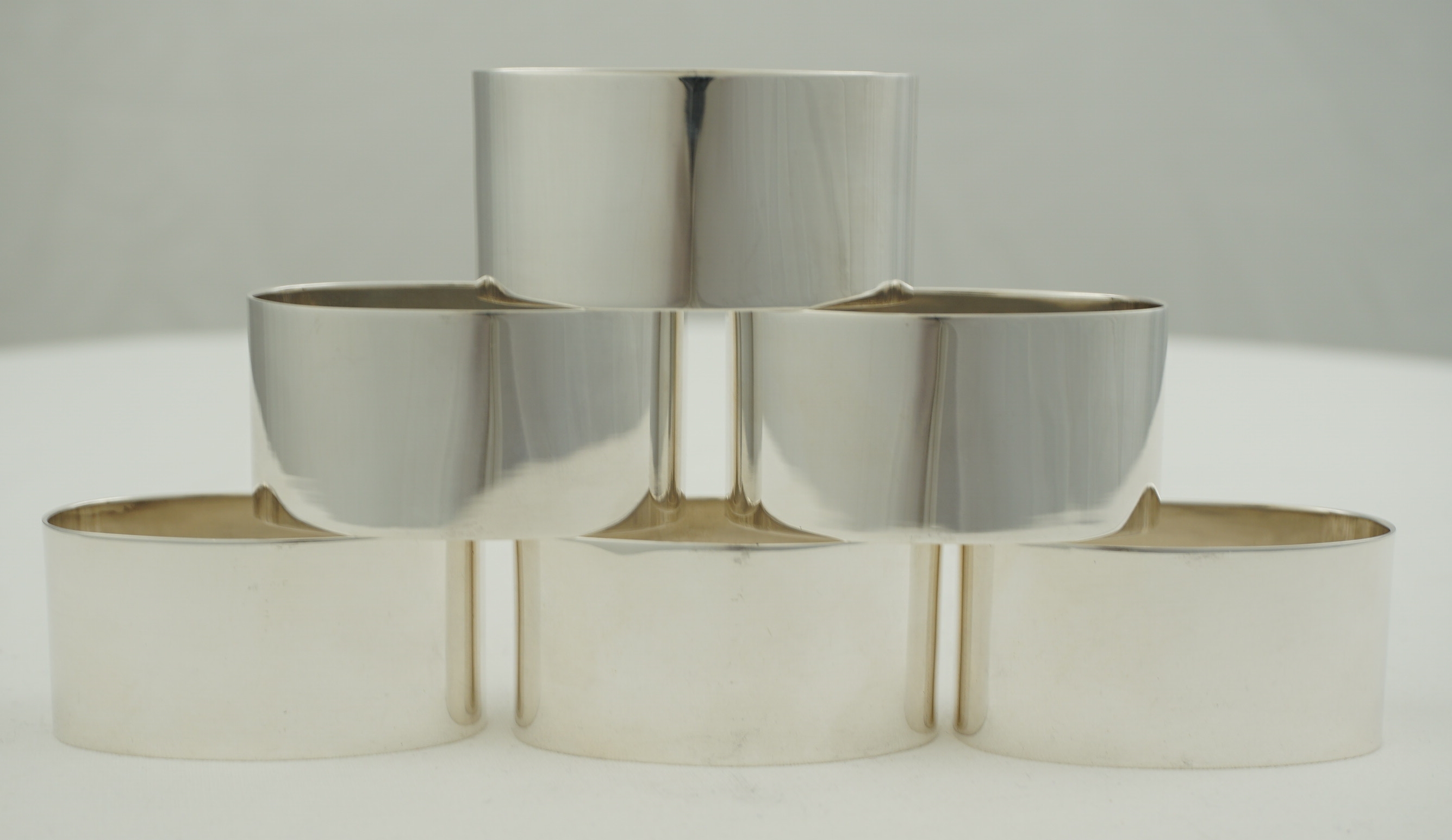 DESCRIPTION | Good and cased set of six solid sterling silver oval napkin (serviette) rings with no engraving or erasure. Carrs of Sheffield still sell a very similar napkin ring for £249 each. |