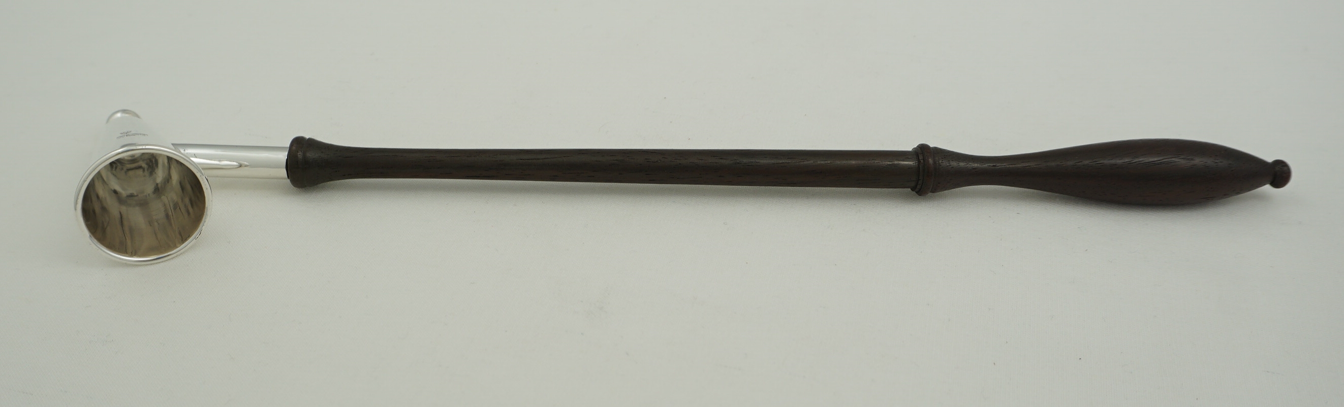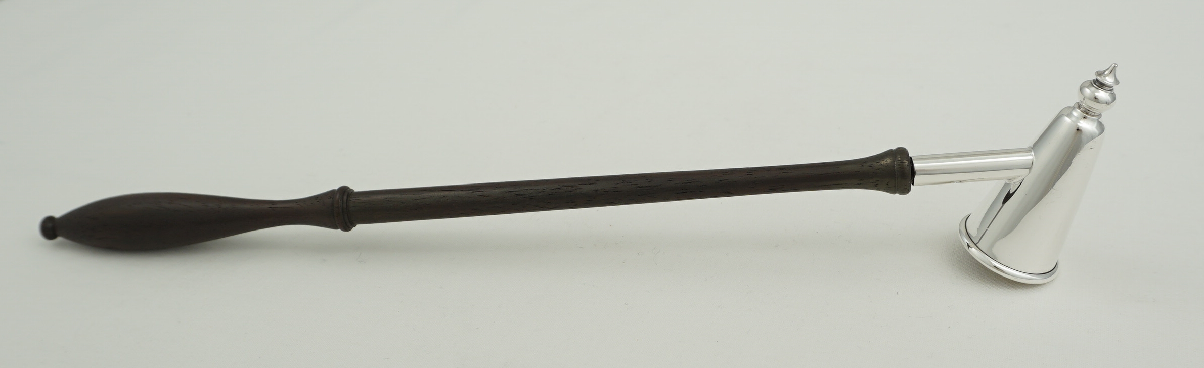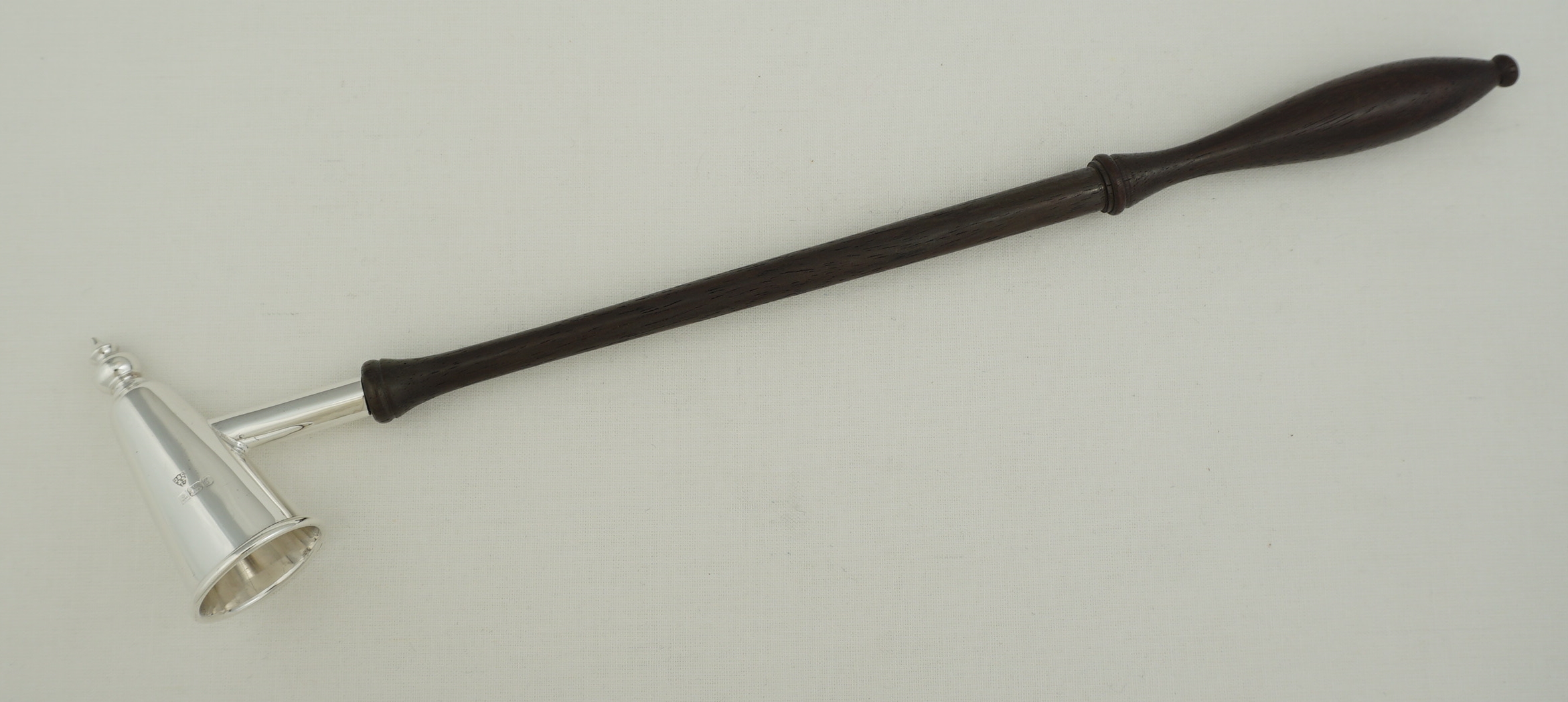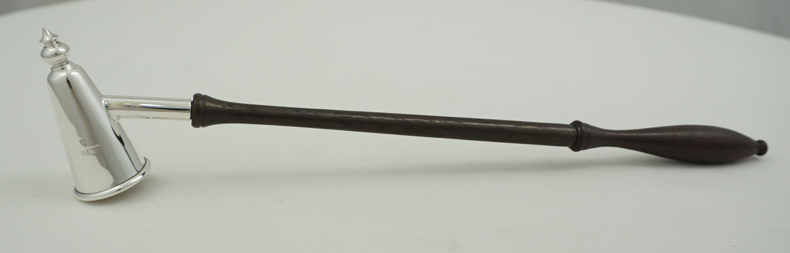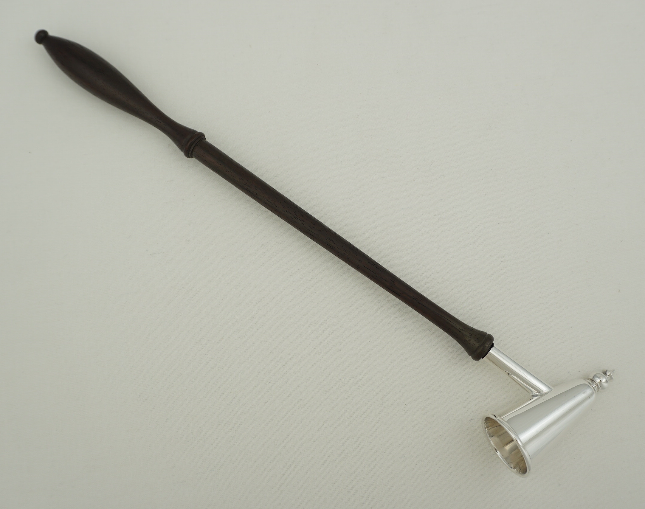 DESCRIPTION | Good and useful vintage English solid sterling silver candle douter, snuffer, snuffing cone with a turned wood handle. |