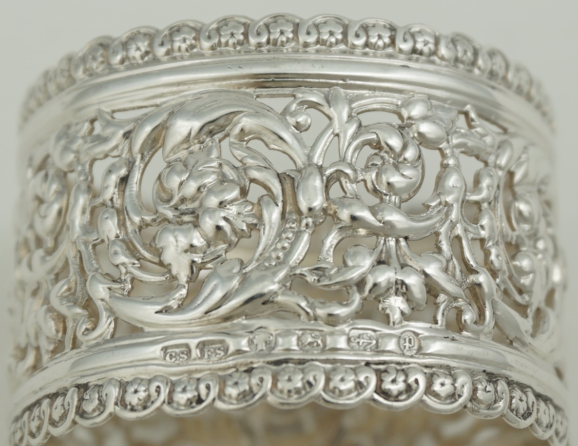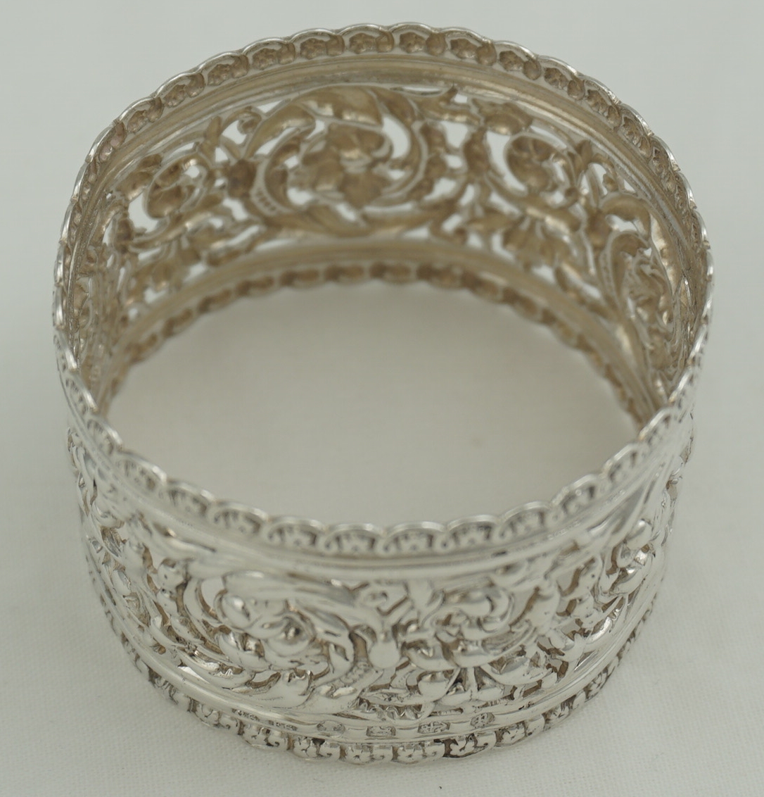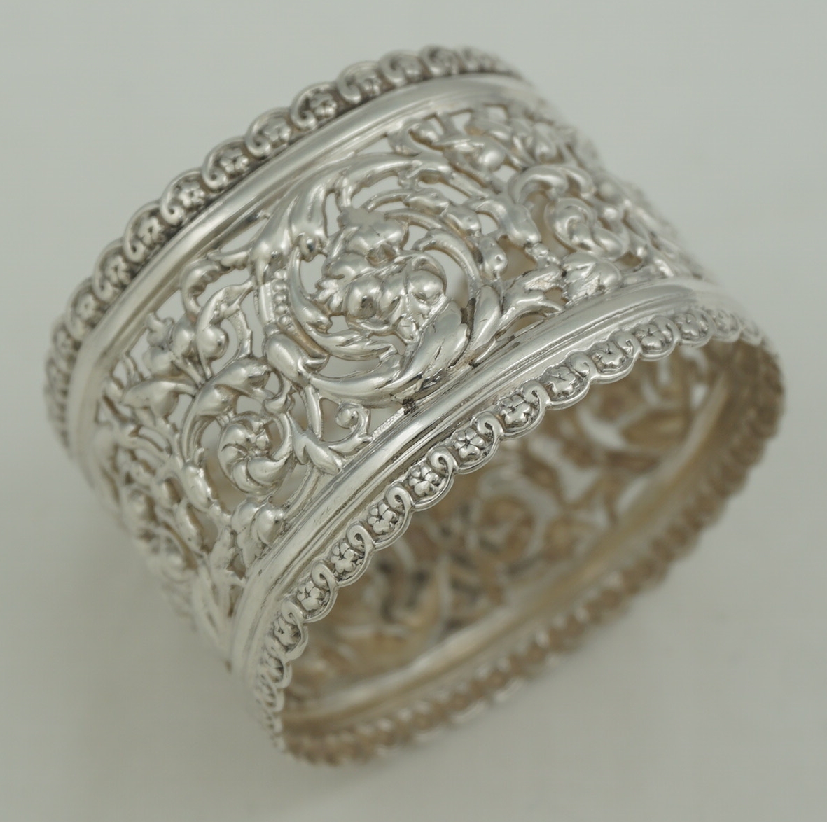 DESCRIPTION | Very good antique Victorian English solid sterling silver napkin ring with pierced and embossed decoration. |