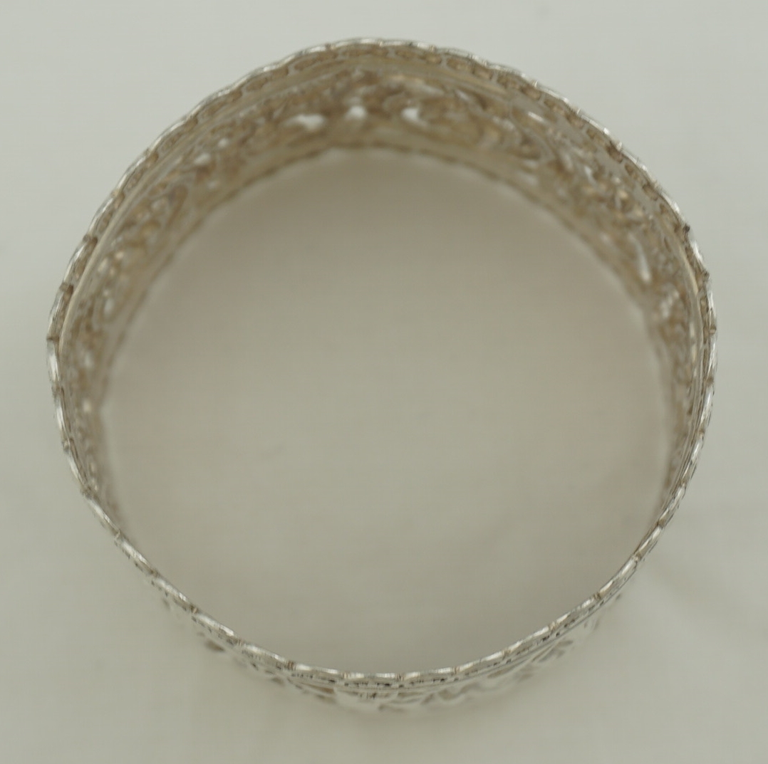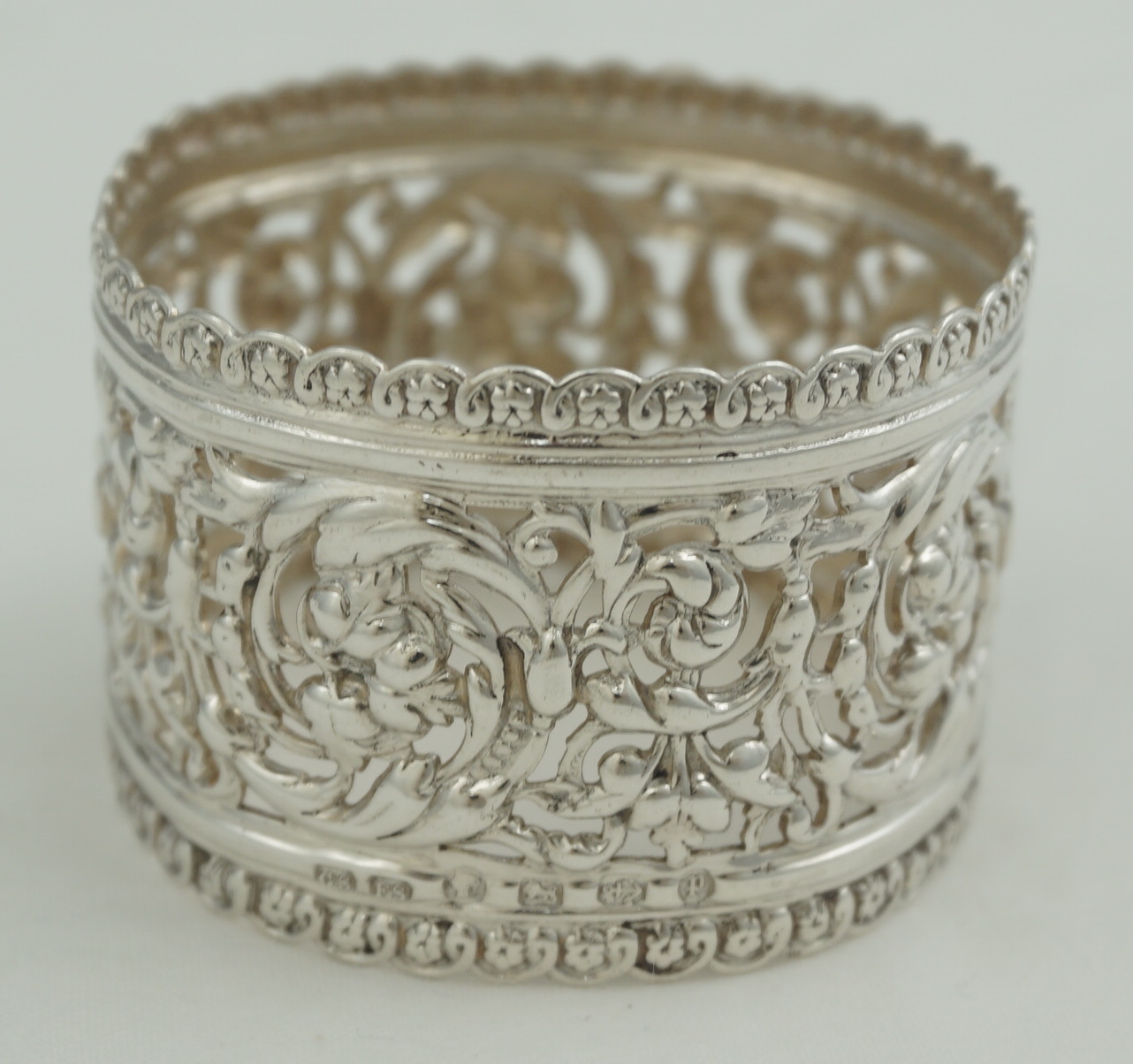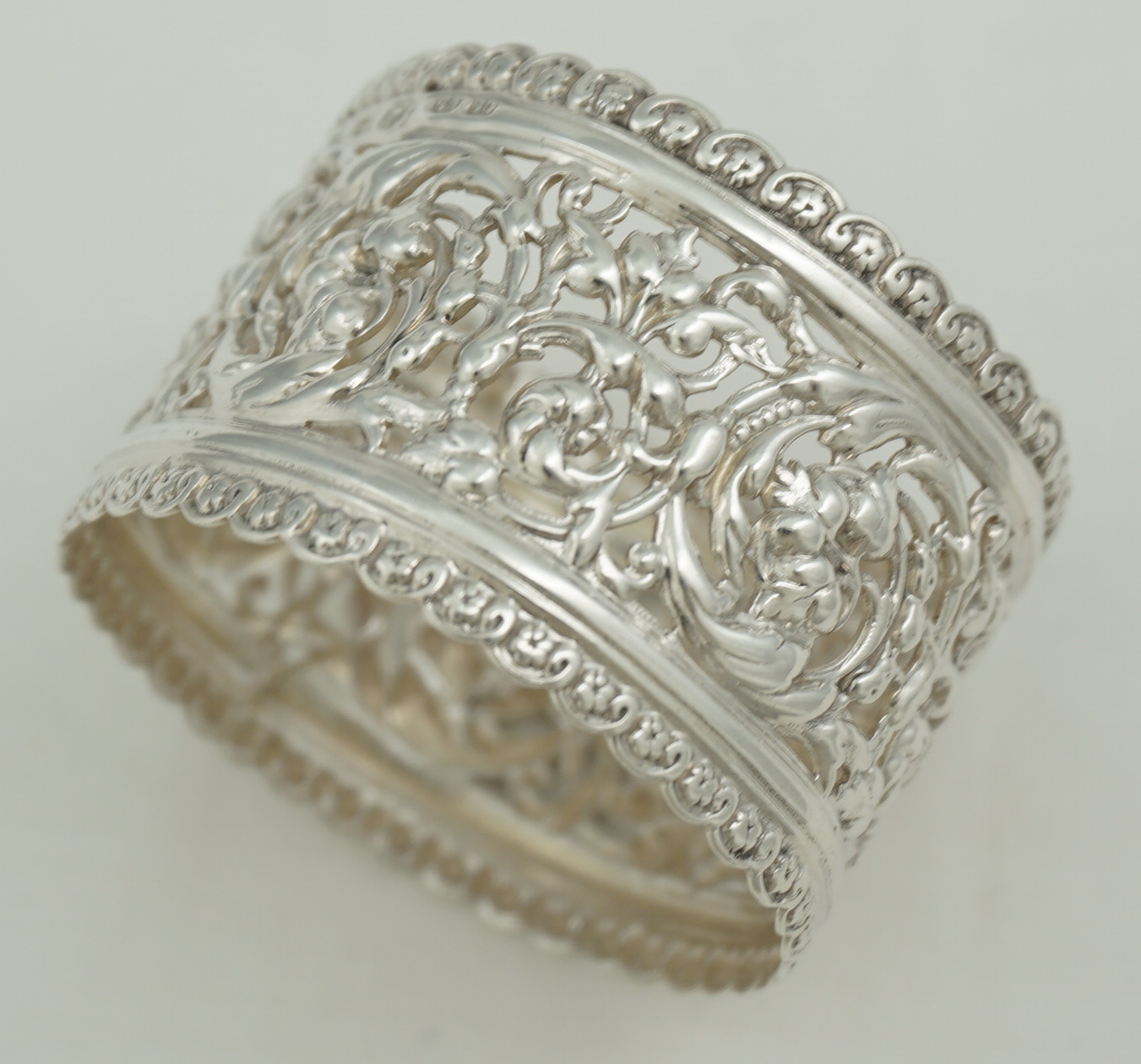 DESCRIPTION | Very good antique Victorian English solid sterling silver napkin ring with pierced and embossed decoration. |