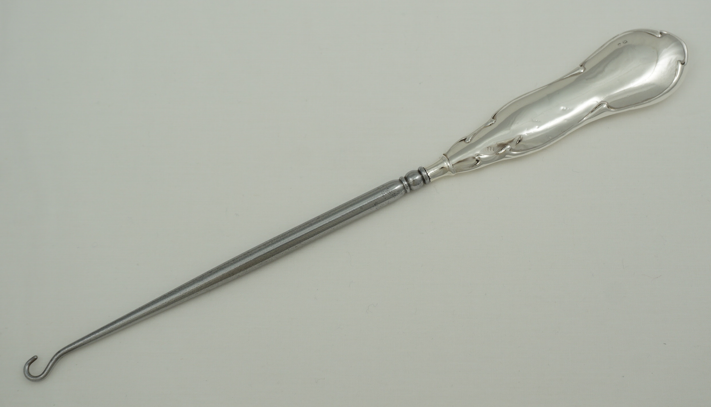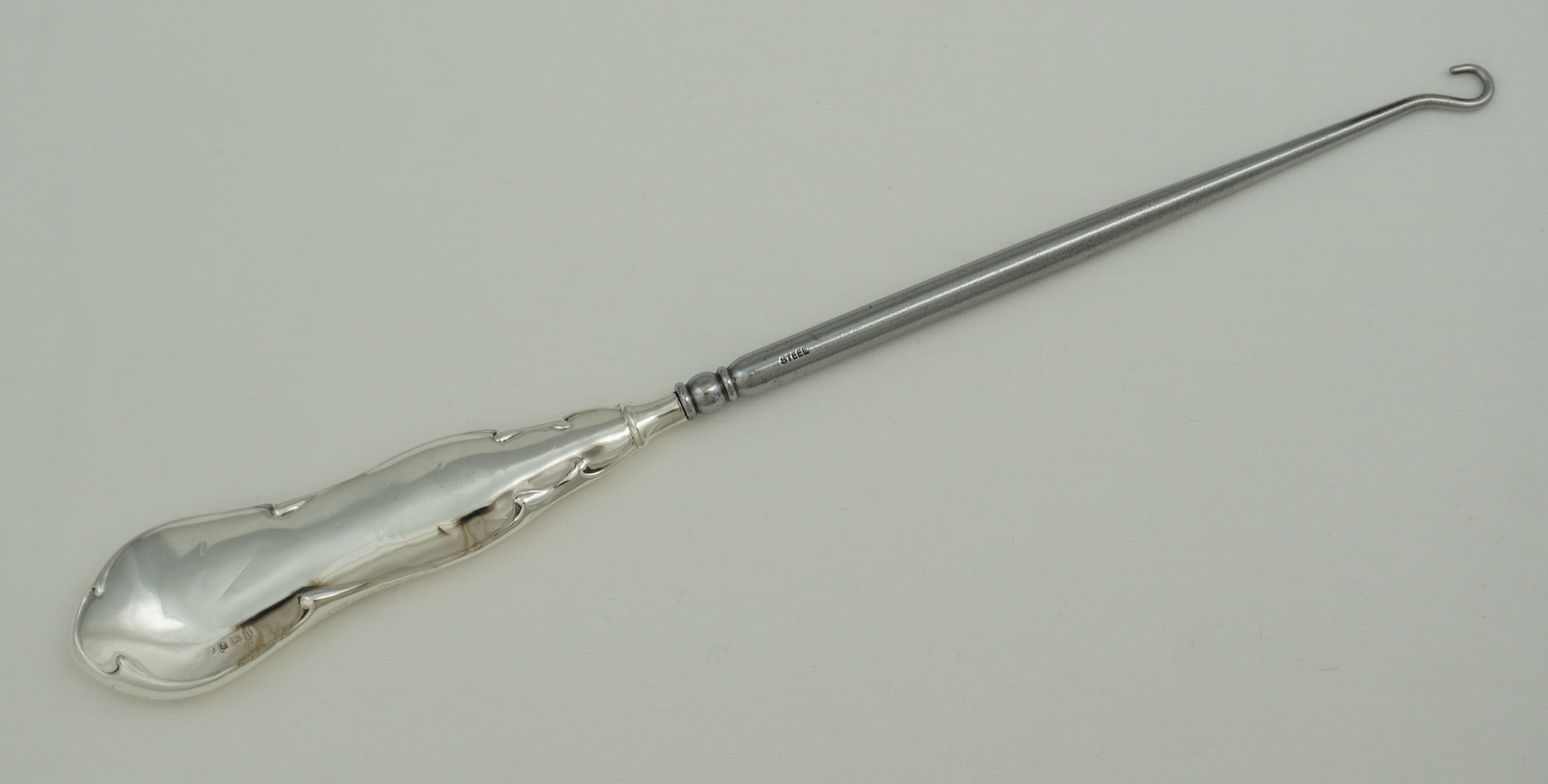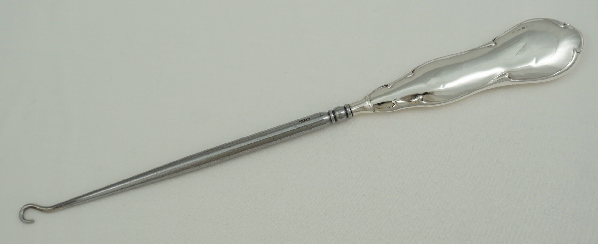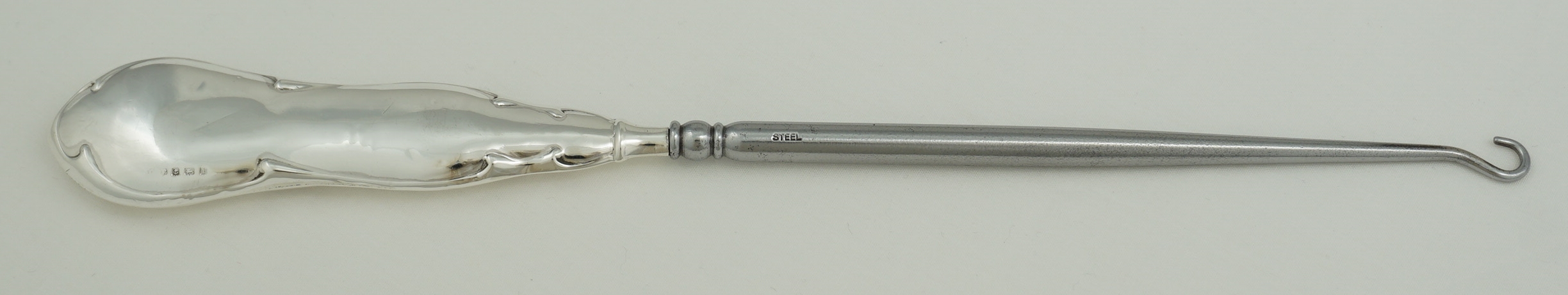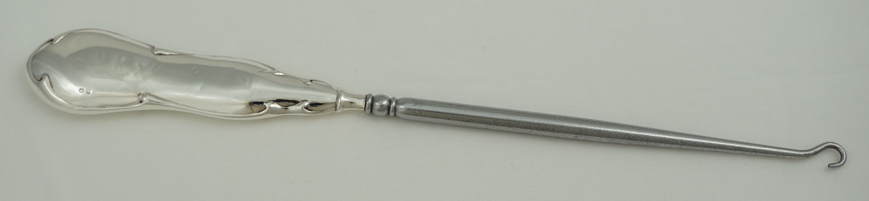 DESCRIPTION | Large antique English button hook with a steel hook and traditional pitch loaded Art Nouveau sterling silver handle. |