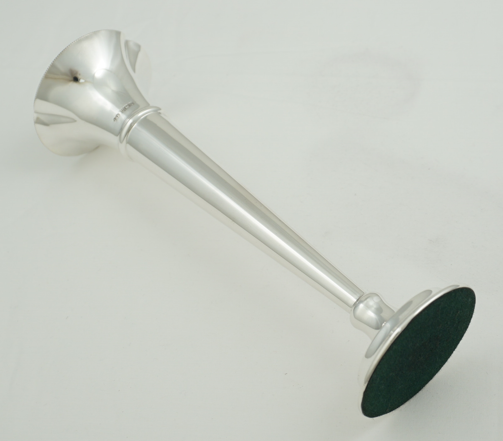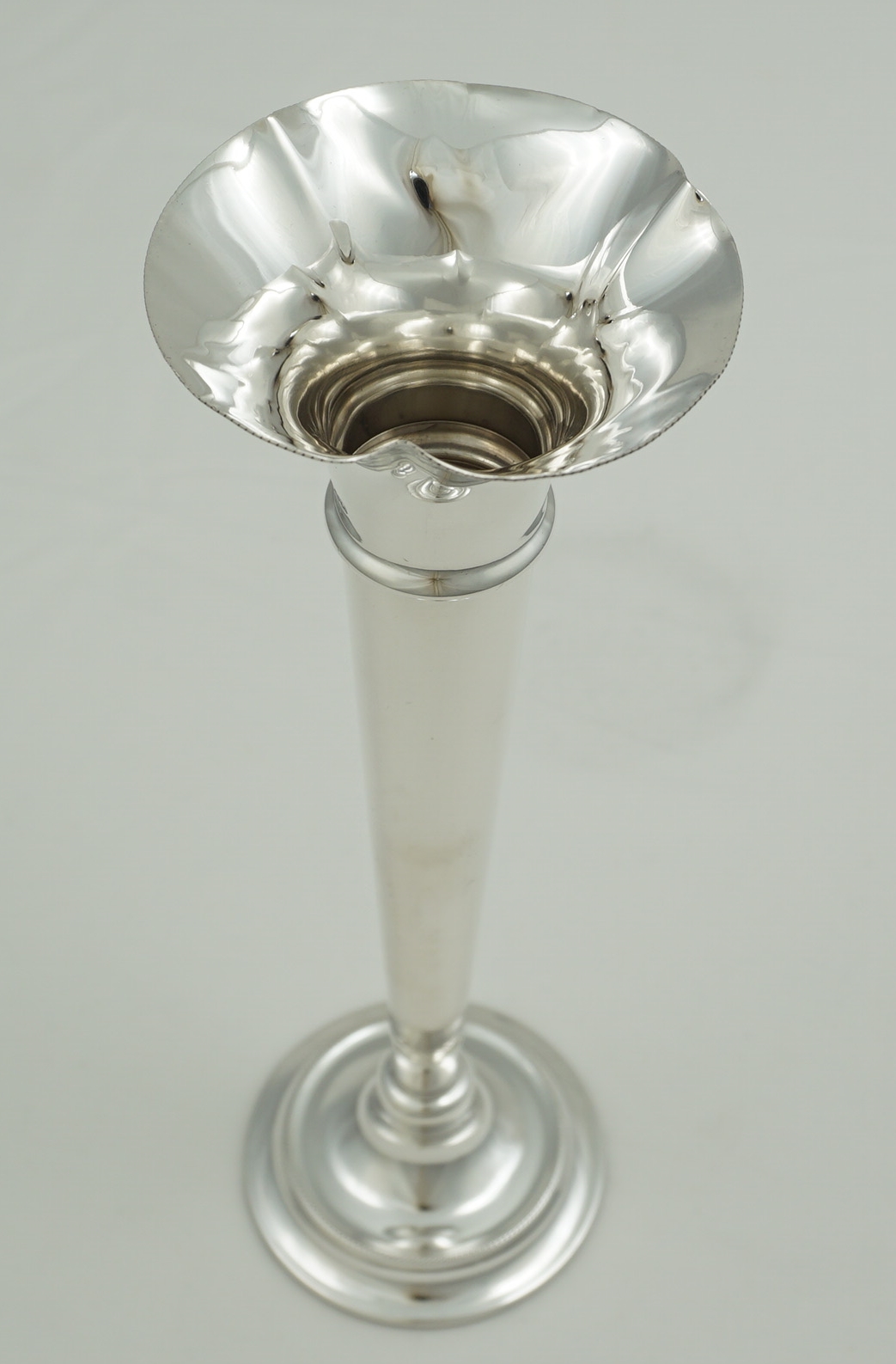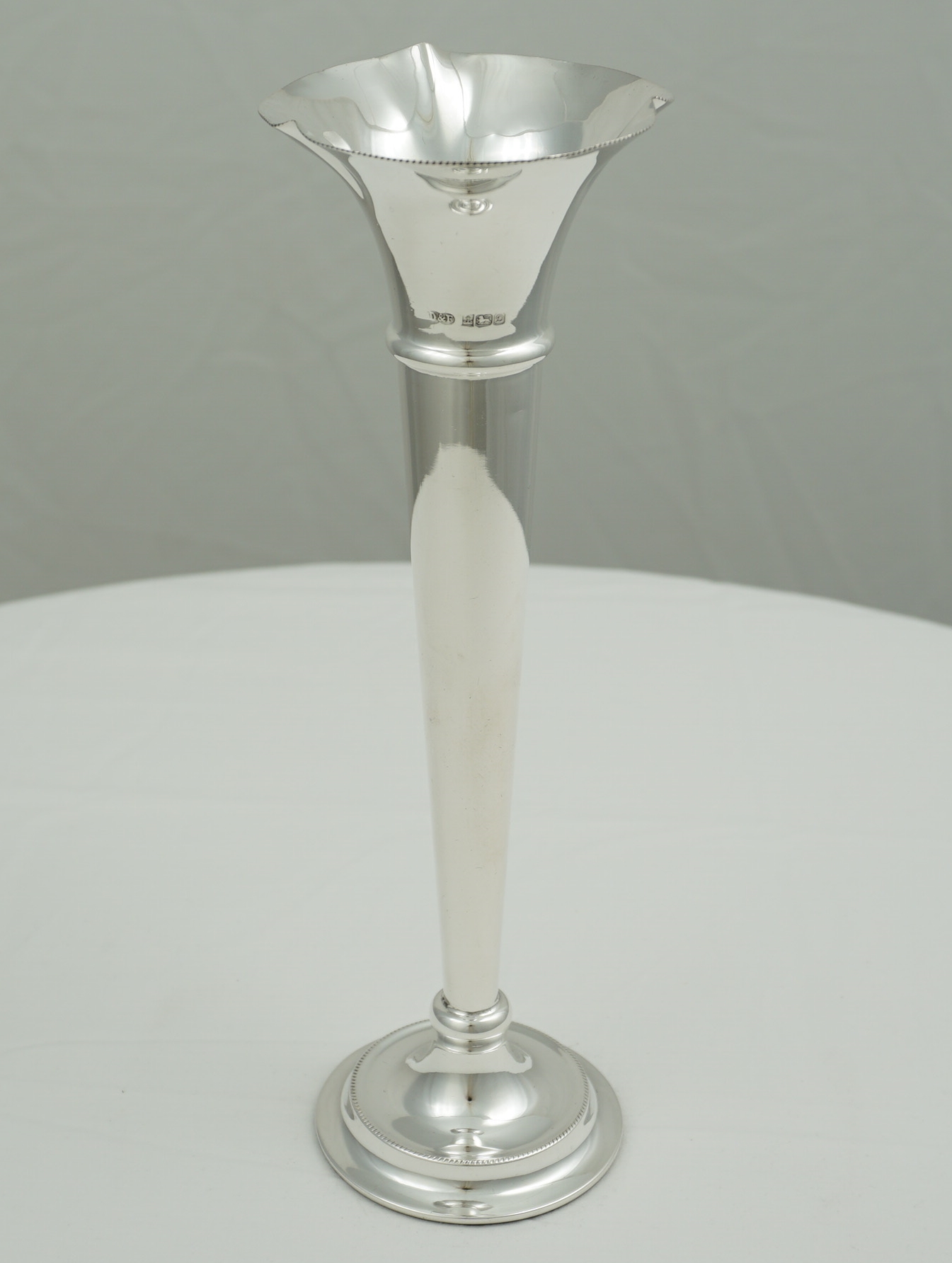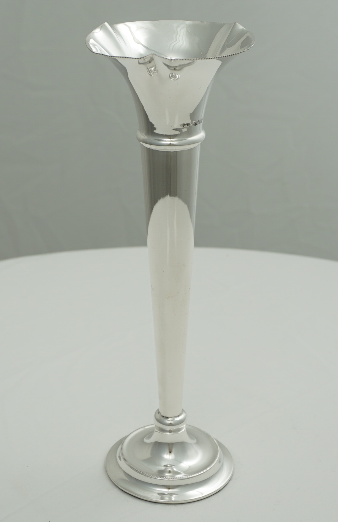 | DESCRIPTION | Tall and slender vintage English solid sterling silver trumpet form vase with milled edge decoration and a loaded base. |