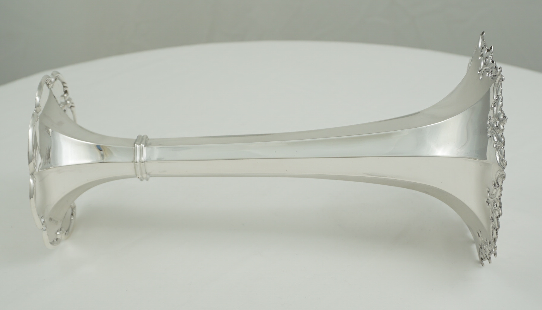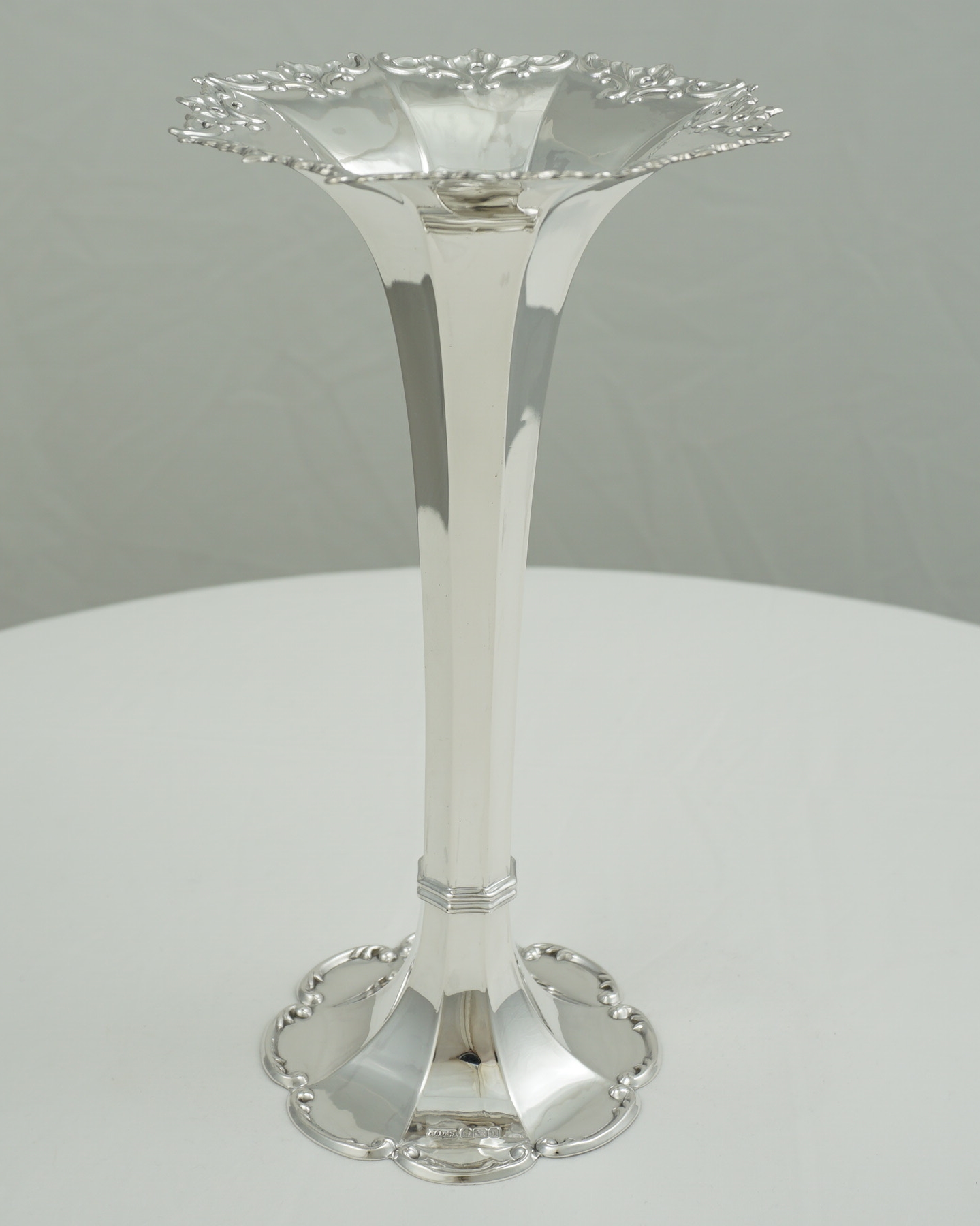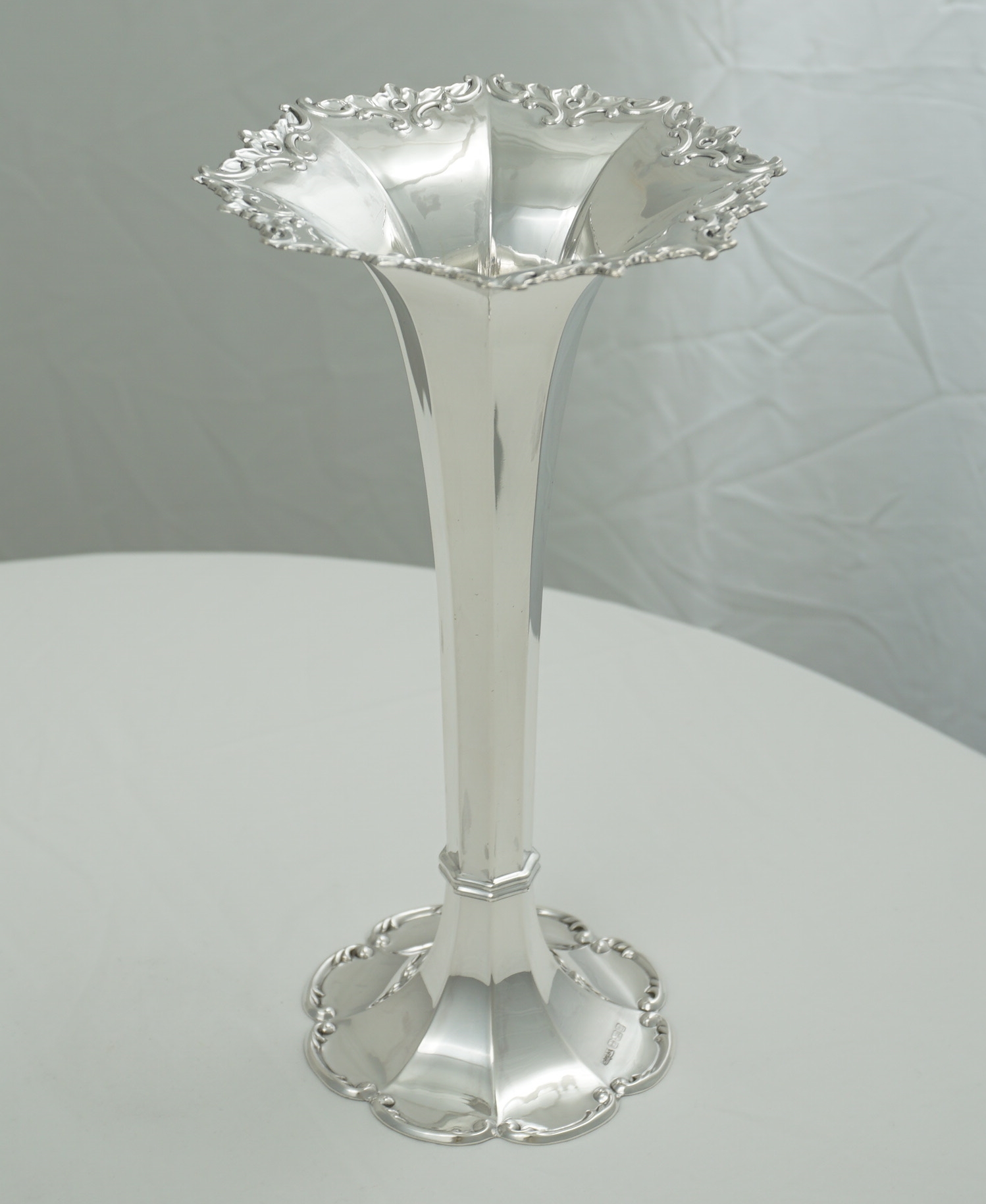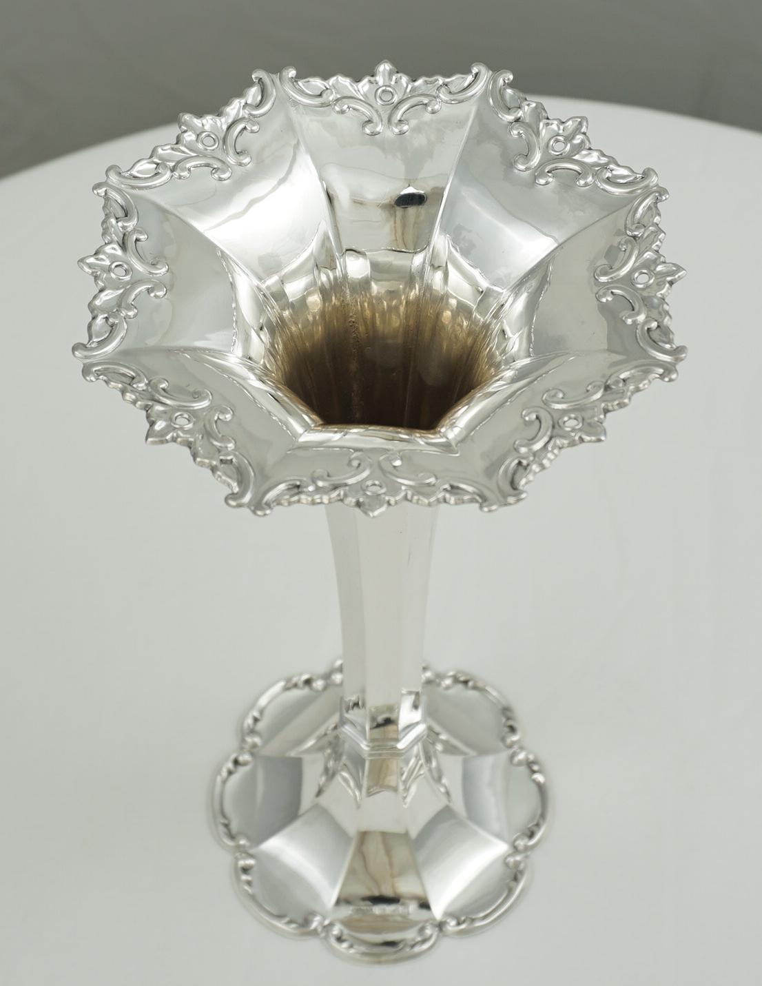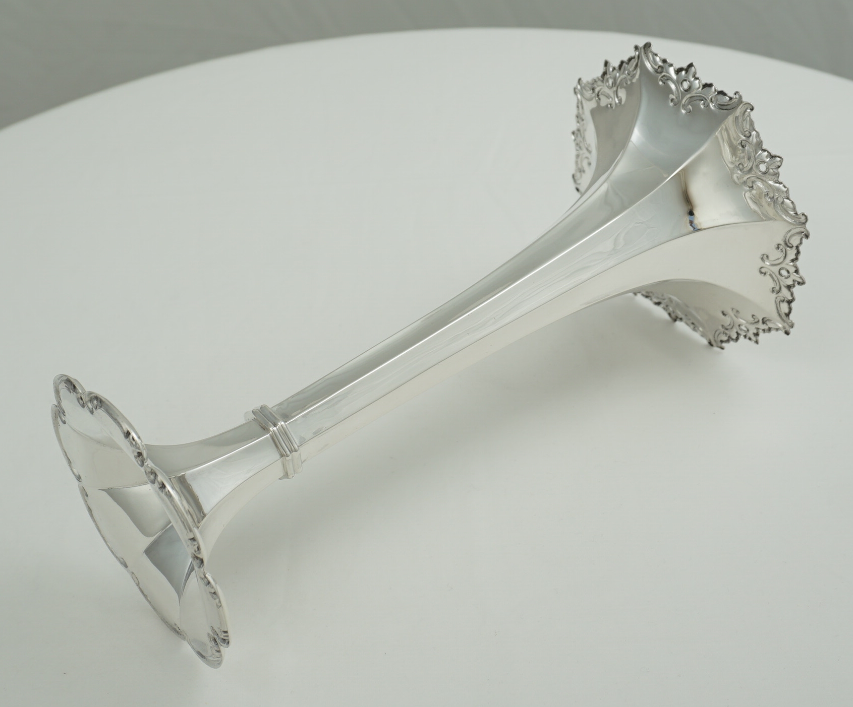 | DESCRIPTION | Very good, high quality, antique English solid sterling silver trumpet form vase with a facetted stem and scroll decorated rims. Solid silver, the base is not loaded. |